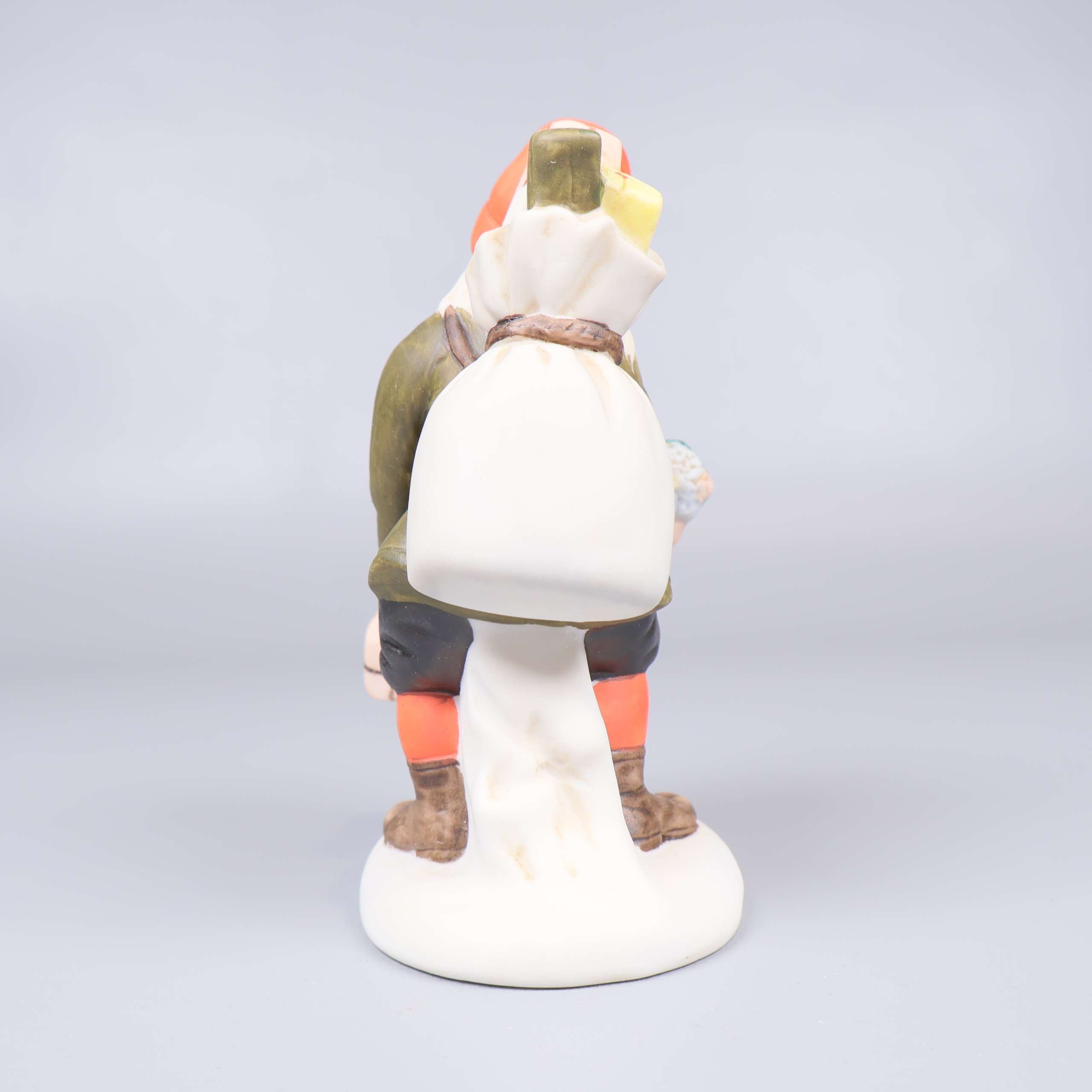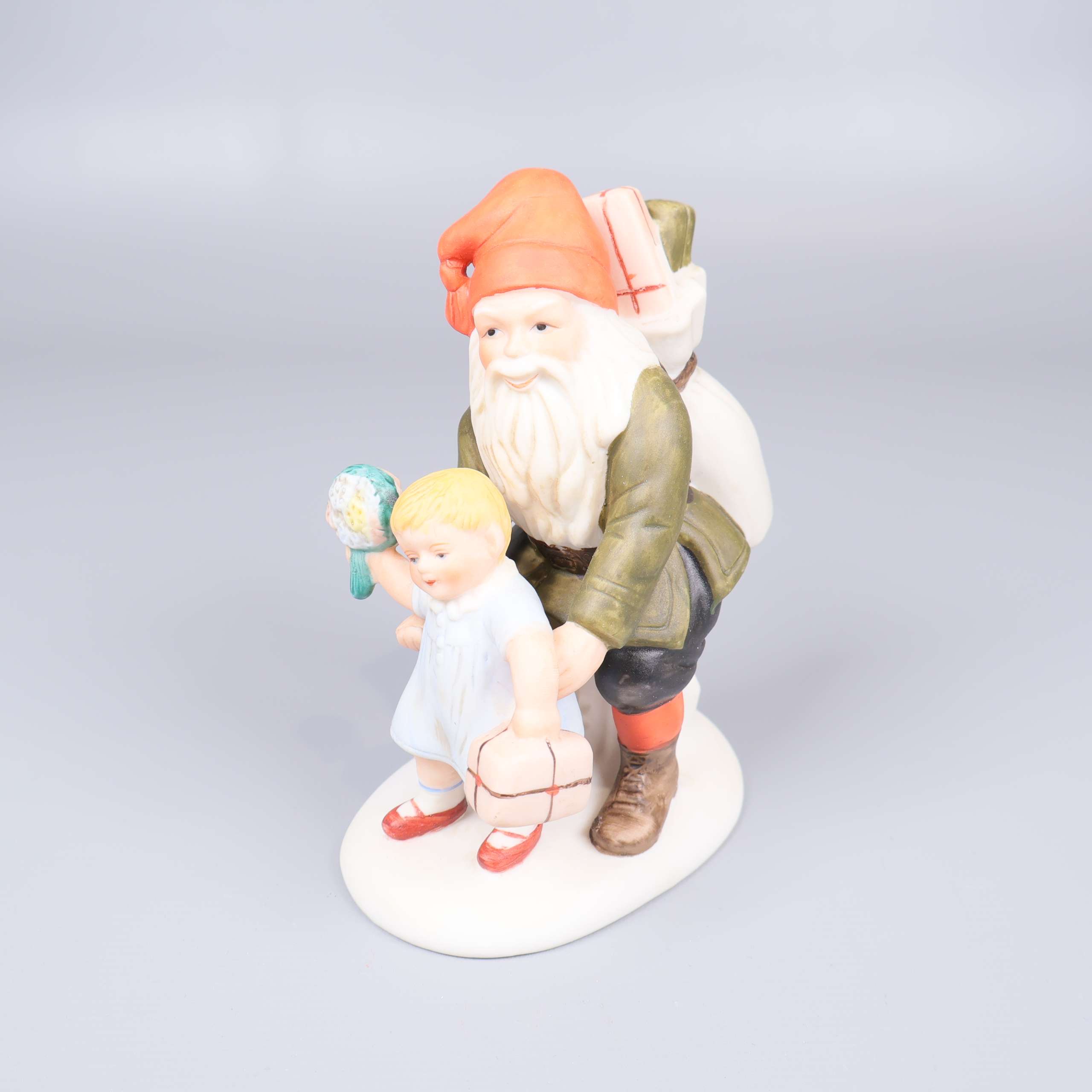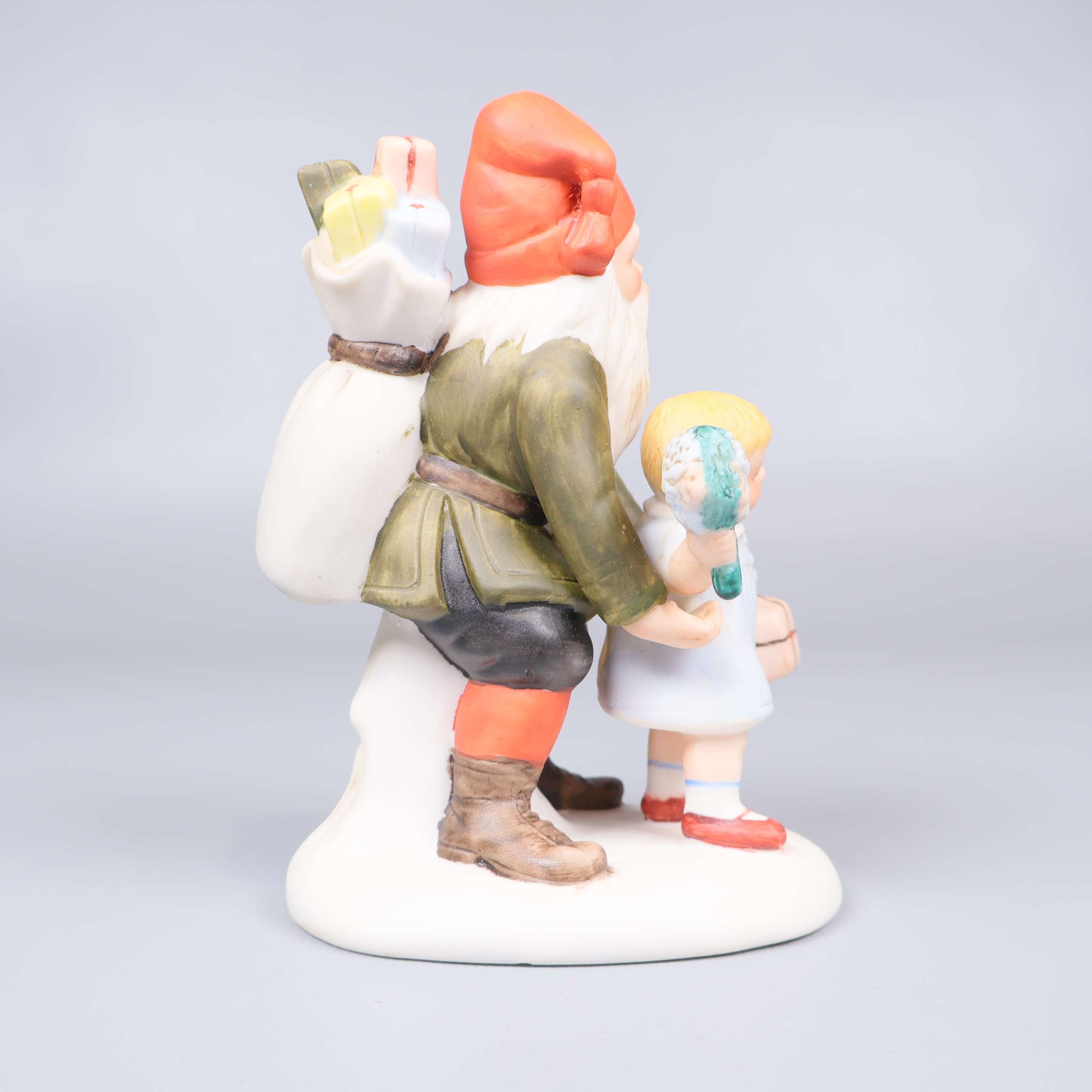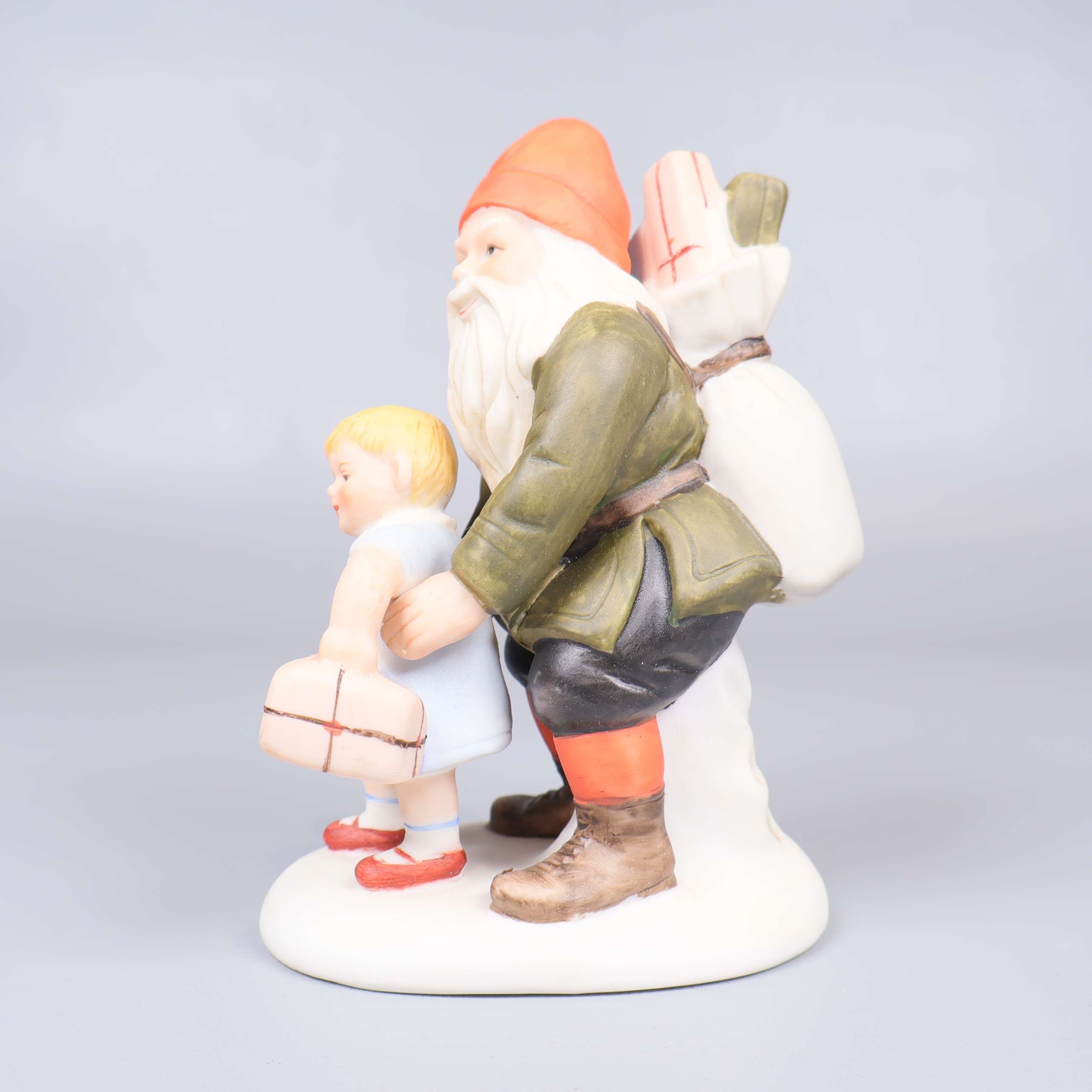 Porslinsfigur av en tomte med ett barn, i stil med de klassiska illustrationerna av den svenska konstnären Jenny Nyström.