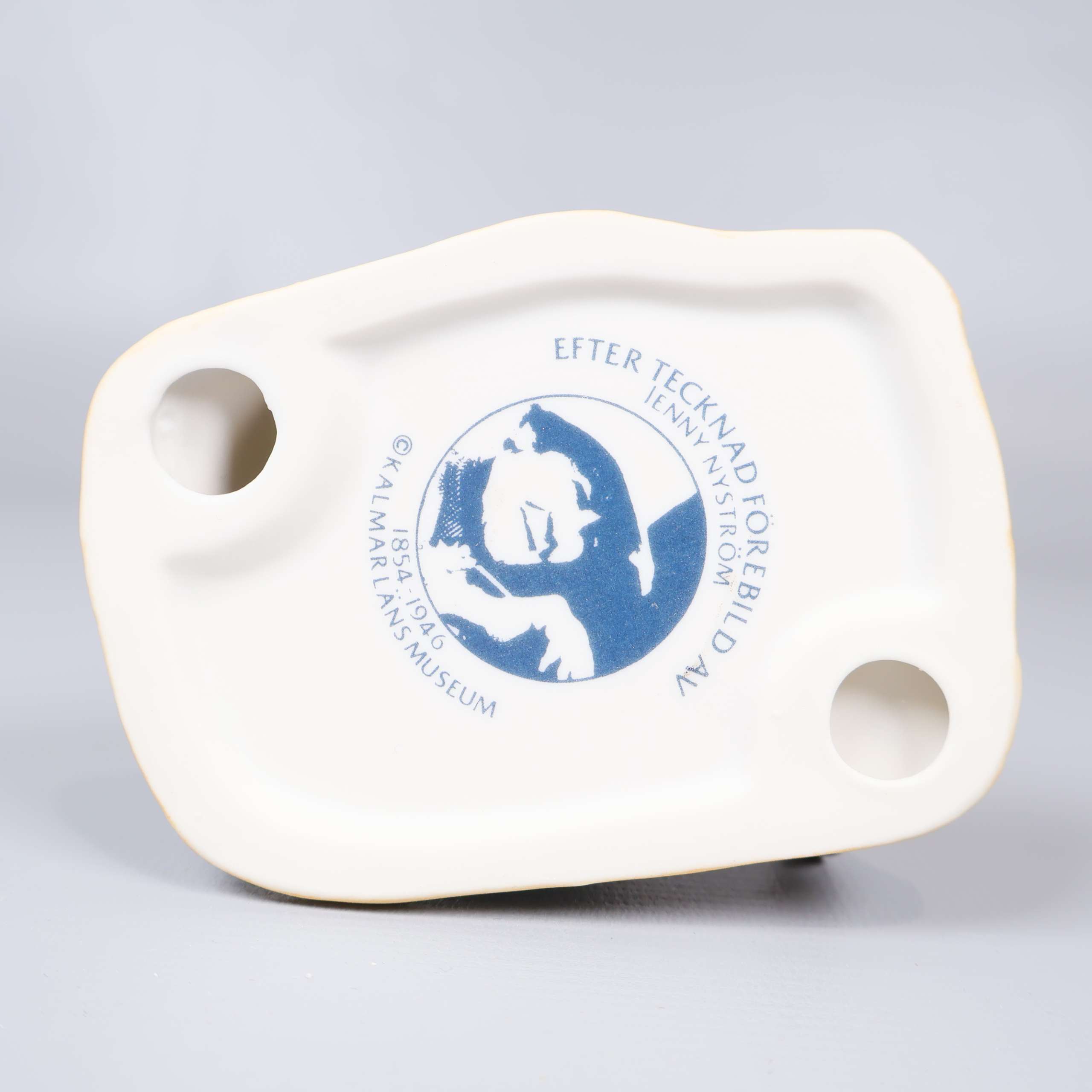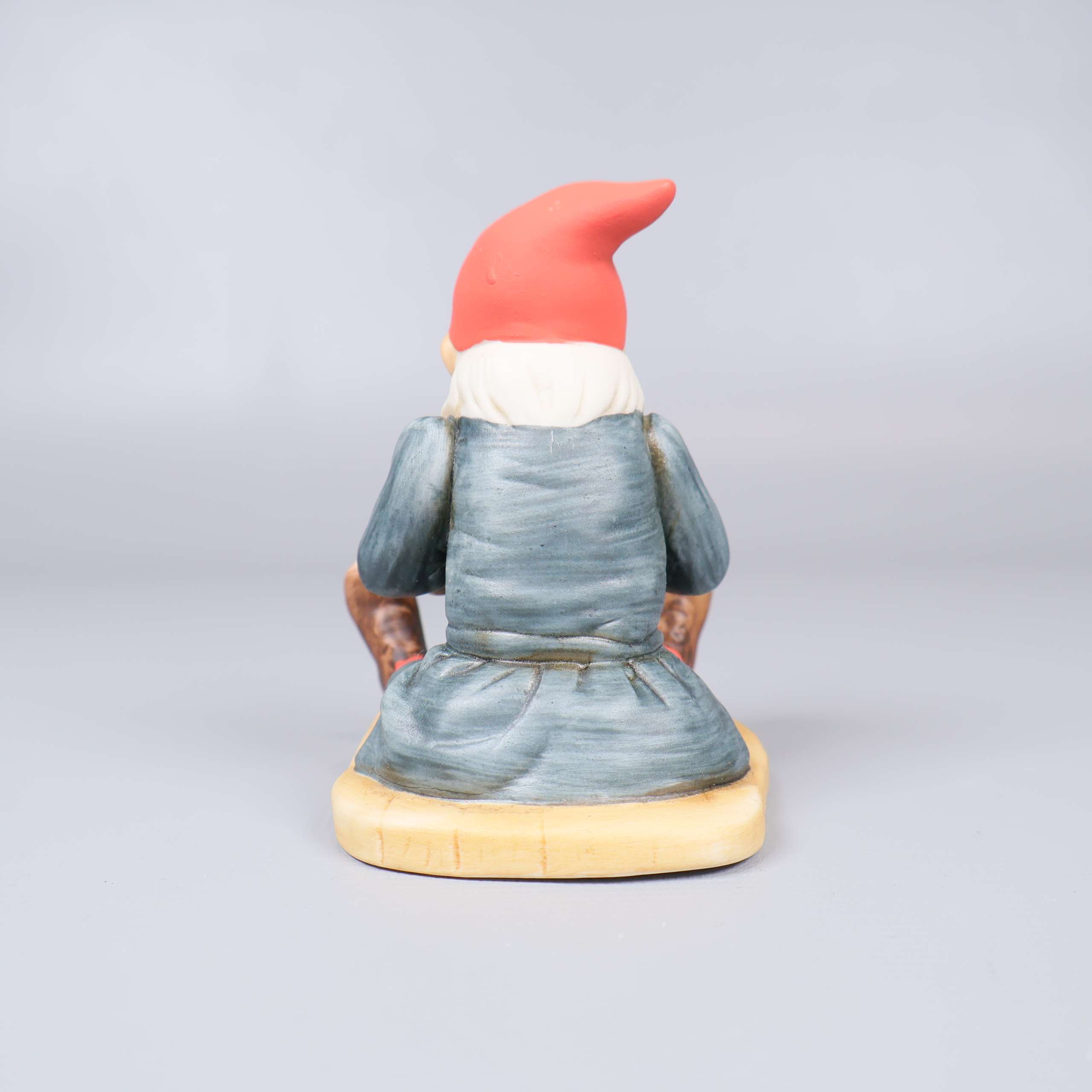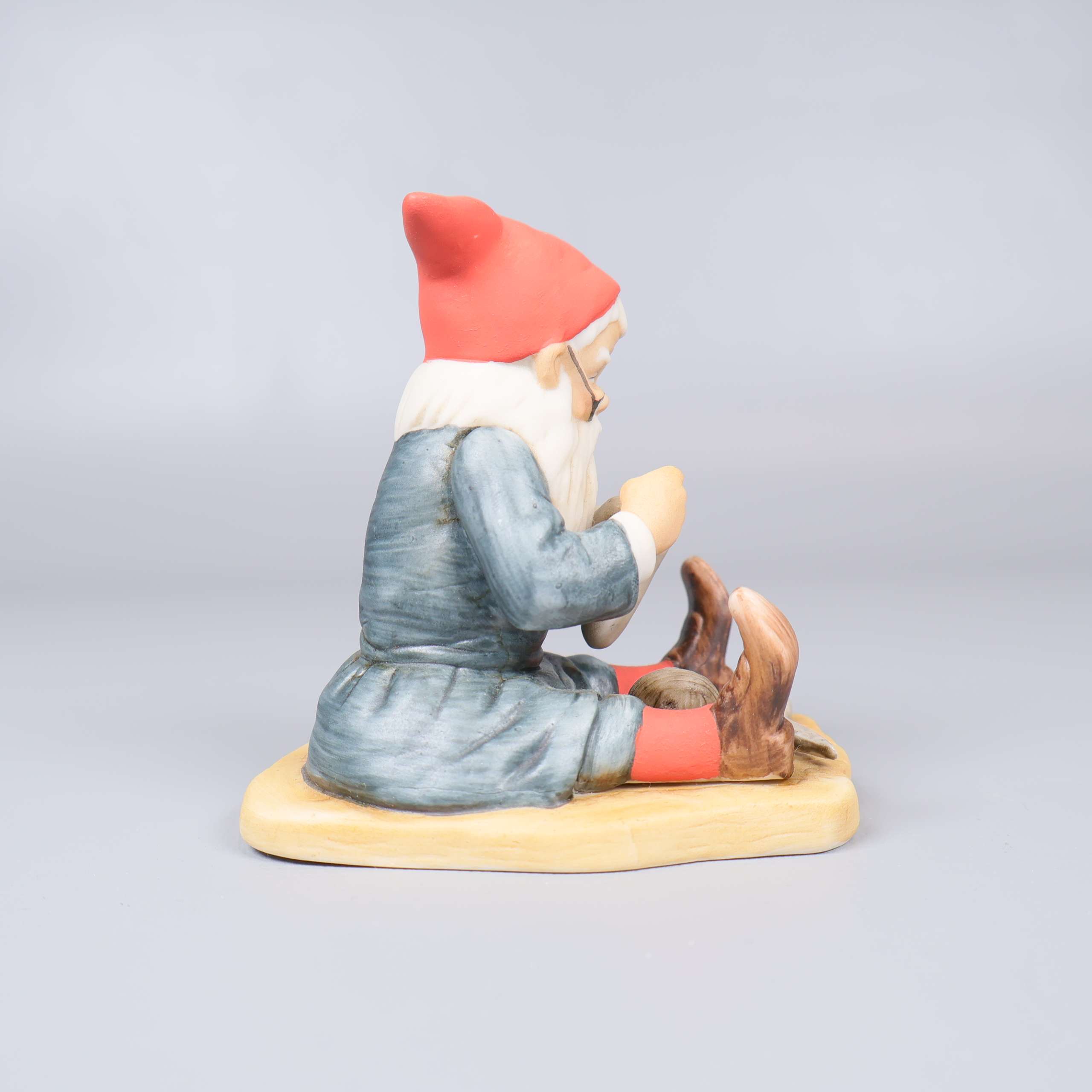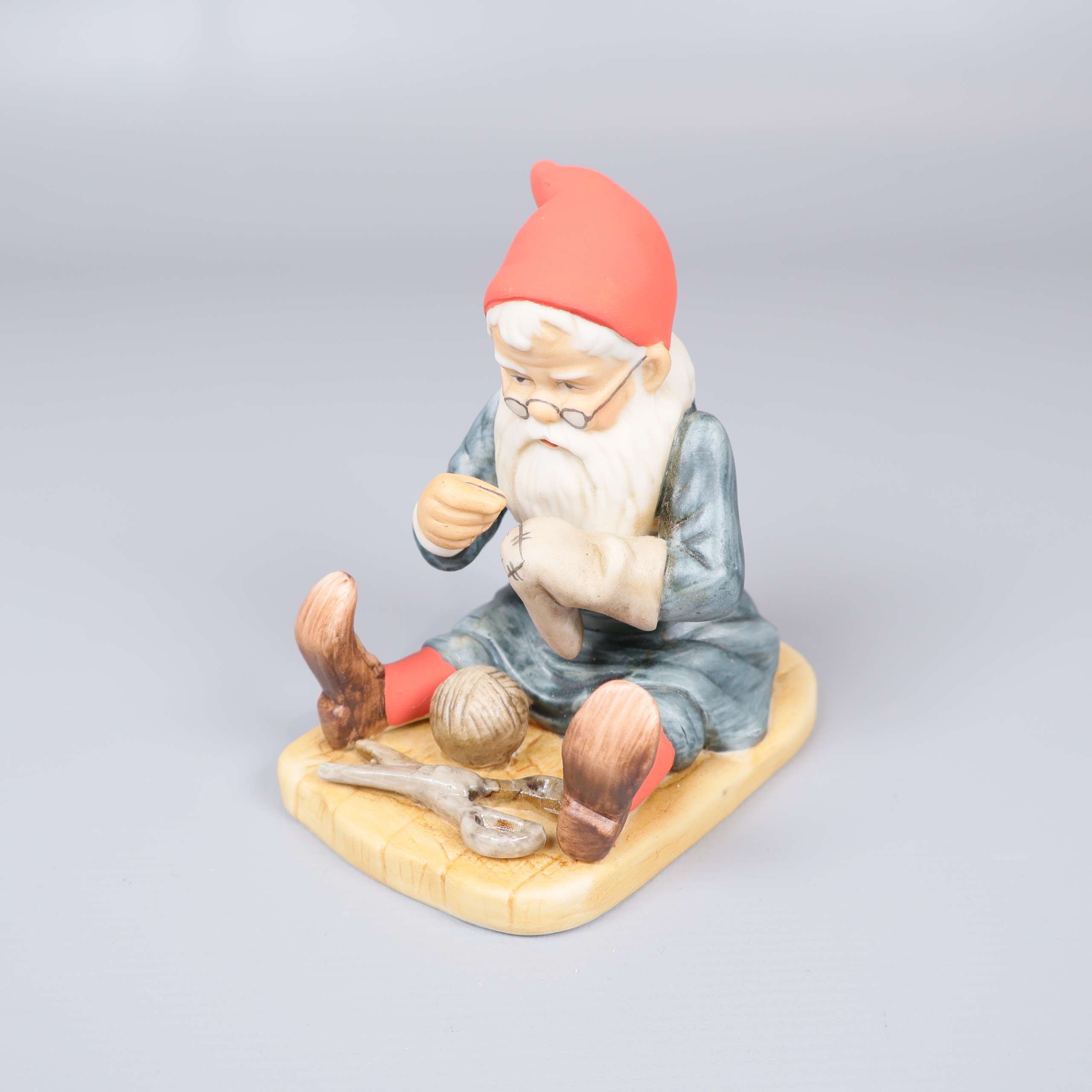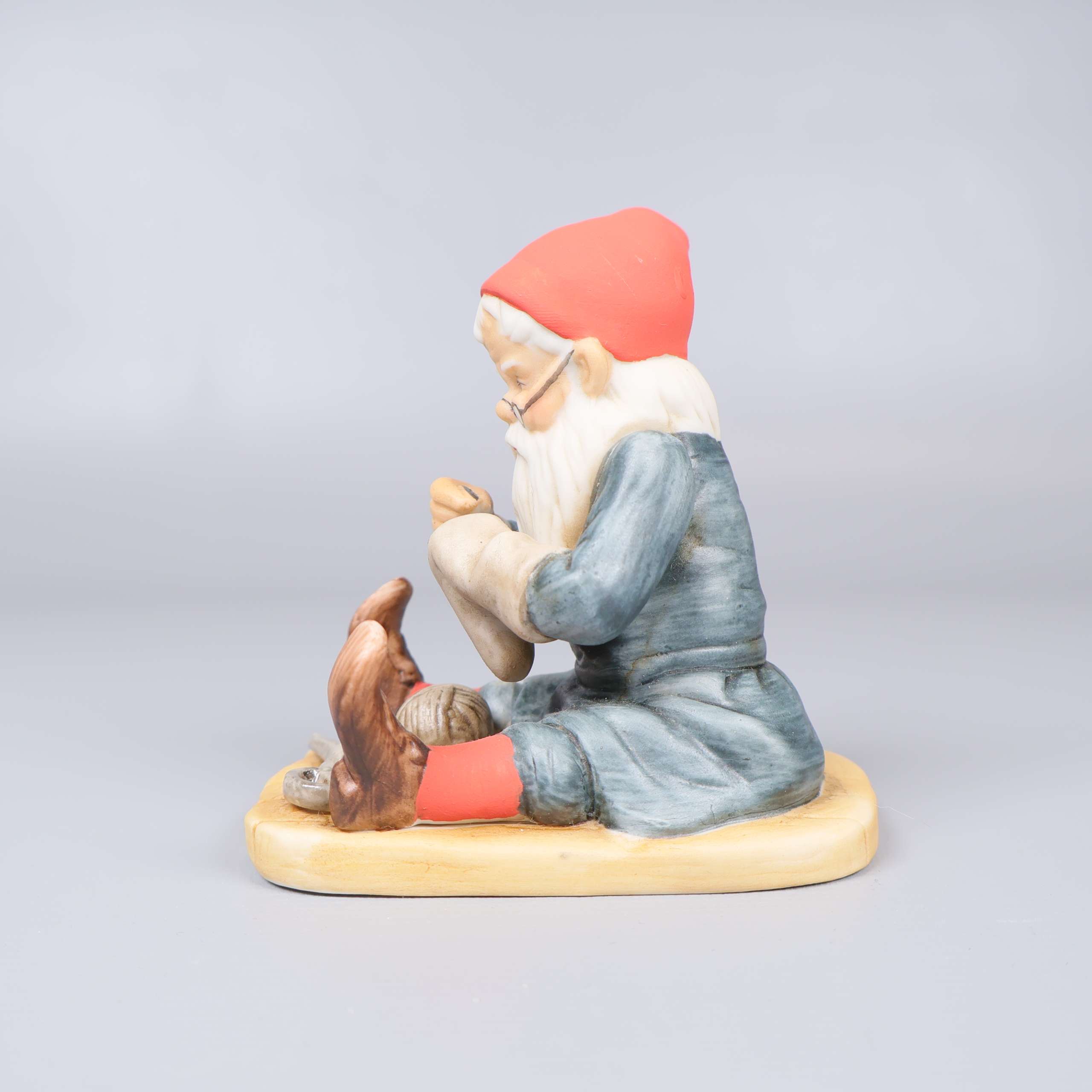 Porslinsfigur av en tomte som syr, i stil med de klassiska illustrationerna av den svenska konstnären Jenny Nyström.