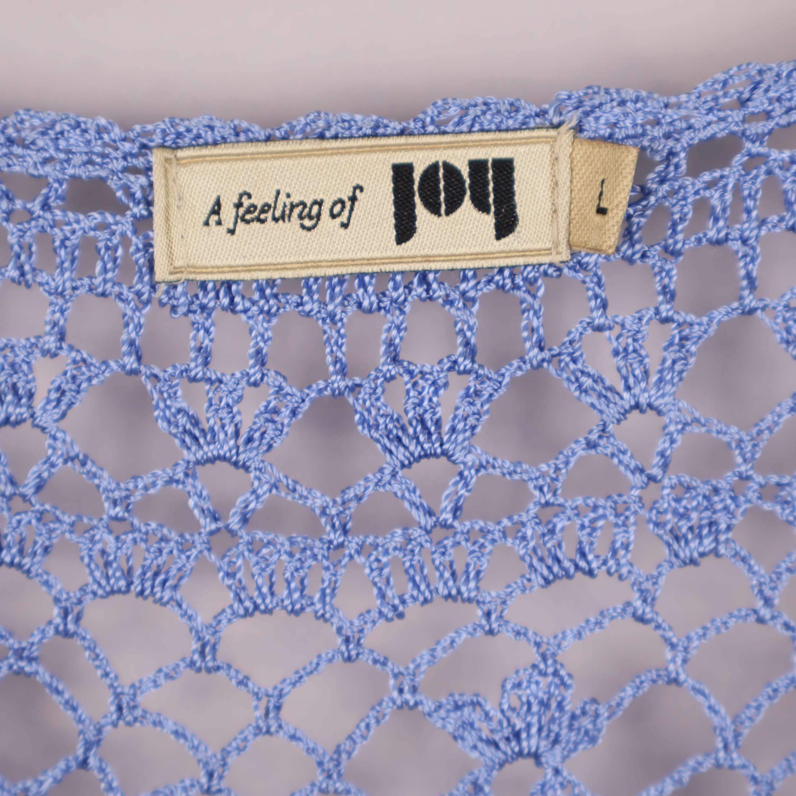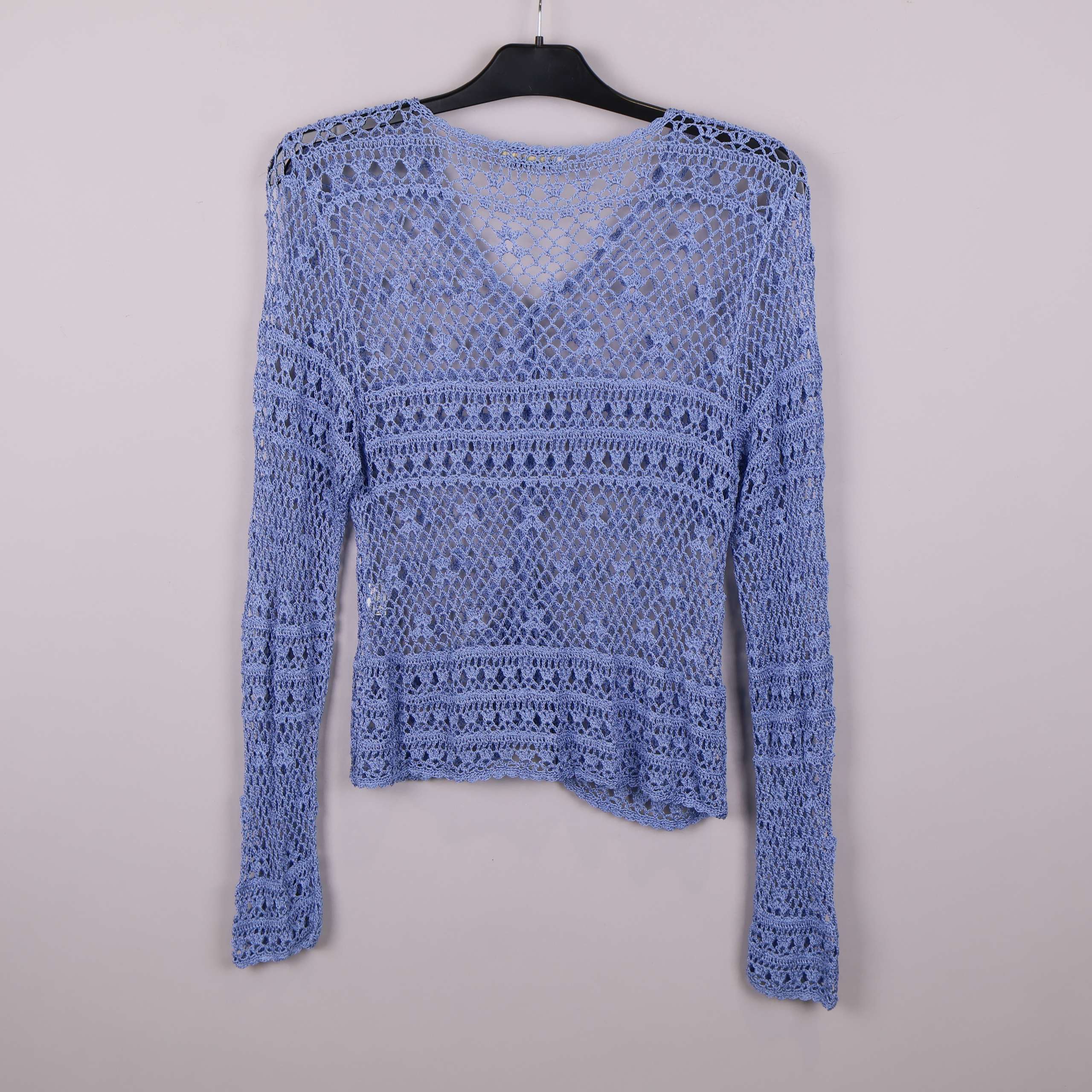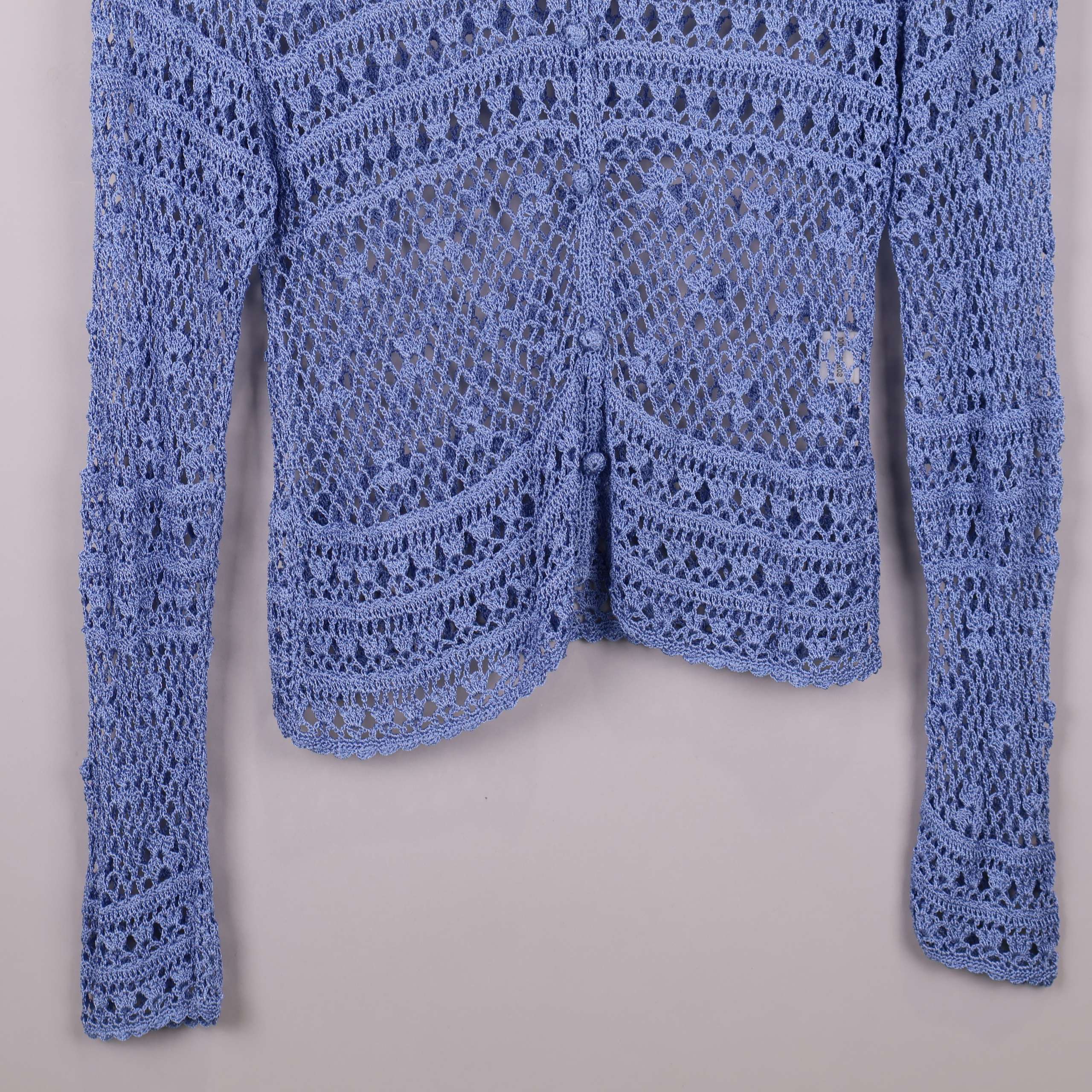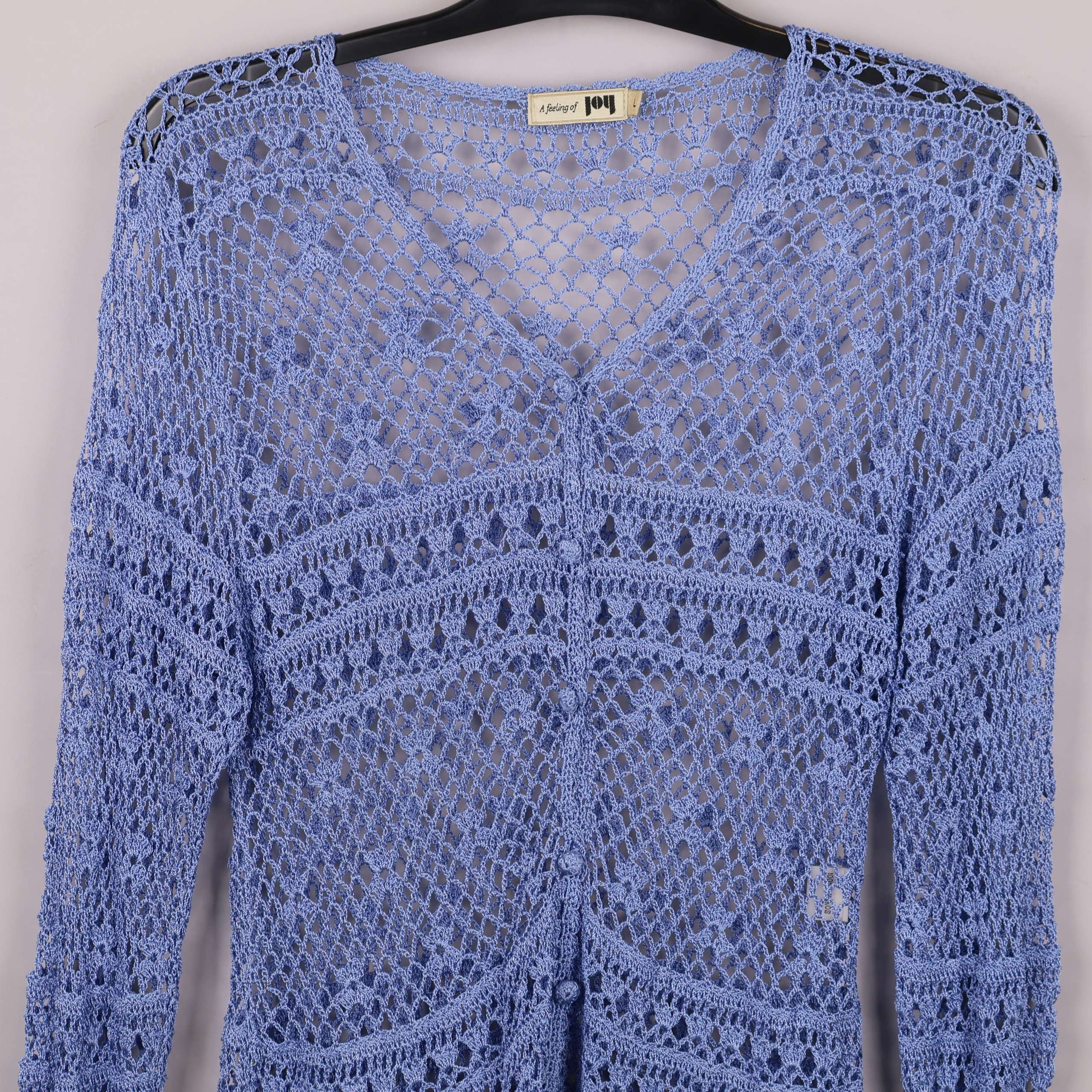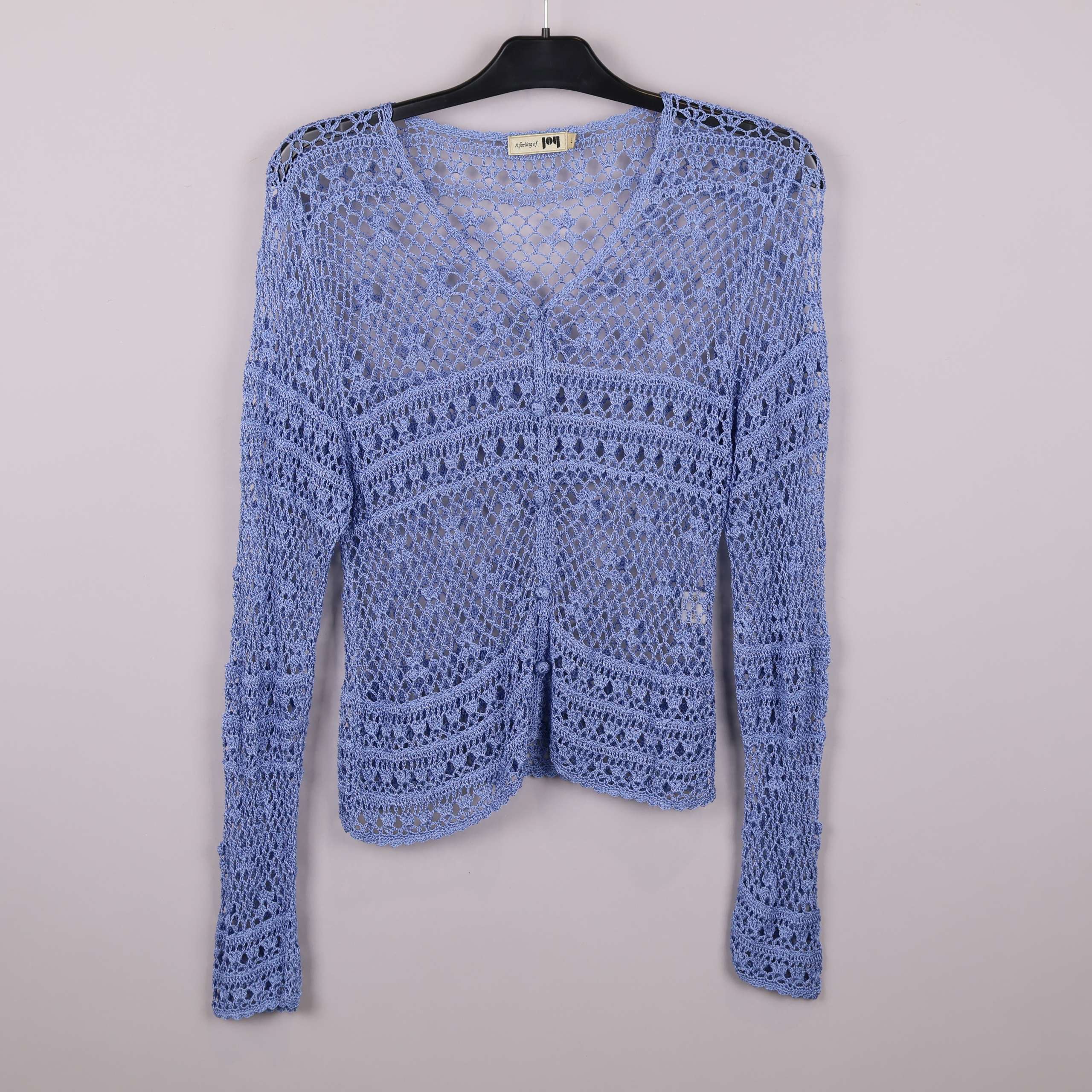 Långärmad cardigan med vackert virkat spetsmönster och djup V-ringning. Plagget har en lätt, luftig struktur och knäppning framtill samt en mjukt följsam passform. Den unika sticktekniken och de dekorativa detaljerna skapar en modern, handgjord känsla med lite vintage vibe.