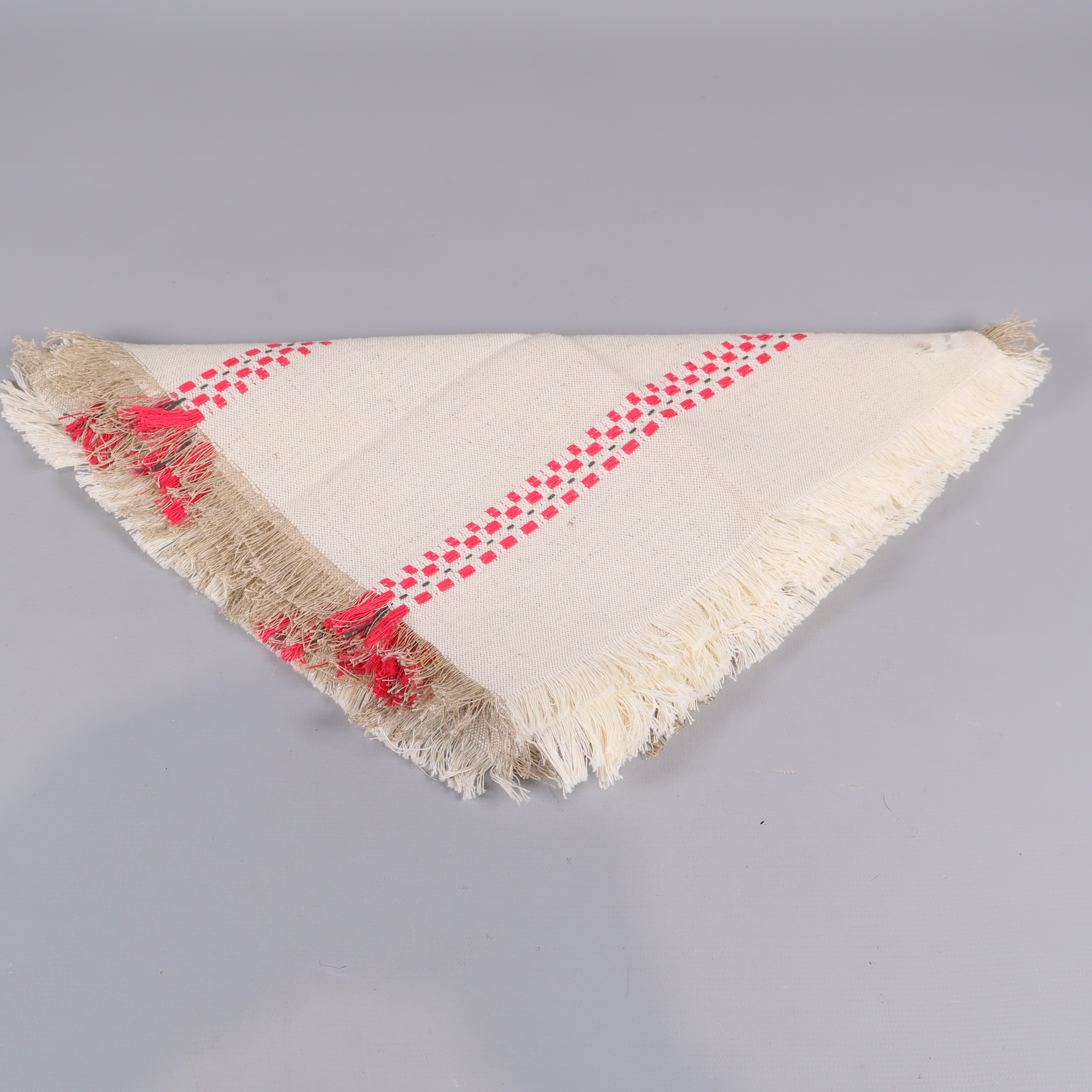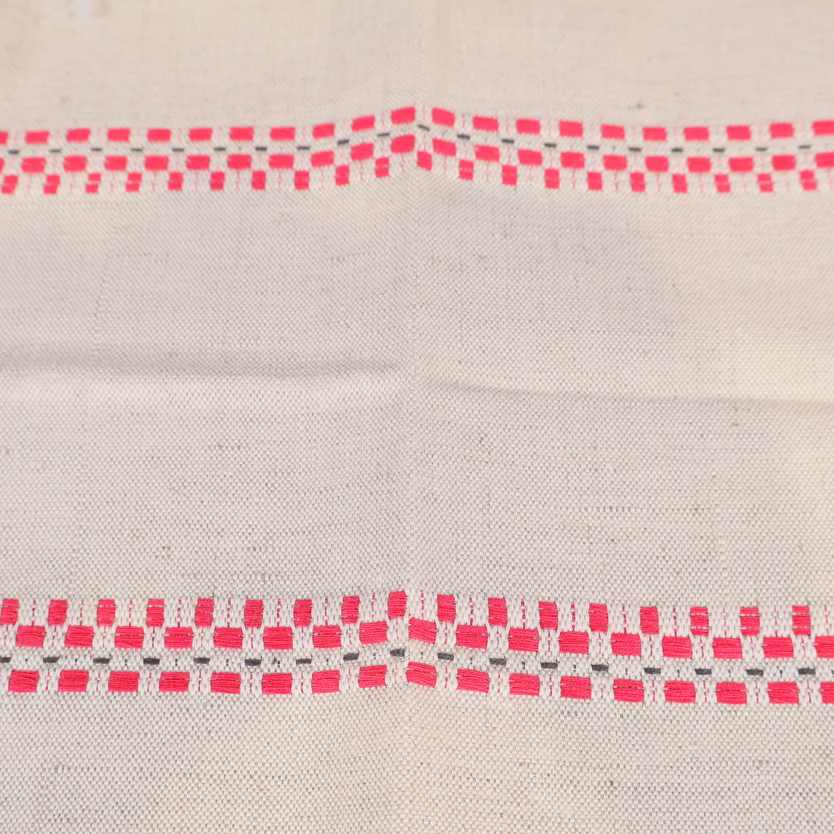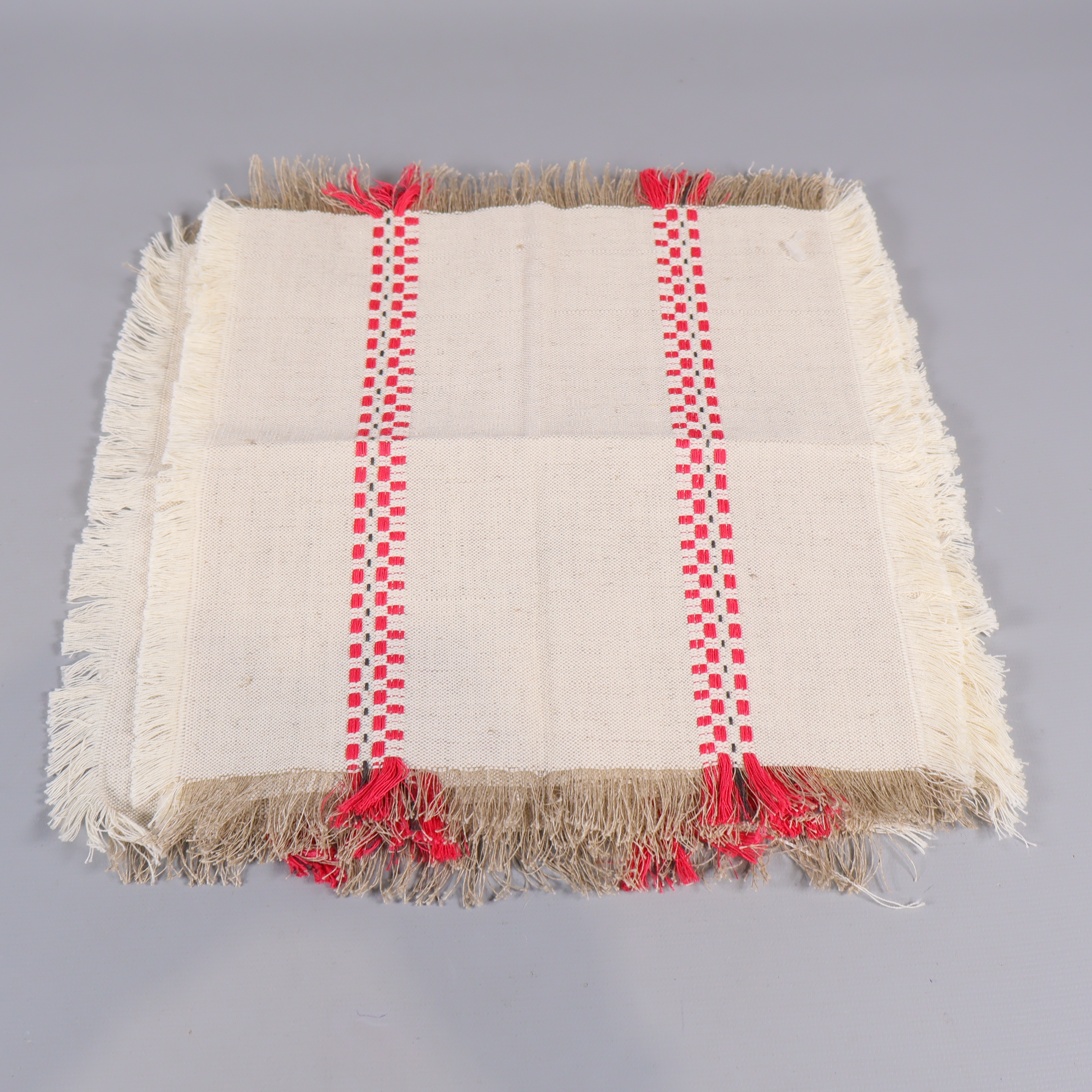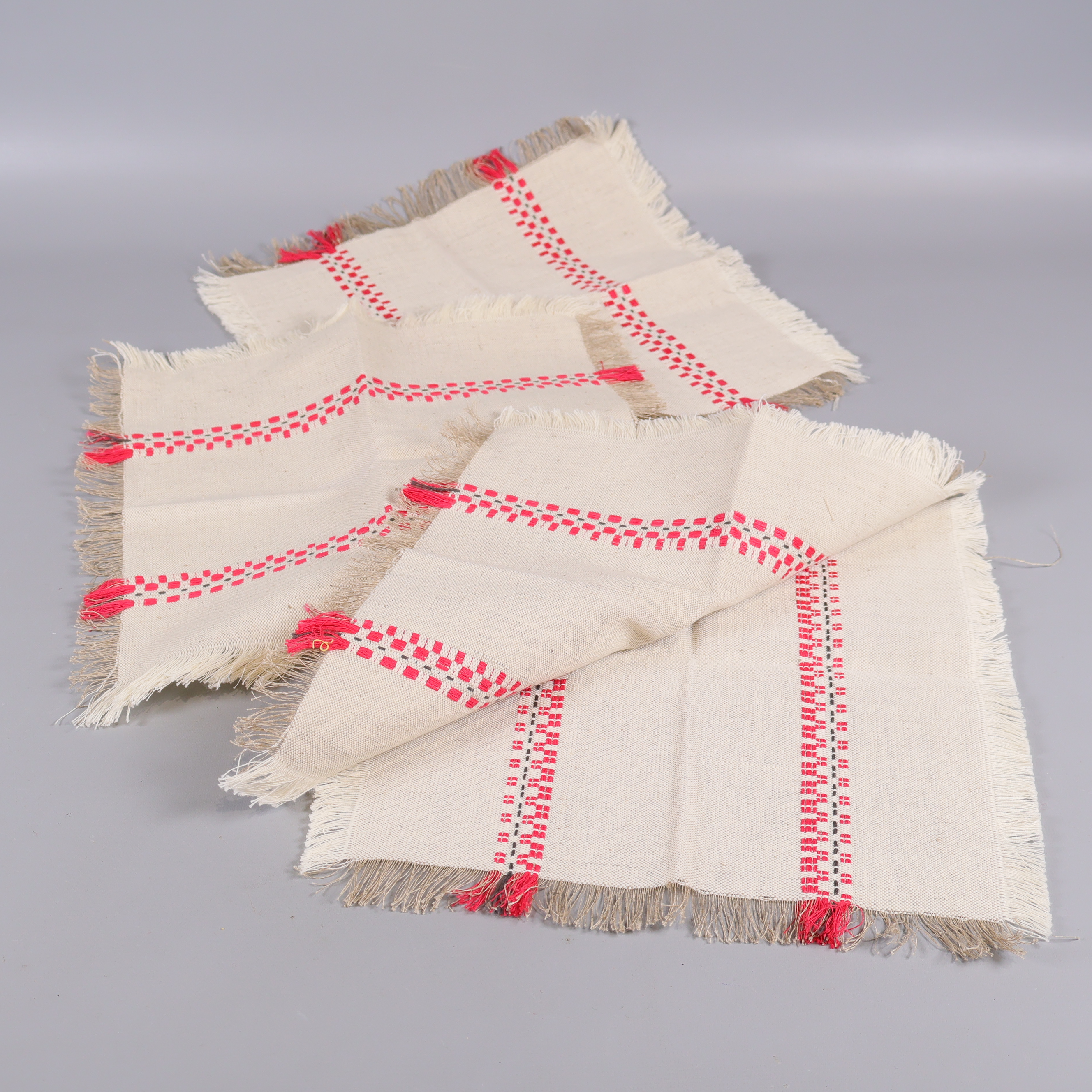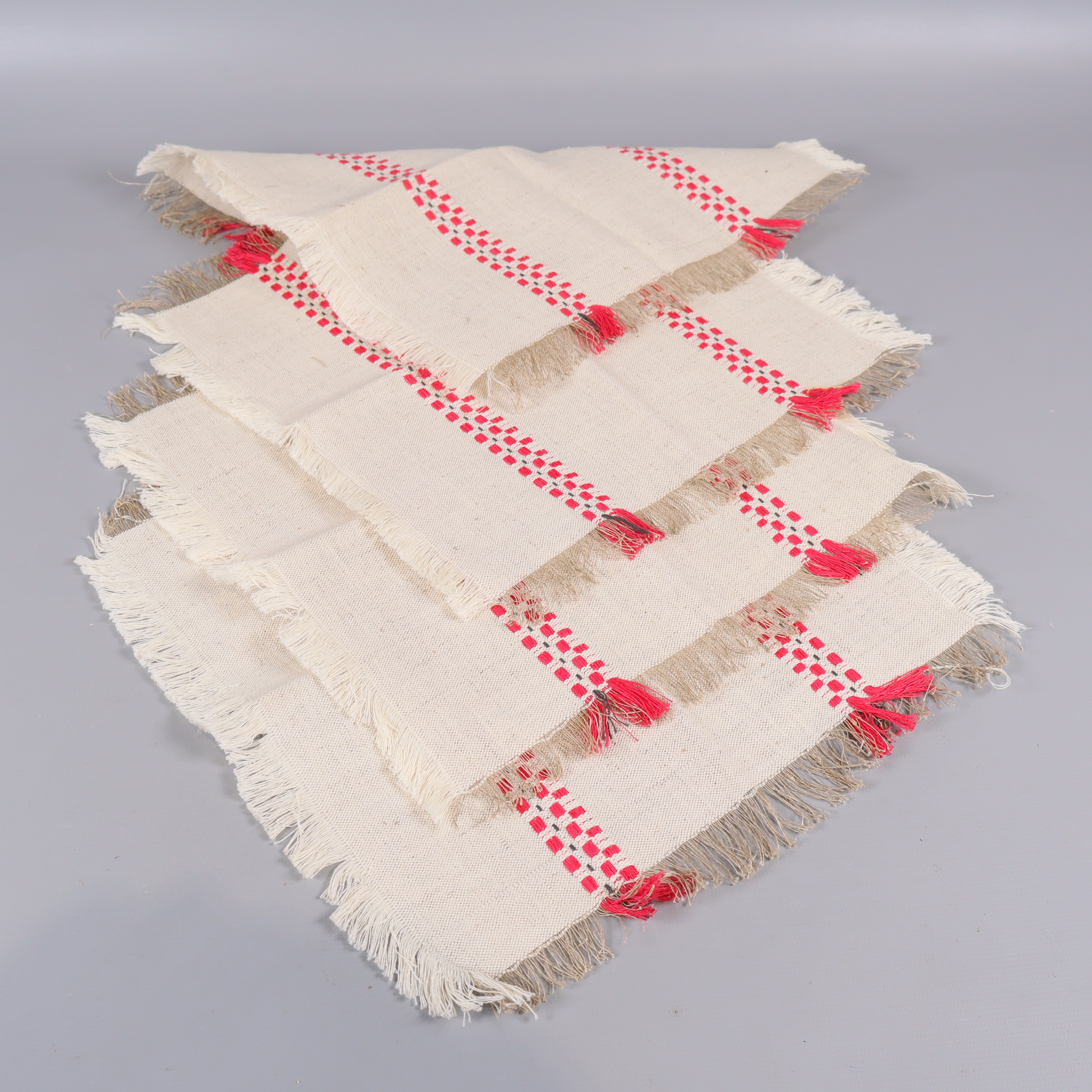 Kvadratiska tygservetter i ljus textil med fransade kanter och dekorativa röda ränder. Klassisk och tidlös design som ger en ombonad känsla till din dukning. Detaljerade, vävda mönster och färgstarka accenter för en personlig touch.