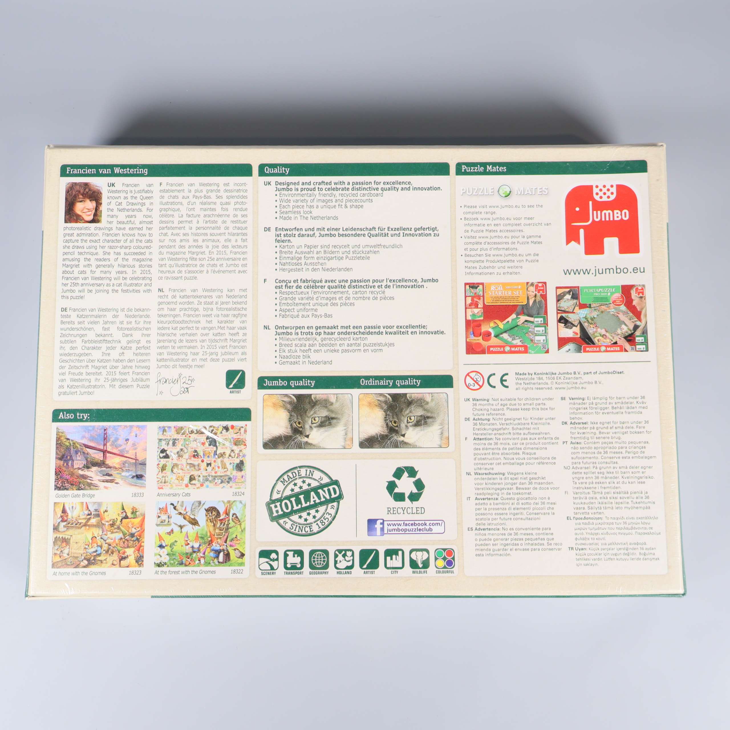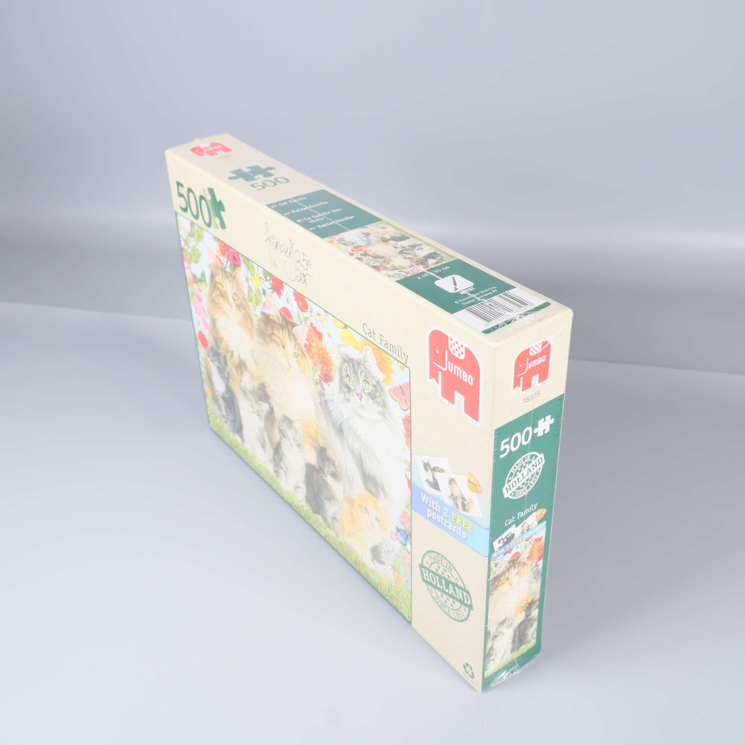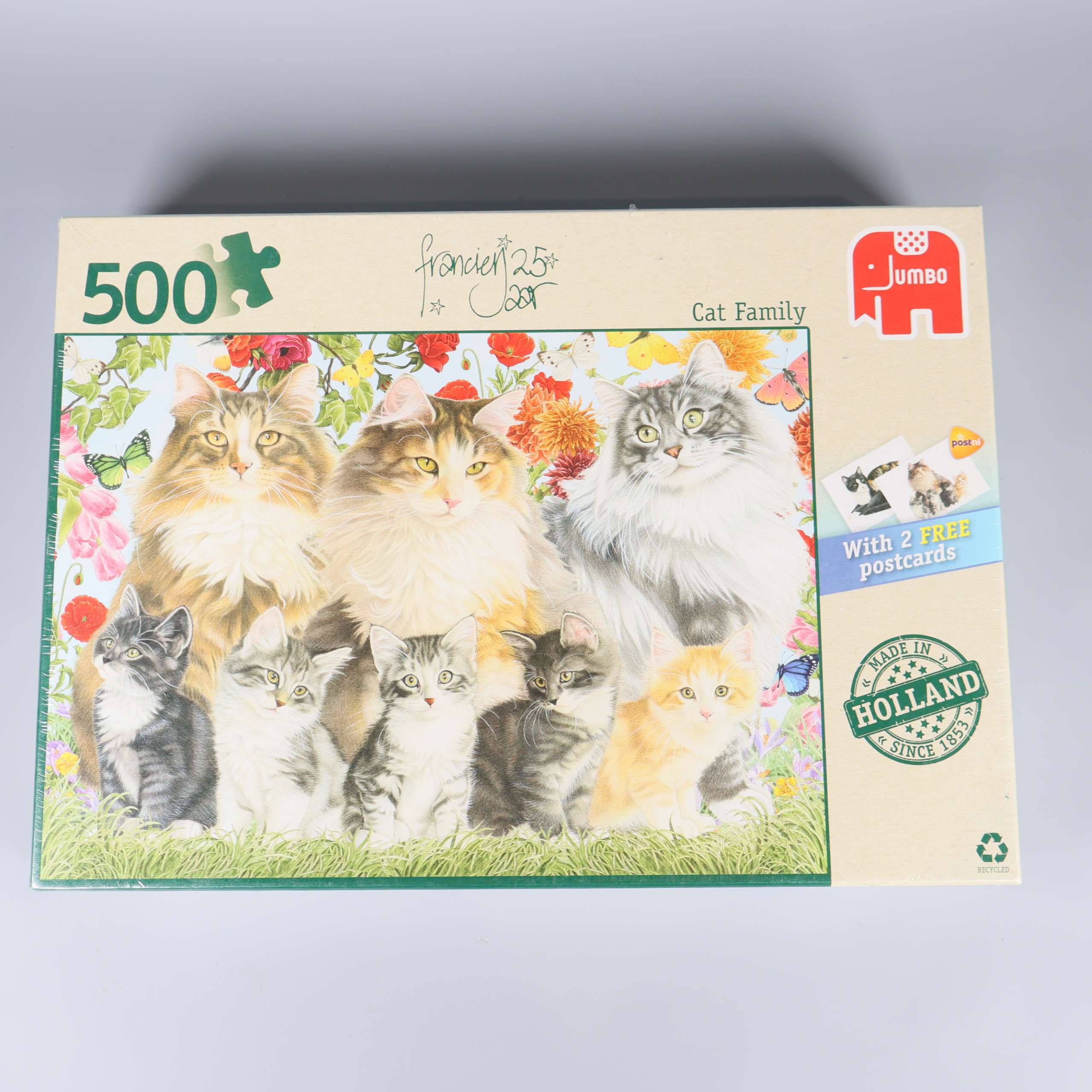 Det här pusslet bjuder på ett charmigt kattmotiv där flera katter poserar framför en färgglad blomsterbakgrund. Den detaljrika illustrationen ger en levande och glädjefylld känsla. Förpackningen kommer i en klassisk kartongdesign med tydliga färger och tydlig märkning. Pusslet består av 500 bitar och passar för många olika åldrar.