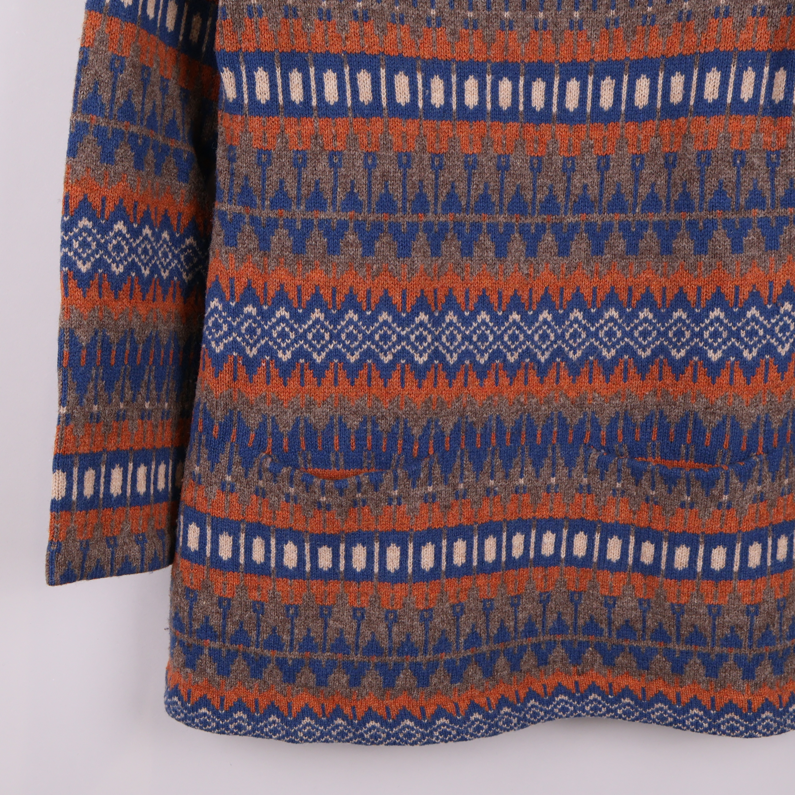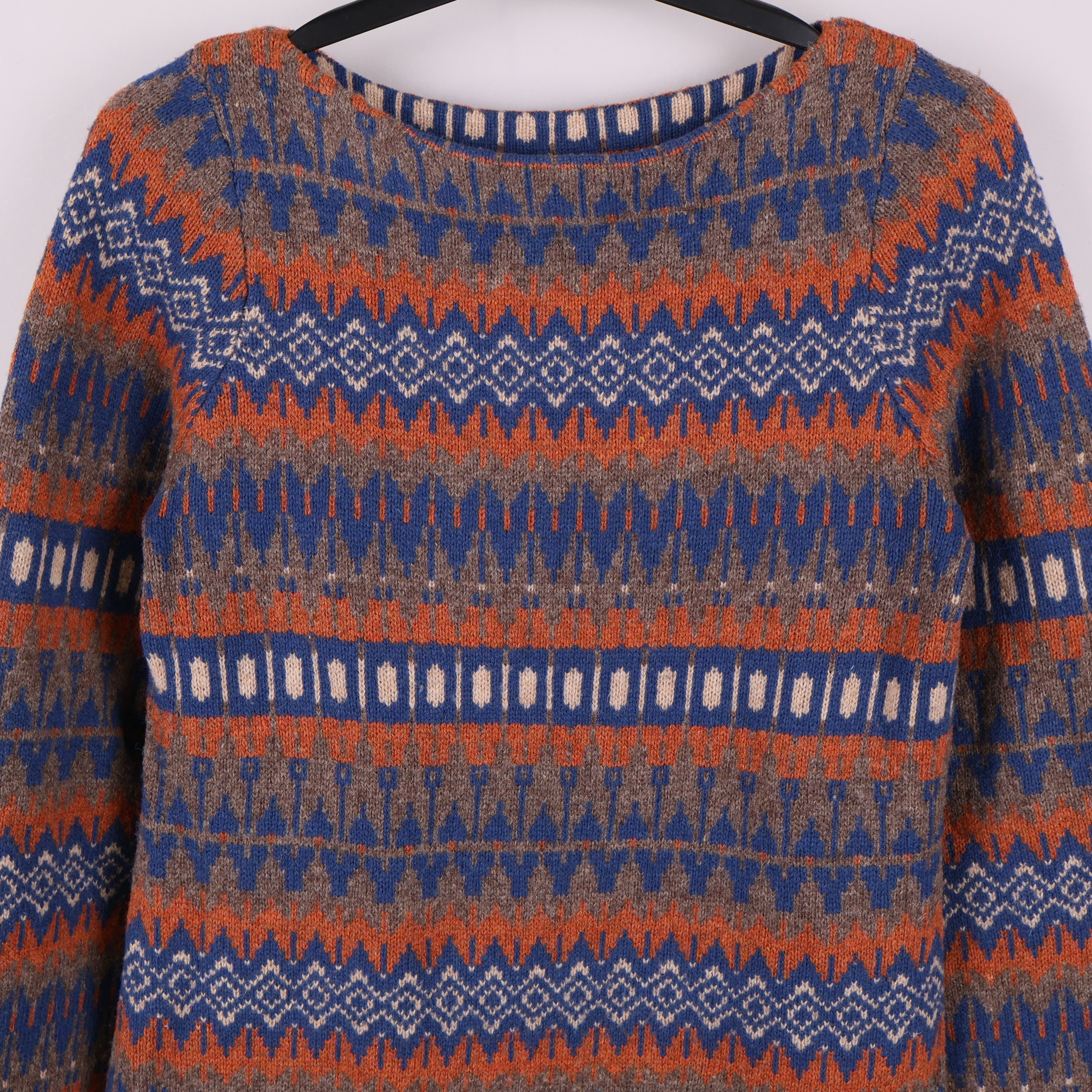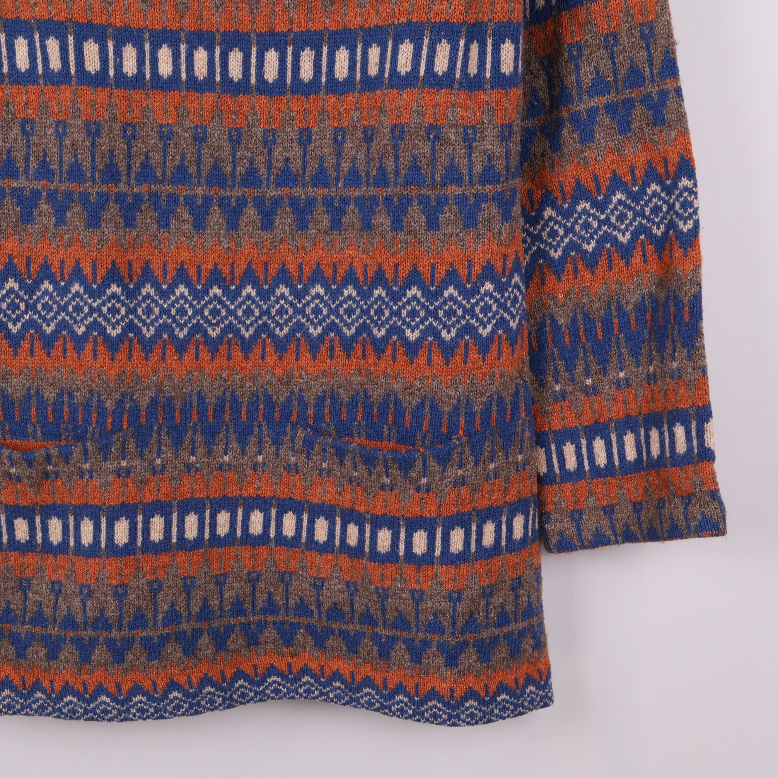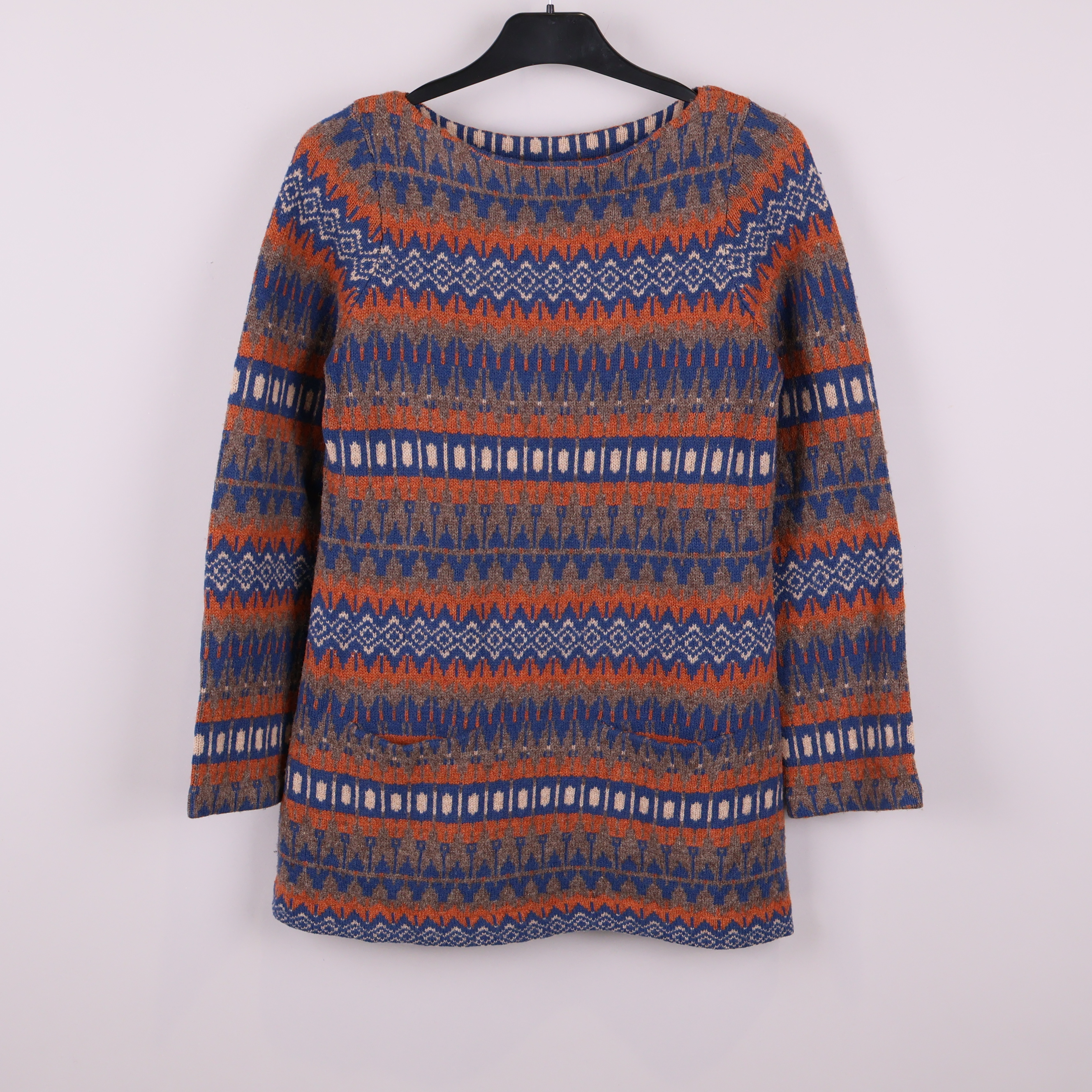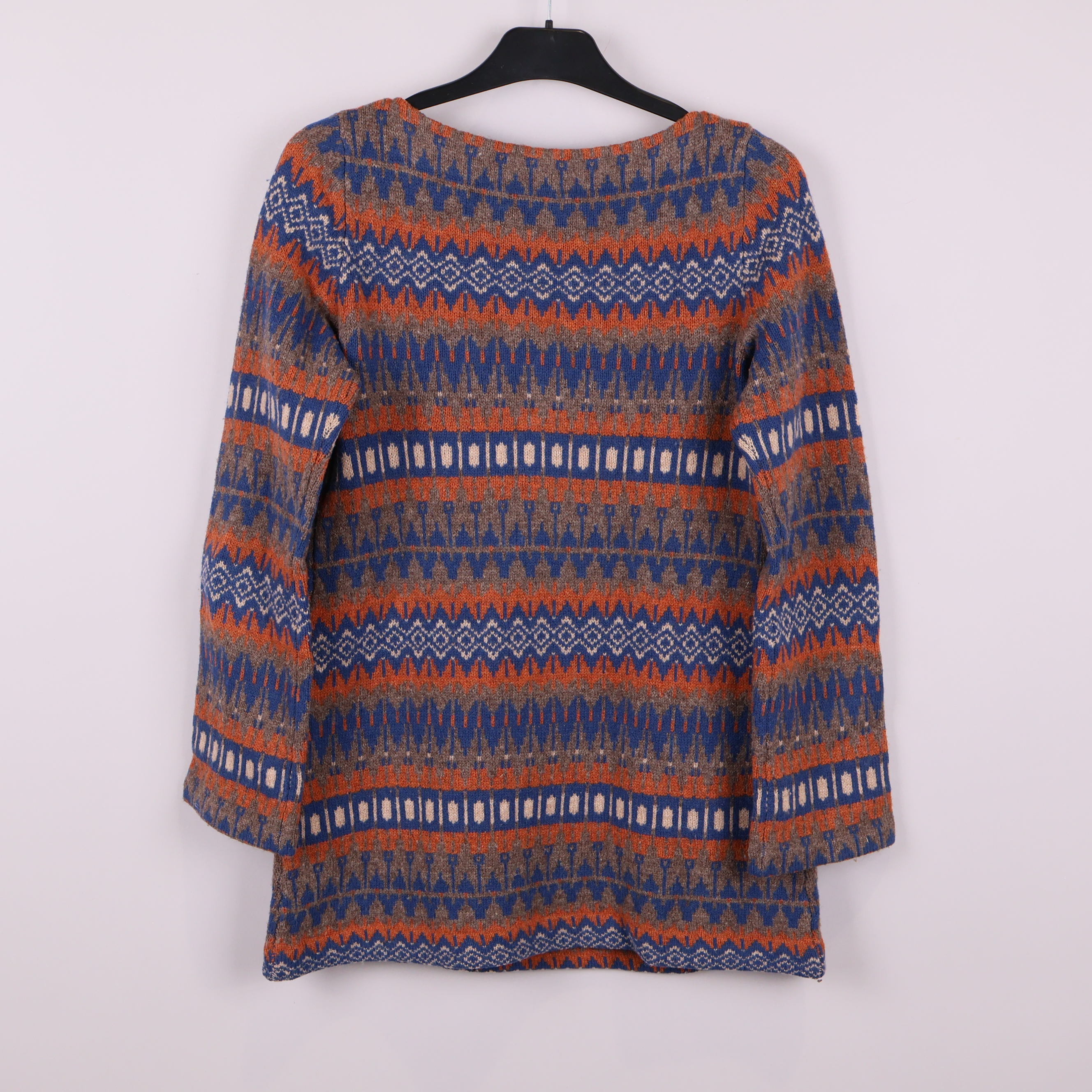 Den här stickade tröjan från Jumperfabriken har ett distinkt och färgstarkt mönster med inslag av blått, orange, brunt och vitt. Rundad halsringning och rak, något längre passform ger en klassisk men avslappnad look. Tillverkad i 100% lammull som känns mjuk mot huden. Passar perfekt för dig som gillar retroinspirerade plagg med lite extra karaktär.