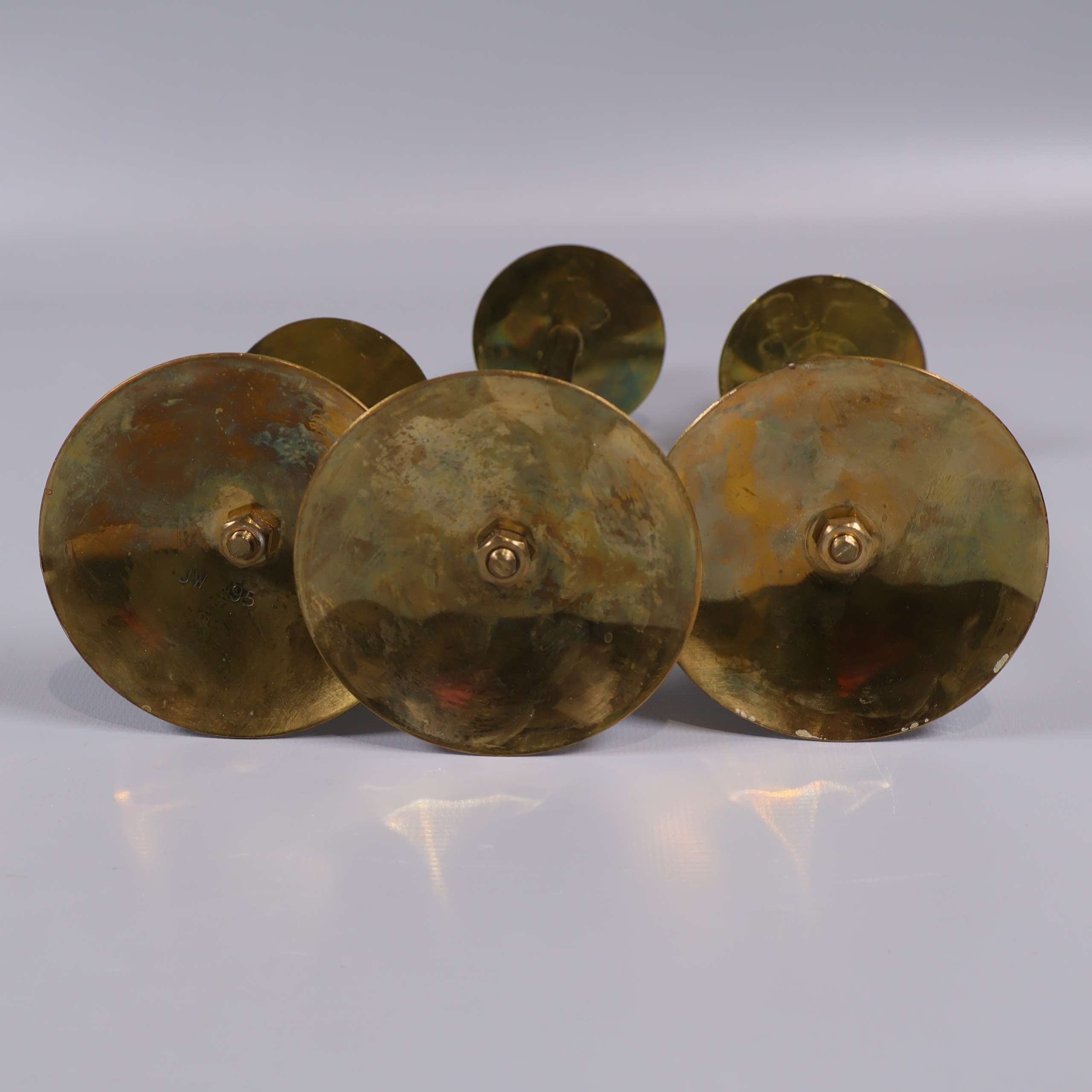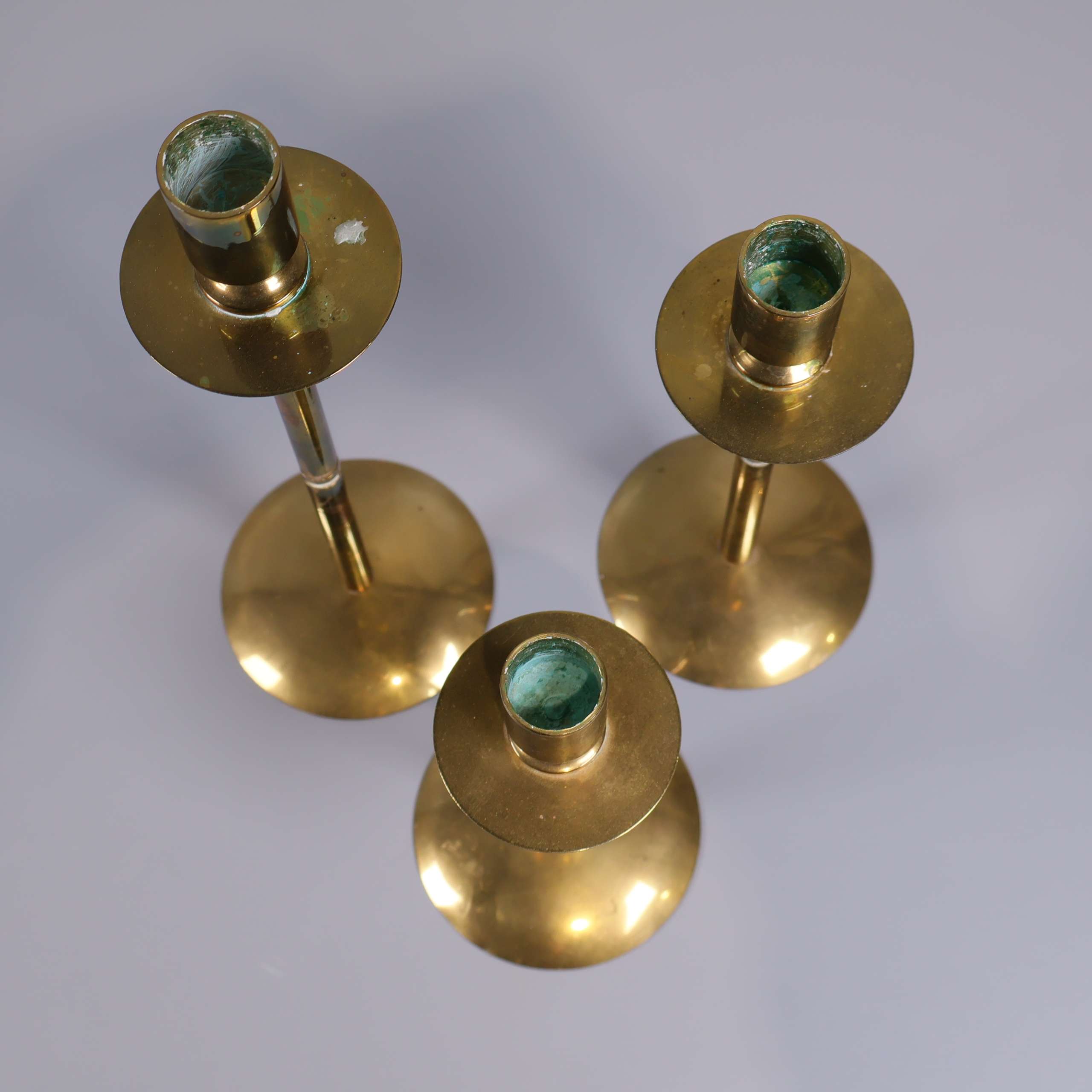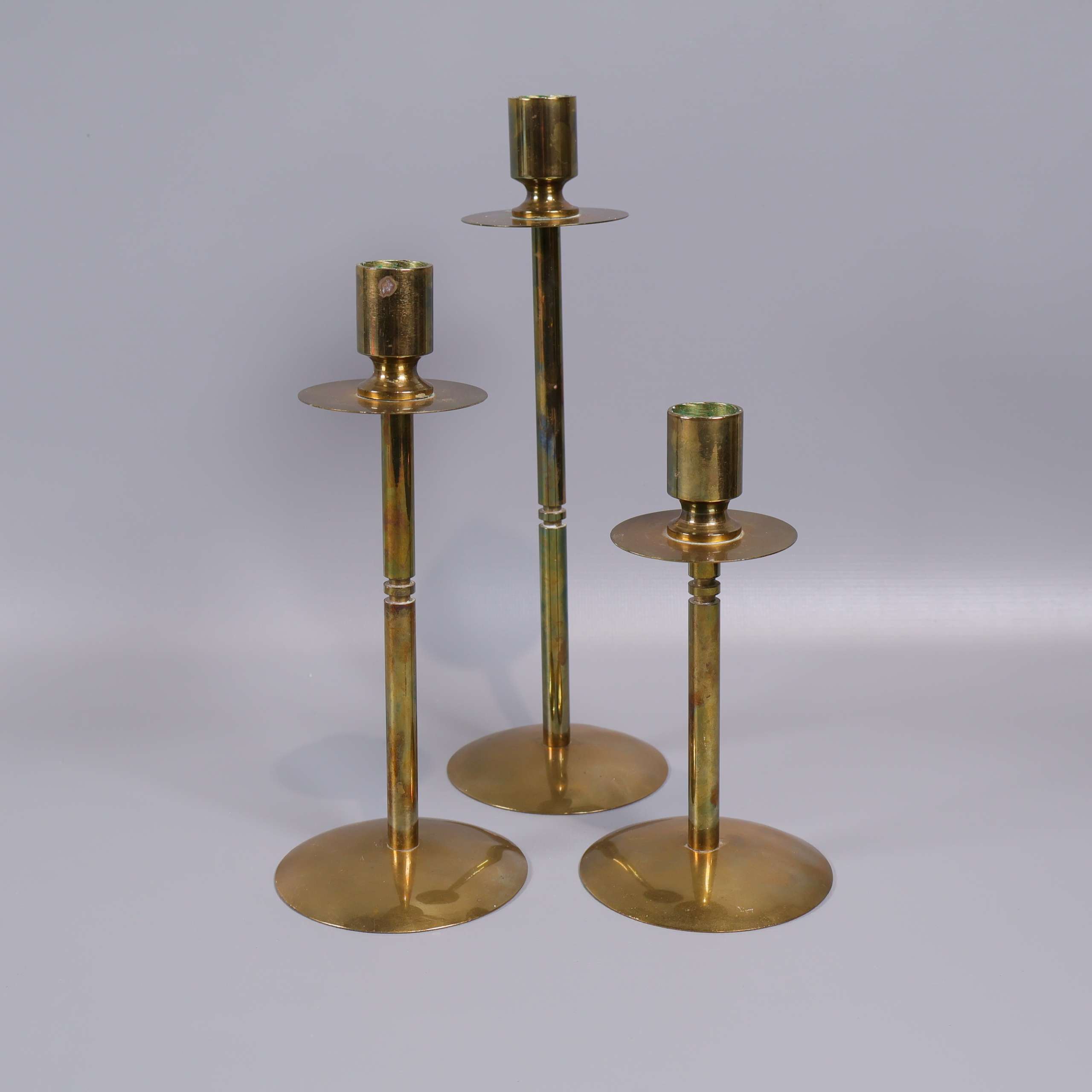 Set med tre ljusstakar i mässing med klassisk design och rena linjer. Den blanka, gyllene ytan ger ett elegant och tidlöst uttryck. Varierande höjder skapar fin dynamik oavsett placering. En subtil vintage vibe som enkelt smälter in i både moderna och traditionella hem.