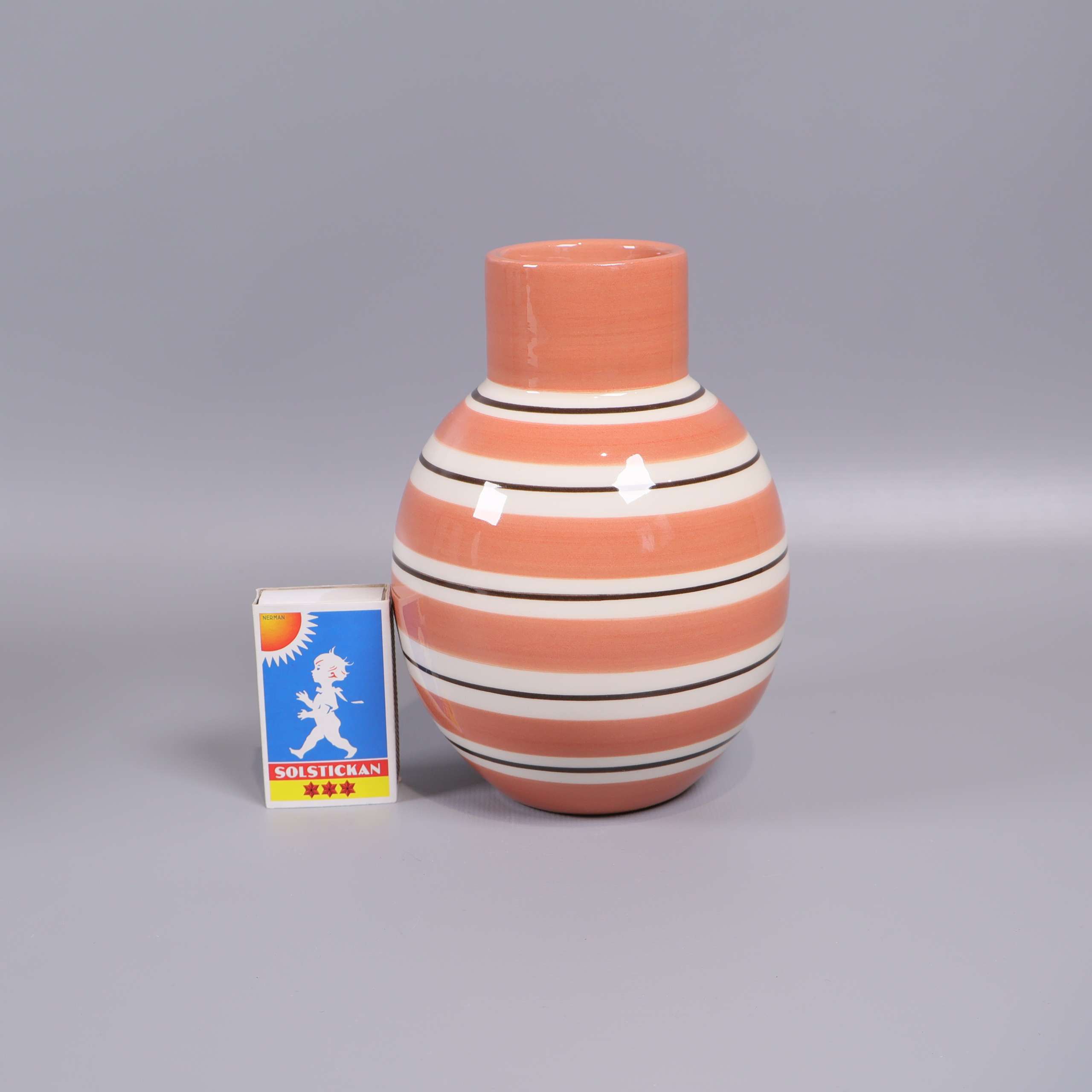 Stilren vas från Kähler i designen Omaggio Nuovo med handmålade horisontella ränder i mjukt aprikos och vitt. Formgiven av Reckweg & Nordentoft, perfekt för att addera en modern och lekfull touch i hemmet. Klassisk rund form och blank finish.