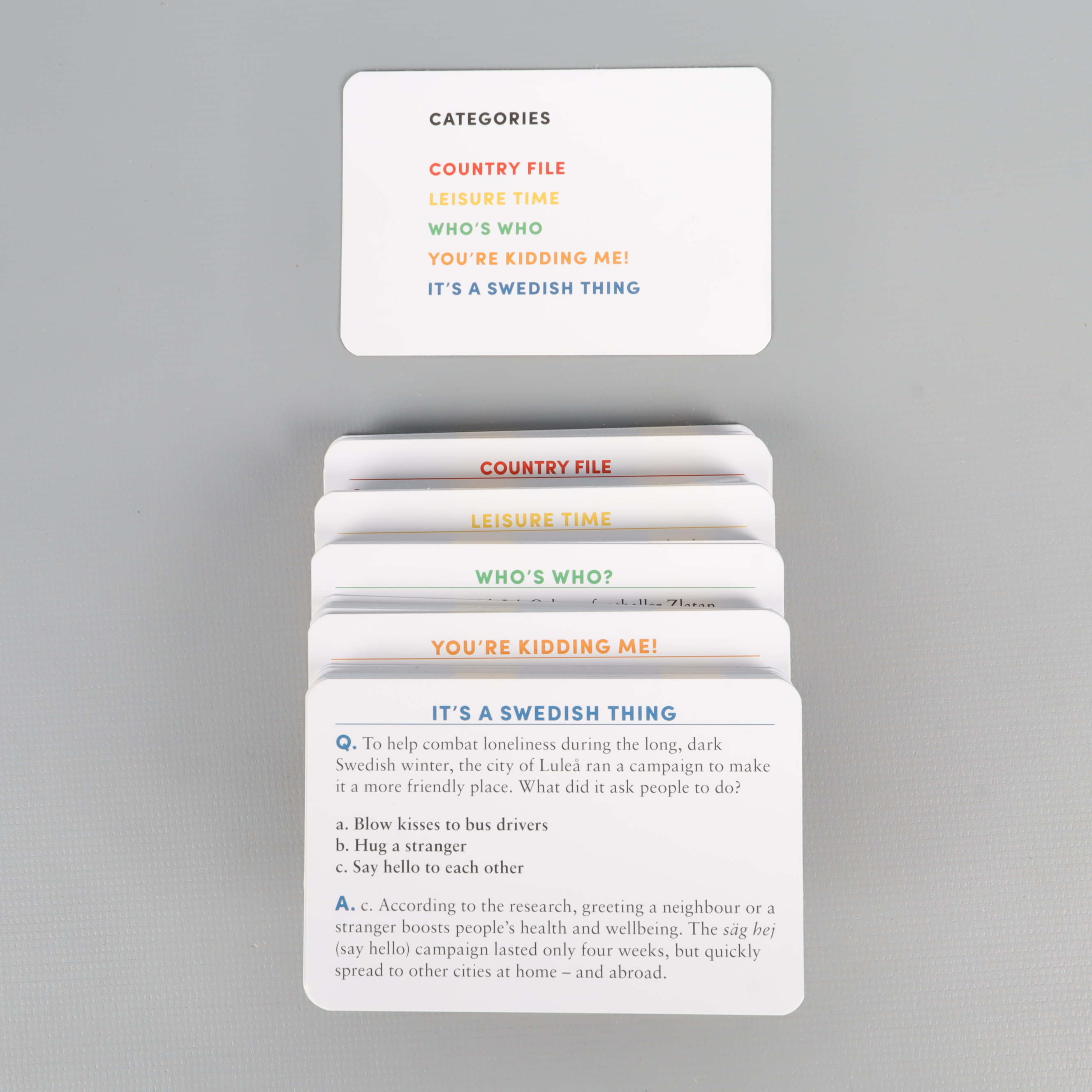 Quizspel med färgglad design och tydliga kategorikort som utmanar dina kunskaper om Sverige. Lådan är lätthanterlig och fylld med frågekort i olika kategorier, snyggt packade för enkel förvaring. Passar dig som gillar smart underhållning och spelkväll med vänner, allt på engelska för en internationell touch.