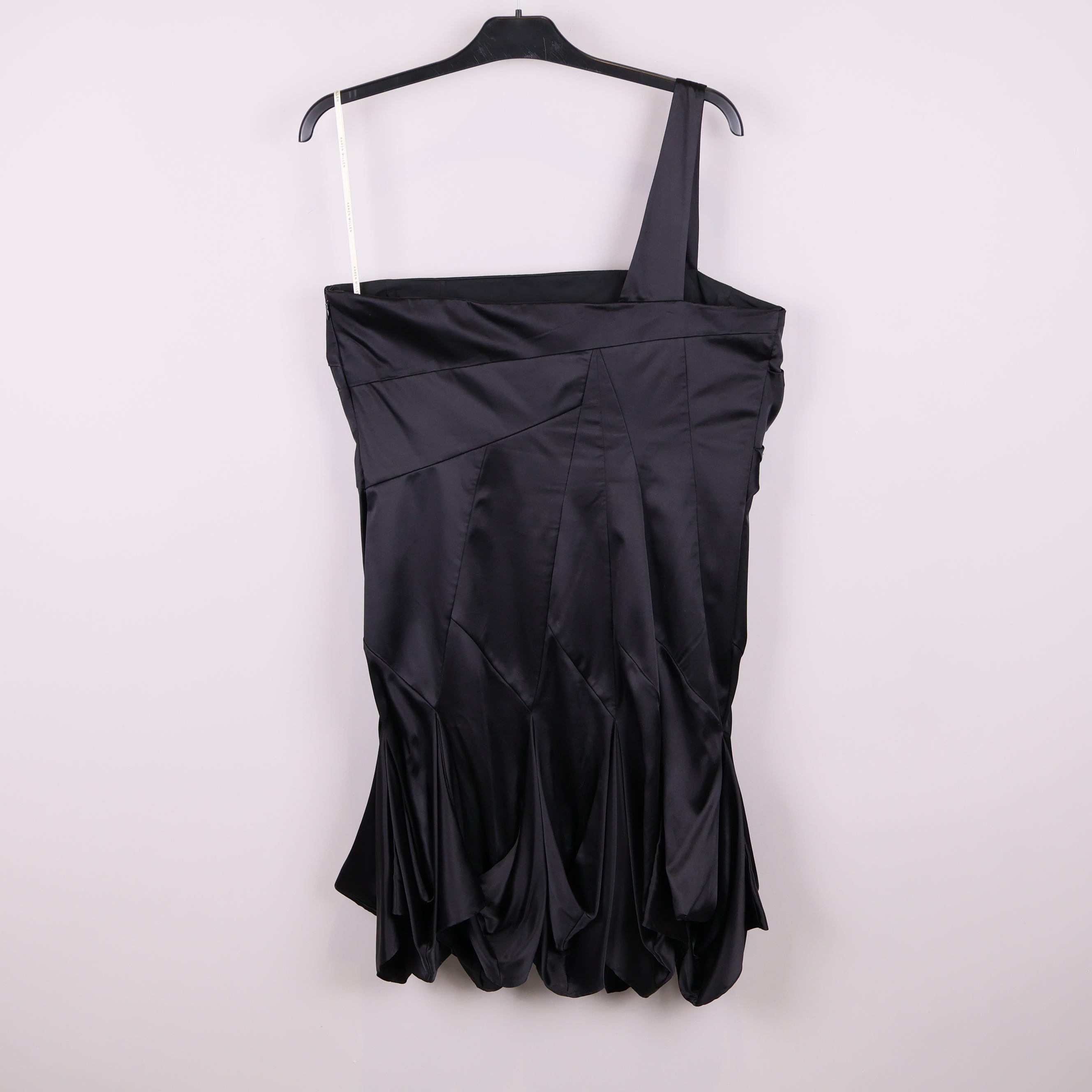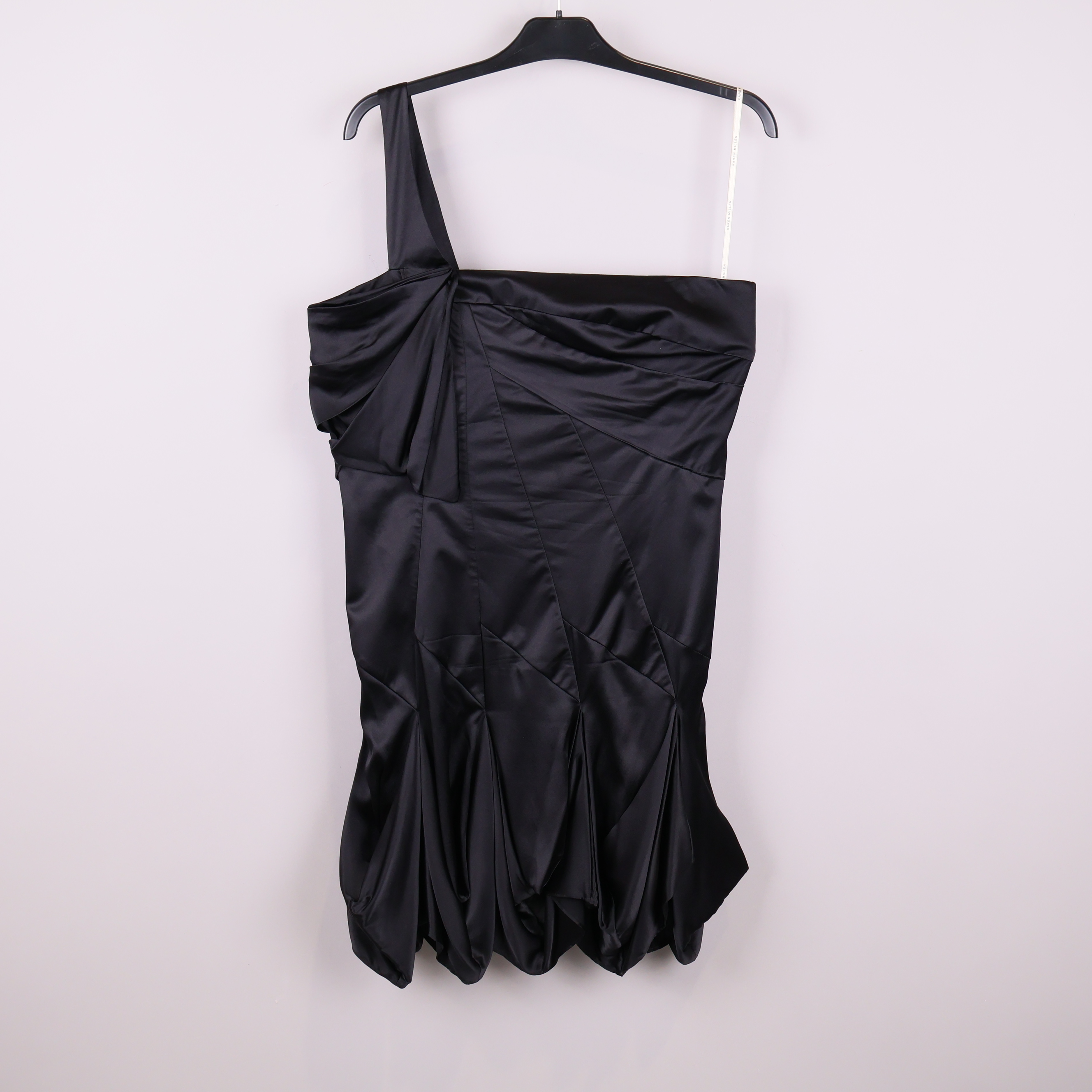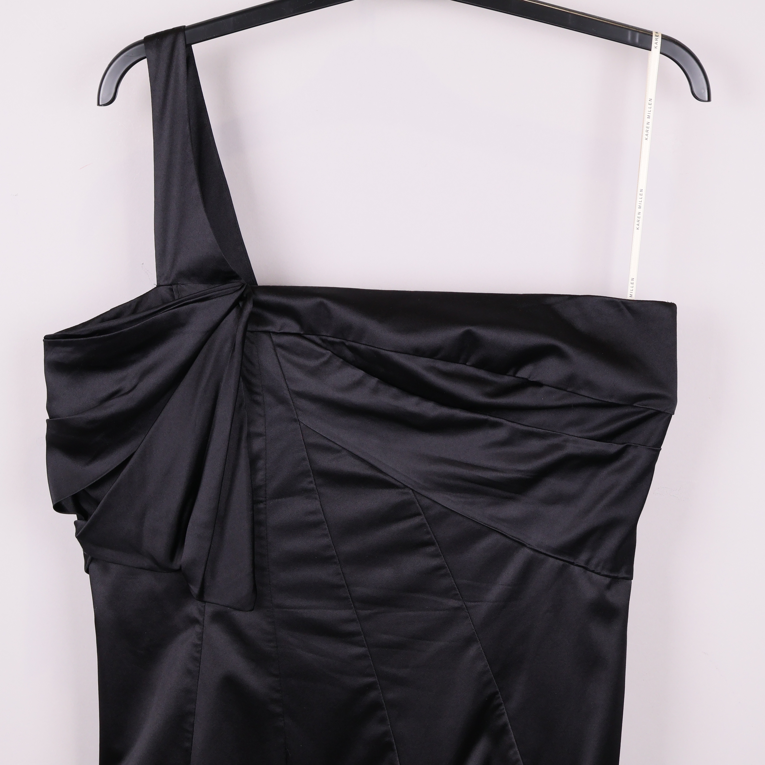 Svart klänning från Karen Millen med asymmetrisk axel och stilrena draperingar över hela plagget. Materialet har en snygg, diskret glans som ger en exklusiv känsla.