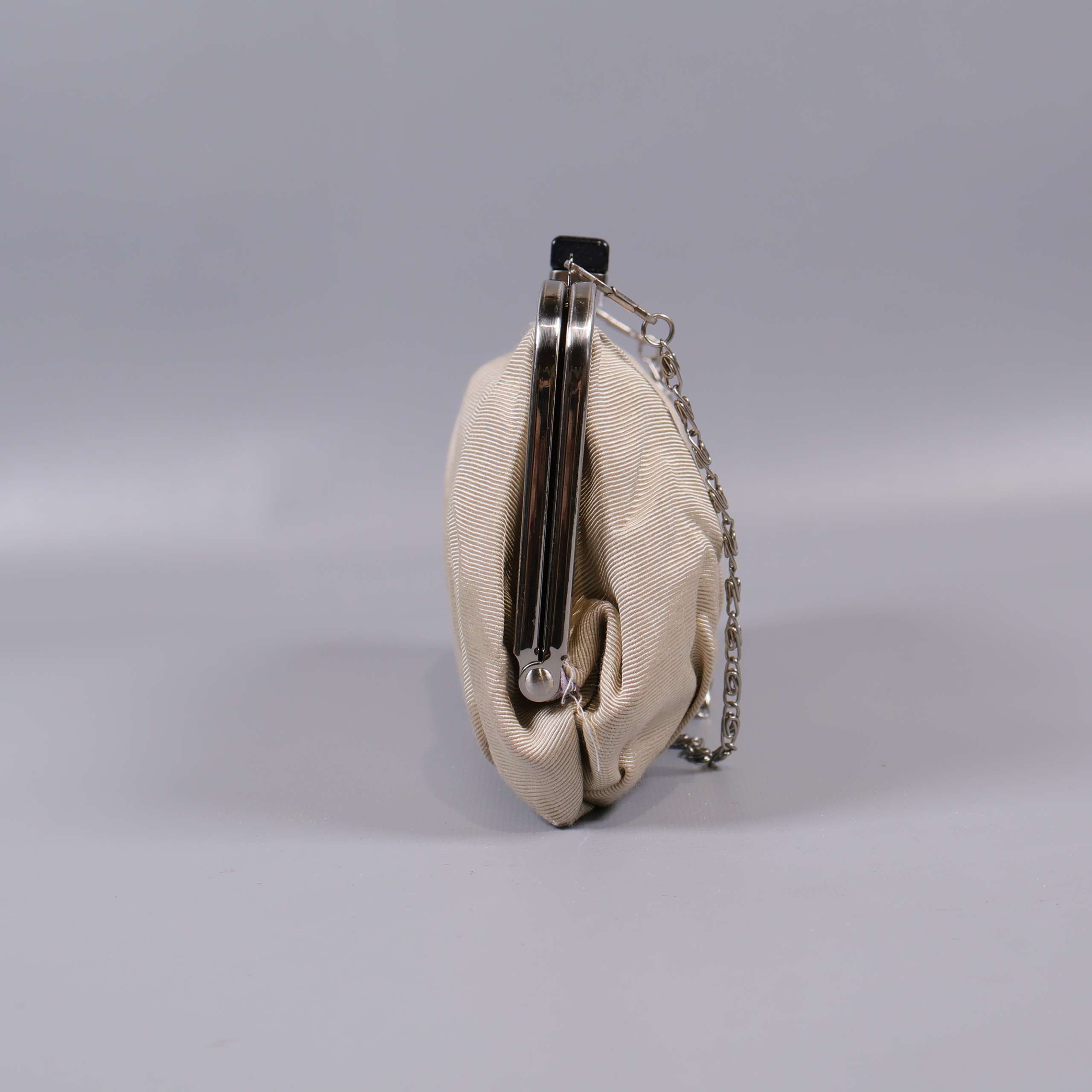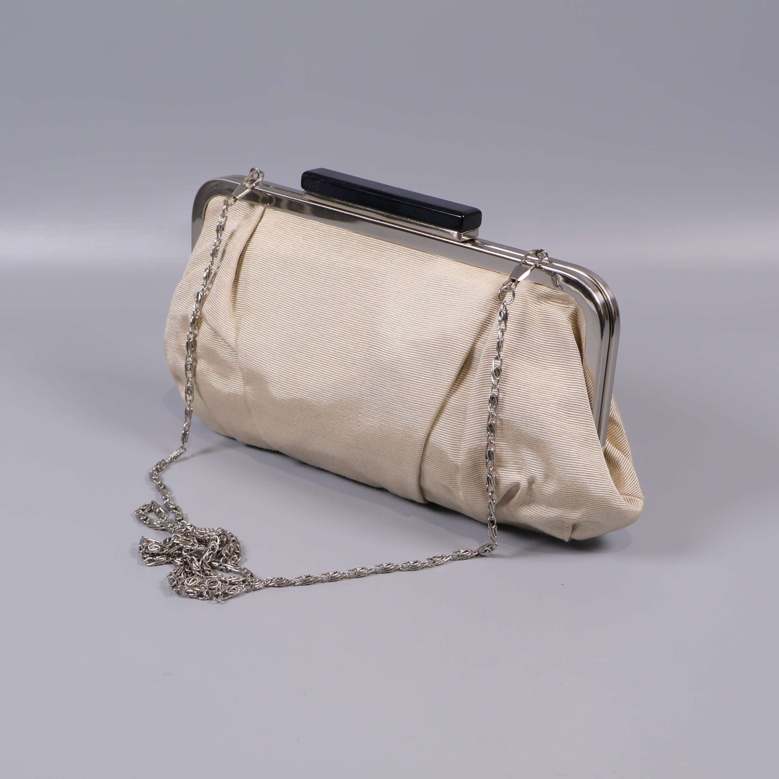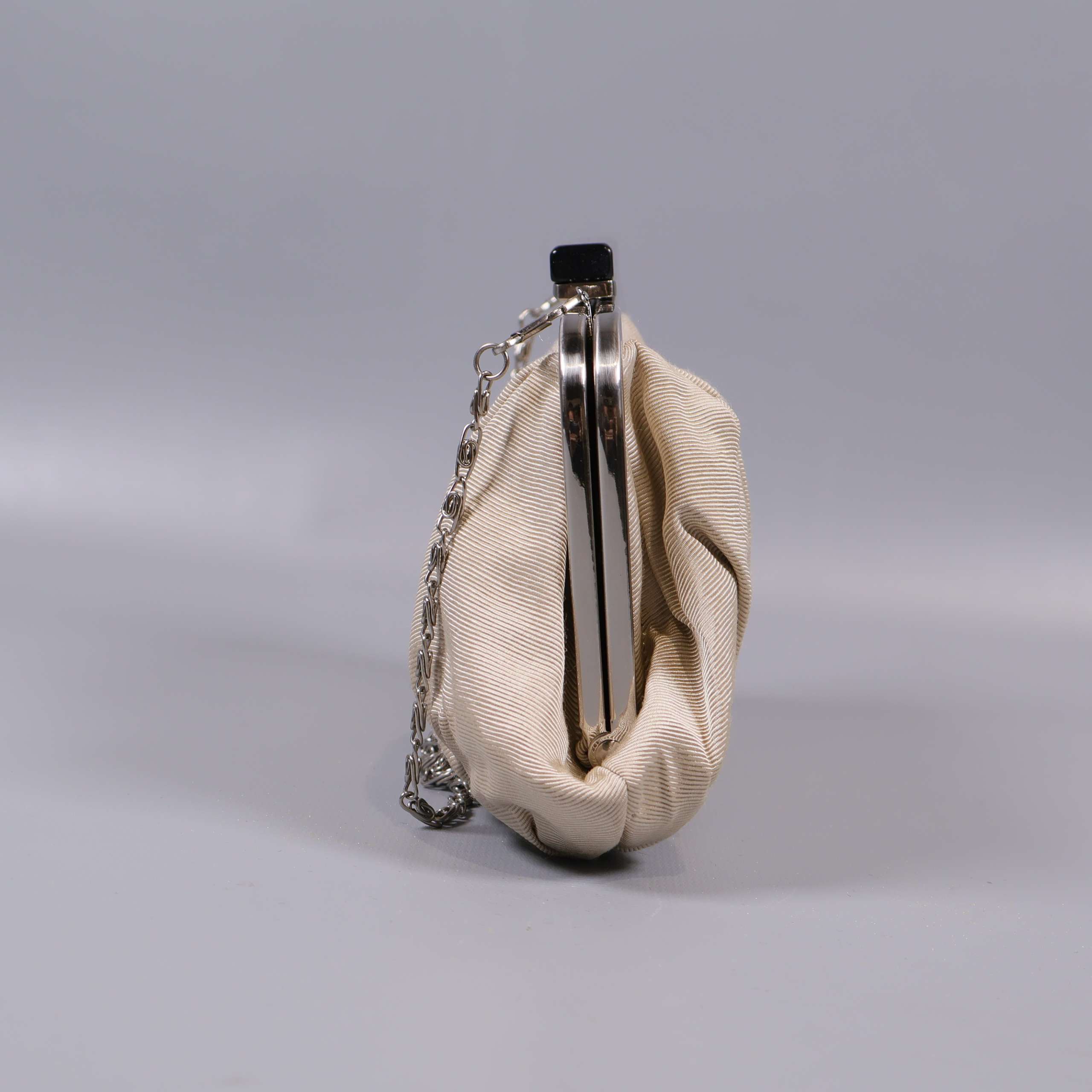 Elegant kuvertväska i beige tyg med diskret struktur och stilren metallram i silverfärg. Väskan har en avtagbar kedjerem och klassisk knäppe i svart högblank detalj. Insidan är fodrad i ljuslila satin för en extra lyxig känsla.