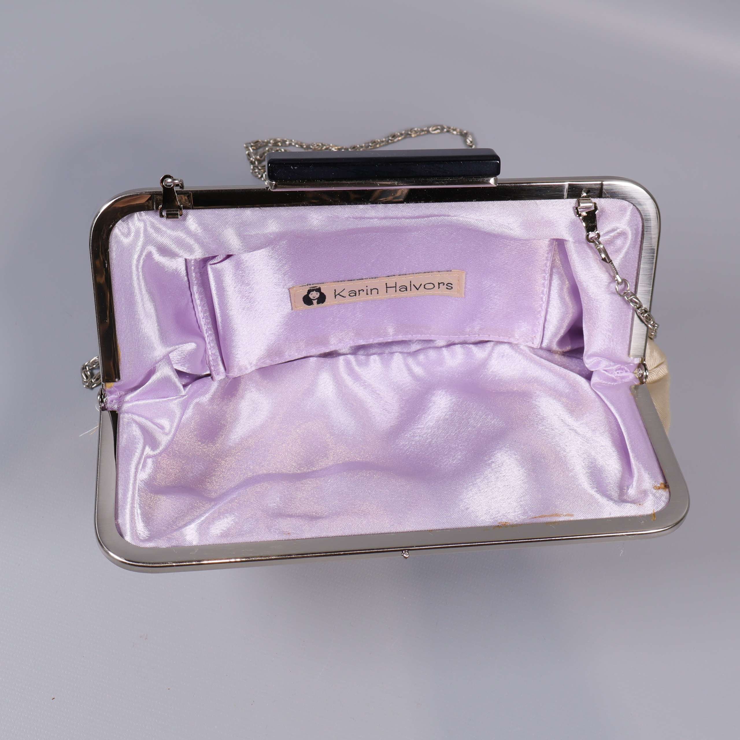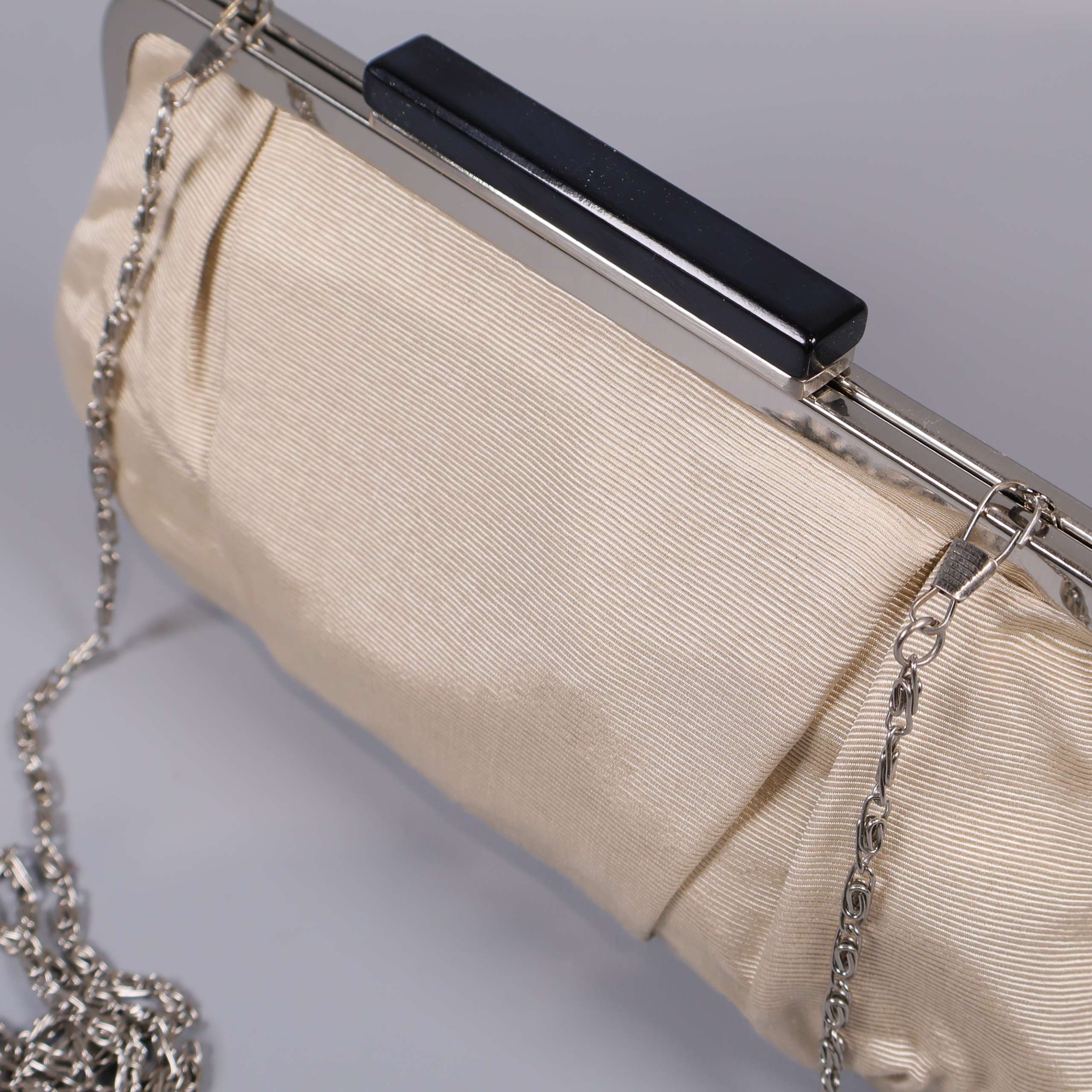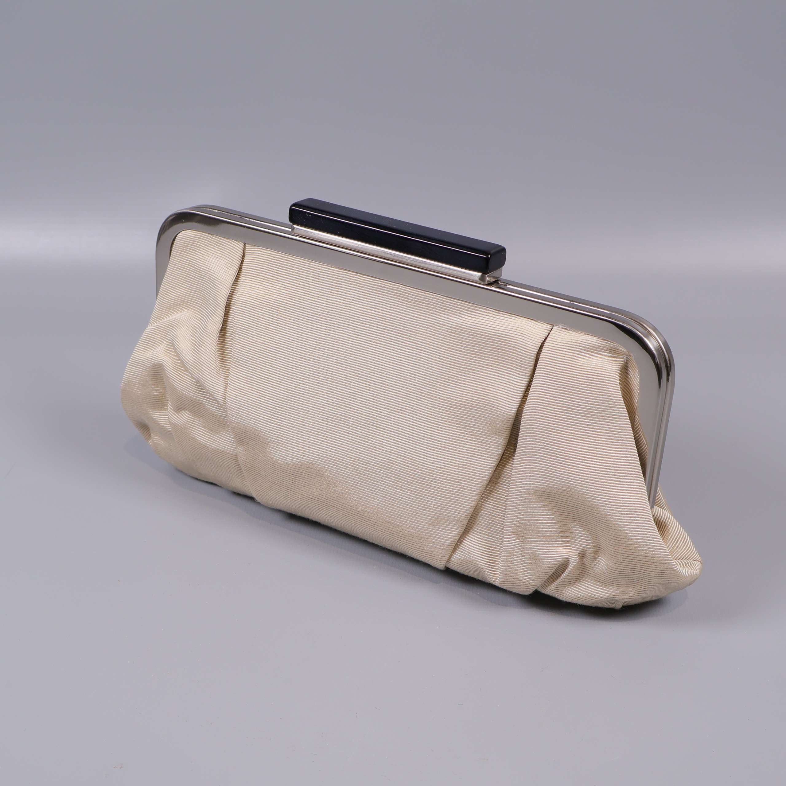 Elegant kuvertväska i beige tyg med diskret struktur och stilren metallram i silverfärg. Väskan har en avtagbar kedjerem och klassisk knäppe i svart högblank detalj. Insidan är fodrad i ljuslila satin för en extra lyxig känsla.
