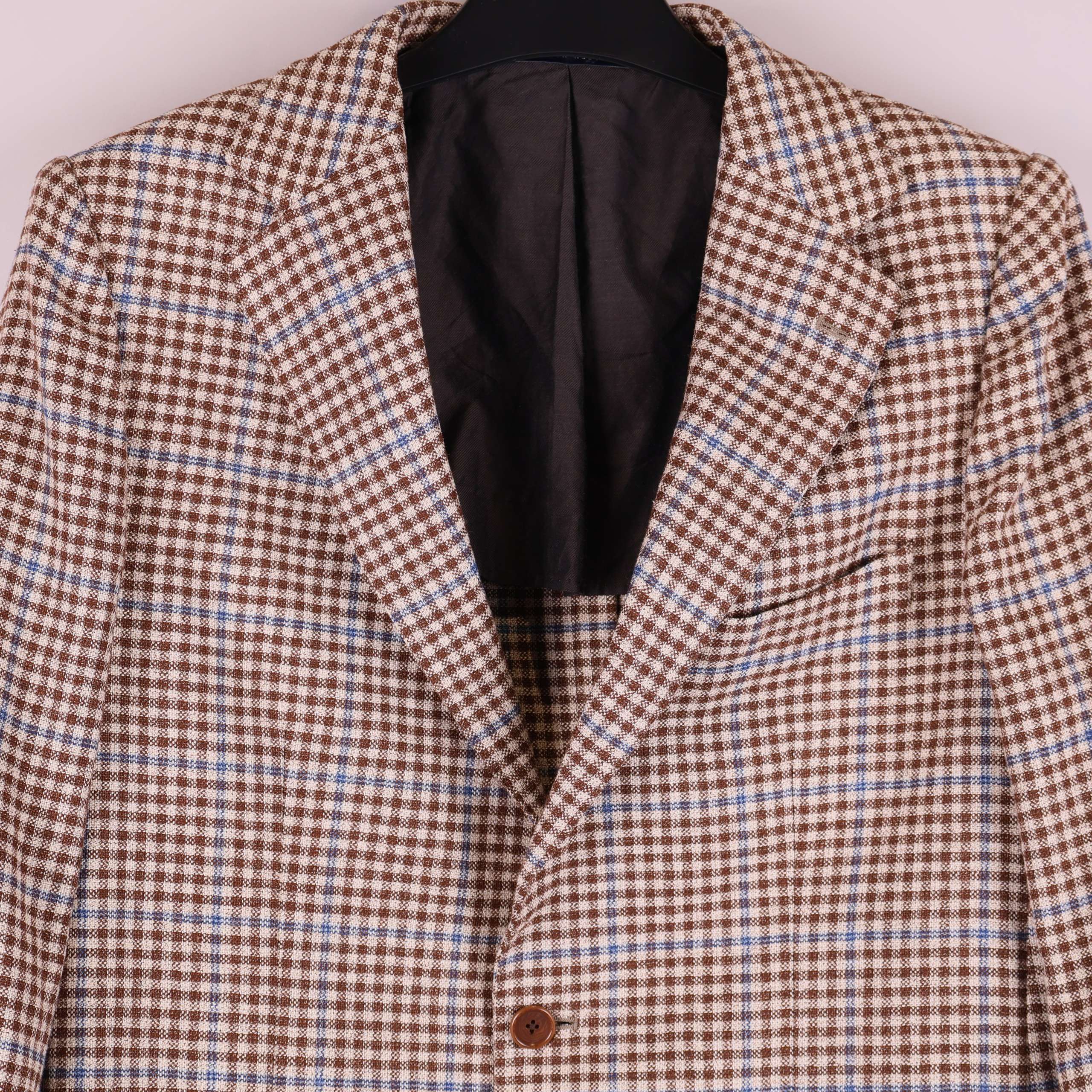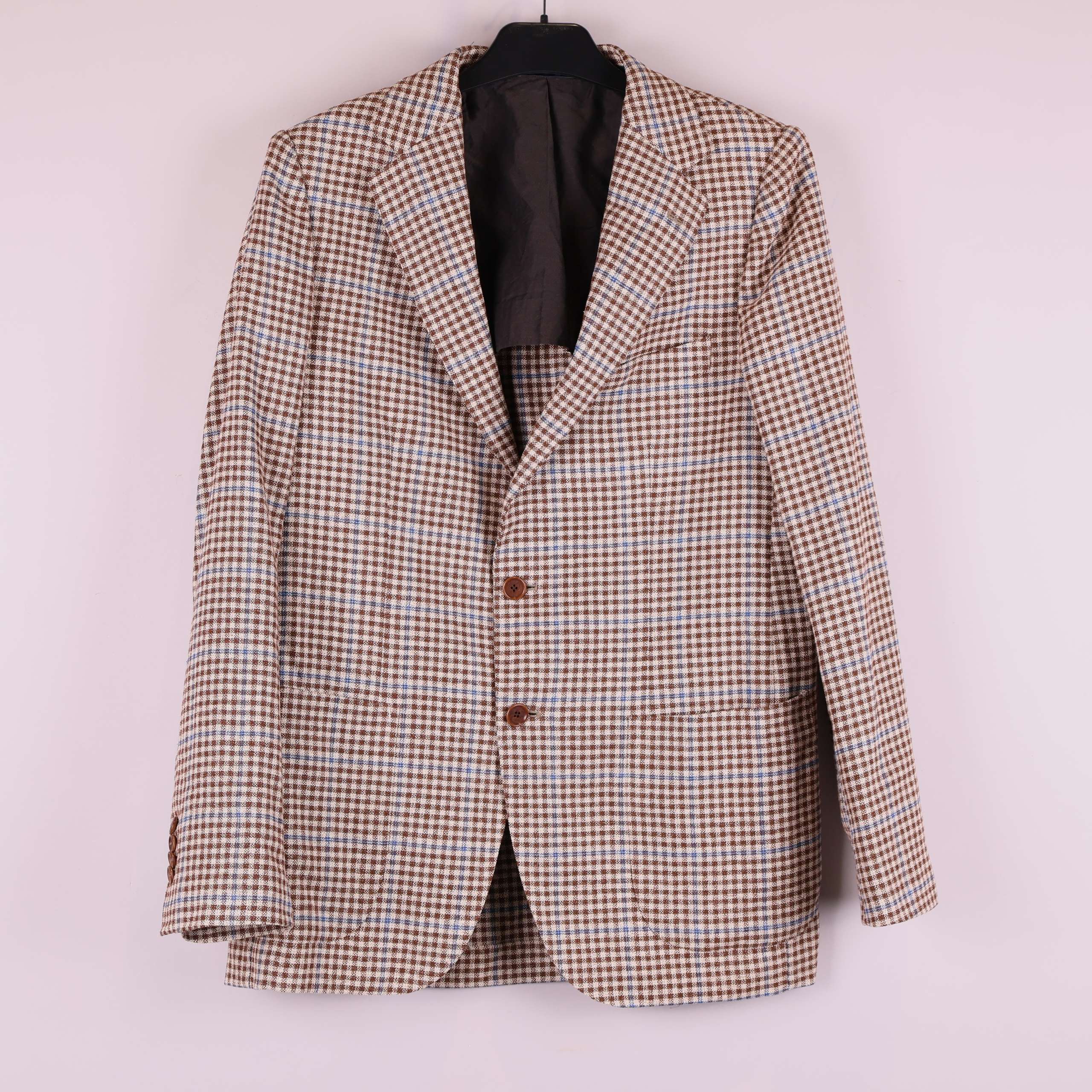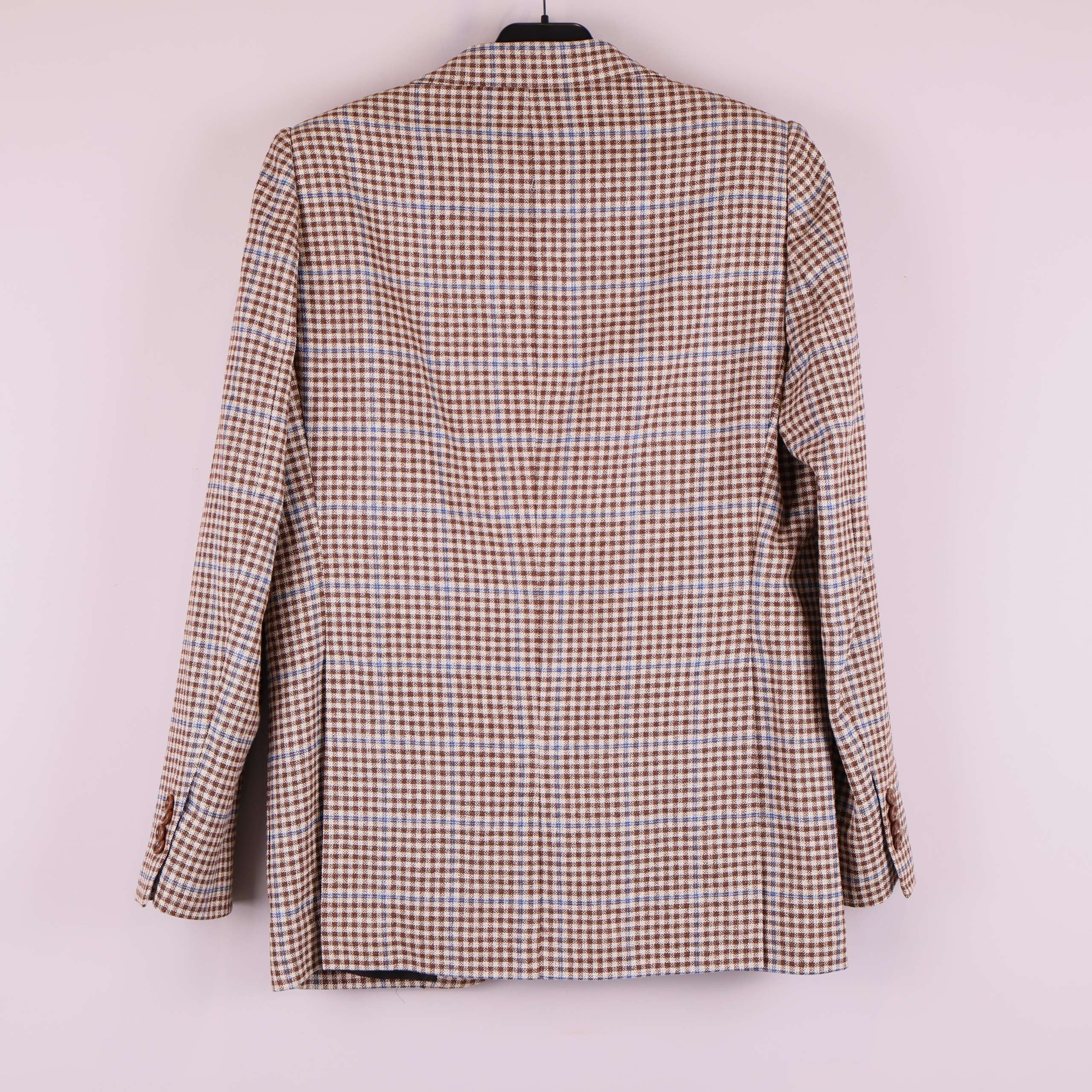 Denna kavaj har ett stilrent rutigt mönster i bruna och ljusblå toner, tvåknäppning framtill och klassiska snitt. Fodret är mörkt och kontrasterar fint mot utsidan. Kavajen har fickor med lock och dekorativa knappar vid ärmsluten. Materialkänslan ger en dressad, tidlös look som passar för både vardag och mer uppklädda tillfällen.