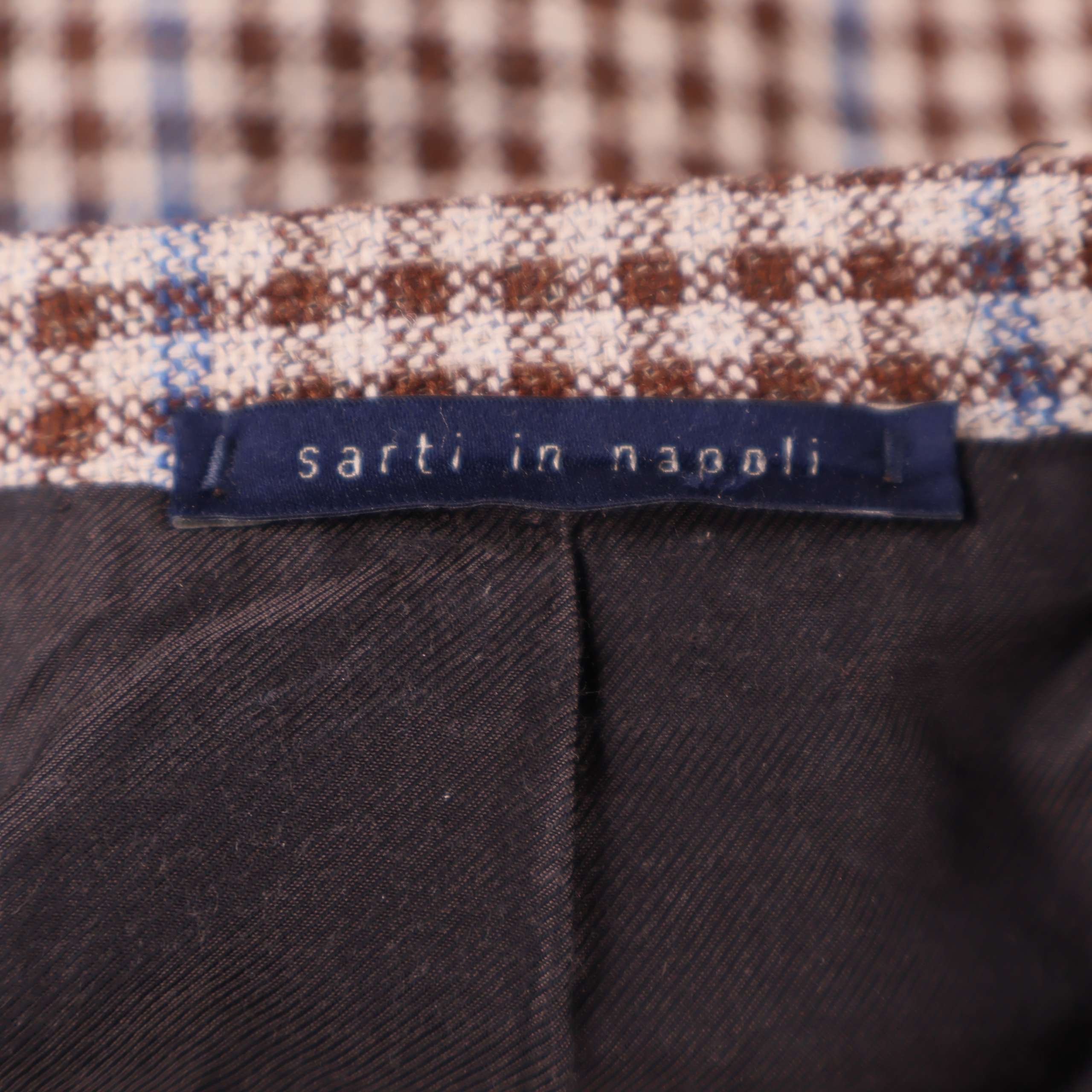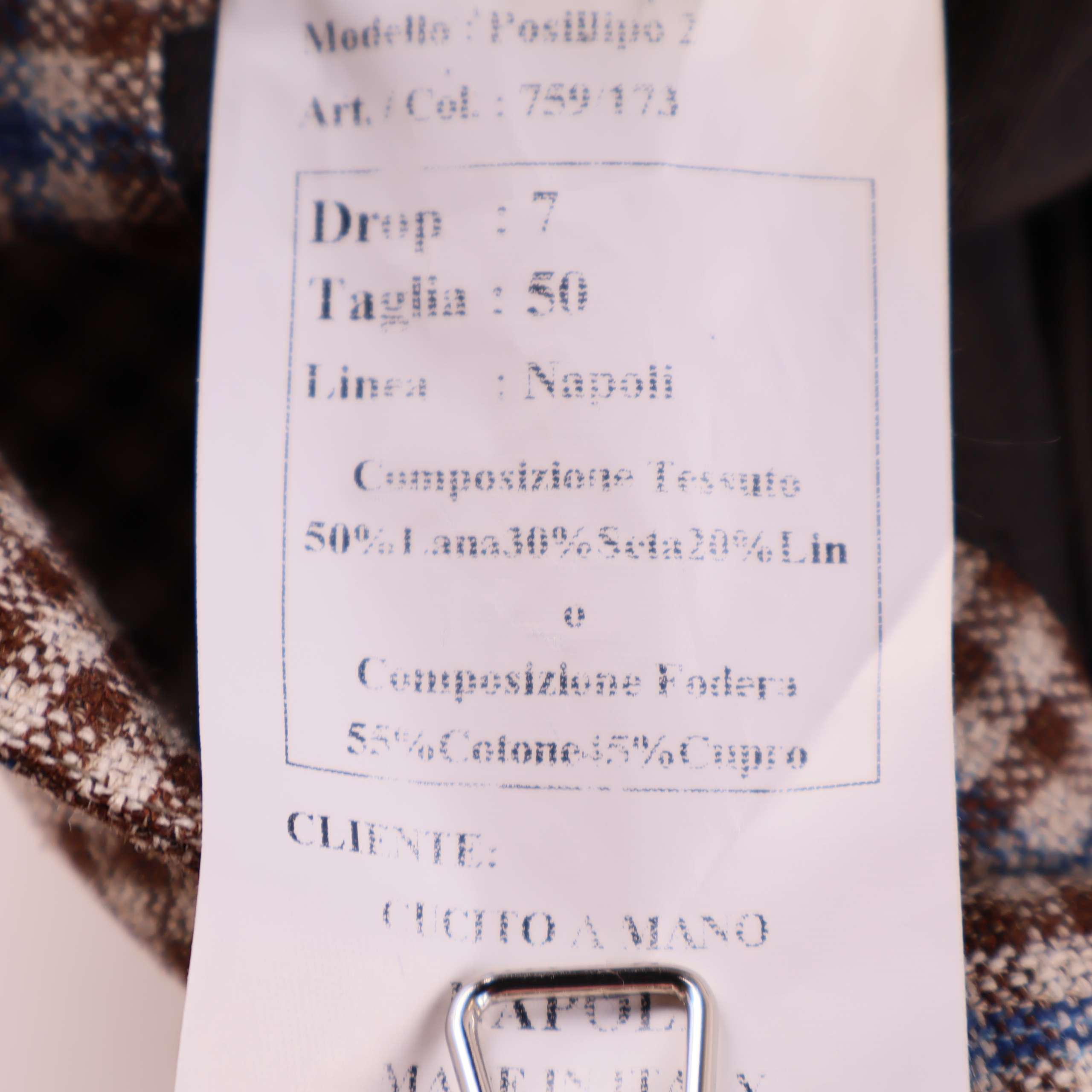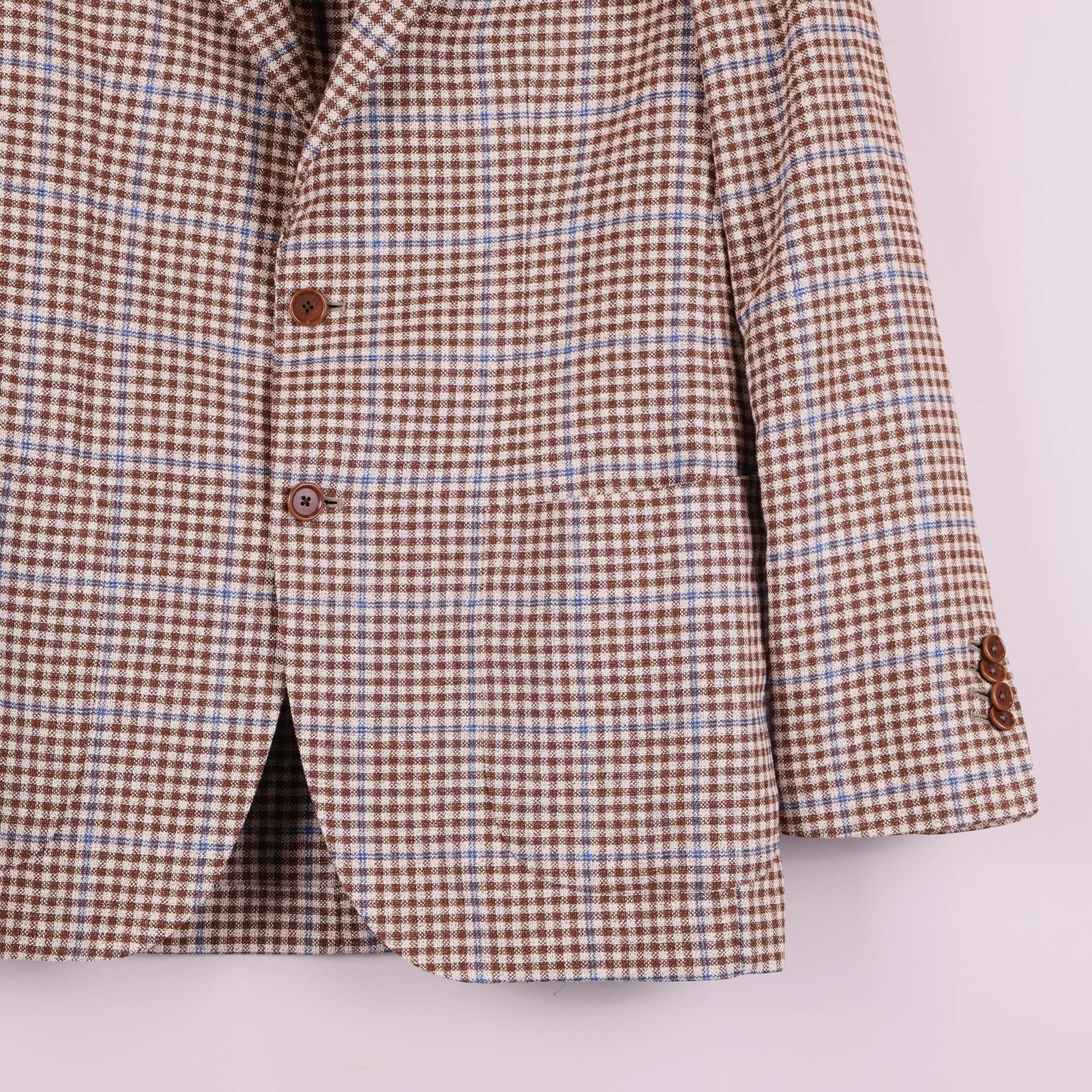 Denna kavaj har ett stilrent rutigt mönster i bruna och ljusblå toner, tvåknäppning framtill och klassiska snitt. Fodret är mörkt och kontrasterar fint mot utsidan. Kavajen har fickor med lock och dekorativa knappar vid ärmsluten. Materialkänslan ger en dressad, tidlös look som passar för både vardag och mer uppklädda tillfällen.