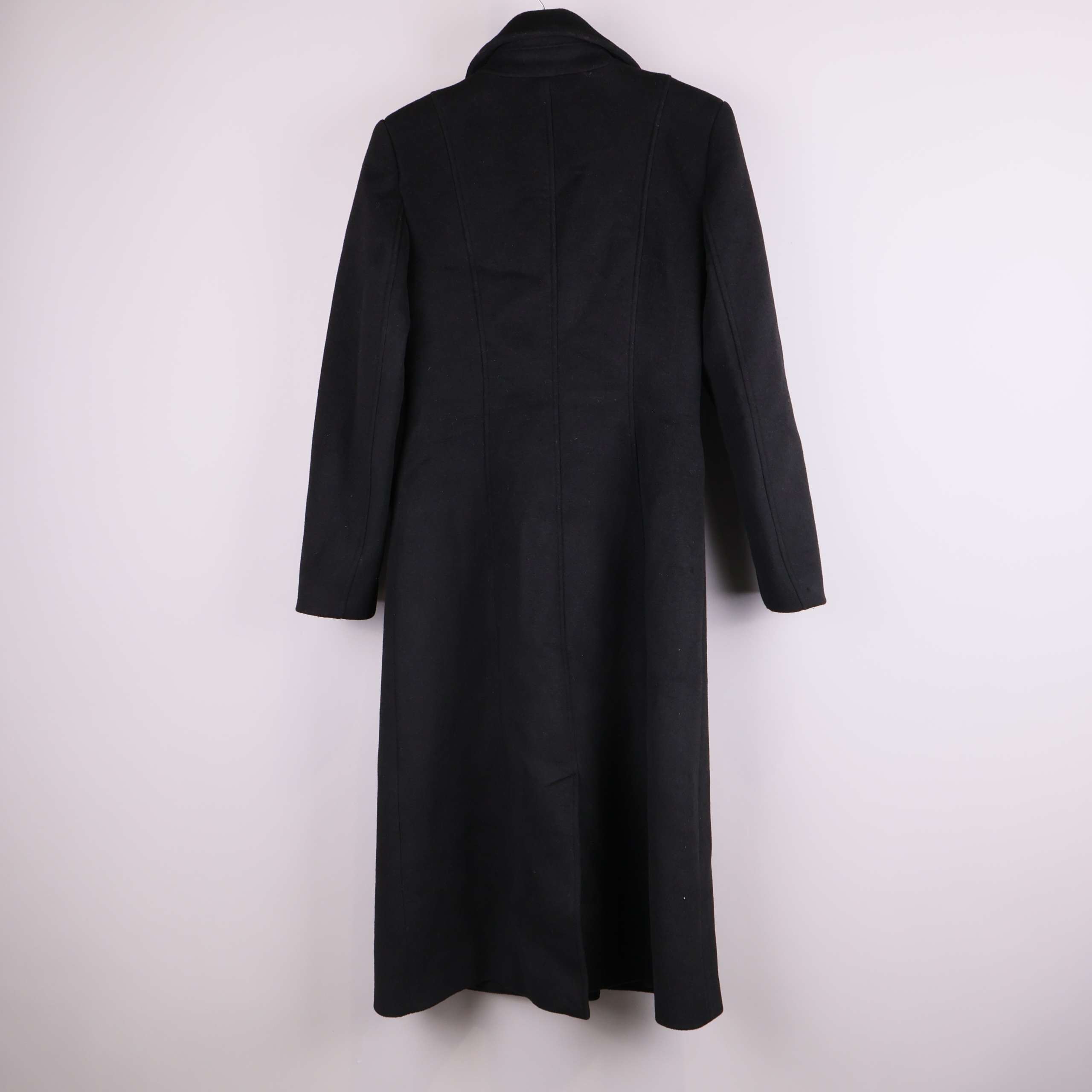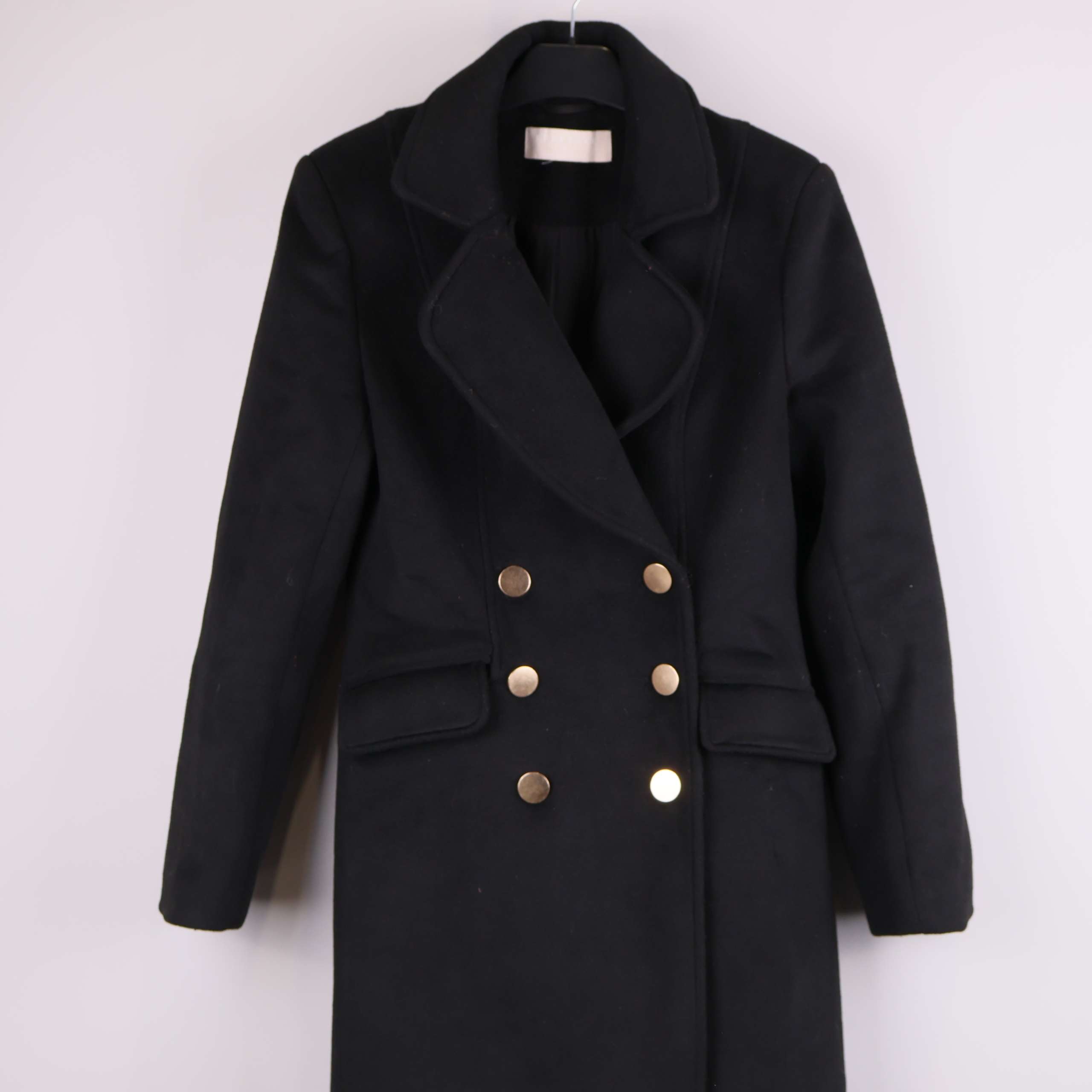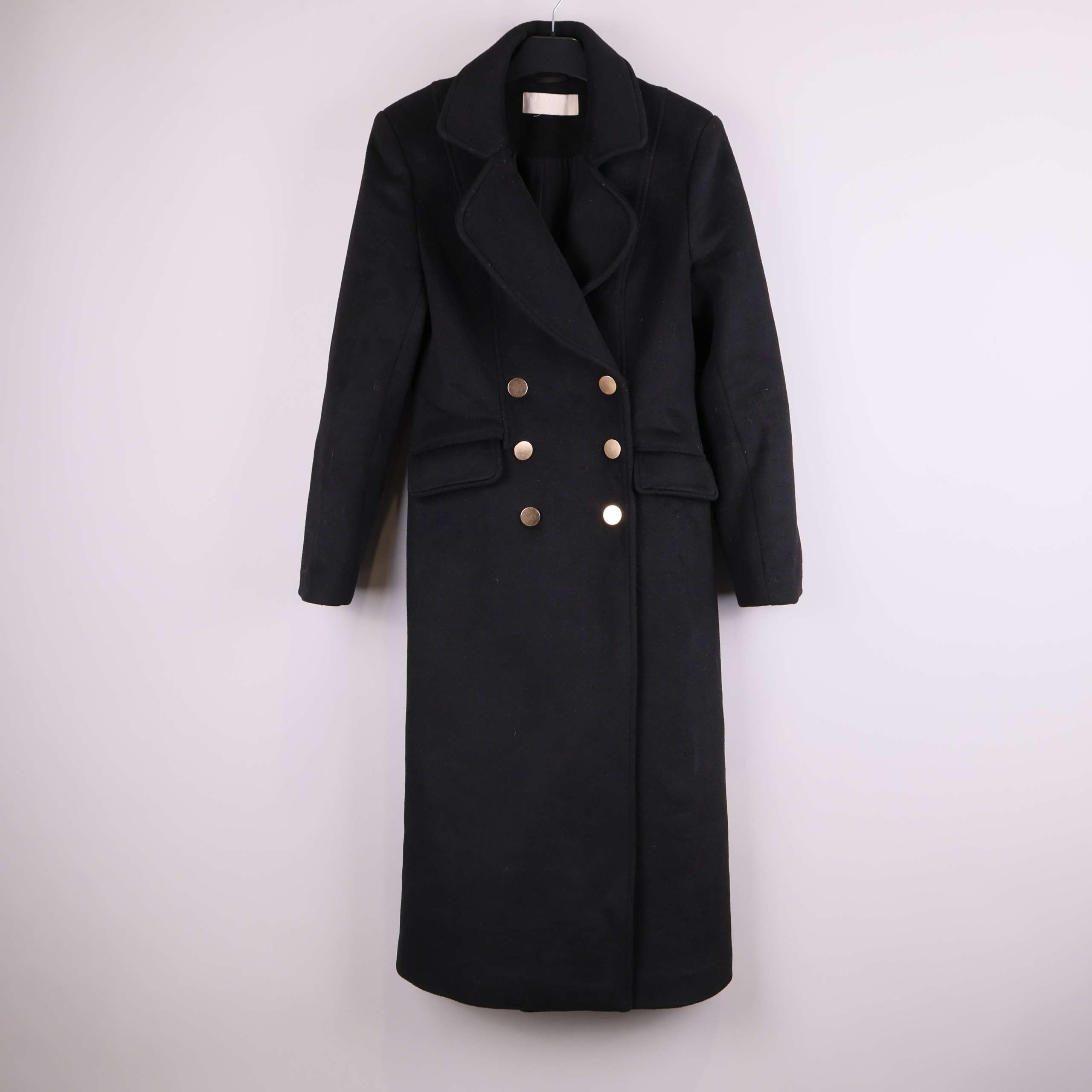 Stilren lång kappa i svart med dubbelknäppning framtill och dekorativa guldknappar som ger en elegant look. Klassisk krage och raka linjer för en tidlös silhuett. Praktiska fickor och helfodrat inre för extra komfort. Perfekt detalj om du gillar en clean och sofistikerad stil.