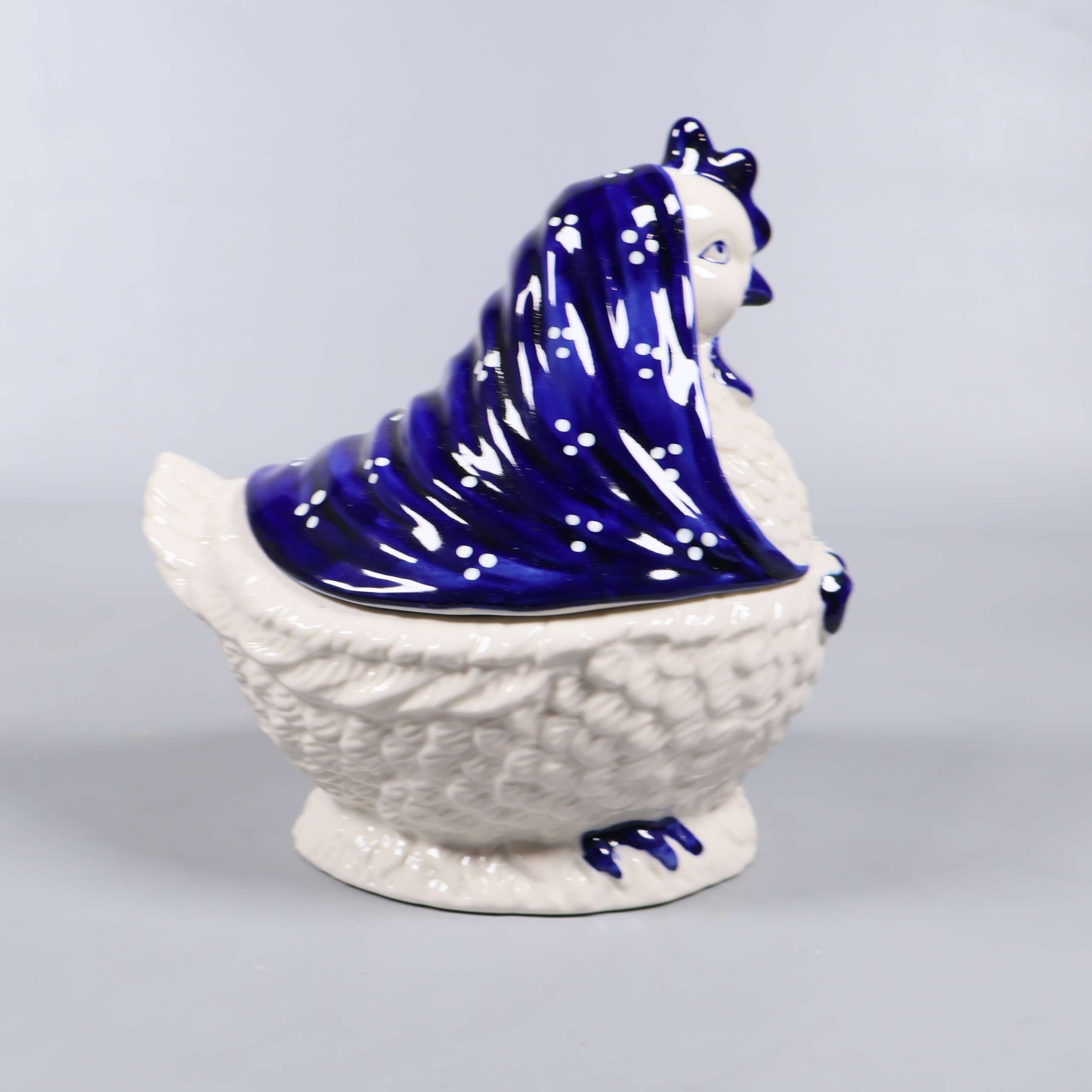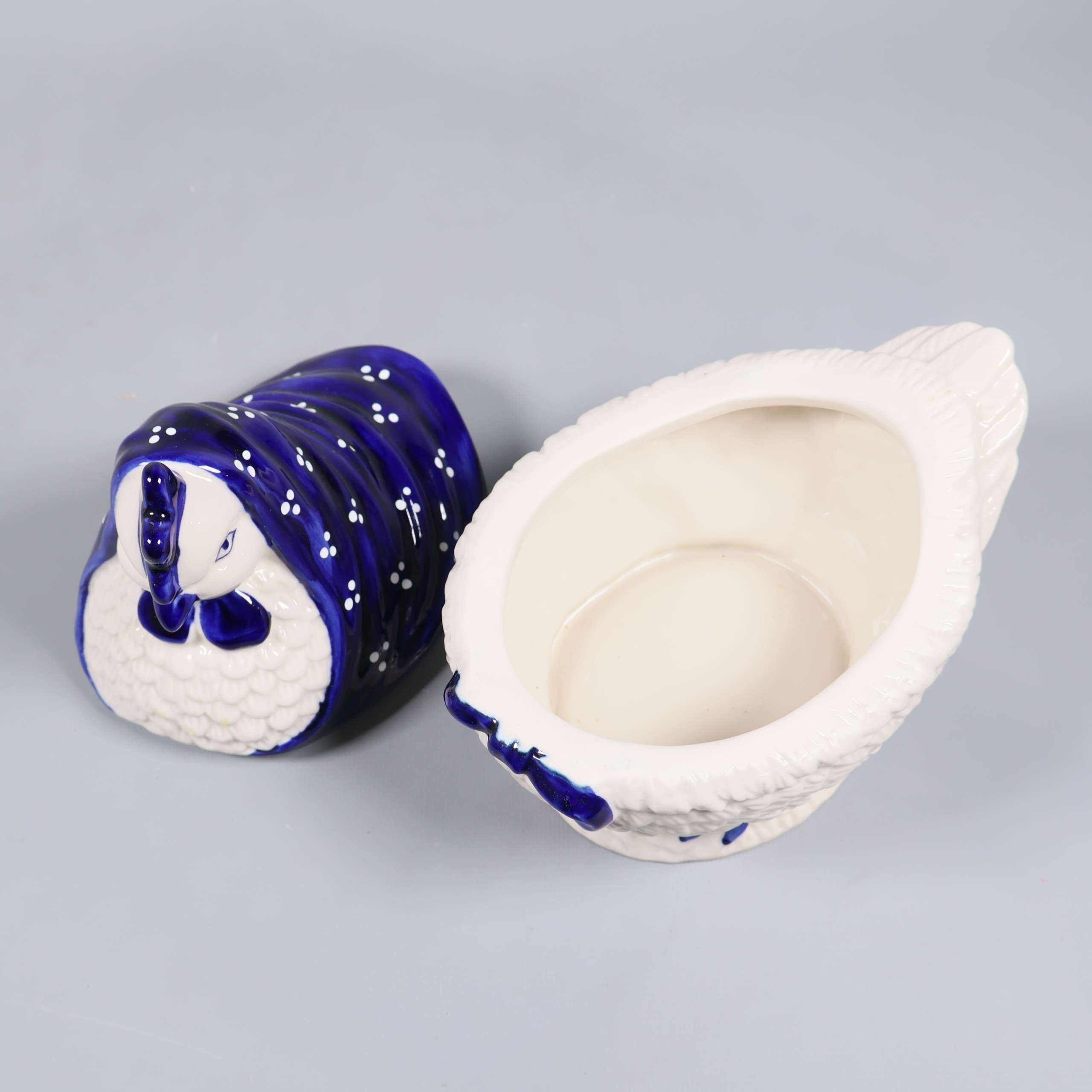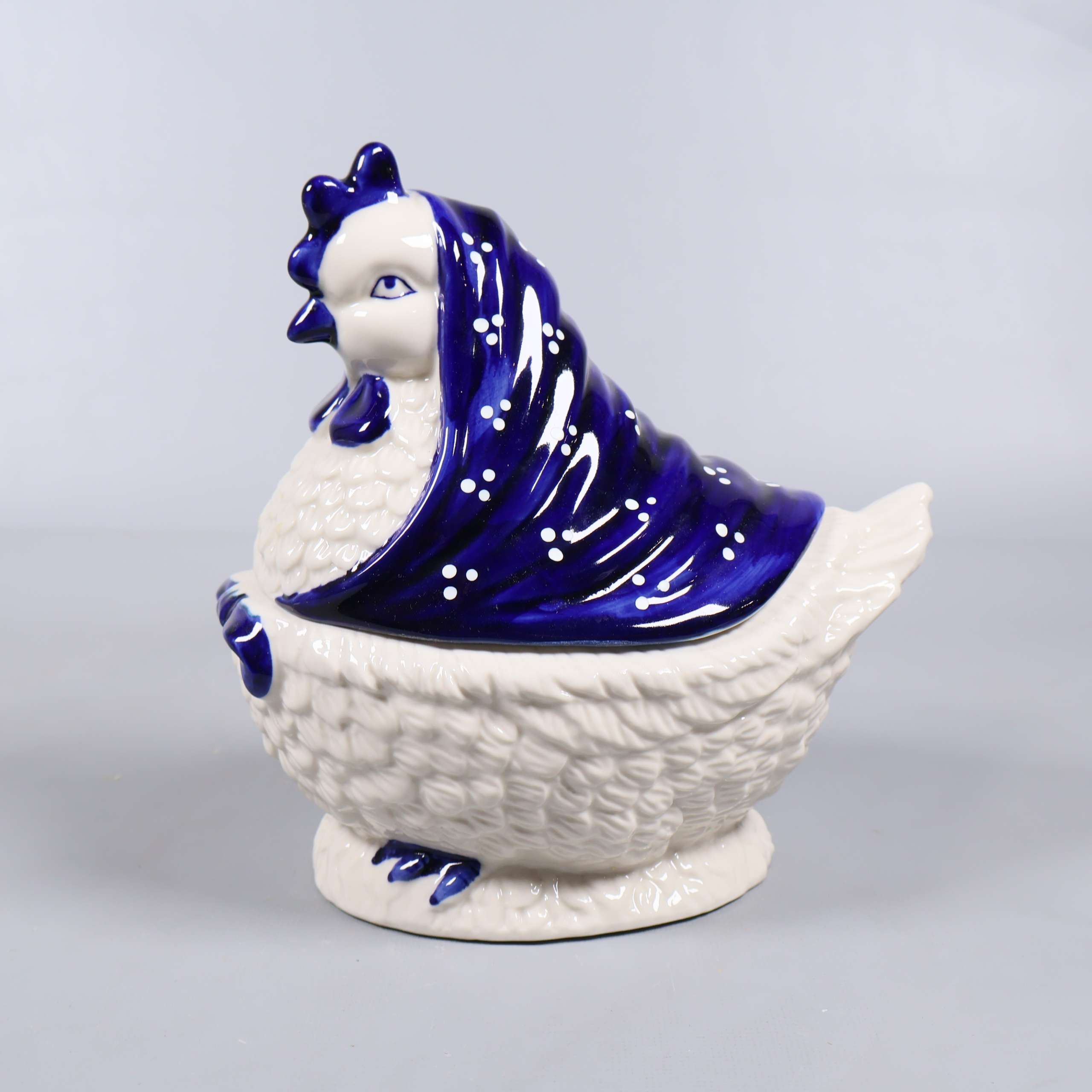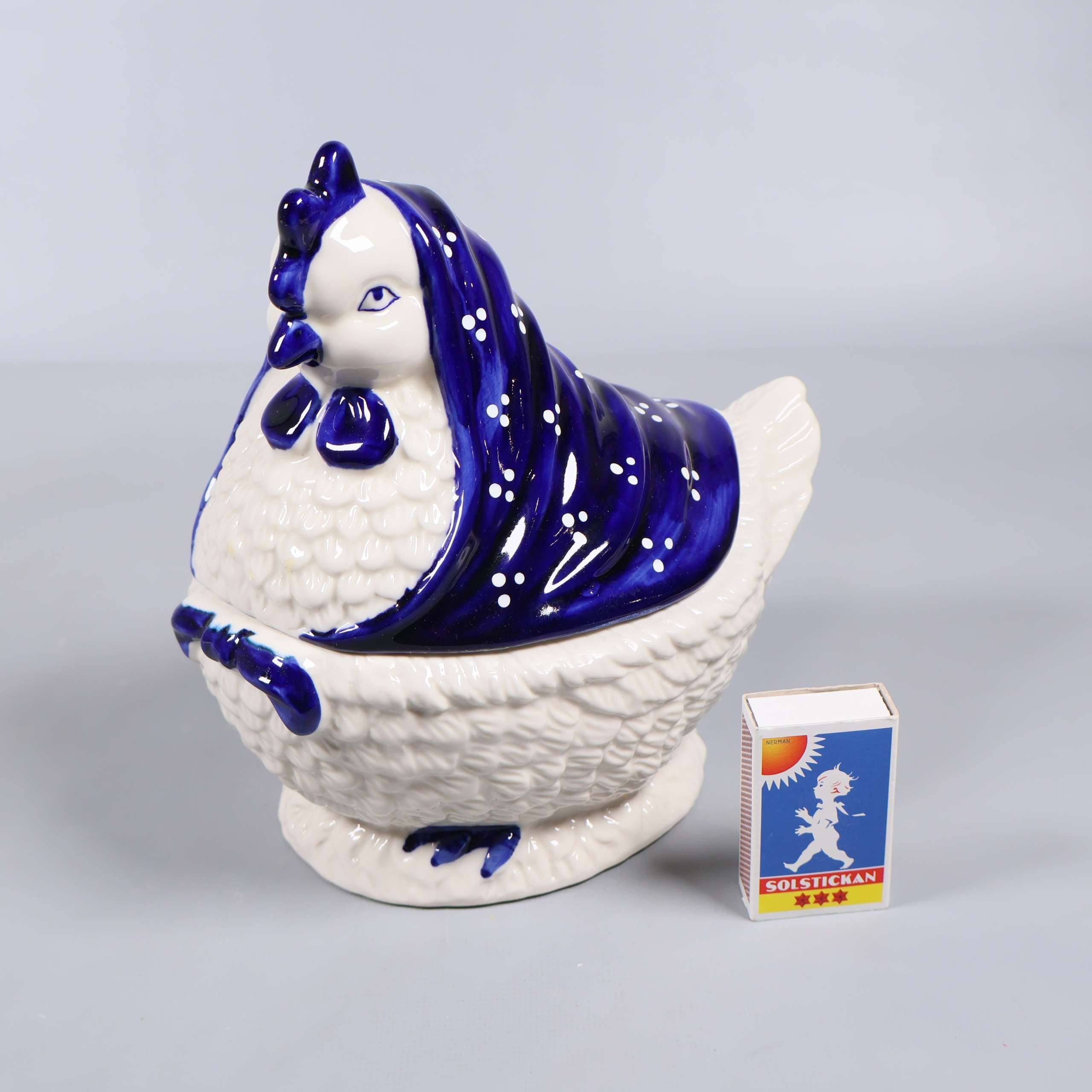 Keramikburk i form av höna med blå sjal 199 kr Product variation Antal st Beskrivning Charmig keramikburk formad som en höna med handspritad blå sjal. Burken består av två delar och har fina detaljer i både form och färg – perfekt som förvaring eller dekoration med en vintage vibe. Visa all beskrivning Detaljer Höjd: 21 cmLängd: 29 cm Skick Mycket gott skick Produkten är sparsamt använd, är av fin kvalitet och ska inte ha några skador eller förslitningar. Läs mer om hur vi bedömer Färg Grå Material Keramik Produkten är unik och finns enbart som 1 st i lager. Fri frakt på alla köp över 990 kr. 14 dagars ångerrät.