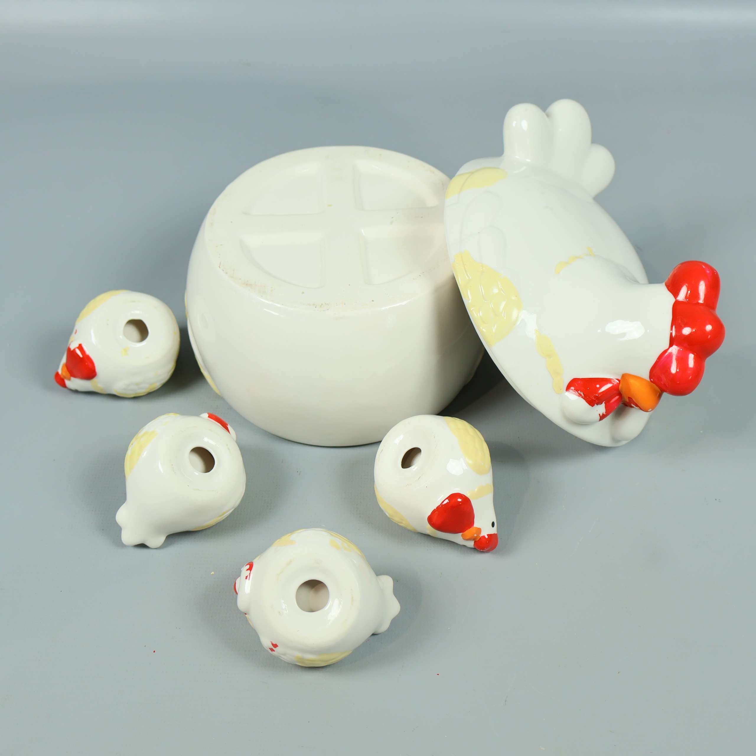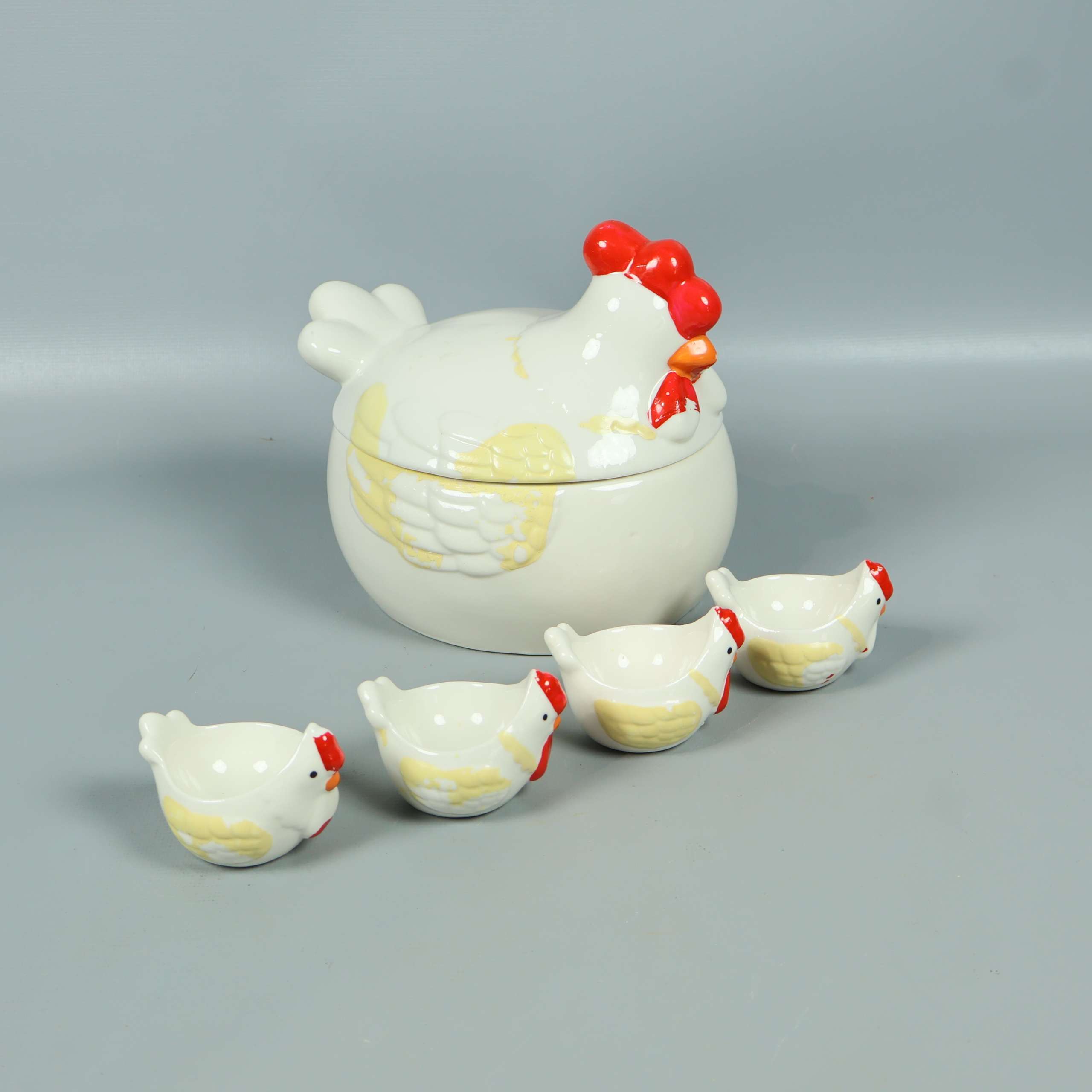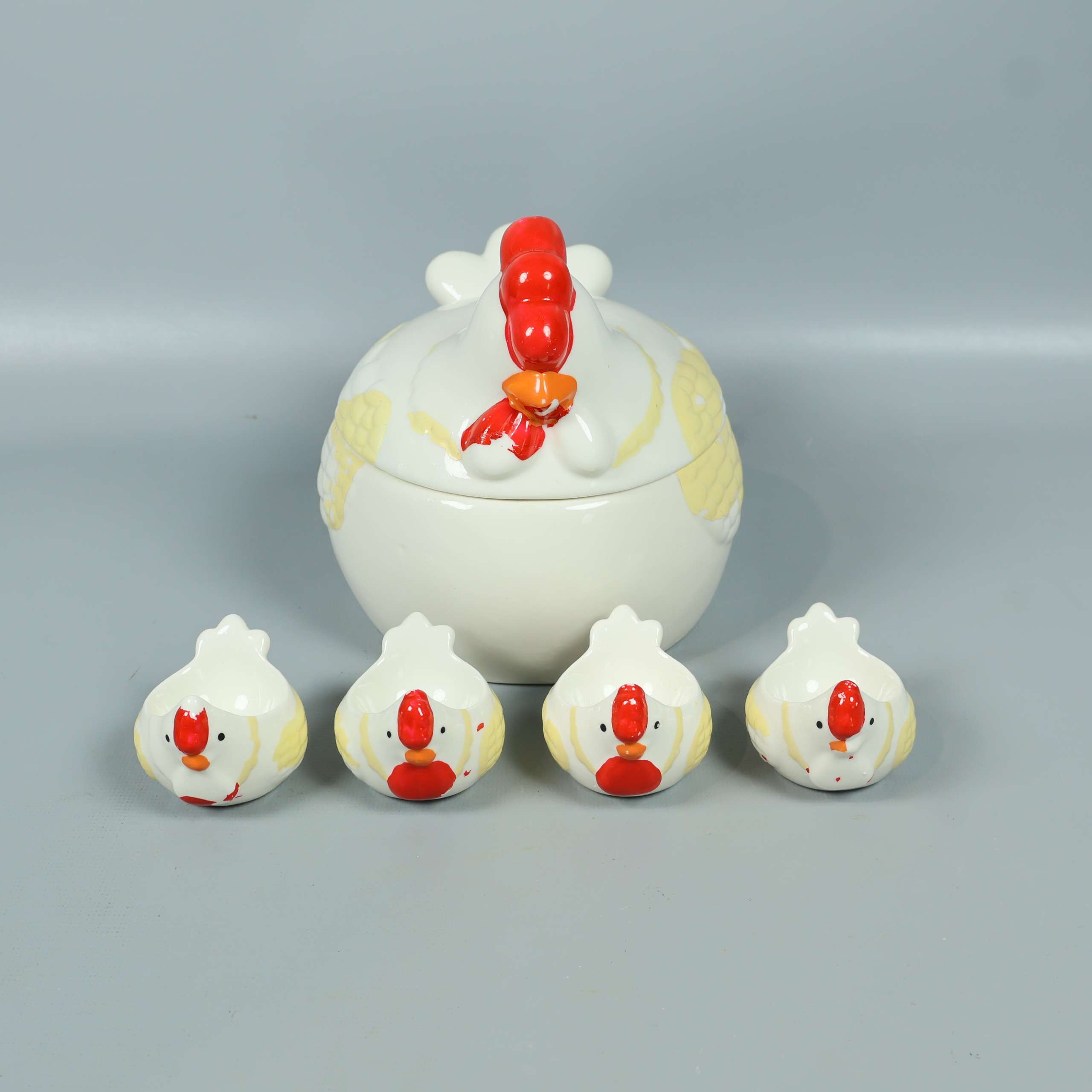 Charmig burk med lock och fyra matchande små skålar – alla i form av hönor. Tillverkad i blank keramik med lekfulla detaljer i rött, orange och gult som ger en humoristisk och unik känsla på bordet.