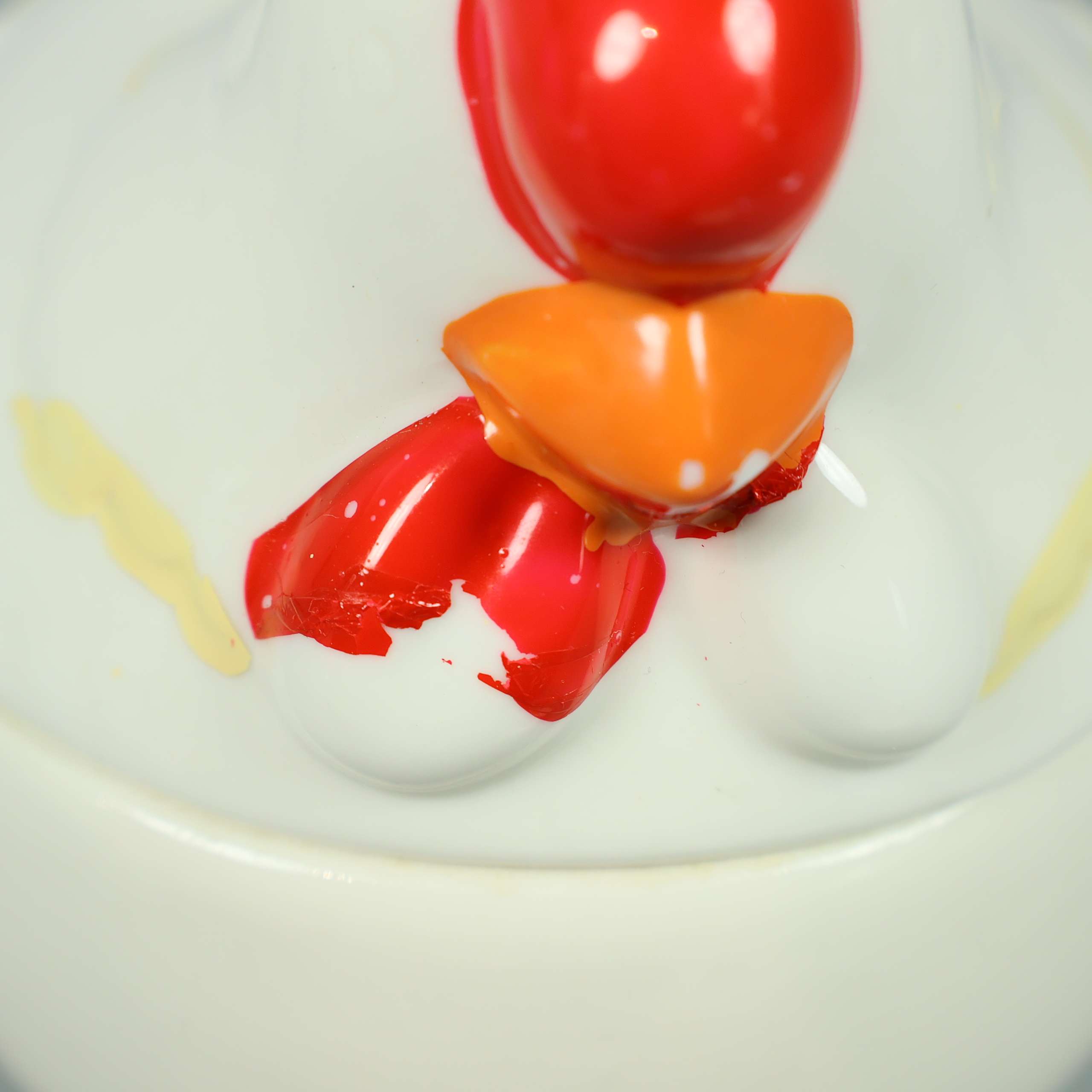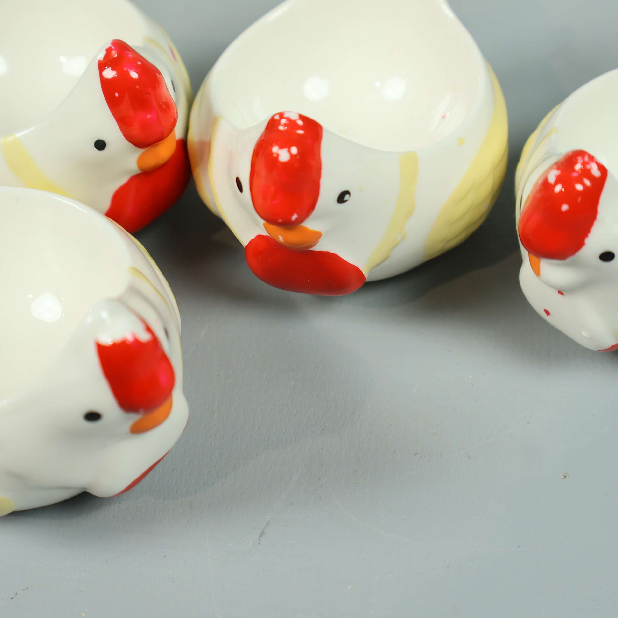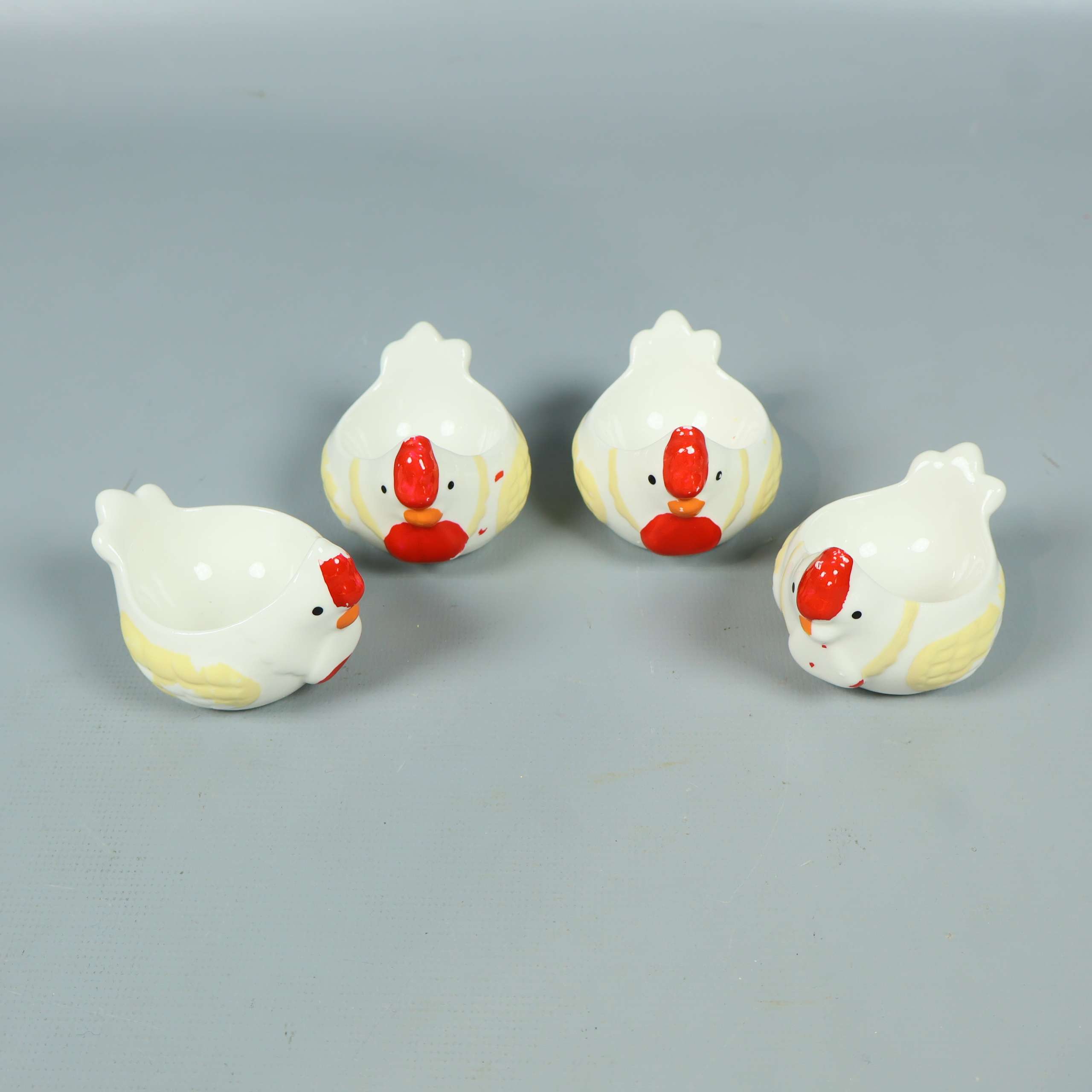 Charmig burk med lock och fyra matchande små skålar – alla i form av hönor. Tillverkad i blank keramik med lekfulla detaljer i rött, orange och gult som ger en humoristisk och unik känsla på bordet.