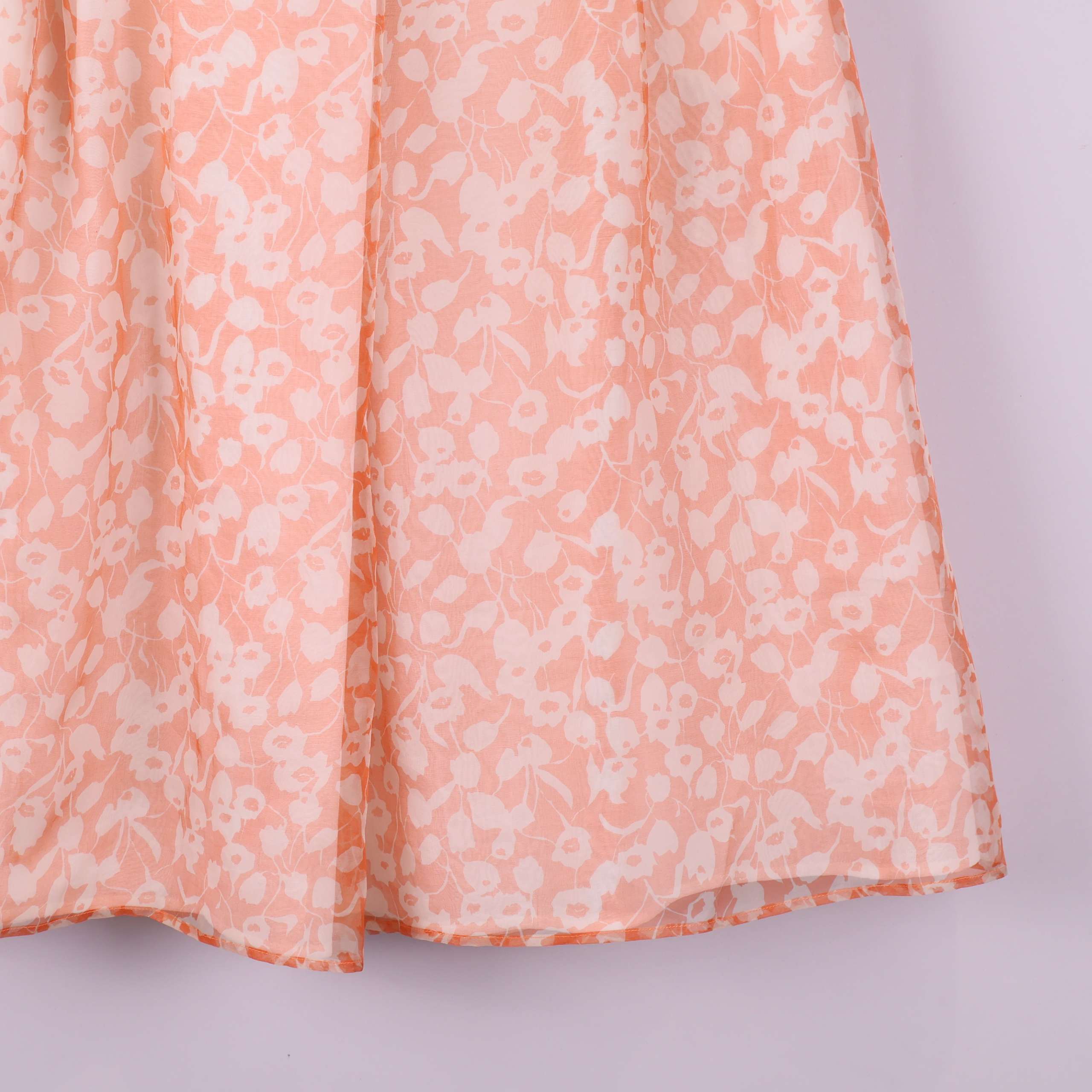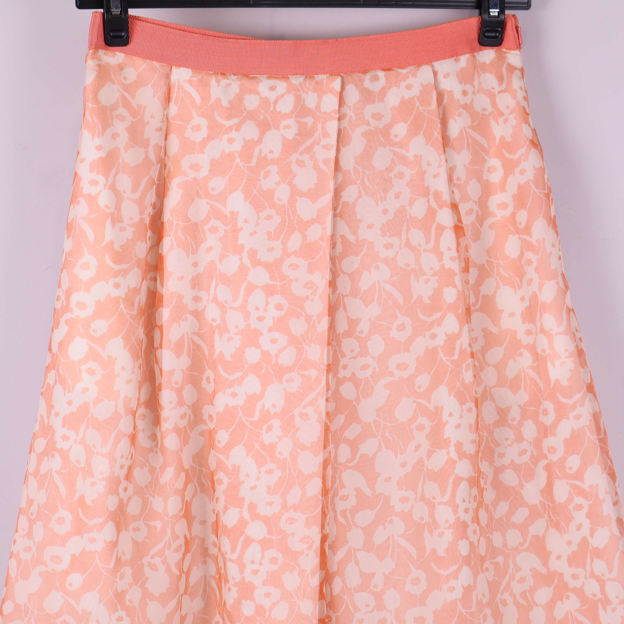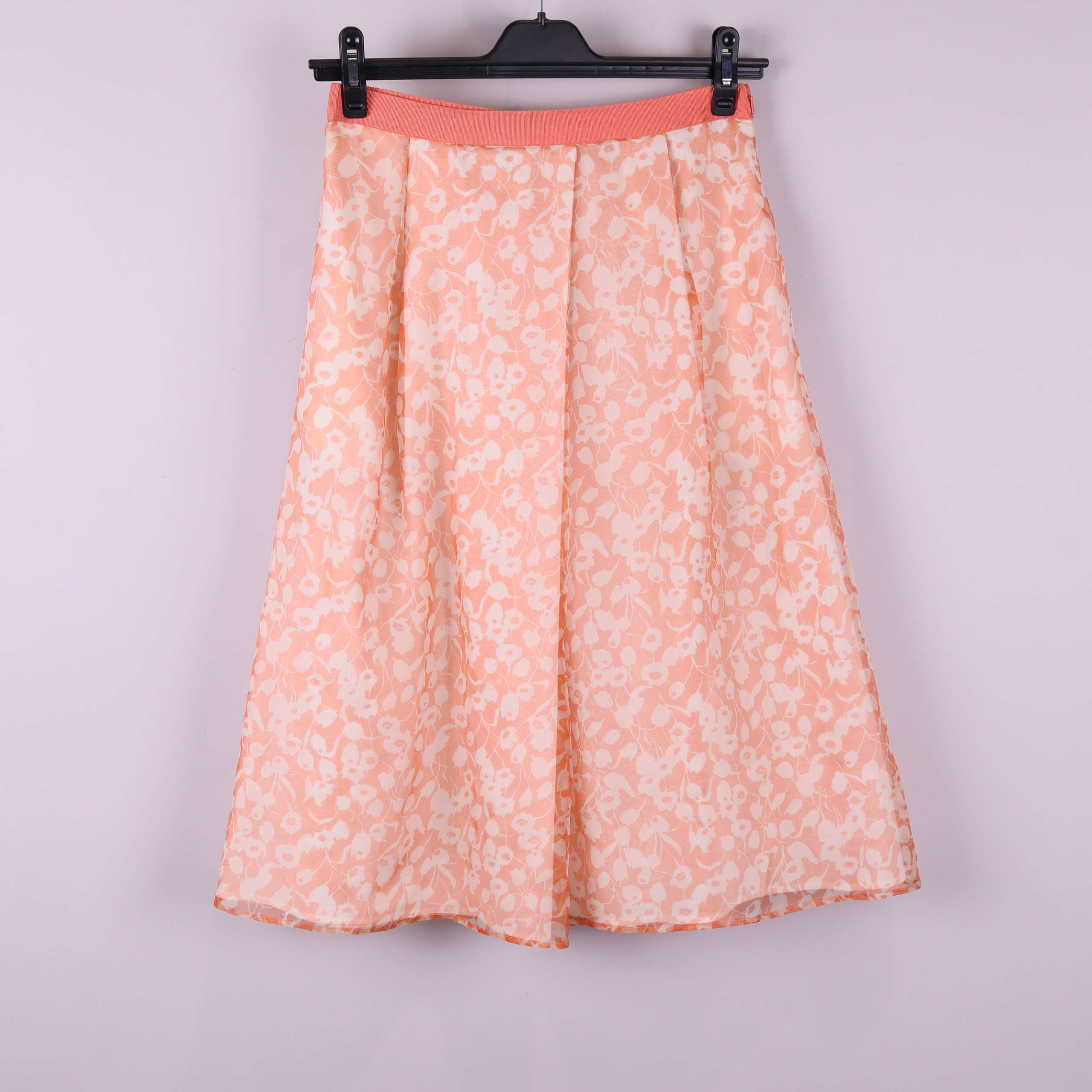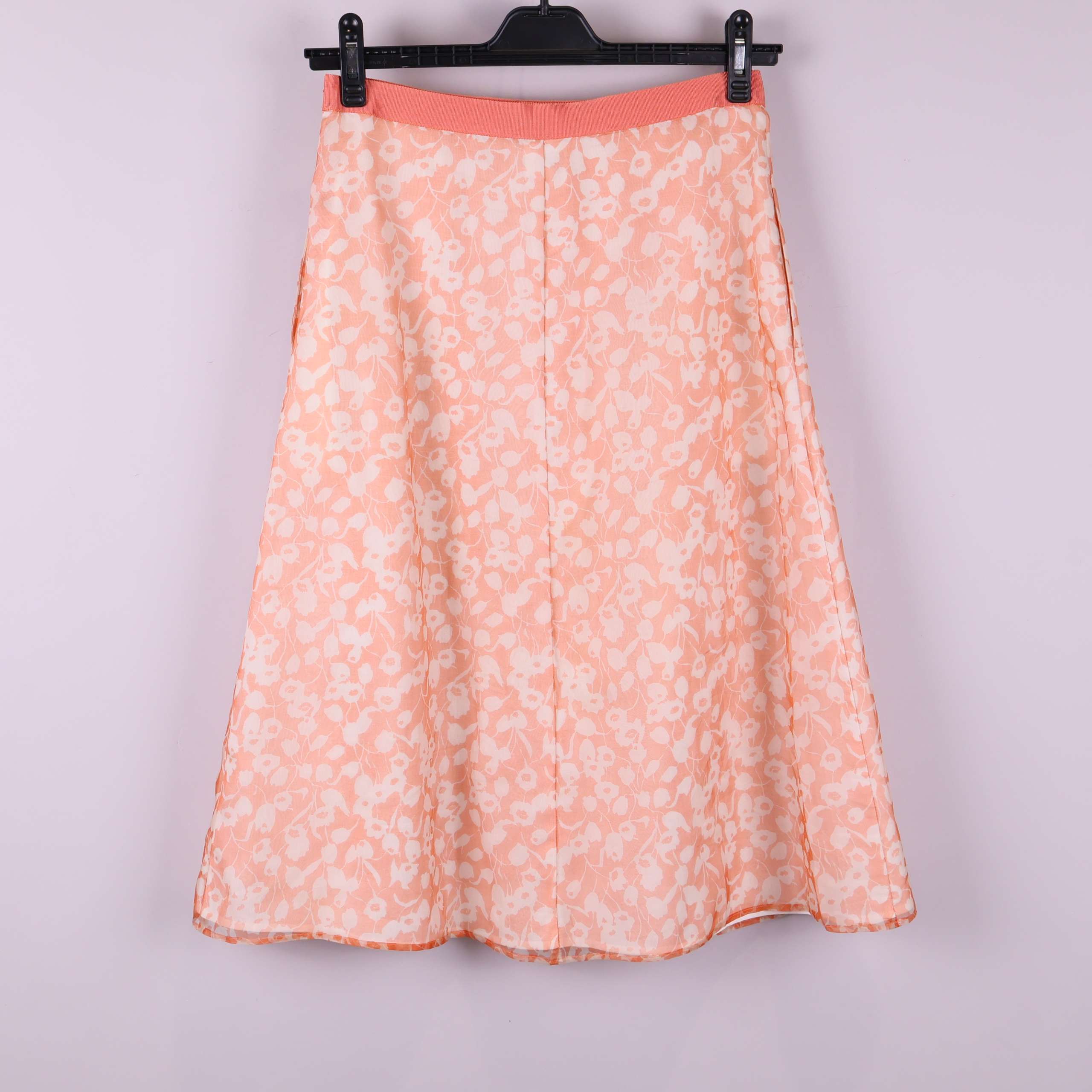 Denna A-linjeformade kjol har ett ljust aprikosfärgat blommigt mönster som ger en fräsch och vårig känsla. Kjolen har diskreta veck framtill vilket ger en mjuk vidd och rörelse. Livet är slätt och bandet i midjan har en något mörkare aprikoston vilket ger en modern touch. Tyget känns lätt och fodret gör kjolen behaglig och följsam.