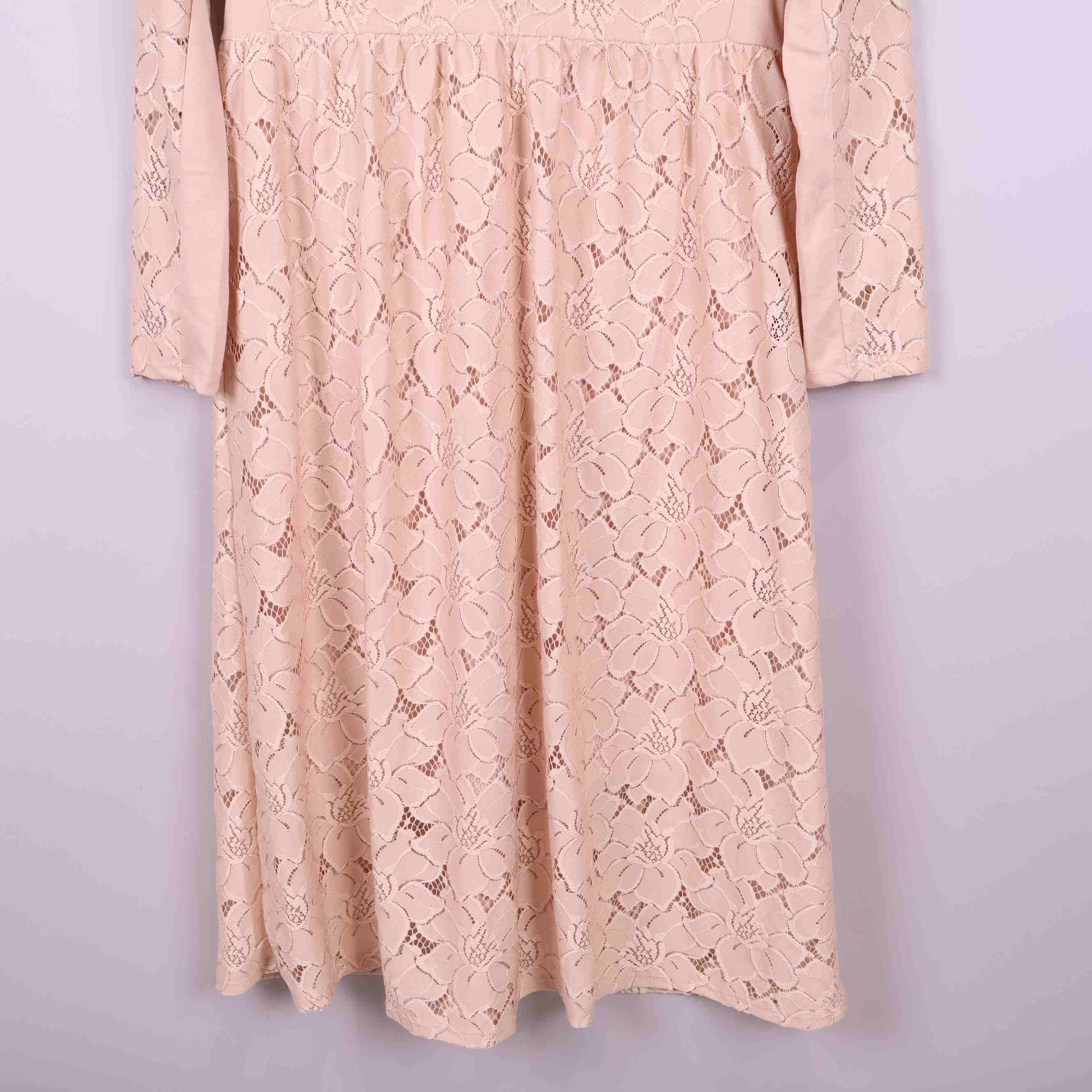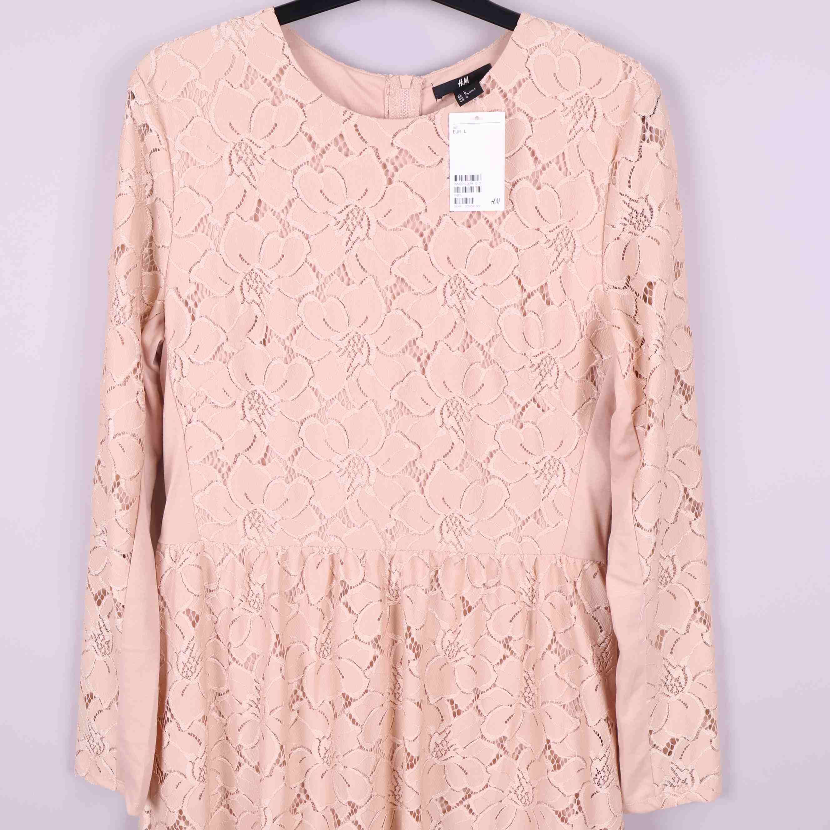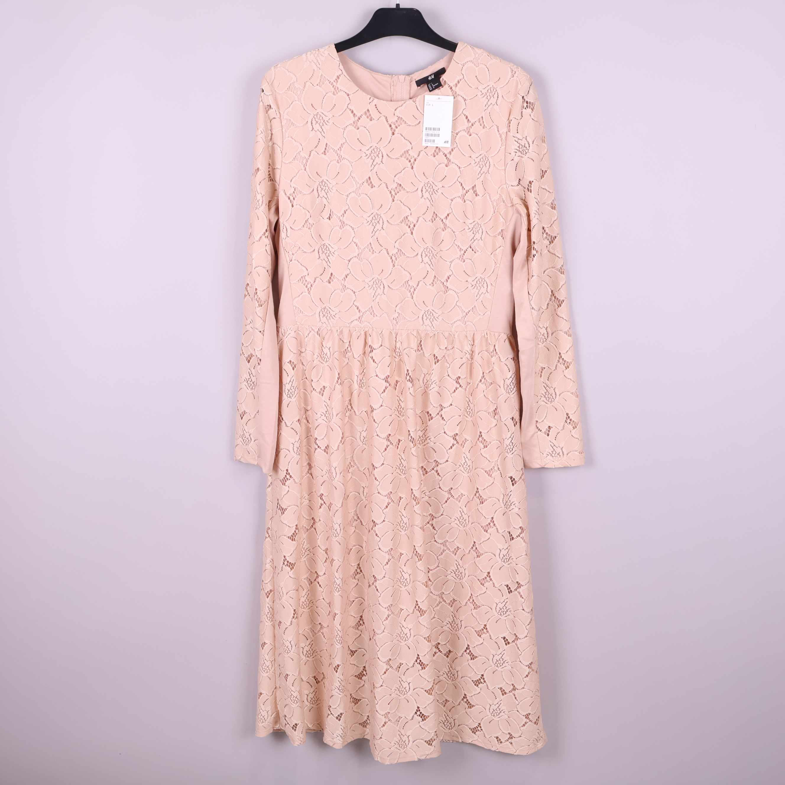 Den här klänningen från H&M har en vacker beige/ljusrosa spets med stora blommönster, vilket ger en feminin och modern känsla. Den har lång ärm, rund halsringning och dold dragkedja i ryggen.