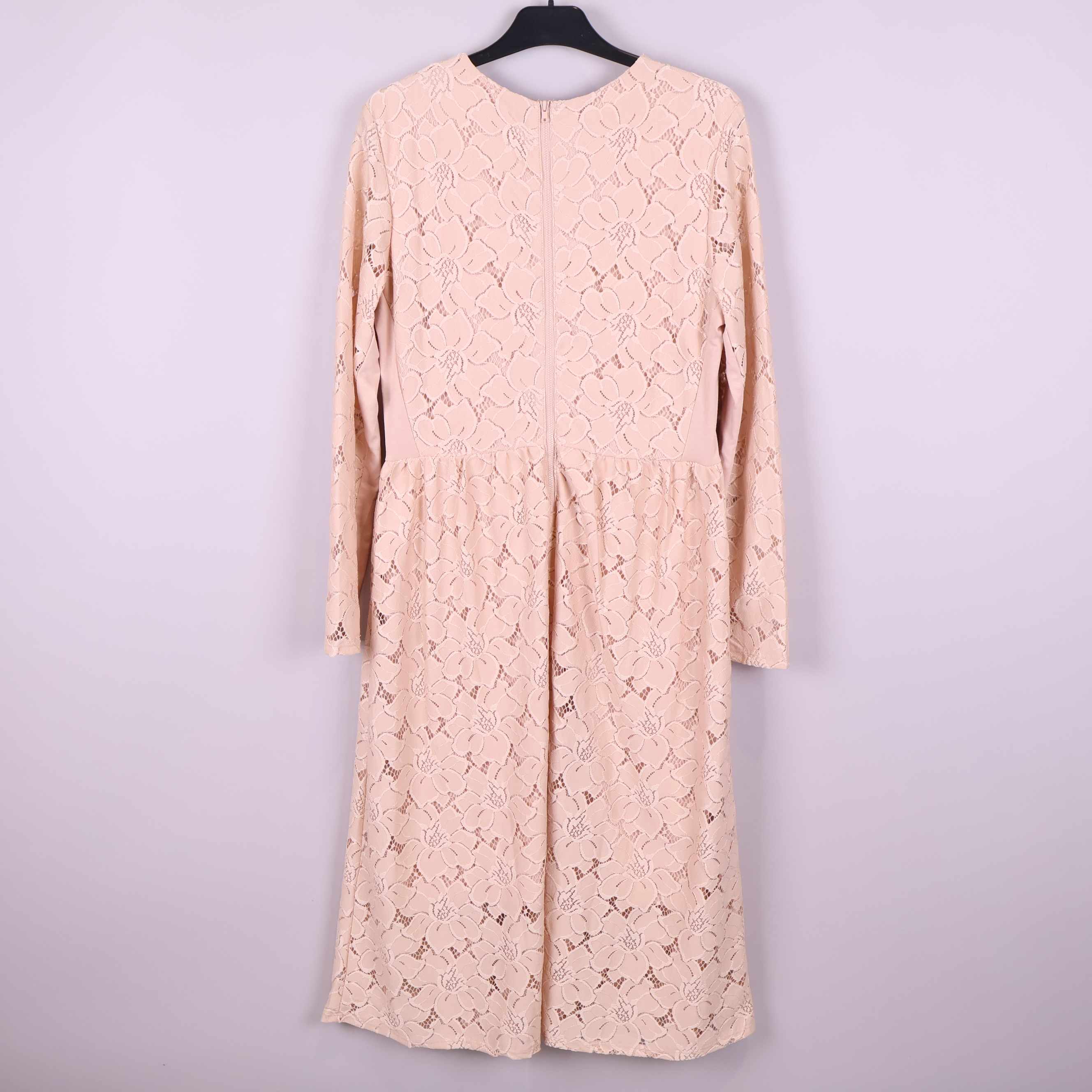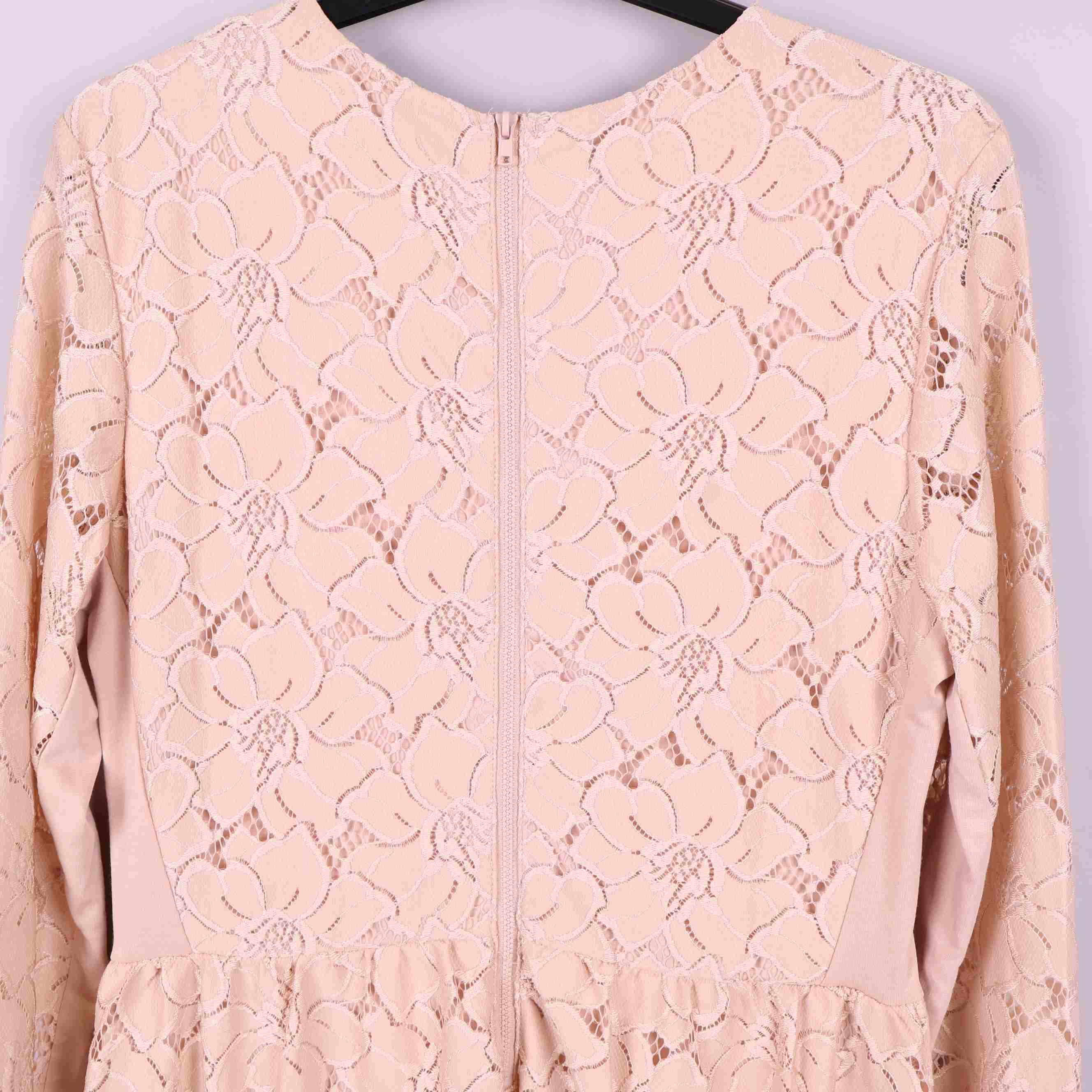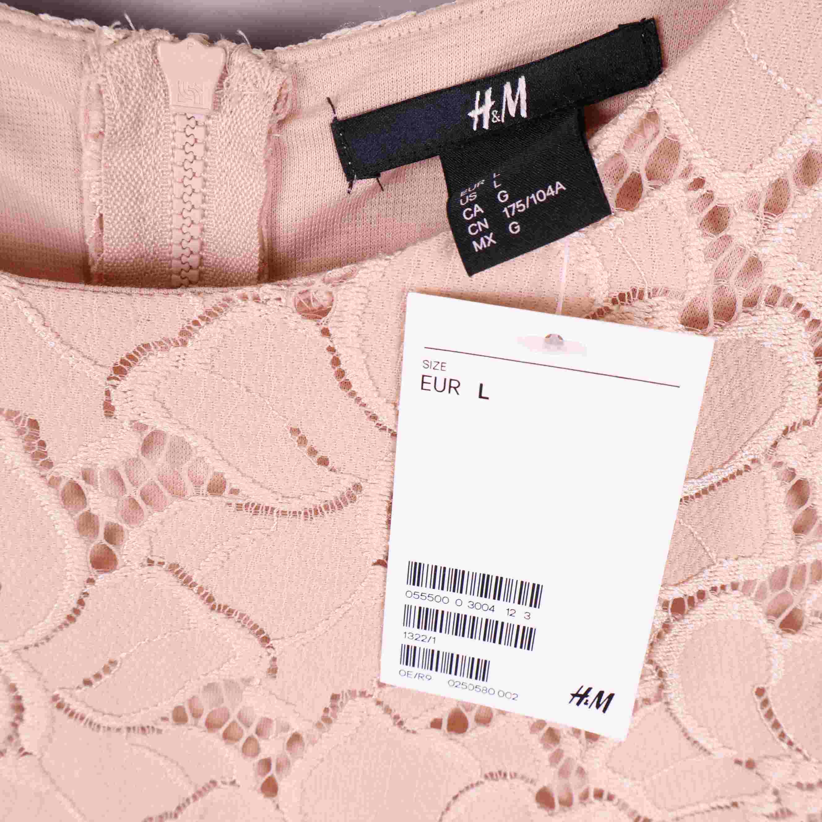 Den här klänningen från H&M har en vacker beige/ljusrosa spets med stora blommönster, vilket ger en feminin och modern känsla. Den har lång ärm, rund halsringning och dold dragkedja i ryggen.