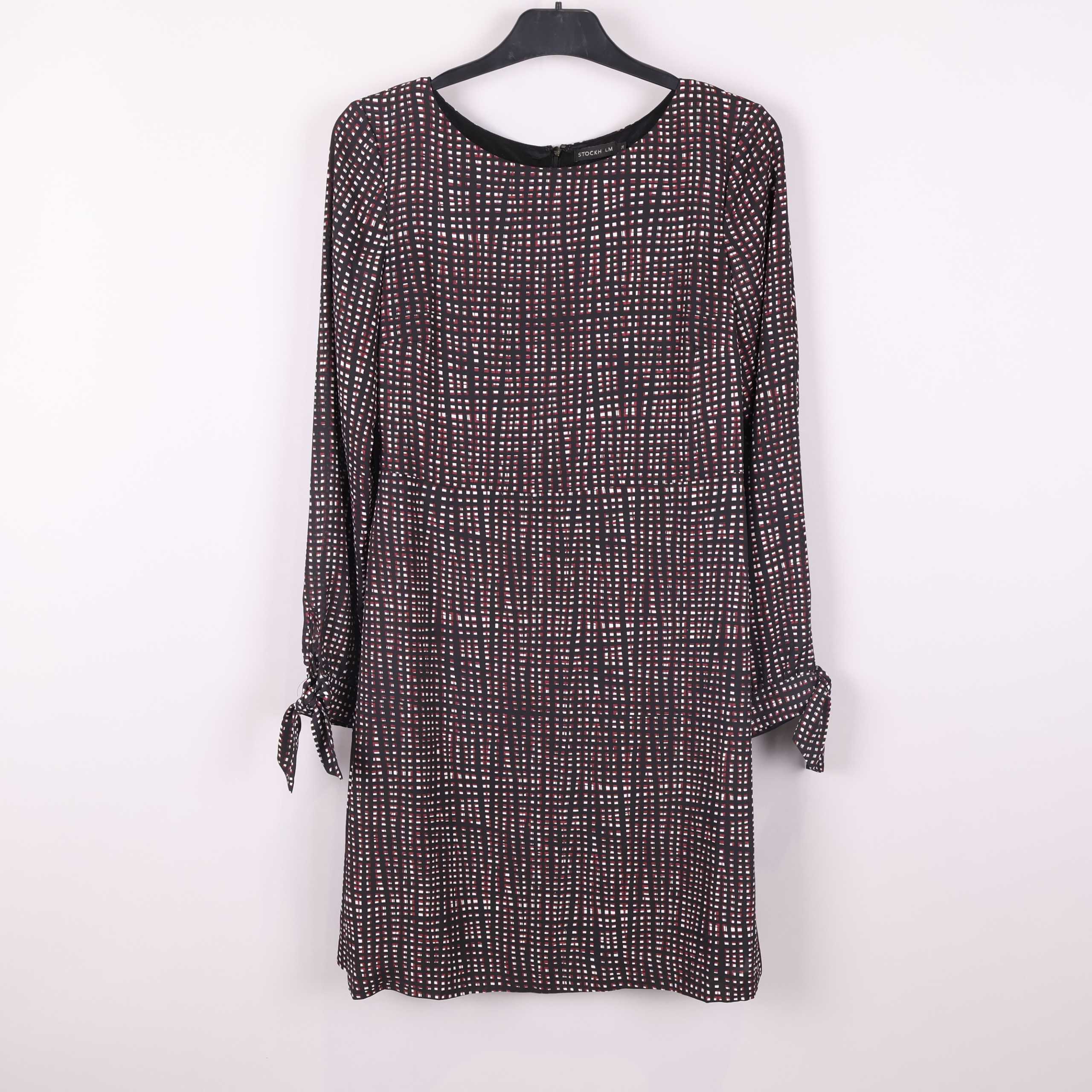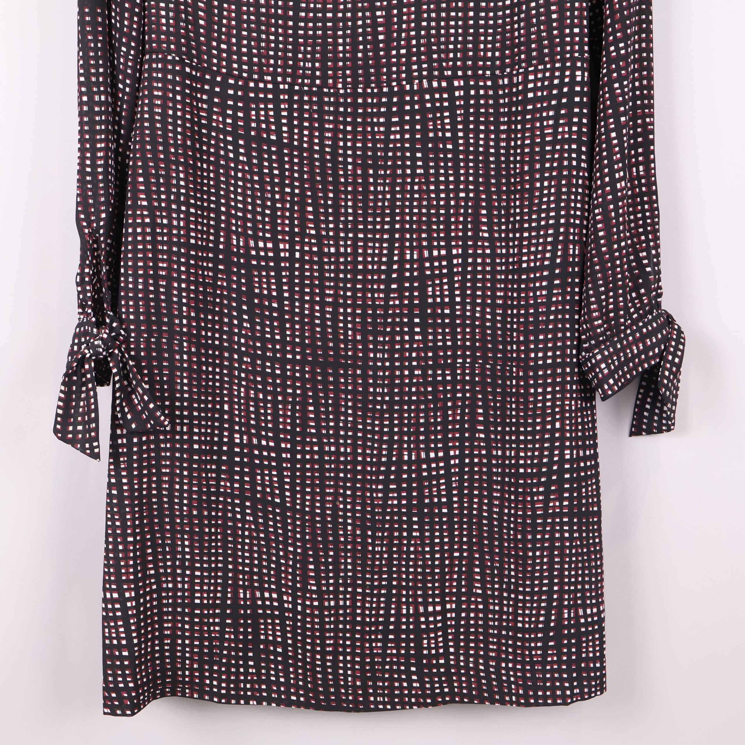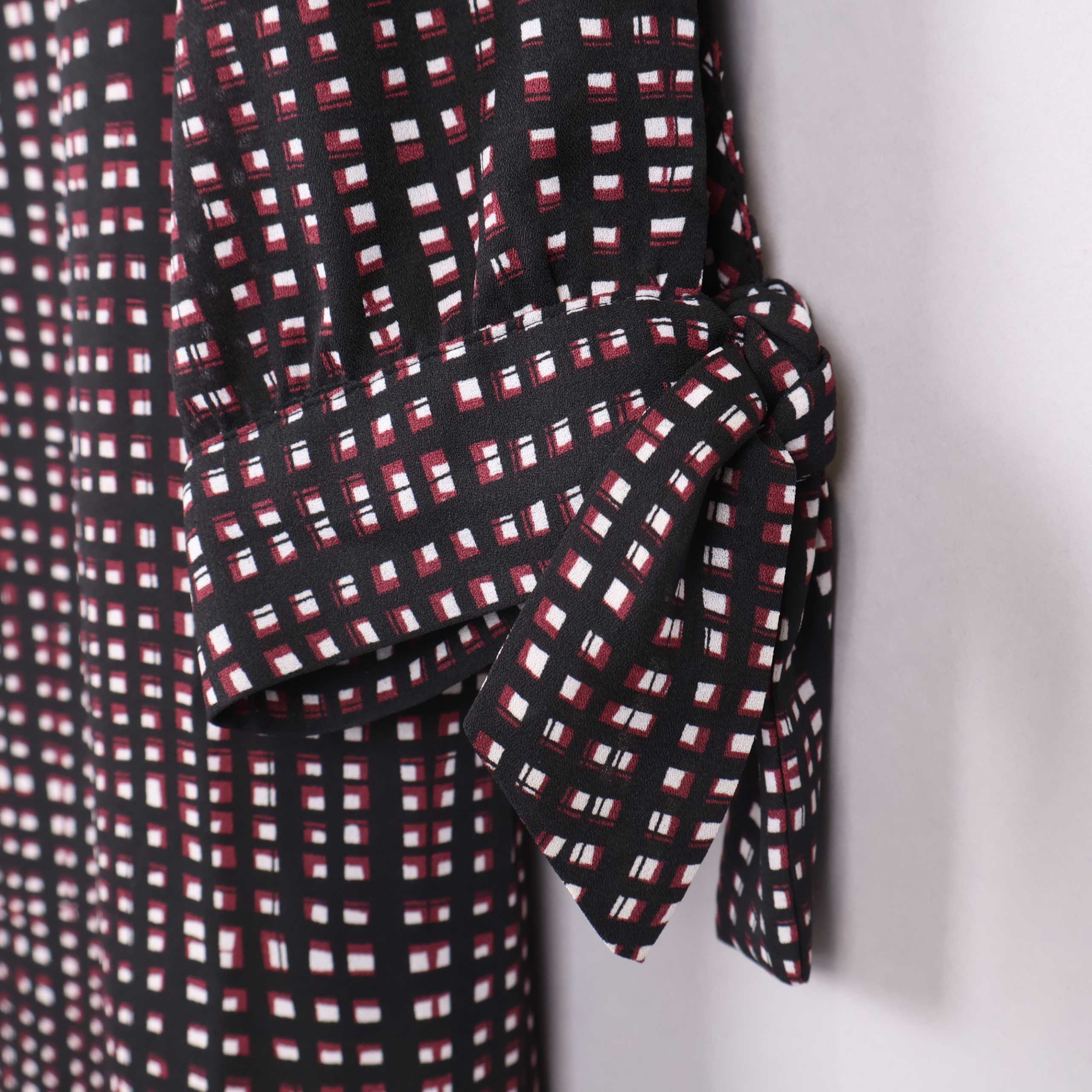Trendig klänning med grafiskt rutmönster i svart, vinrött och vitt. Modellen har dekorativa knytband vid handlederna och en rund halsringning. Tunn, lätt och följsam känsla tack vare fodrad insida i polyester. Blixtlås baktill för enkel på- och avtagning.