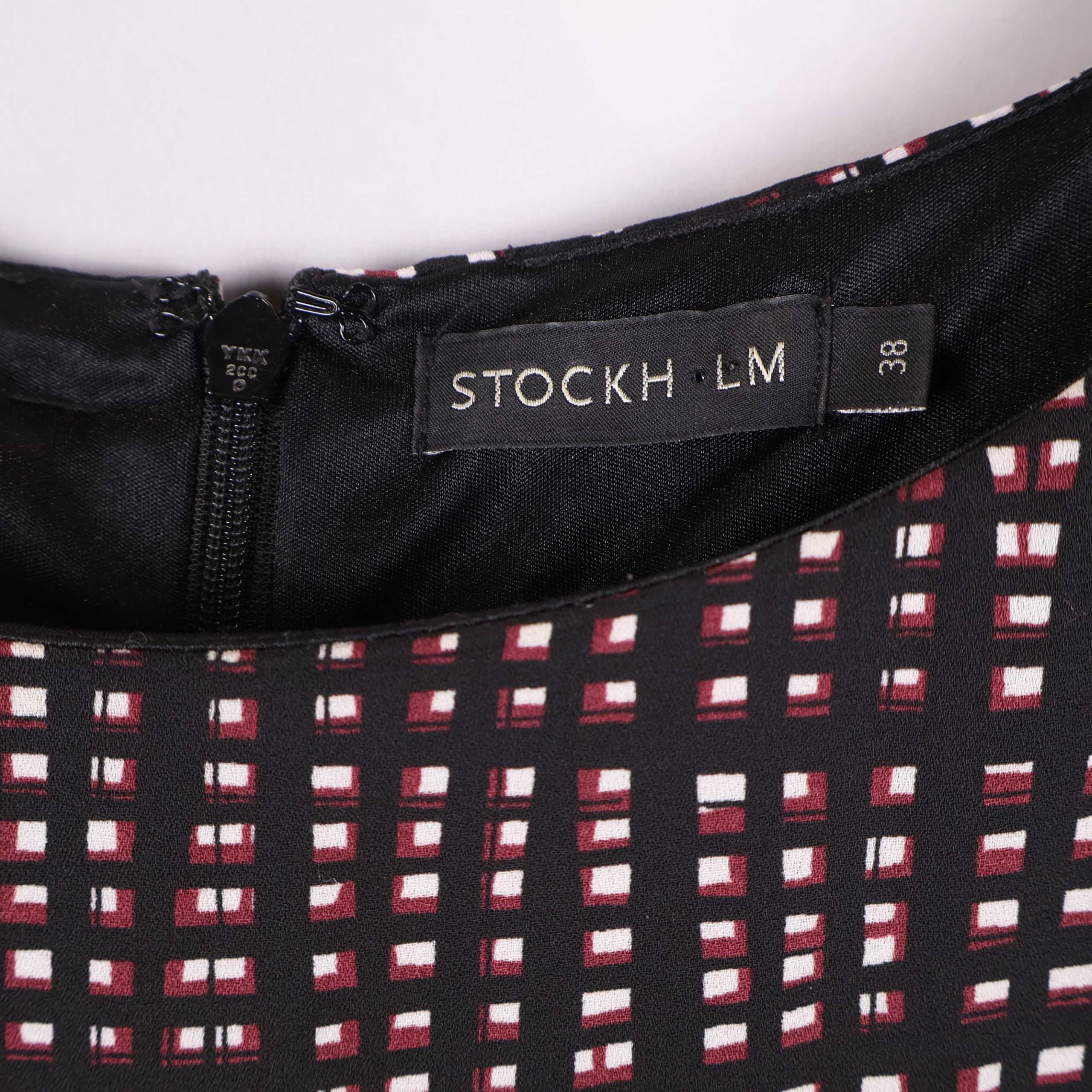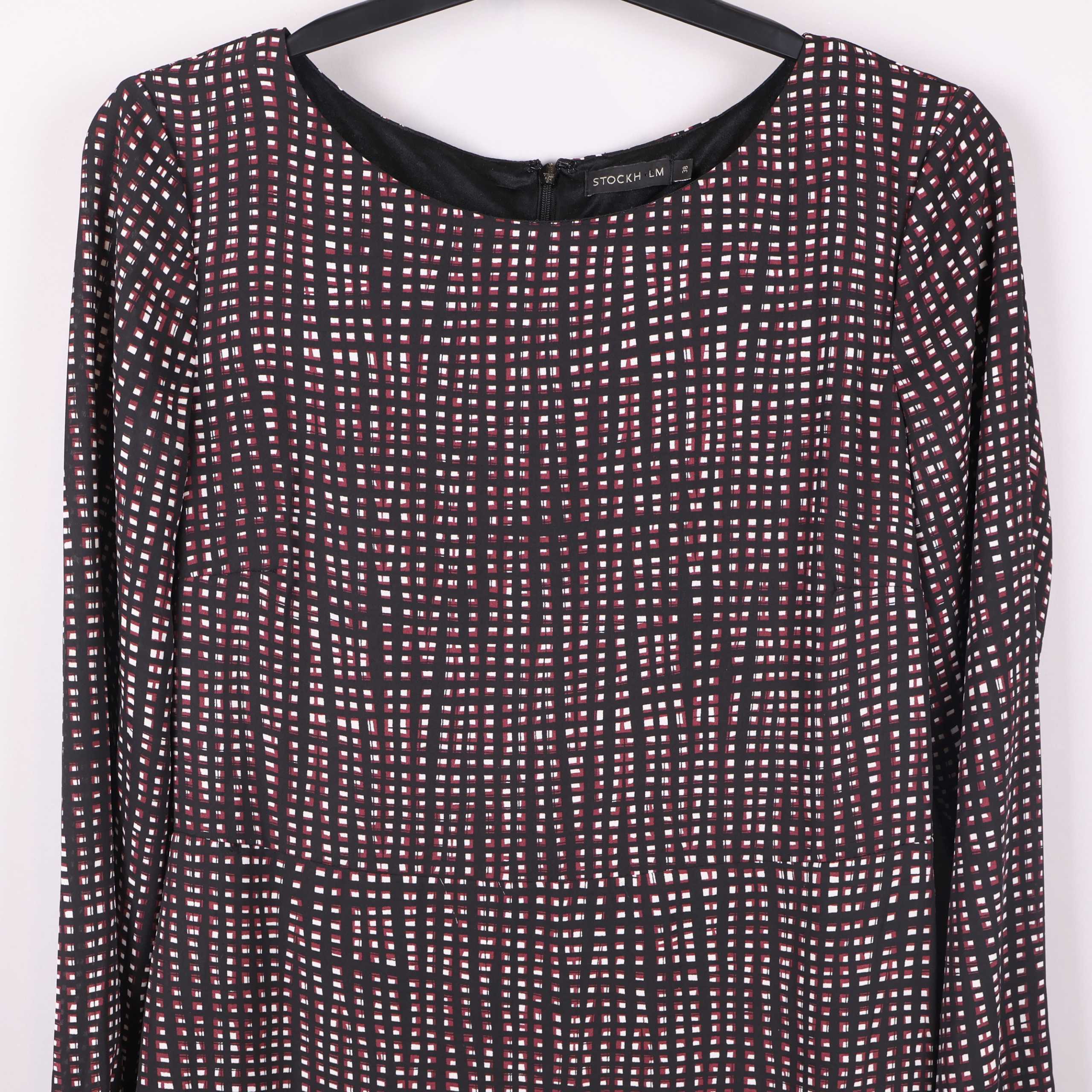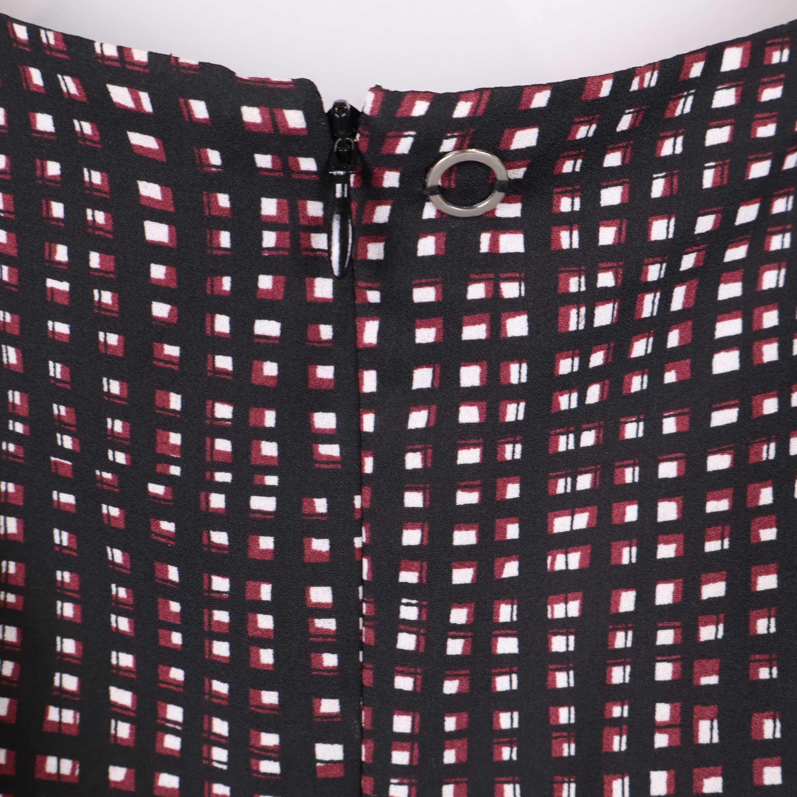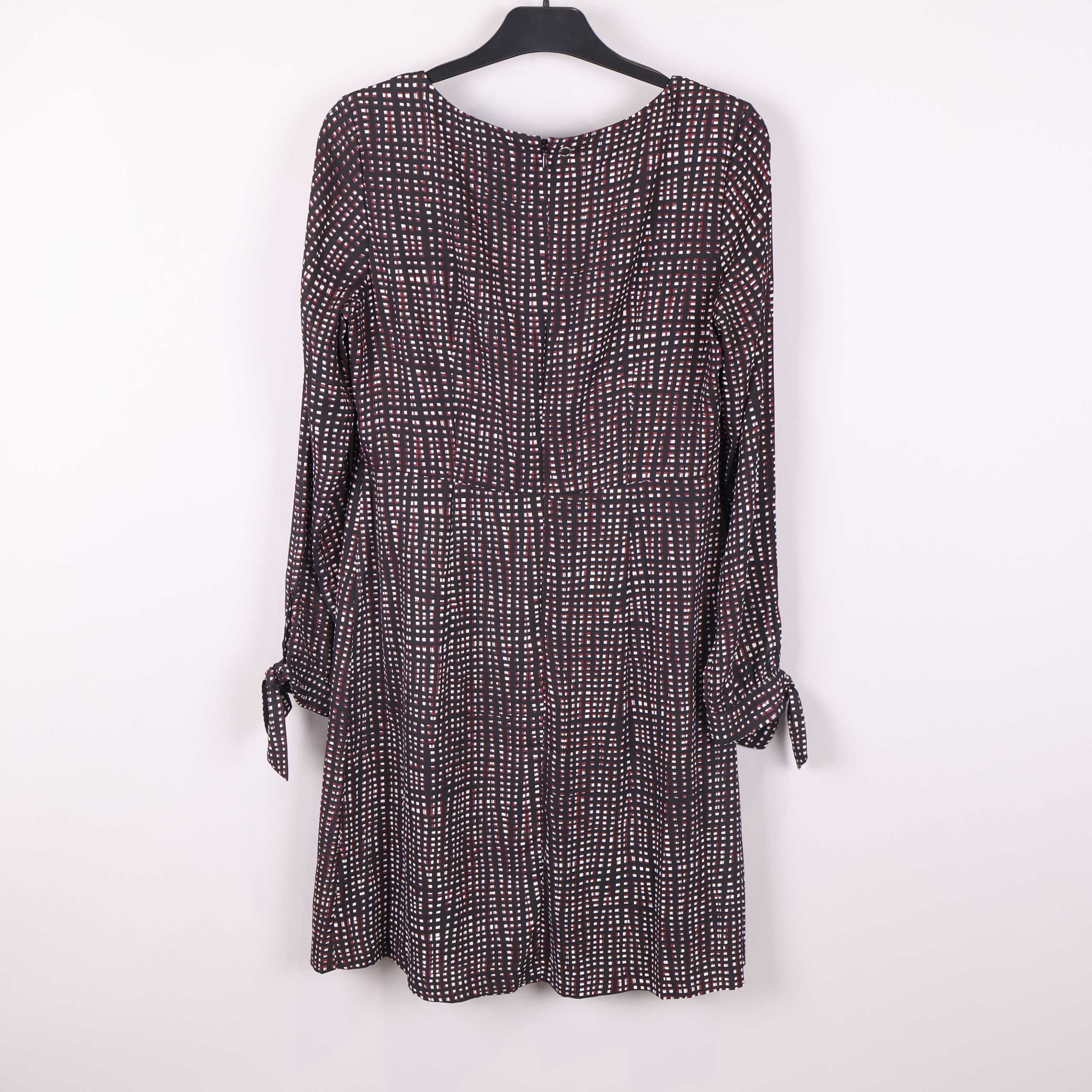 Trendig klänning med grafiskt rutmönster i svart, vinrött och vitt. Modellen har dekorativa knytband vid handlederna och en rund halsringning. Tunn, lätt och följsam känsla tack vare fodrad insida i polyester. Blixtlås baktill för enkel på- och avtagning.