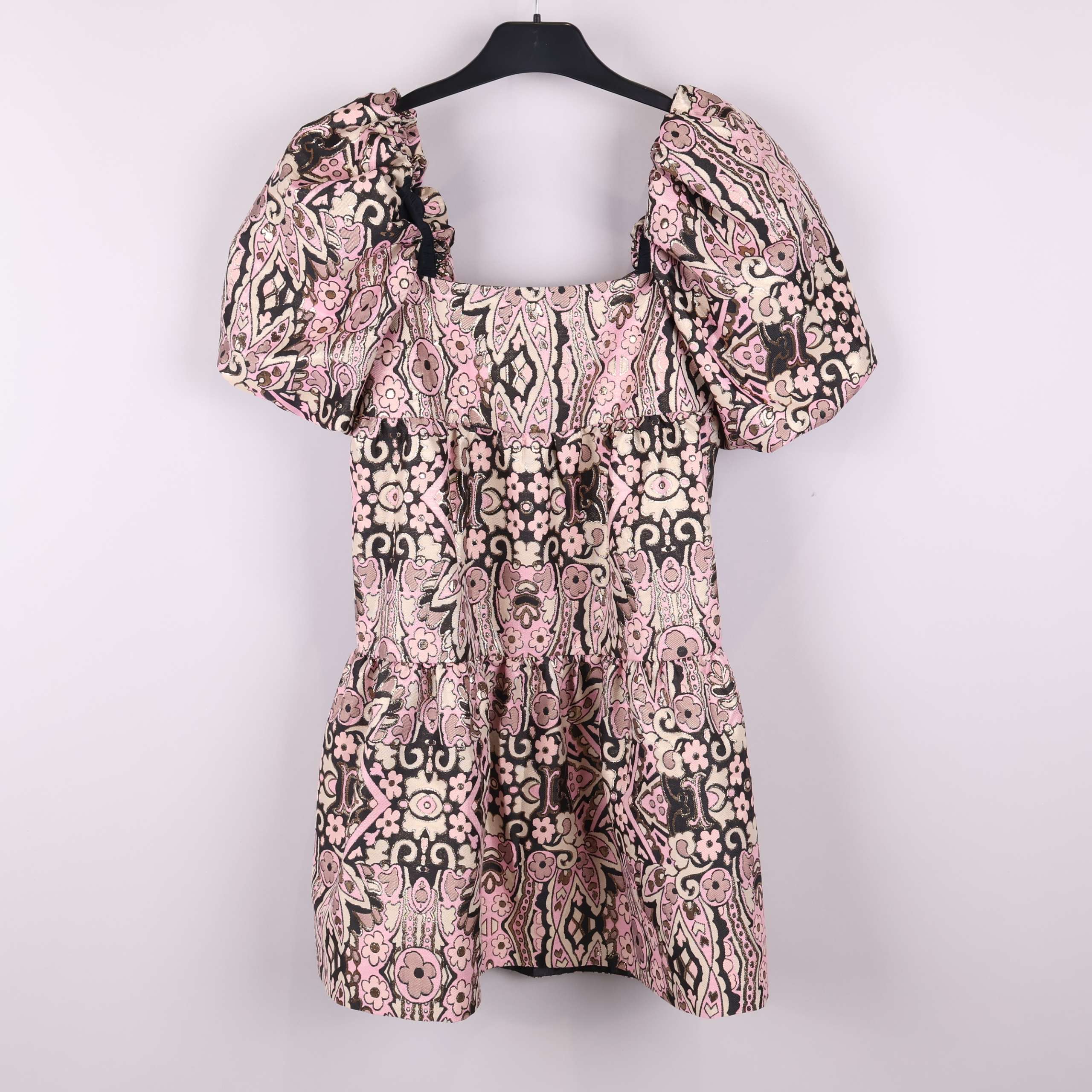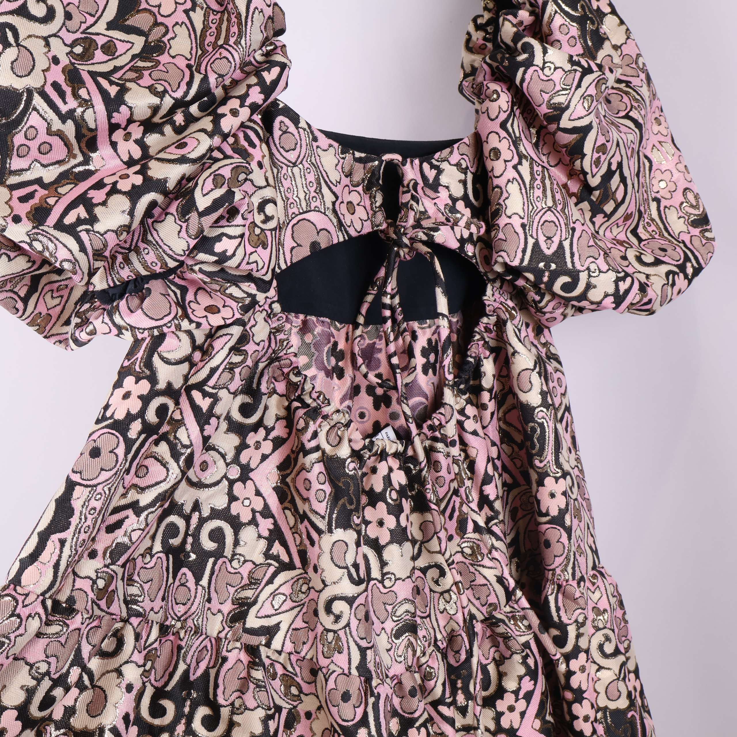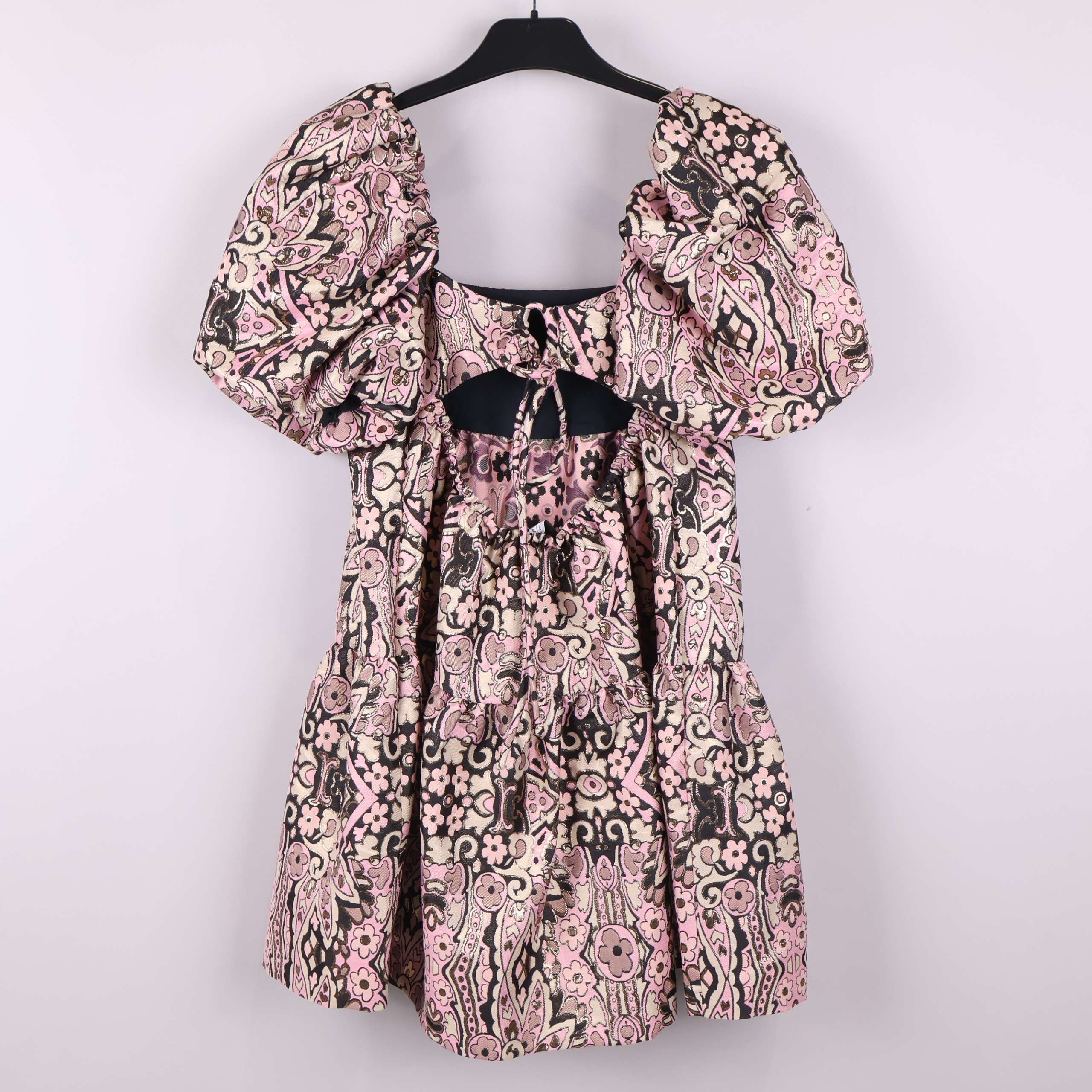 Mönstrad kort klänning med voluminösa puffärmar och smockdetaljer. Den har struktur och glimrande yta tack vare inslag av metalliserat garn samt ett retroinspirerat, grafiskt blommönster i rosa, beige och svart. Öppen rygg med knytdetalj för en lekfull touch.