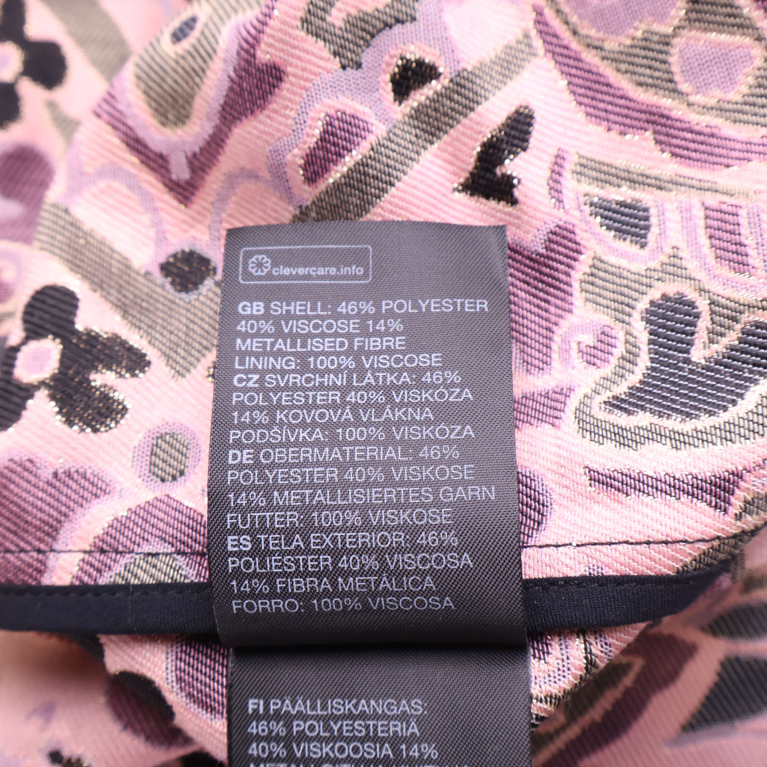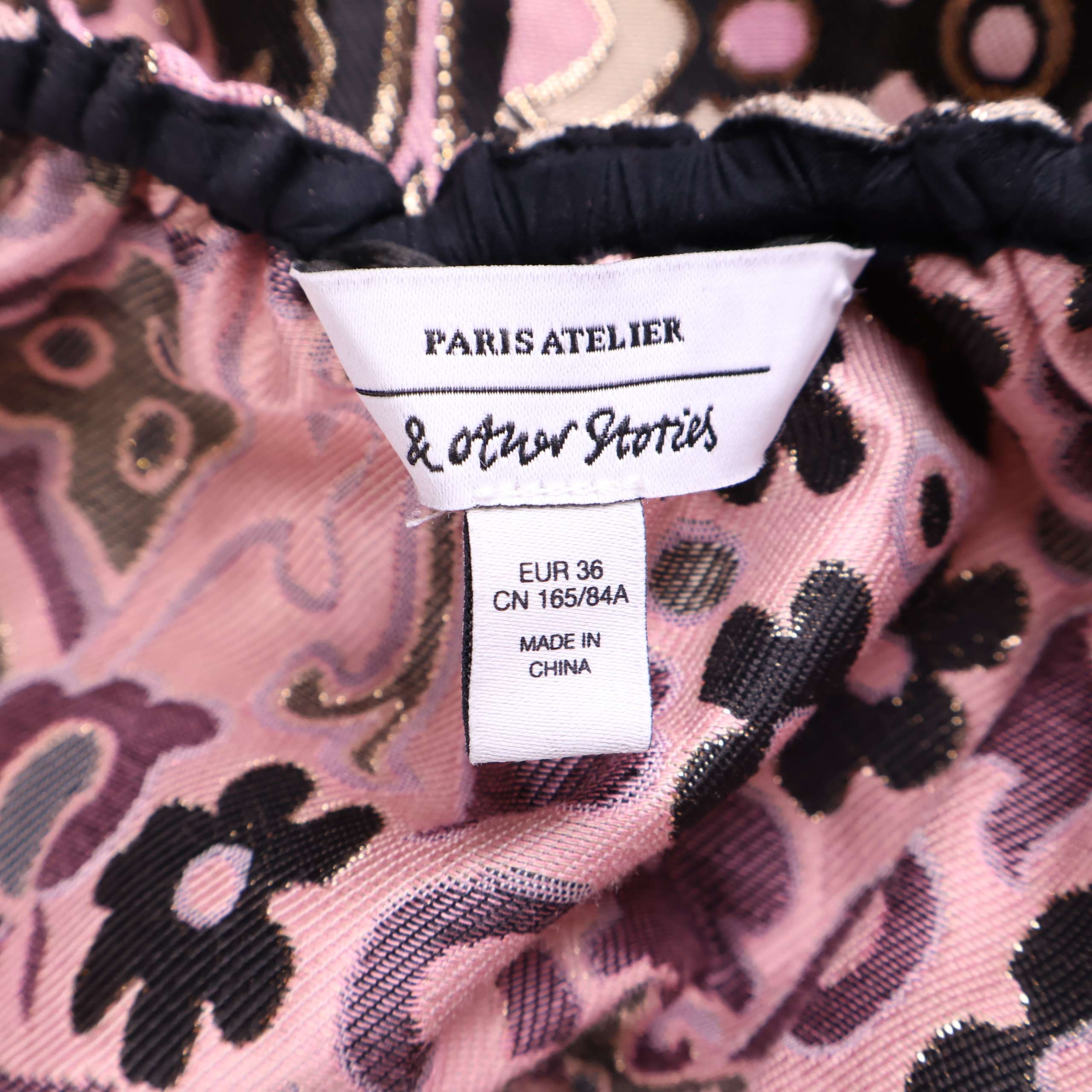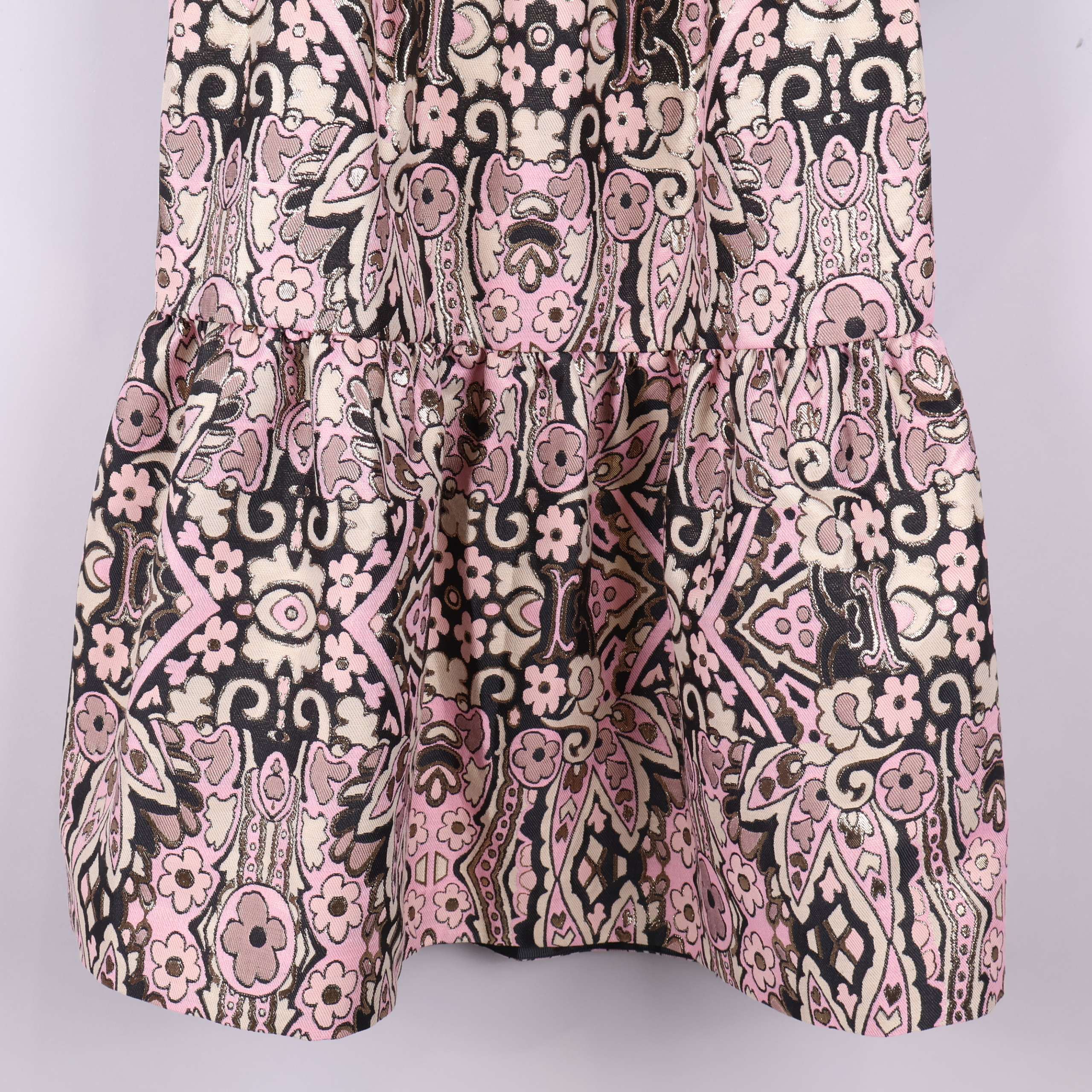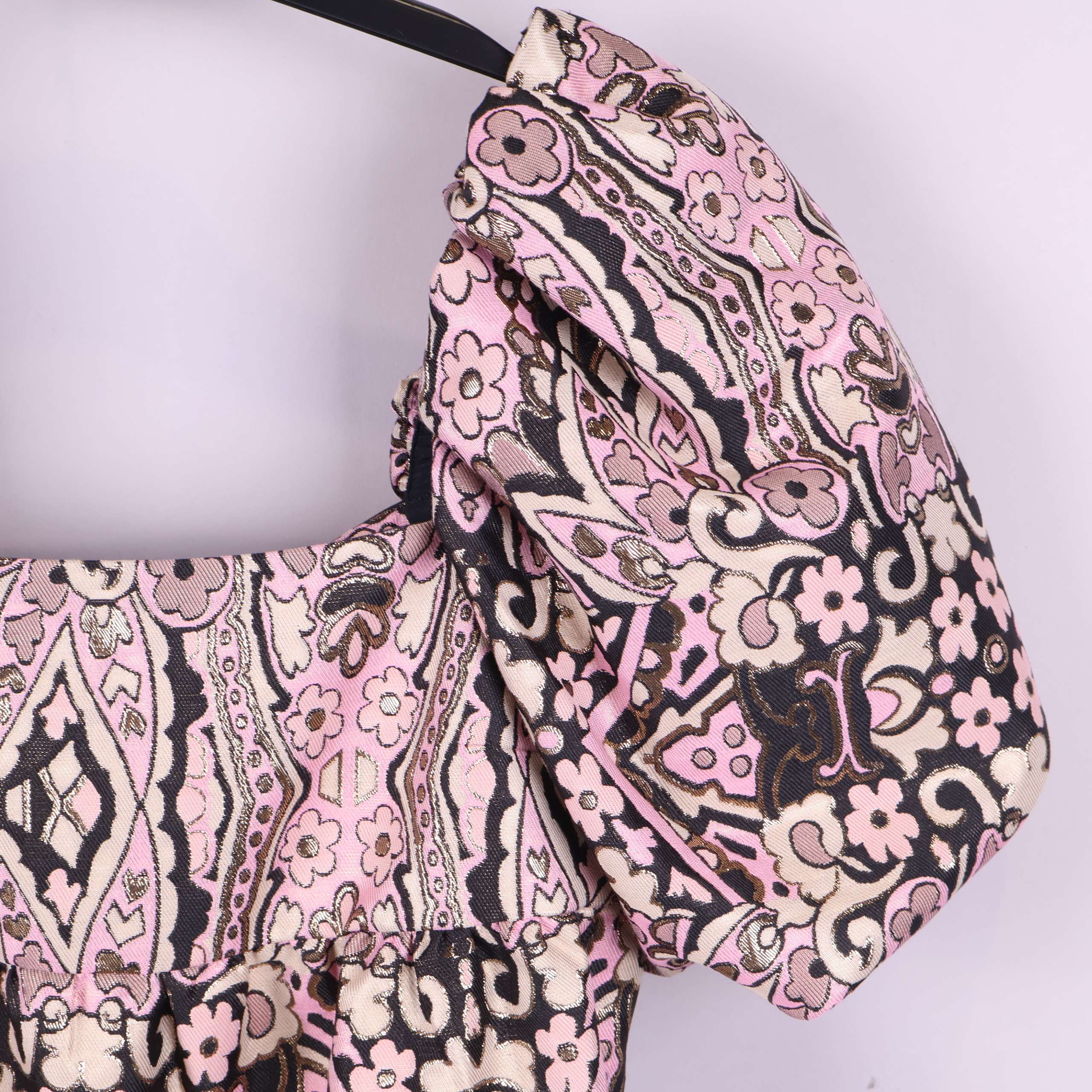 Mönstrad kort klänning med voluminösa puffärmar och smockdetaljer. Den har struktur och glimrande yta tack vare inslag av metalliserat garn samt ett retroinspirerat, grafiskt blommönster i rosa, beige och svart. Öppen rygg med knytdetalj för en lekfull touch.