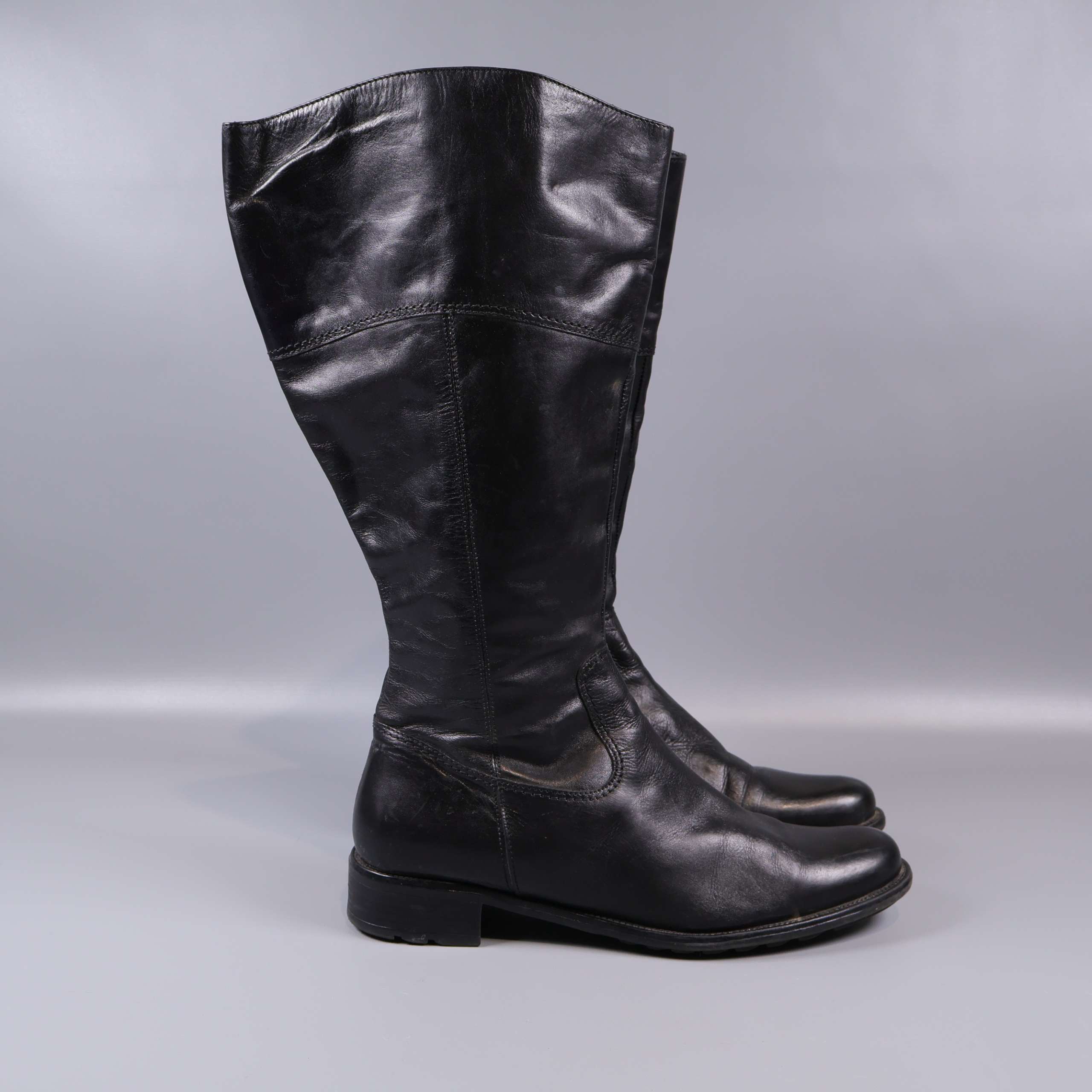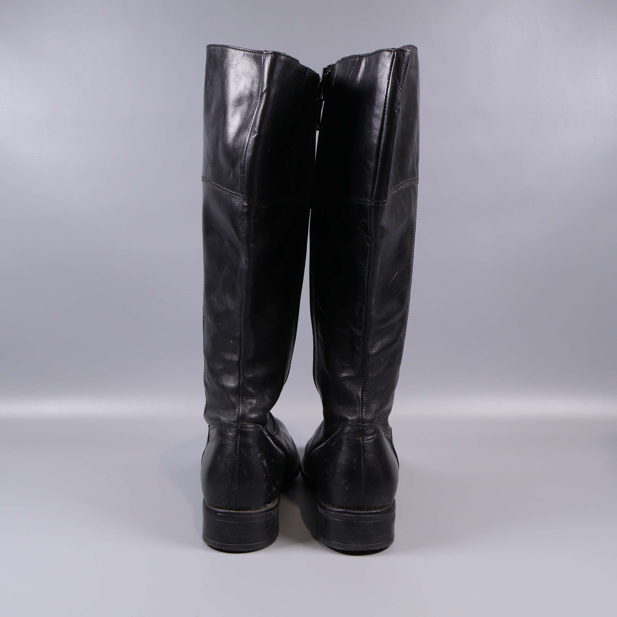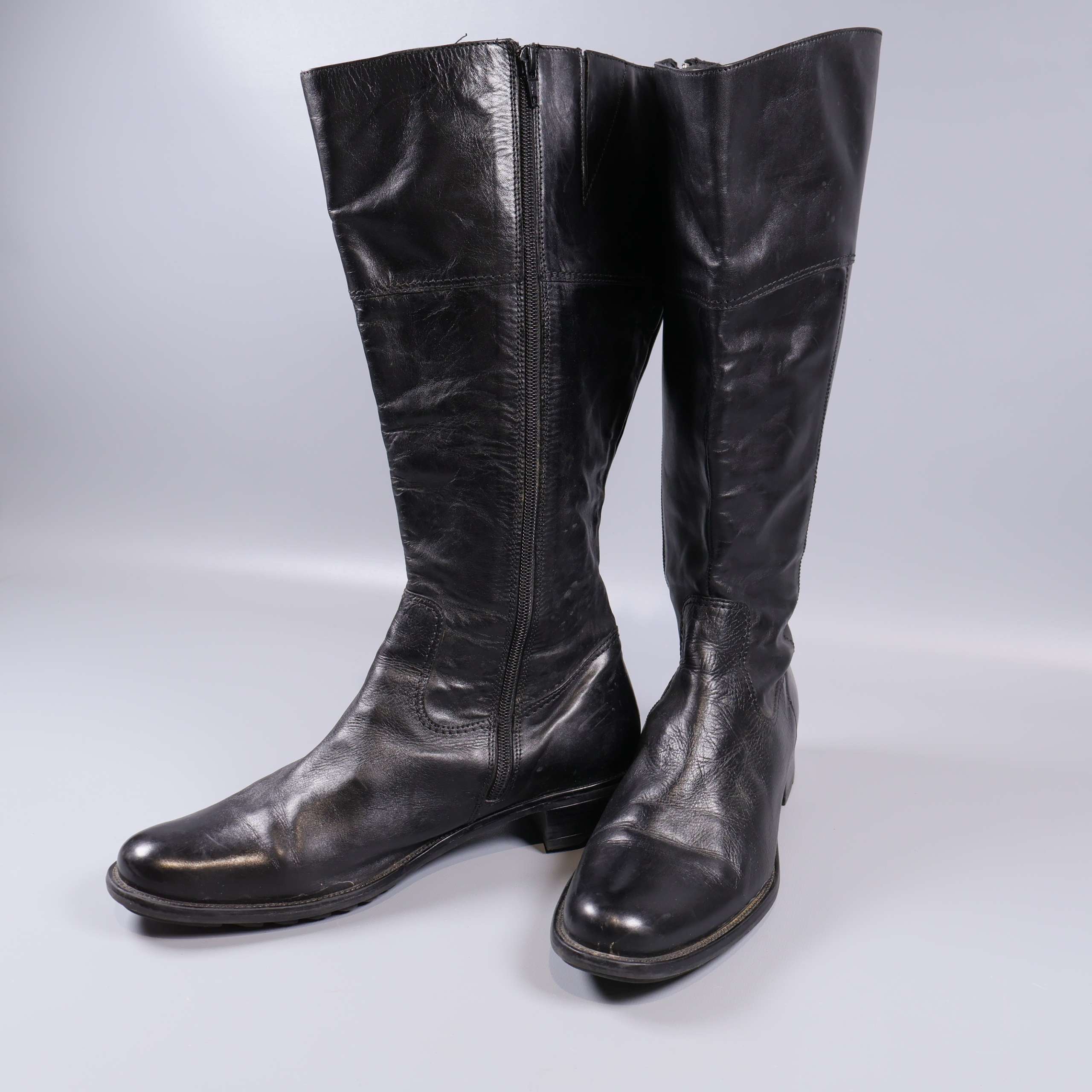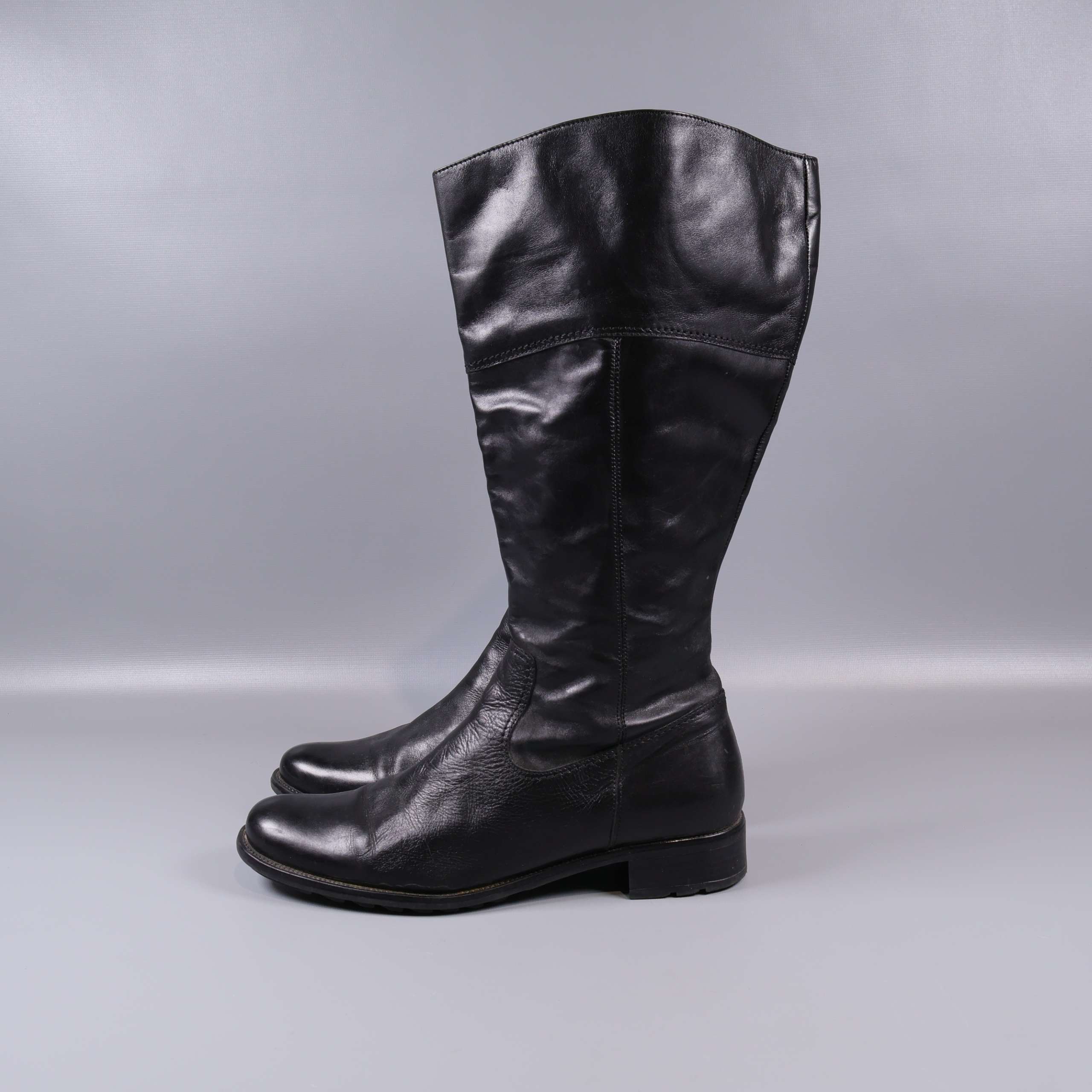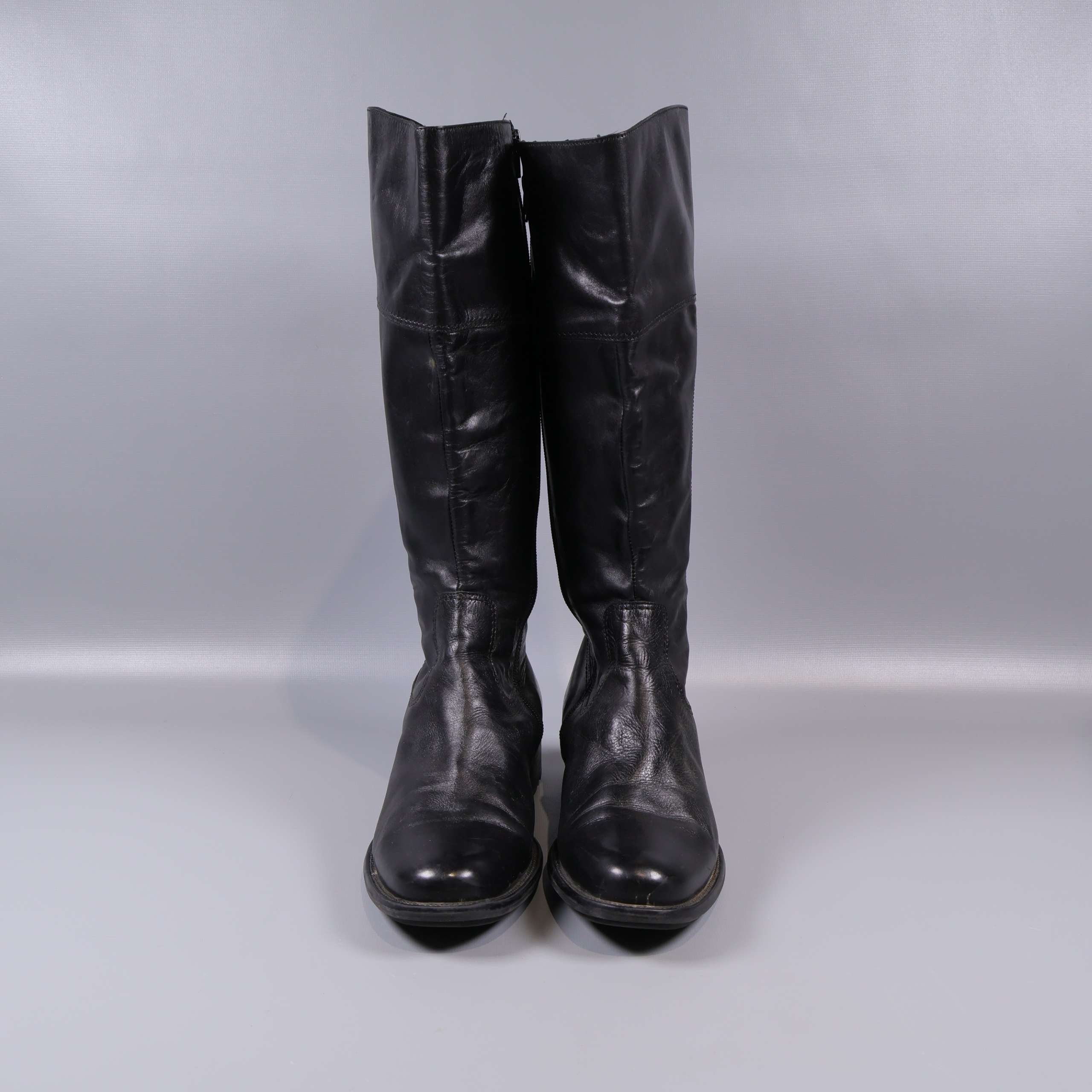 Höga svarta stövlar med mjukt blankt läderutseende och robust sula. Rak siluett och diskreta sömdetaljer som ger en stilren look. Dragkedja på insidan för enklare påtagning. Perfekta för dig som gillar klassisk och tidlös design med en modern touch.