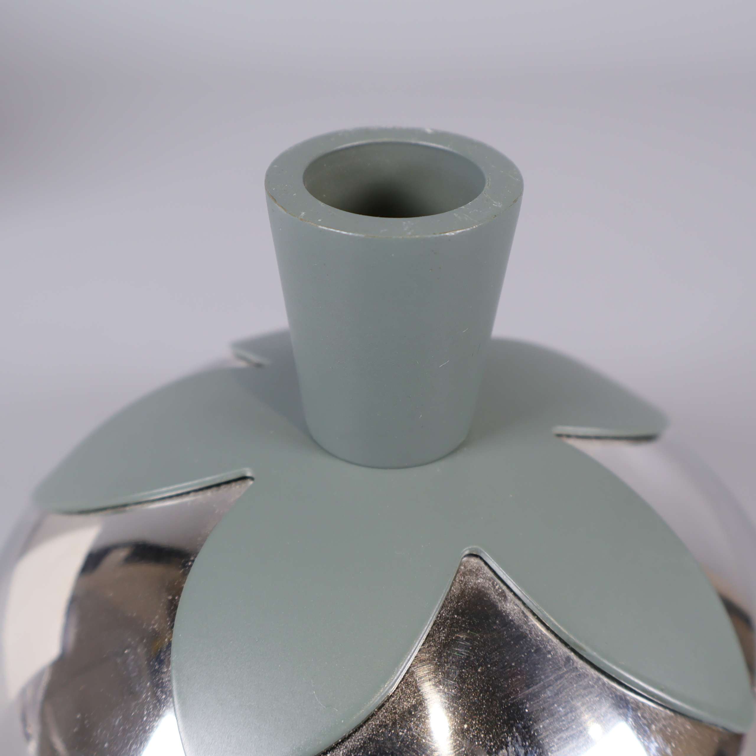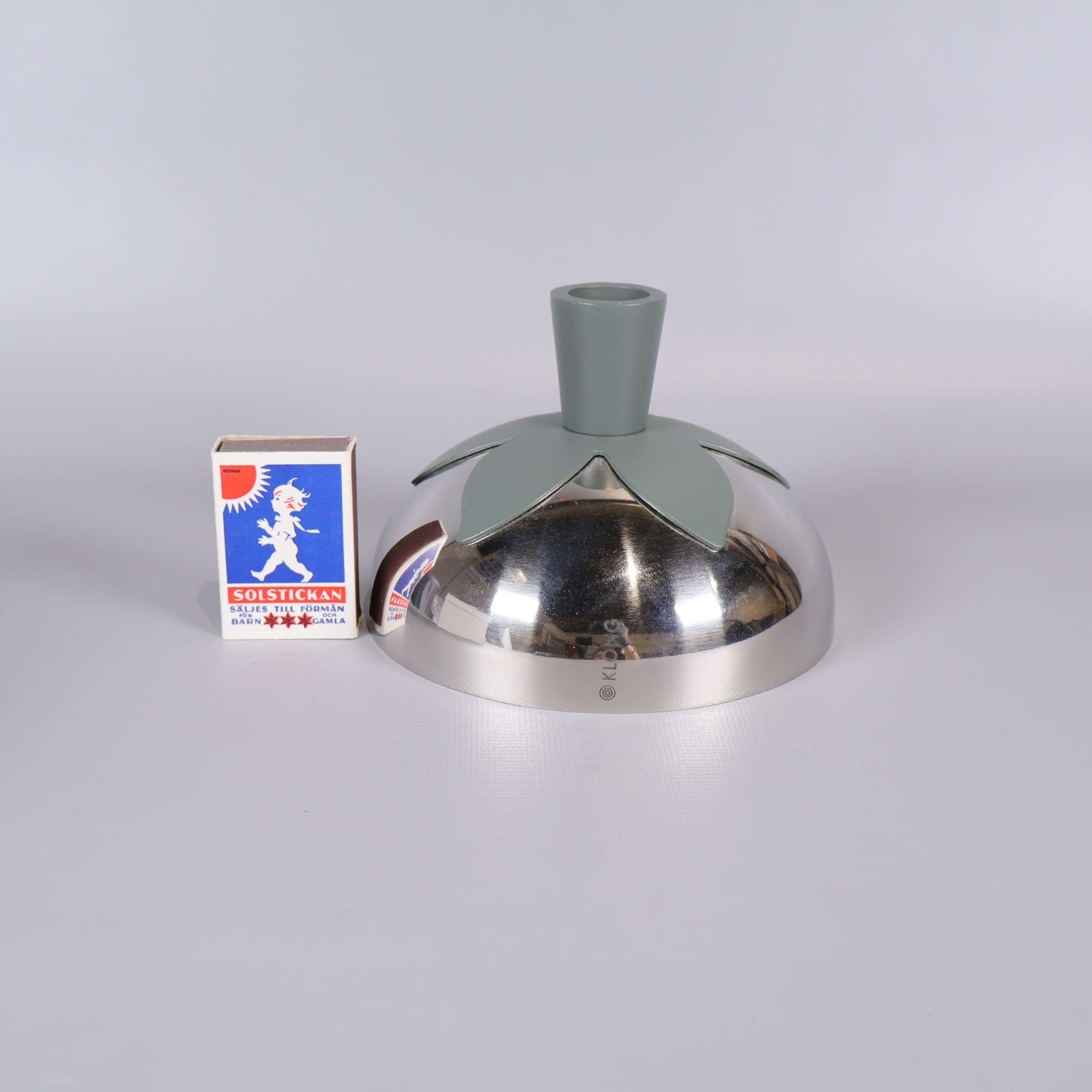 Modern ljusstake med rund, blank metallfinish och sober grågrön bladformad detalj upptill. Designad av Eva Schildt för Klong. Balanserar stilren enkelhet och lekfull form – snygg i både vardagsrum och på festdukning. Kommer med originalförpackning för trygg förvaring.