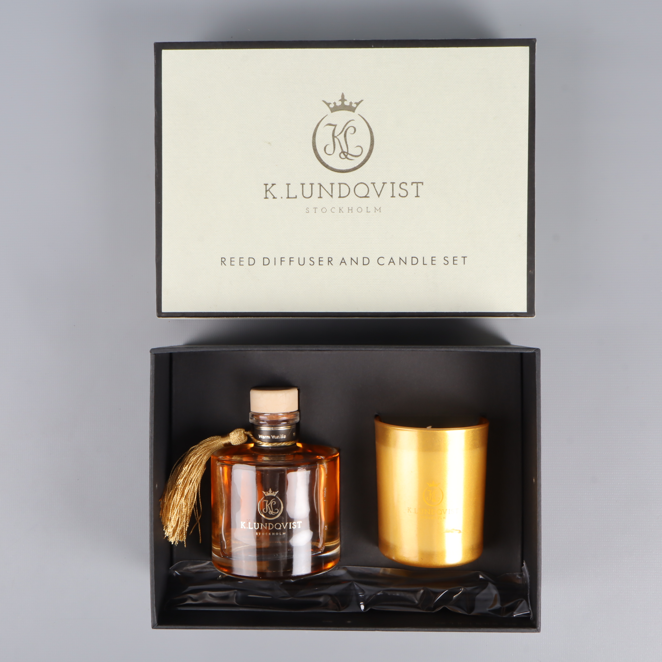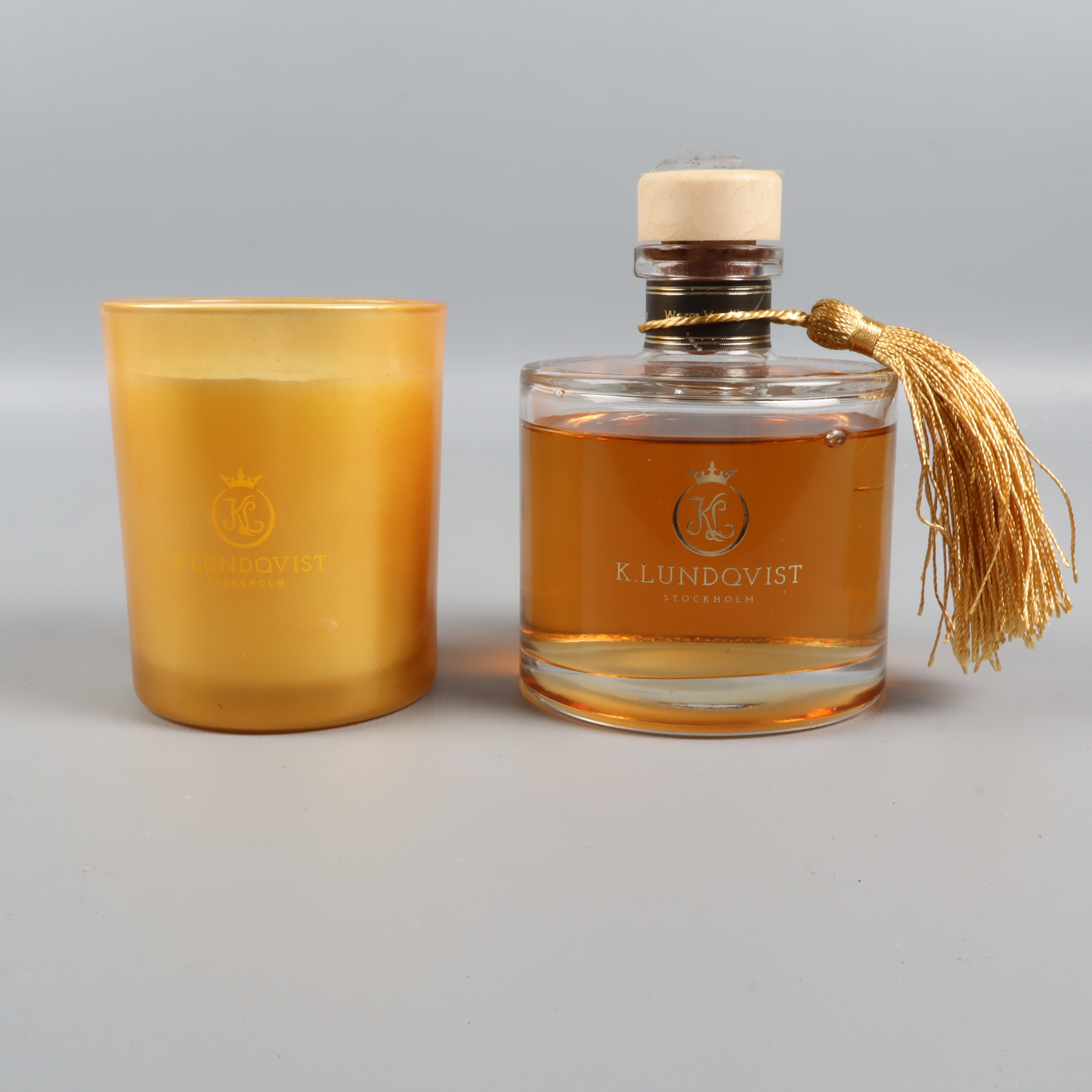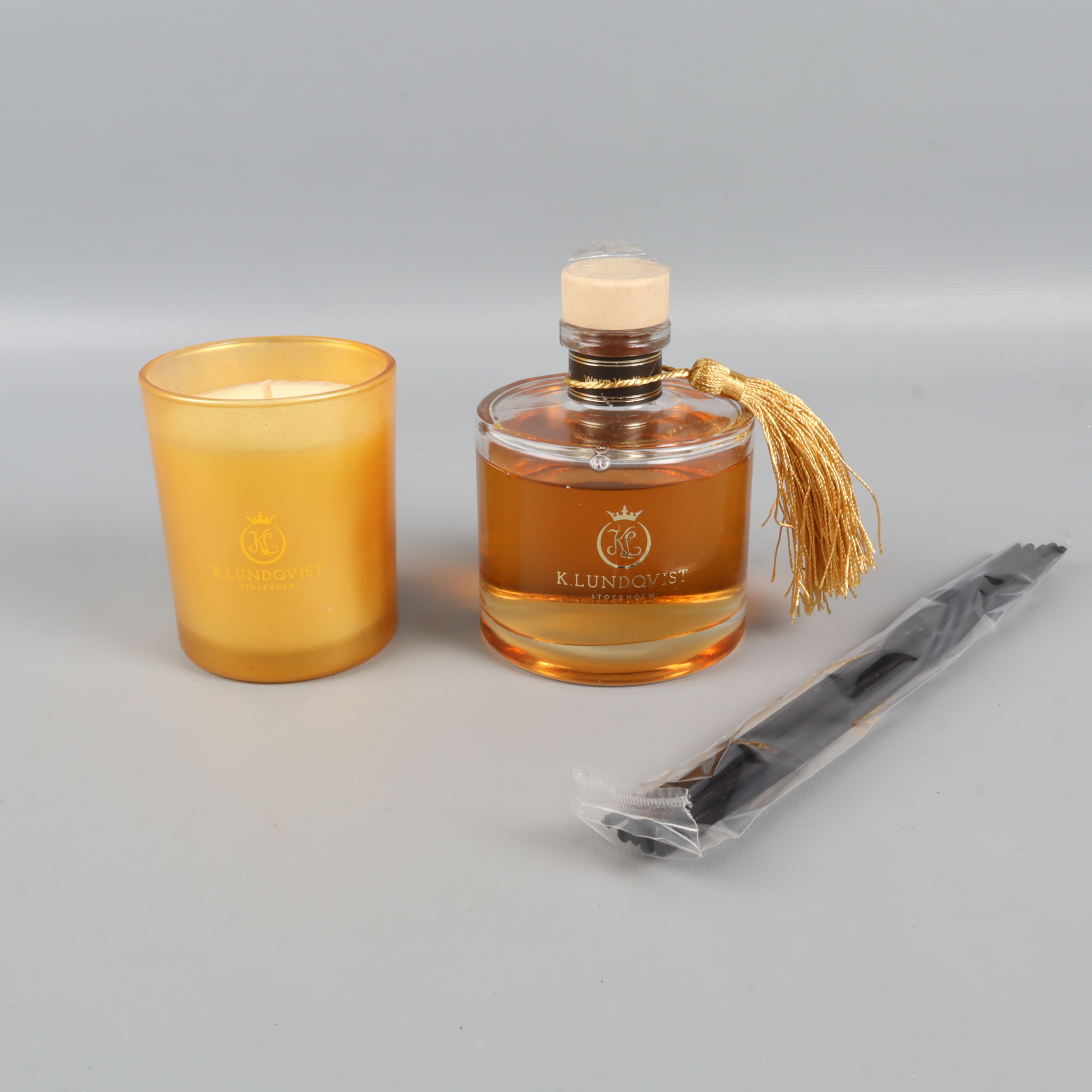 Elegant doftljus och doftpinnar med varm vaniljdoft från K.Lundqvist Stockholm. Lyxig flaska i klarglas med dekorativ tofs och stilren förpackning. 10 st svarta doftpinnar och bärnstensfärgad doftande vätska med en livslängd på 5-8 månader och ett doftljus i guld med en brinntid på 30 timmar. Perfekt detalj i både moderna och klassiska hem, med exklusiv känsla och tydligt dofttema i en neutral design.
