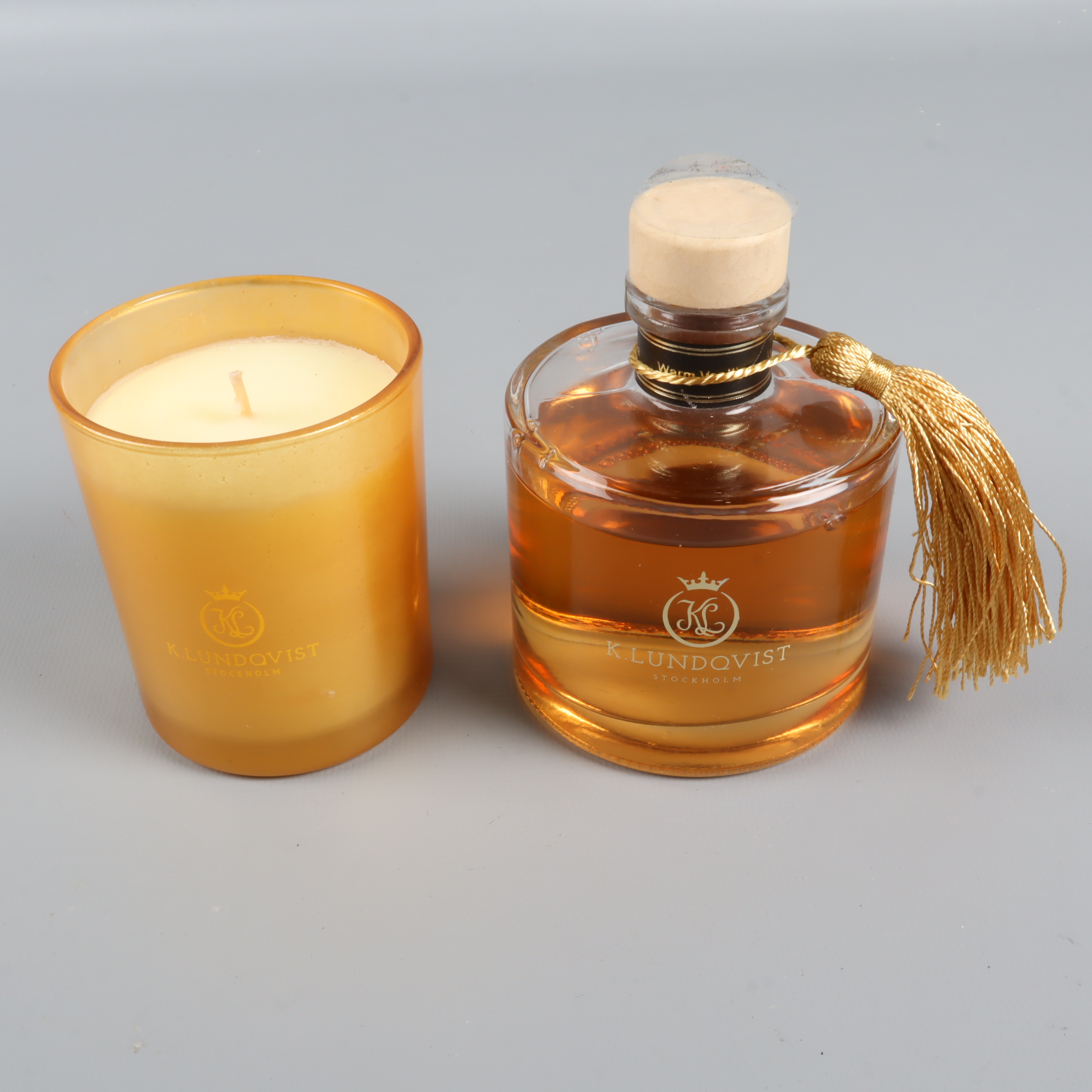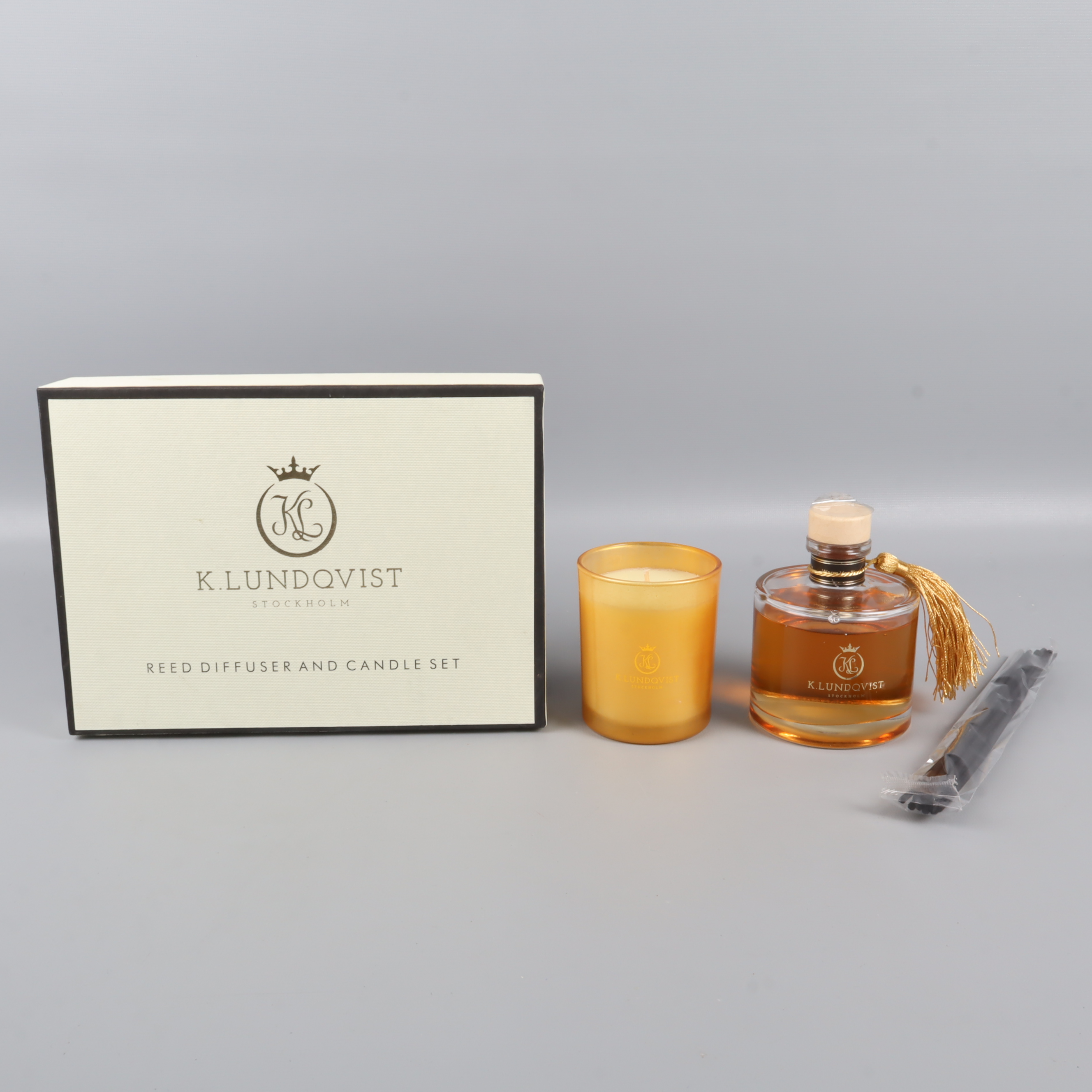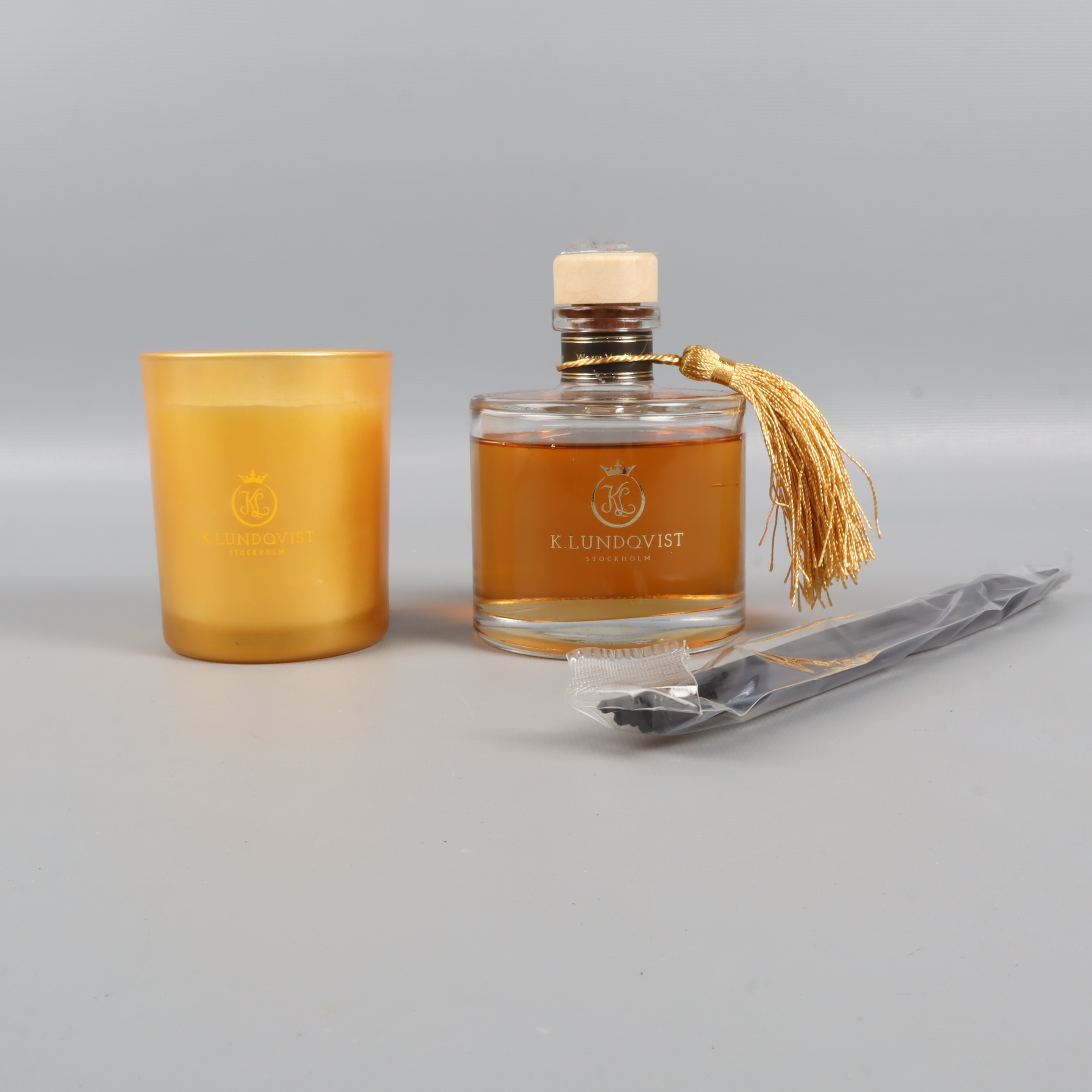 Elegant doftljus och doftpinnar med varm vaniljdoft från K.Lundqvist Stockholm. Lyxig flaska i klarglas med dekorativ tofs och stilren förpackning. 10 st svarta doftpinnar och bärnstensfärgad doftande vätska med en livslängd på 5-8 månader och ett doftljus i guld med en brinntid på 30 timmar. Perfekt detalj i både moderna och klassiska hem, med exklusiv känsla och tydligt dofttema i en neutral design.