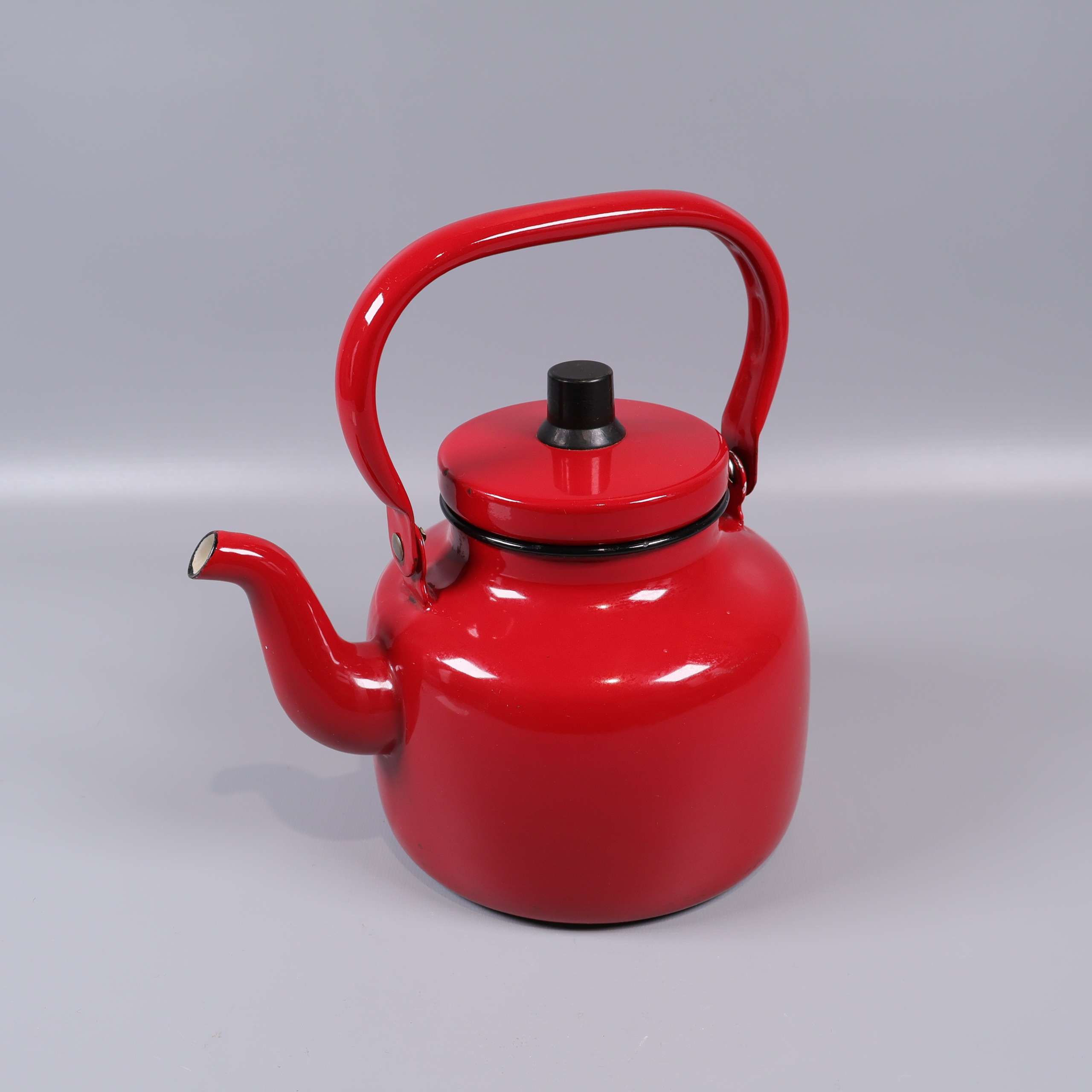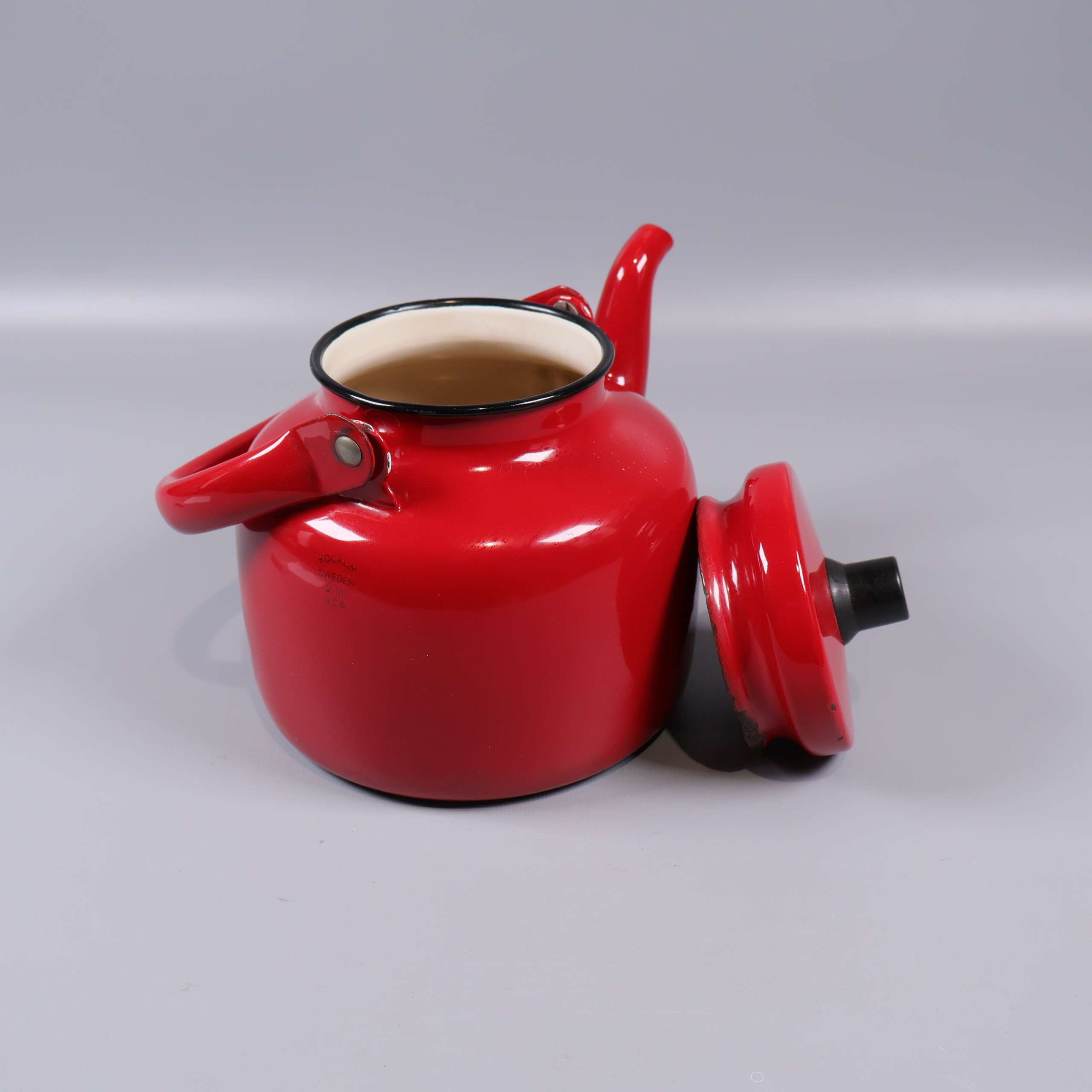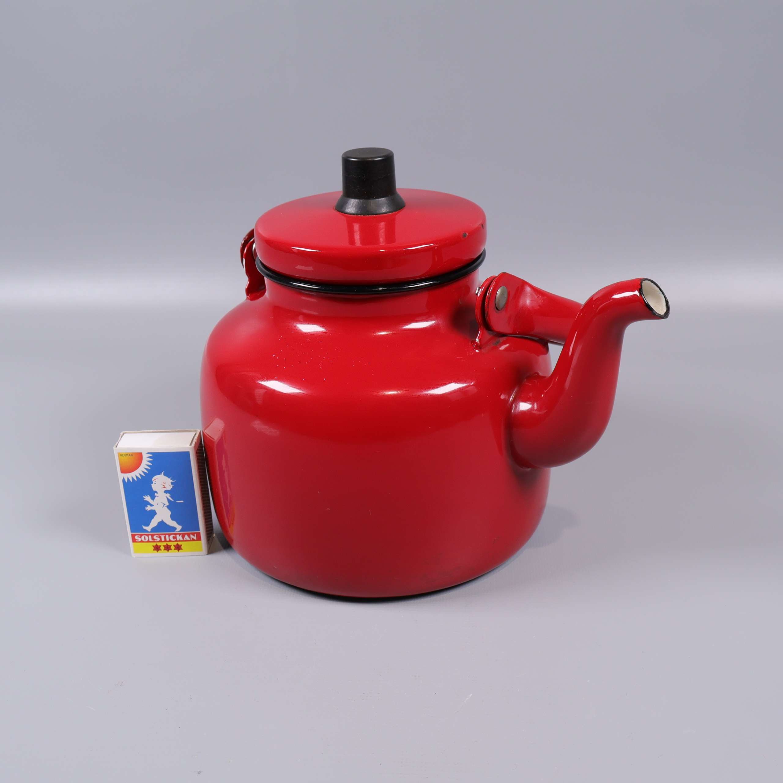 Kockums Kockums - Röd emaljerad vattenkittel - 2 liter 259 kr Product variation Antal st Beskrivning Stilren vattenkittel med blank röd finish, generös handtag i metall och stor pip för smidig upphällning. Invändigt ljust emaljerad och rymmer 2 liter. Locket har svart vred och viss patina som ger en retro känsla. Visa all beskrivning Skick Använt skick Produkten har blivit använd och kan ha slitits eller ha mindre skador Läs mer om hur vi bedömer Dimensions Höjd: ca 18cm, Bredd: ca 24cm, Öppning: ca 10cm Färg Röd Material Emalj Varumärke Kockums Produkten är unik och finns enbart som 1 st i lager. Fri frakt på alla köp över 990 kr. 14 dagars ångerrät.