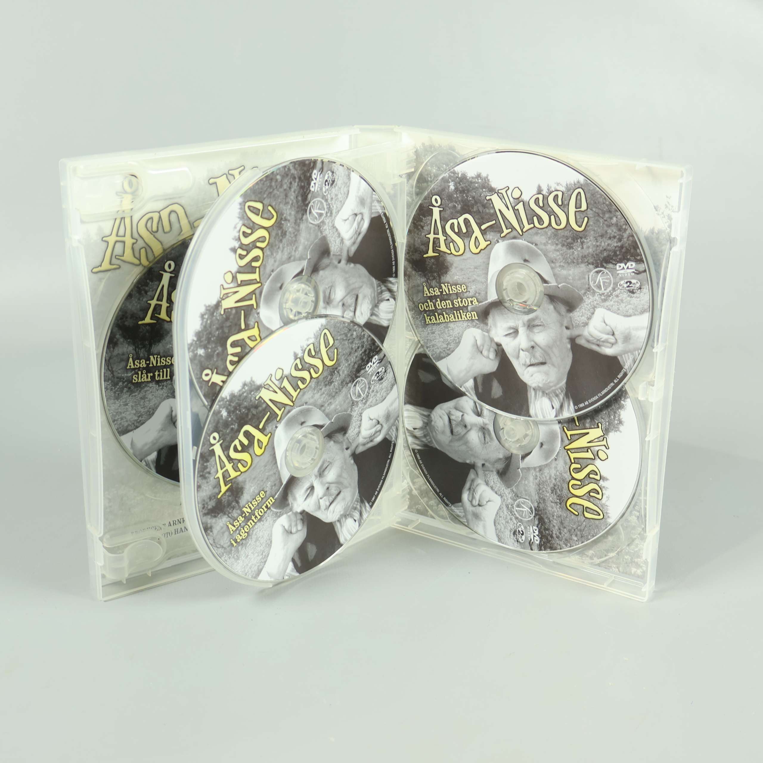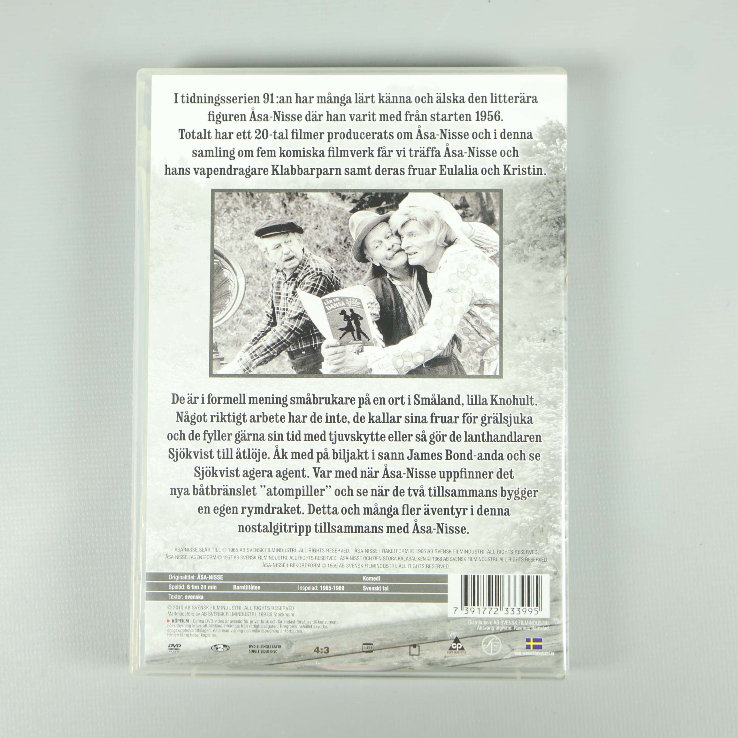 Upplev en klassisk svensk komedi med denna DVD-box som samlar flera filmer om den ikoniska figuren Åsa-Nisse. Boxen innehåller totalt fem skivor, alla med omslag och tryck i svartvitt utförande med guldiga detaljer som ger en unik vintagekänsla. Omslaget pryds av Åsa-Nisse och andra älskade karaktärer i olika komiska poseringar. Inuti fodralet hittar du tydligt markerade skivor med samma karaktärer och titeln tryckt på varje skiva. Boxen passar alla som gillar svensk filmhistoria eller vill återupptäcka humorn och äventyren från Småland. Perfekt för filmkvällar tillsammans med vänner och familj, eller som samlarobjekt för den som älskar svenska klassiker. Alla filmer i boxen är på svenska och genre är komedi. DVD-omslaget och fodralet är robust och passar bra i hyllan. Den här boxen har ett enkelt och praktiskt fodral med transparent plast som skyddar skivorna mot repor. Lätt att öppna och använda.