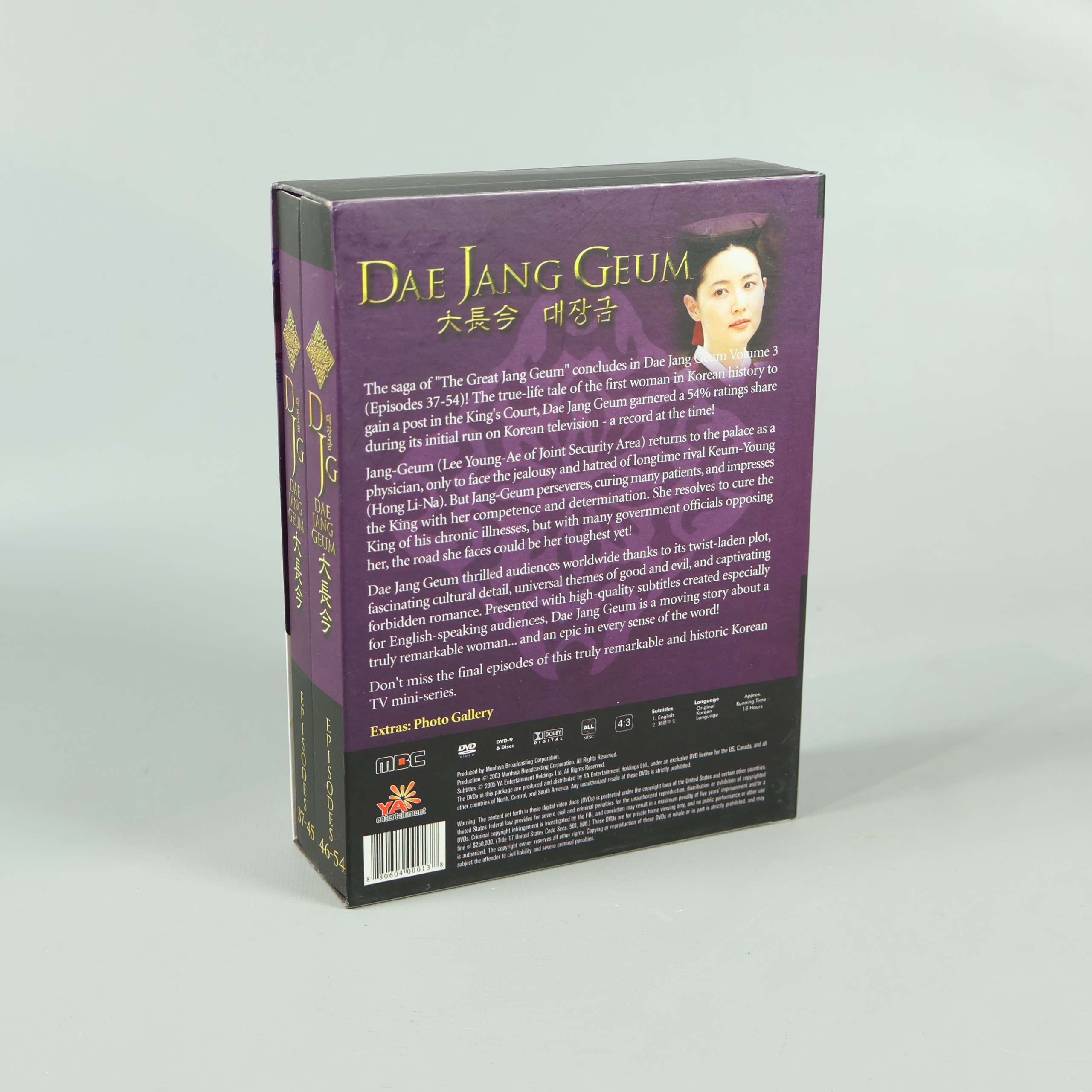 Upptäck denna boxset med Dae Jang Geum, volym 3, som innehåller en serie dramatiska episoder för dig som älskar koreanska TV-serier. Boxen rymmer totalt sex DVD-skivor med episoderna 37 till 54, vilket ger många timmars underhållning. Omslagen och hela designen har ett elegant lila färgtema som verkligen sticker ut i samlingen. De tydliga och bildrika skivorna gör det lätt att navigera mellan avsnitten. Boxen är dekorativ och skyddar innehållet mot repor och smuts, så att du tryggt kan njuta av serien om och om igen. Perfekt för filmkvällar hemma eller att ge bort till någon som uppskattar internationella drama. Språket på serien är koreanska och det finns engelska och kinesiska undertexter, vilket gör den tillgänglig för fler. Den stilrena förpackningen passar lika bra i bokhyllan som på TV-bänken. Sveriges populäraste sålda TV-serier i lättillgängligt format. Perfekt både för samlare och nyfikna tittare som vill utforska koreansk kultur och berättarkonst.