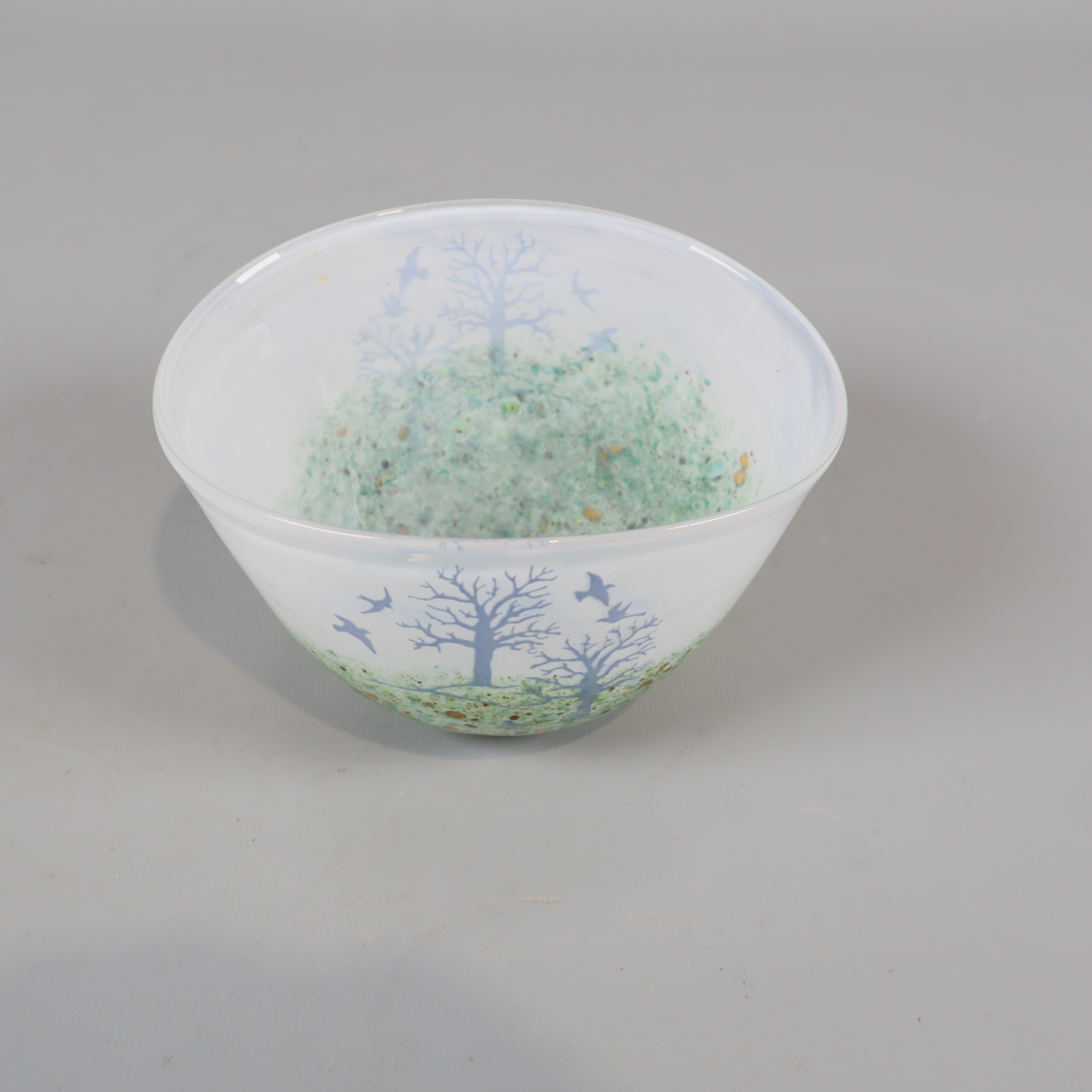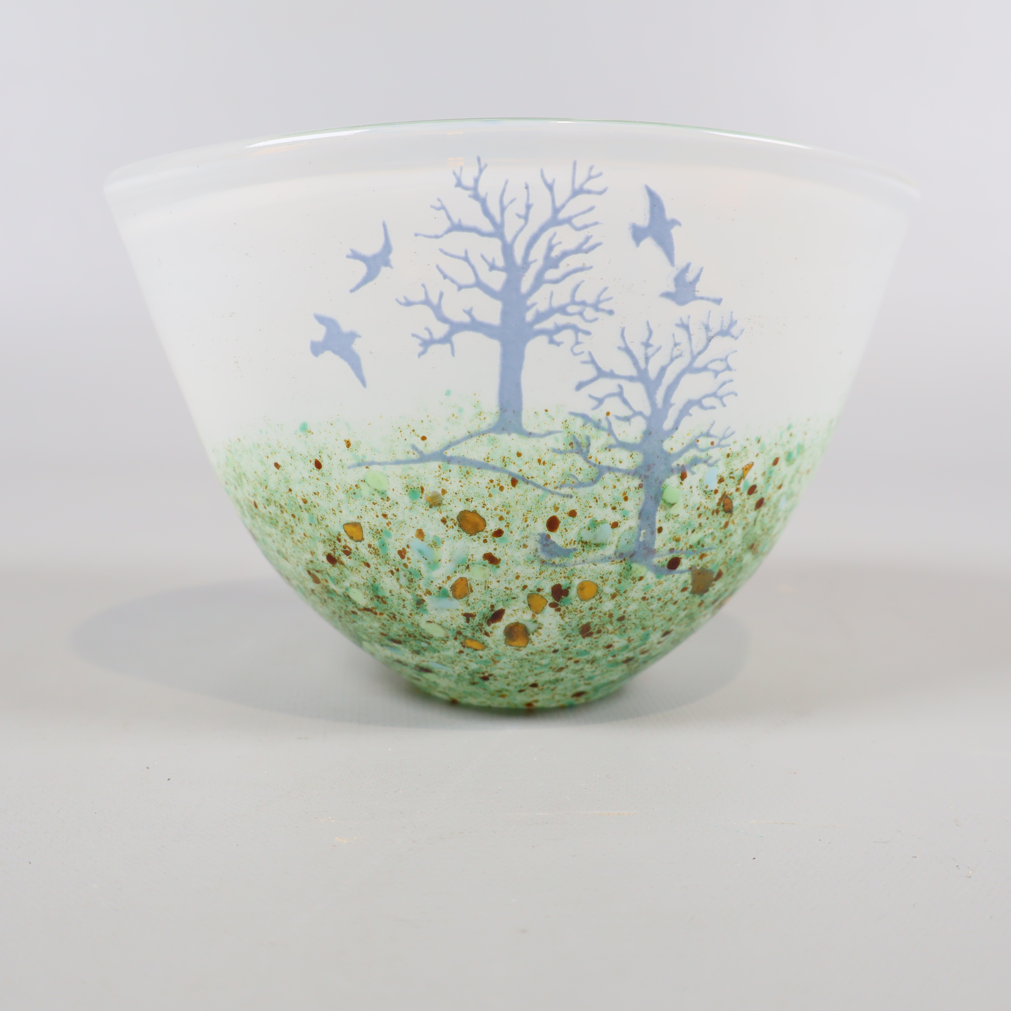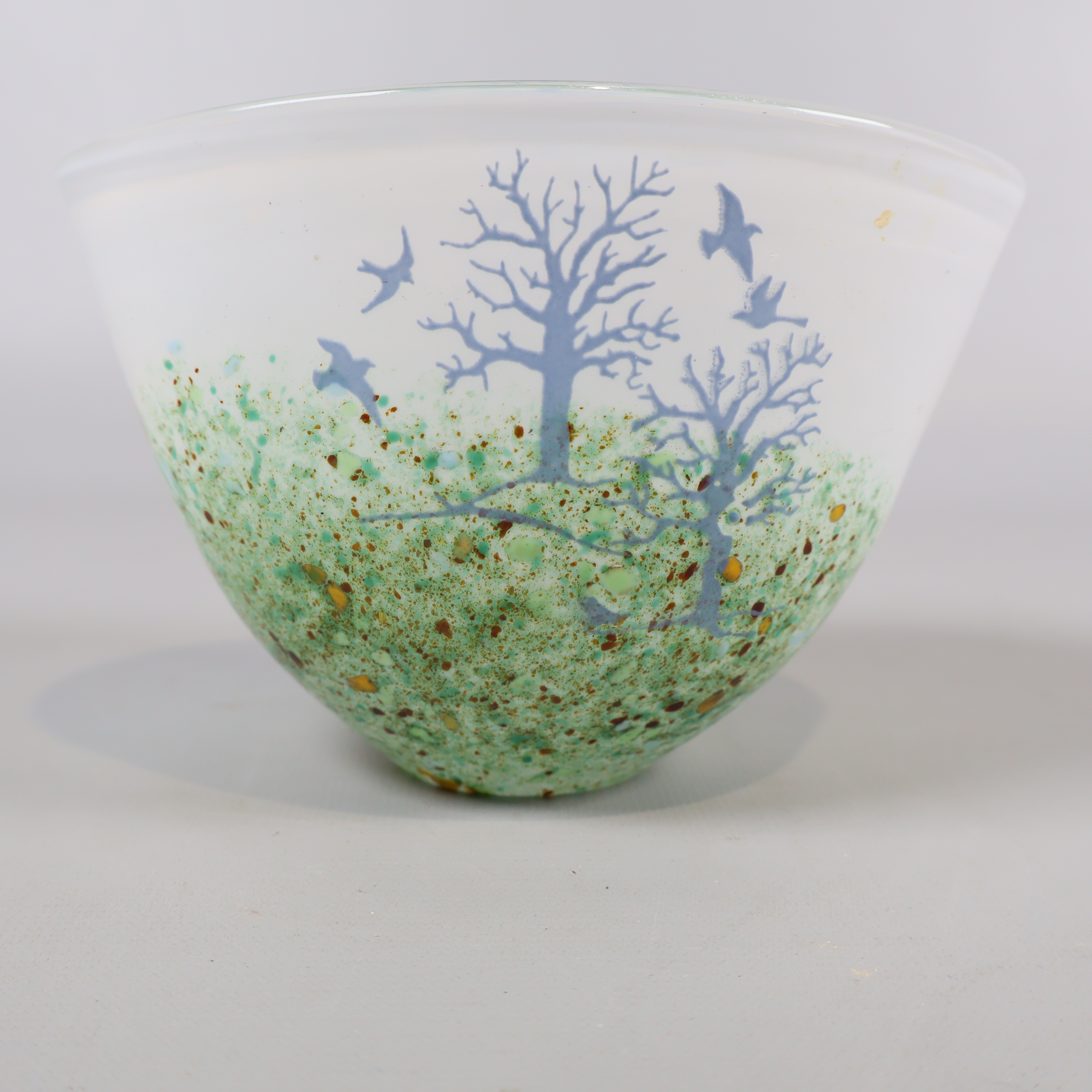 Skål med unikt träd- och fågelmotiv i frostat glas, där dova gröna toner och inslag av gult möter ett skirt, vitt glas. Kosta Boda design signerad Kjell Engman.