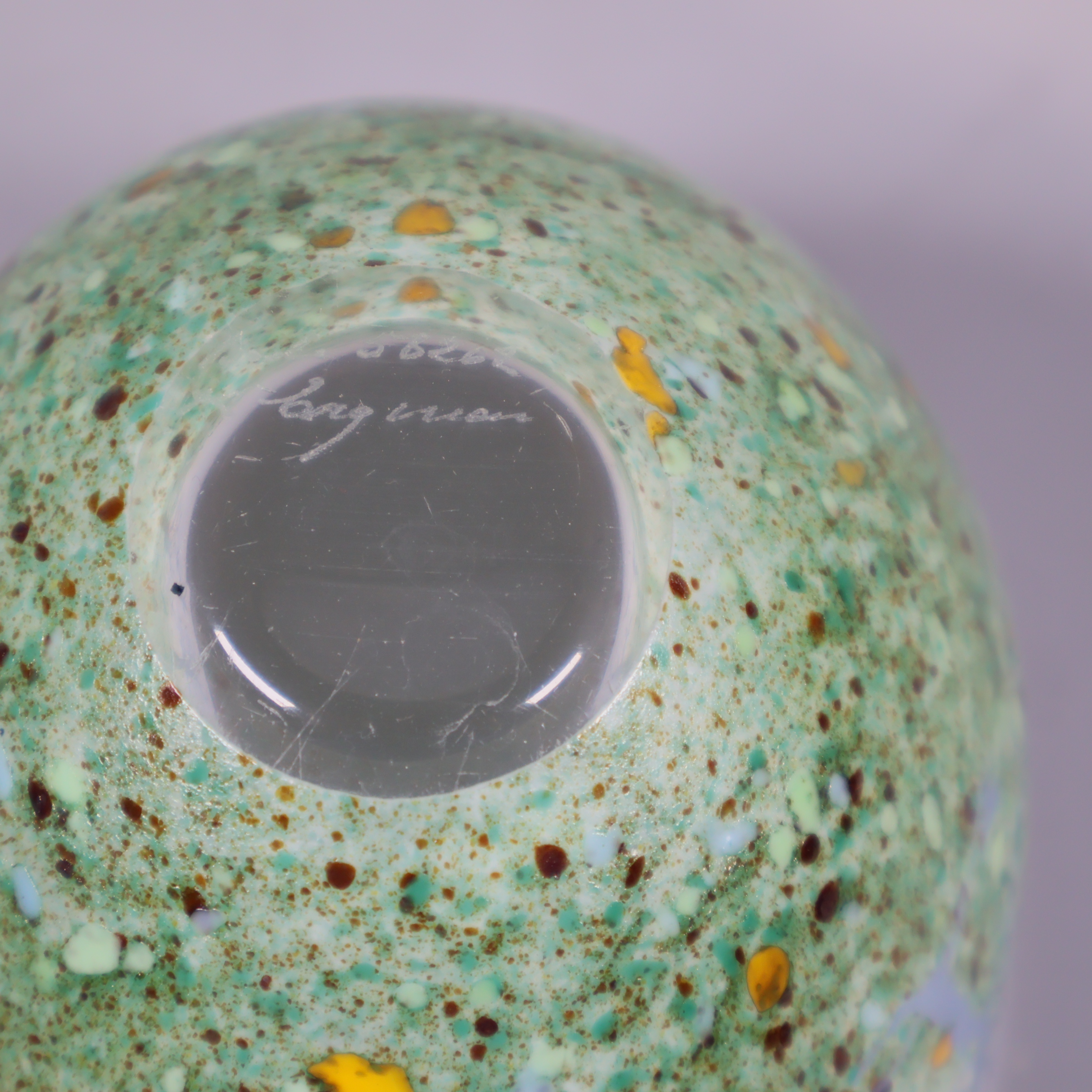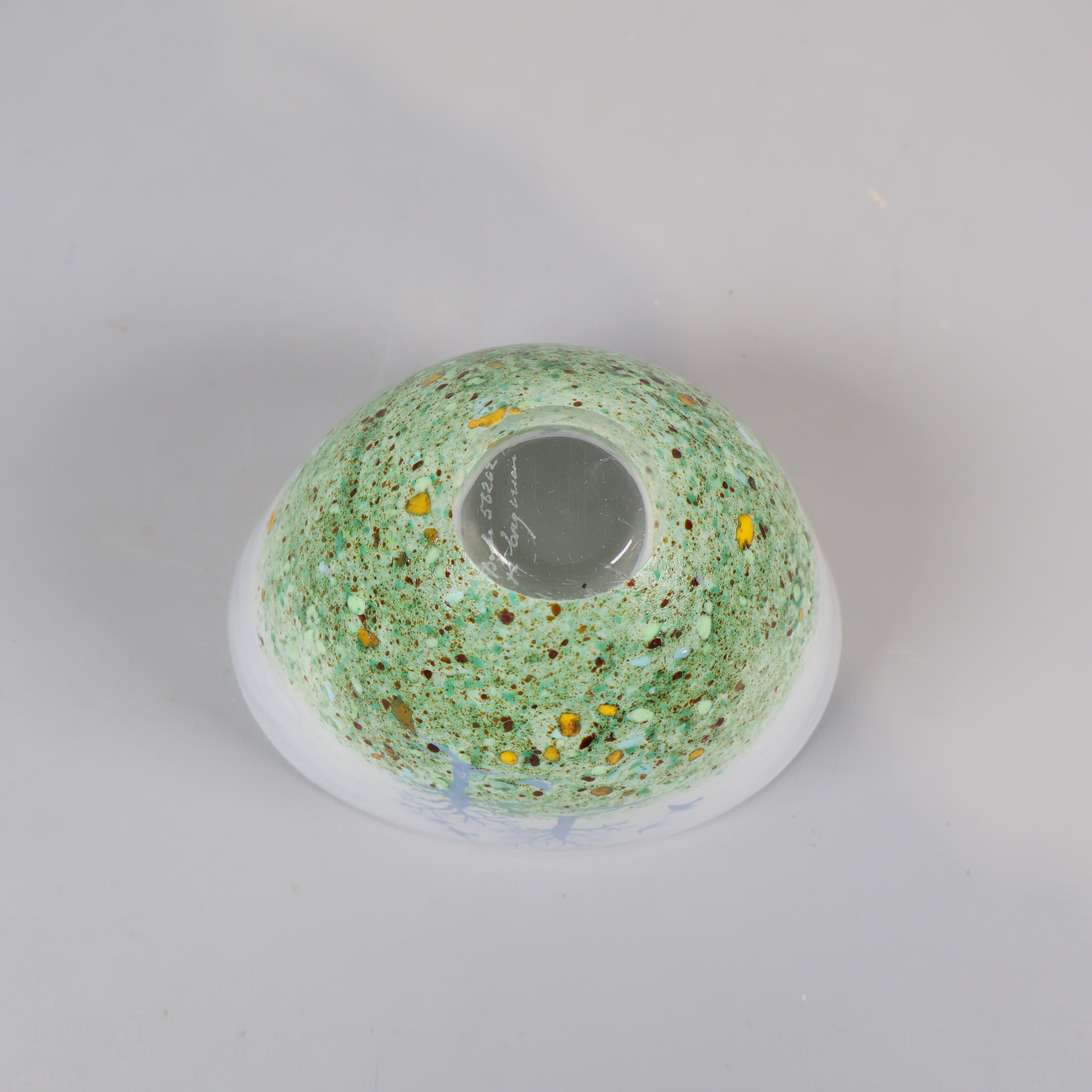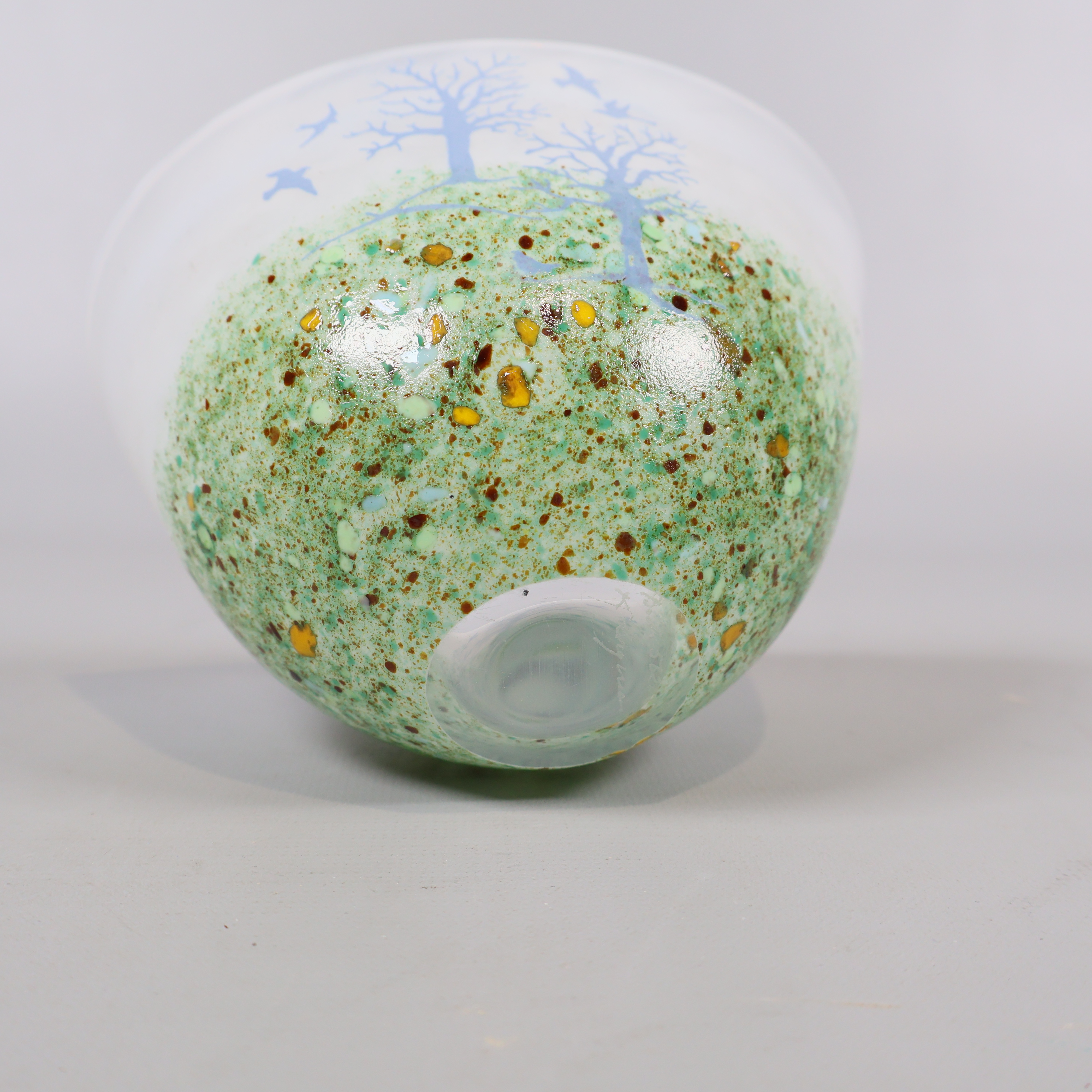 Skål med unikt träd- och fågelmotiv i frostat glas, där dova gröna toner och inslag av gult möter ett skirt, vitt glas. Kosta Boda design signerad Kjell Engman.