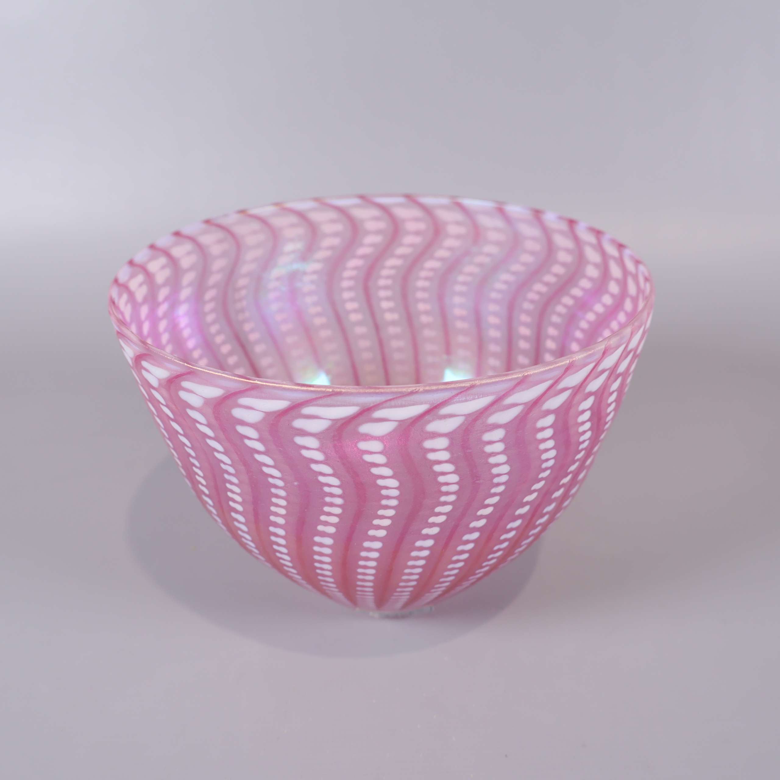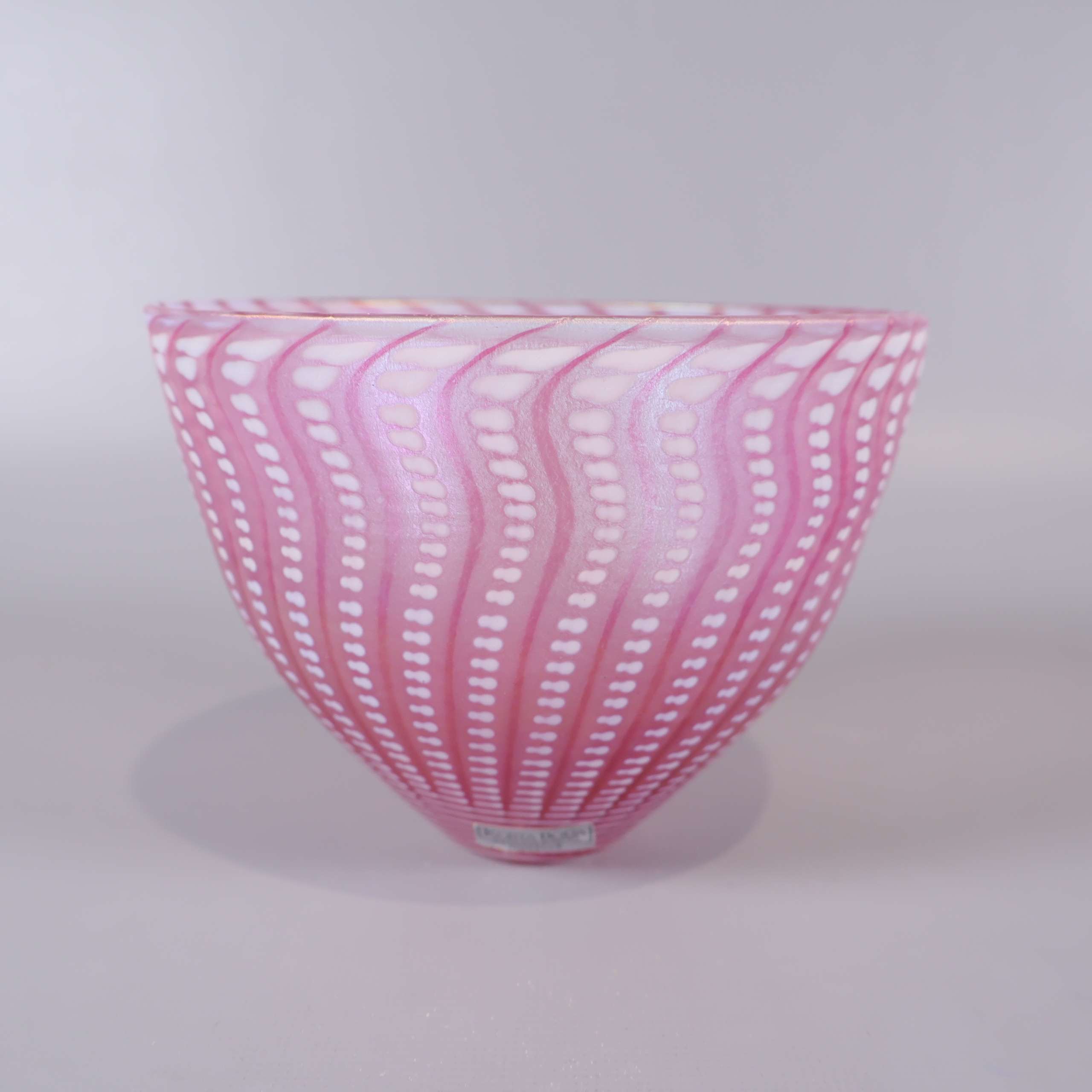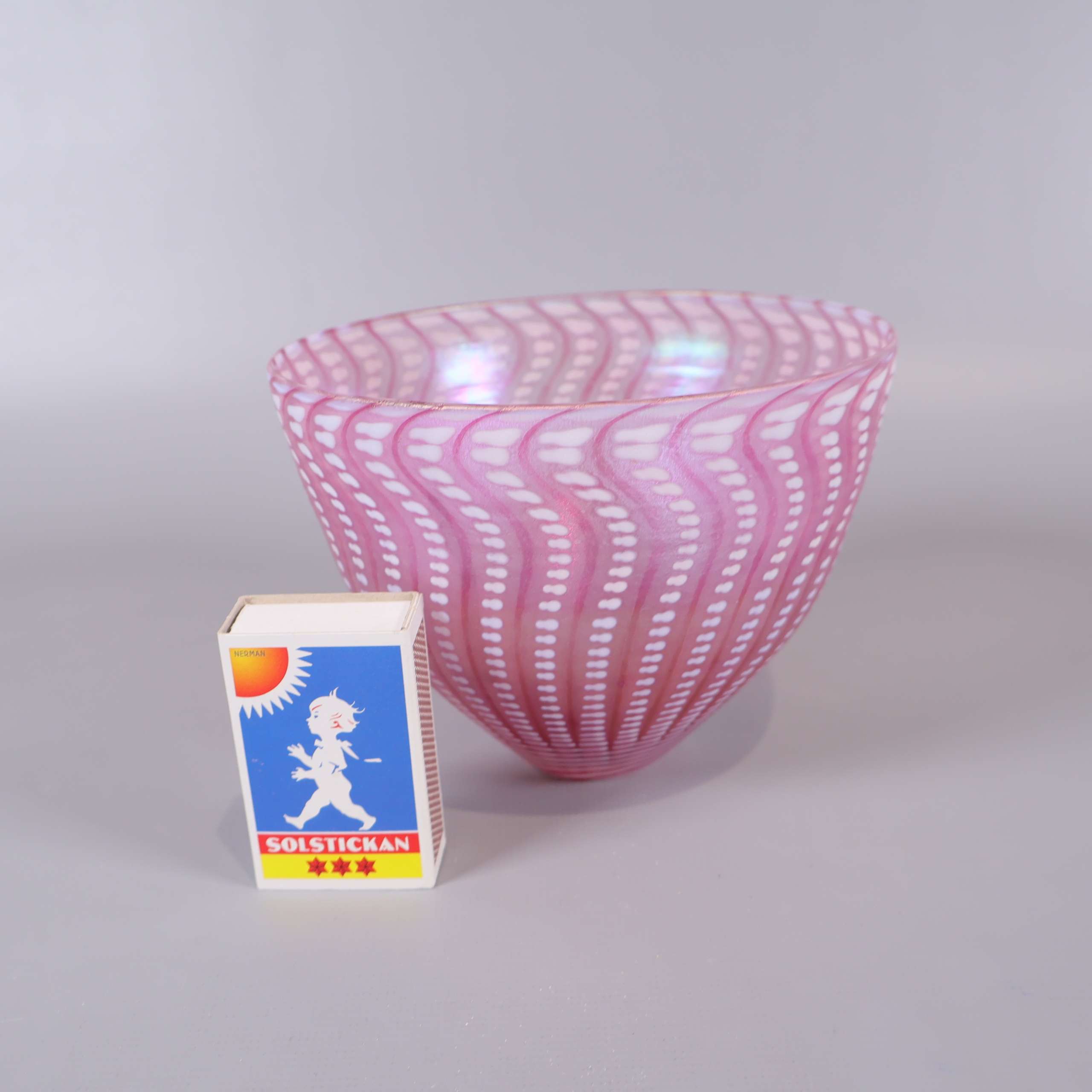 Elegant skål i rosatonat glas med dekorativa vita vågformer runt hela ytan. Skålen har en glansig finish som reflekterar ljuset fint, och passar snyggt i både moderna och klassiska rum.