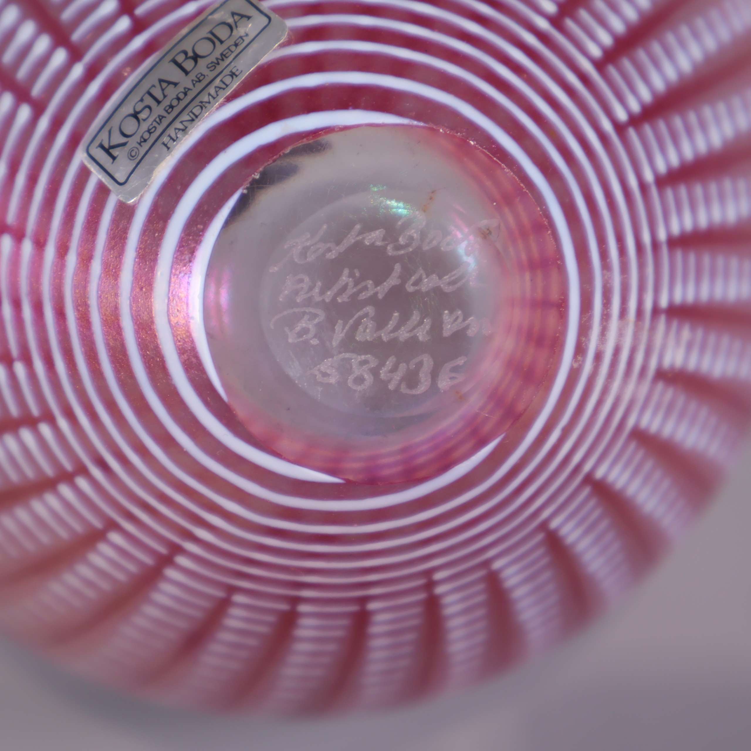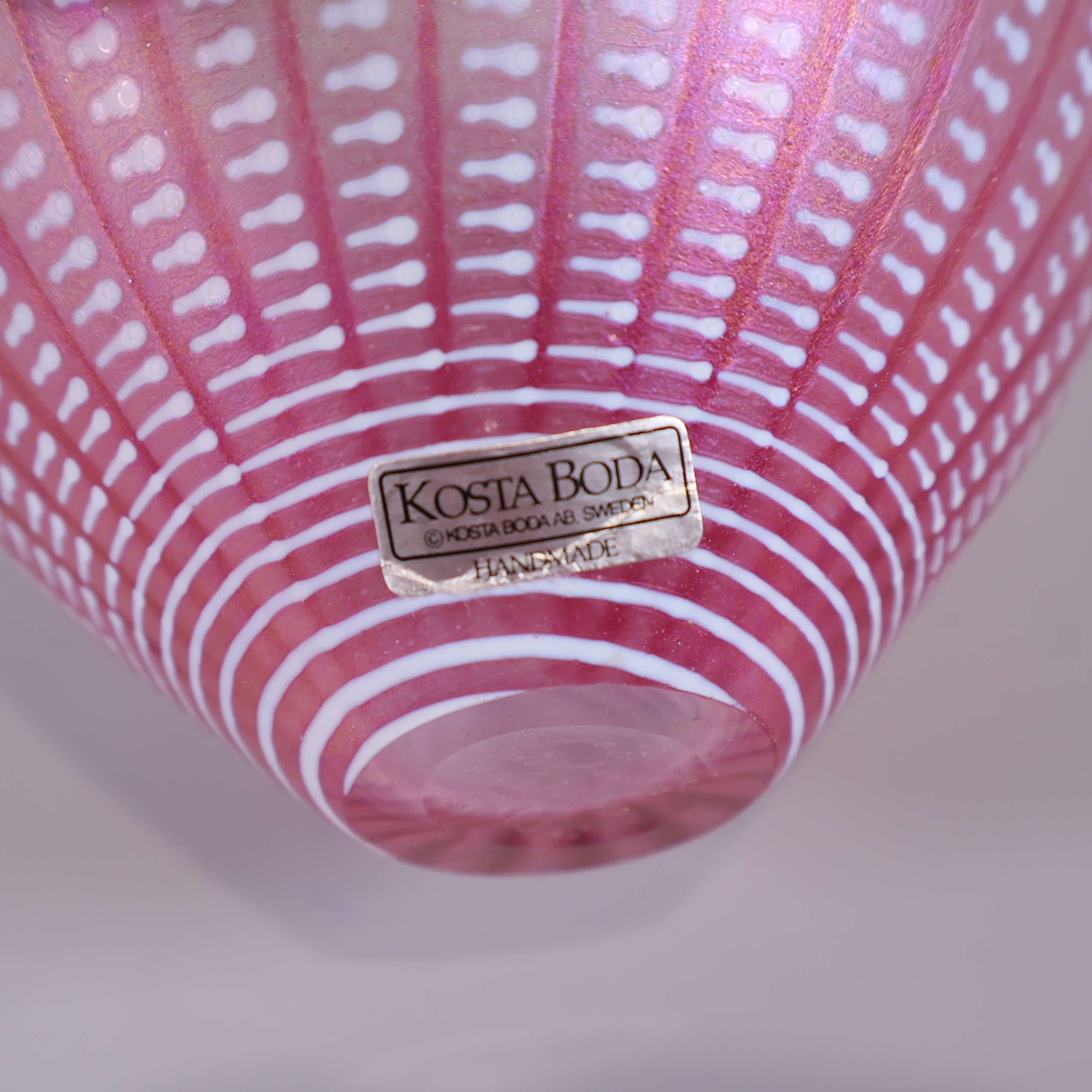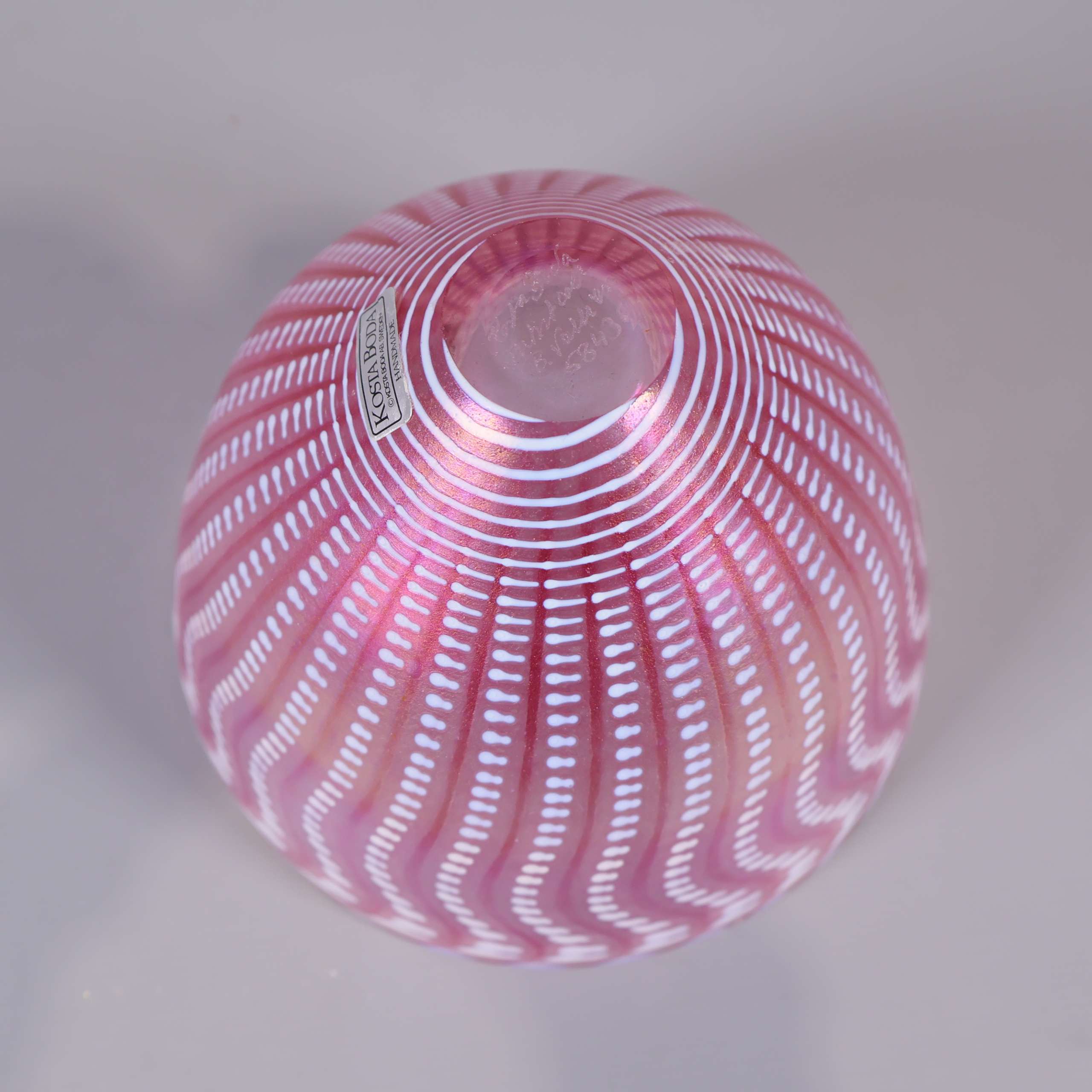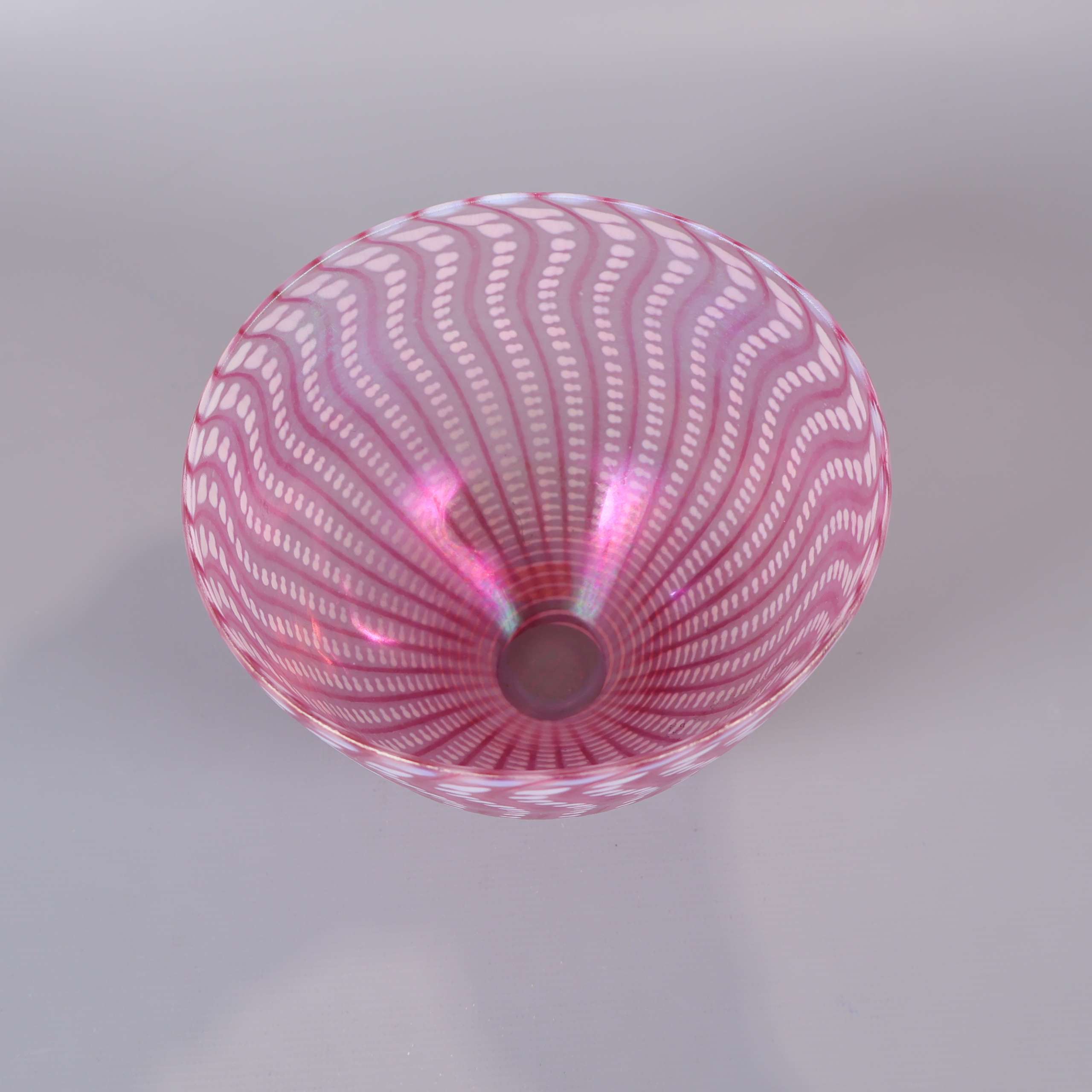Elegant skål i rosatonat glas med dekorativa vita vågformer runt hela ytan. Skålen har en glansig finish som reflekterar ljuset fint, och passar snyggt i både moderna och klassiska rum.