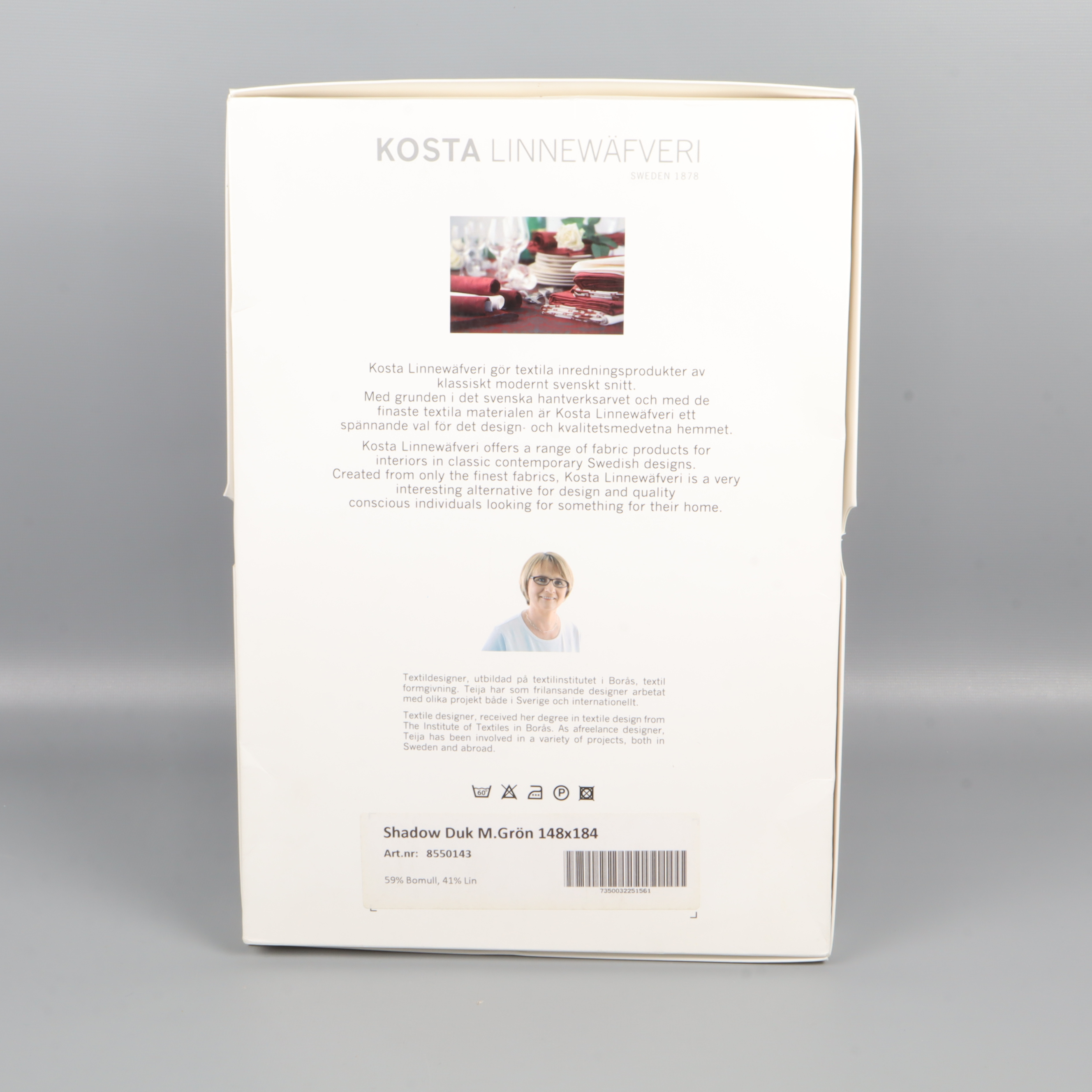 Kosta Linnewäfveri Kosta Linnewäfveri mörkgrön shadow duk 148*184 cm 199 kr Product variation Antal st Beskrivning Den här textilduken har ett elegant och diskret mönster i en djupgrön nyans, perfekt för dig som gillar en stilren och modern look. Materialet känns mjukt och ger bordet en klassisk touch som passar både vardag och fest. Visa all beskrivning Skick Nytt skick Produkten är som ny. Kan till och med ha orginalprislapp kvar eller ligga i originalförpackning. Läs mer om hur vi bedömer Dimensions 148*184cm Färg Mörkgrön Material Bomull Varumärke Kosta Linnewäfveri Produkten är unik och finns enbart som 1 st i lager. Fri frakt på alla köp över 990 kr. 14 dagars ångerrät.