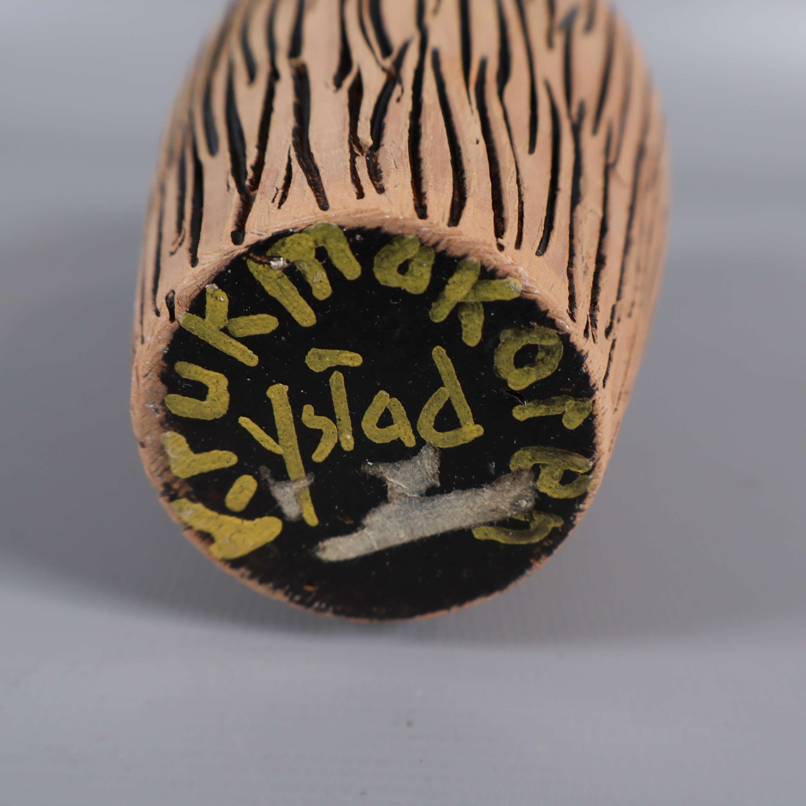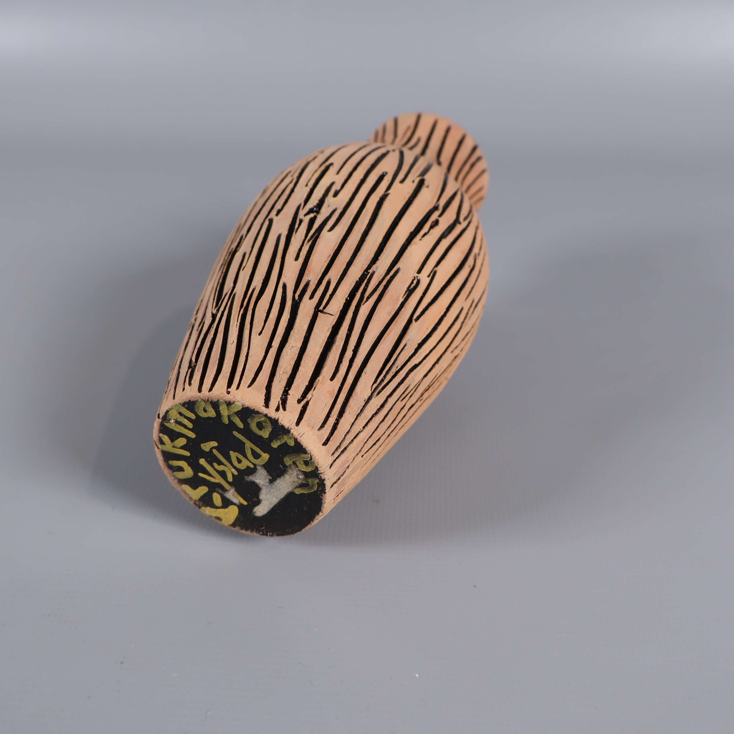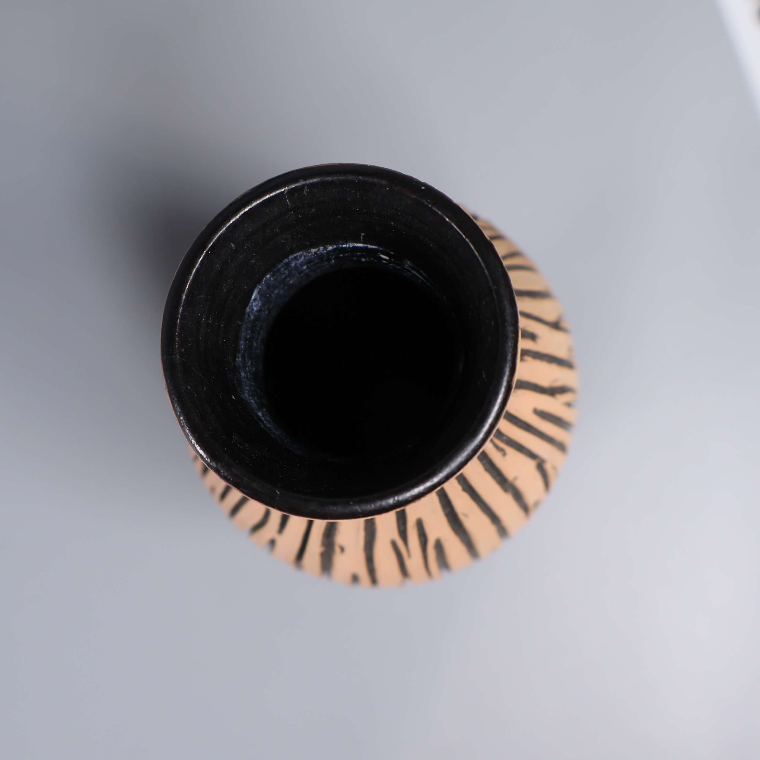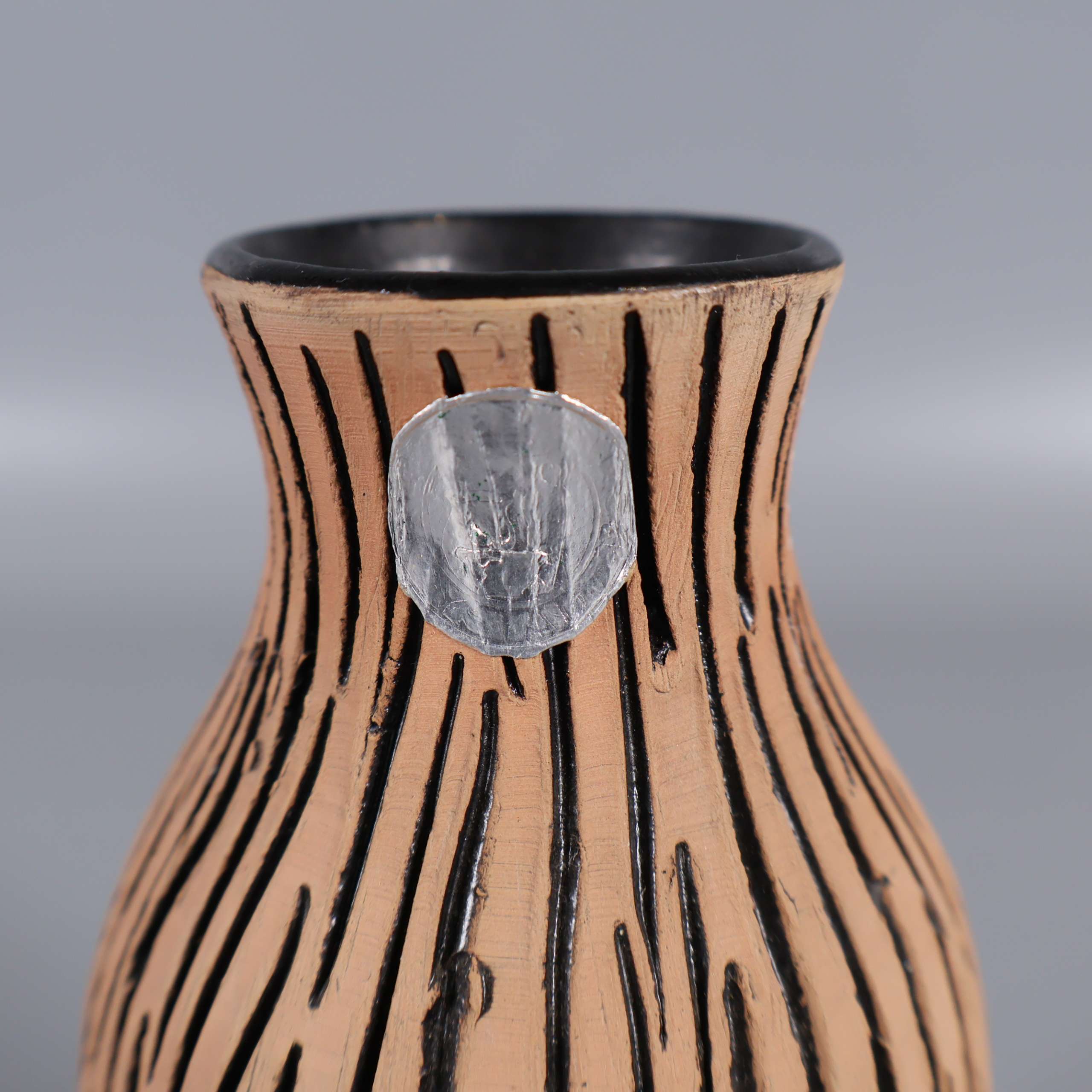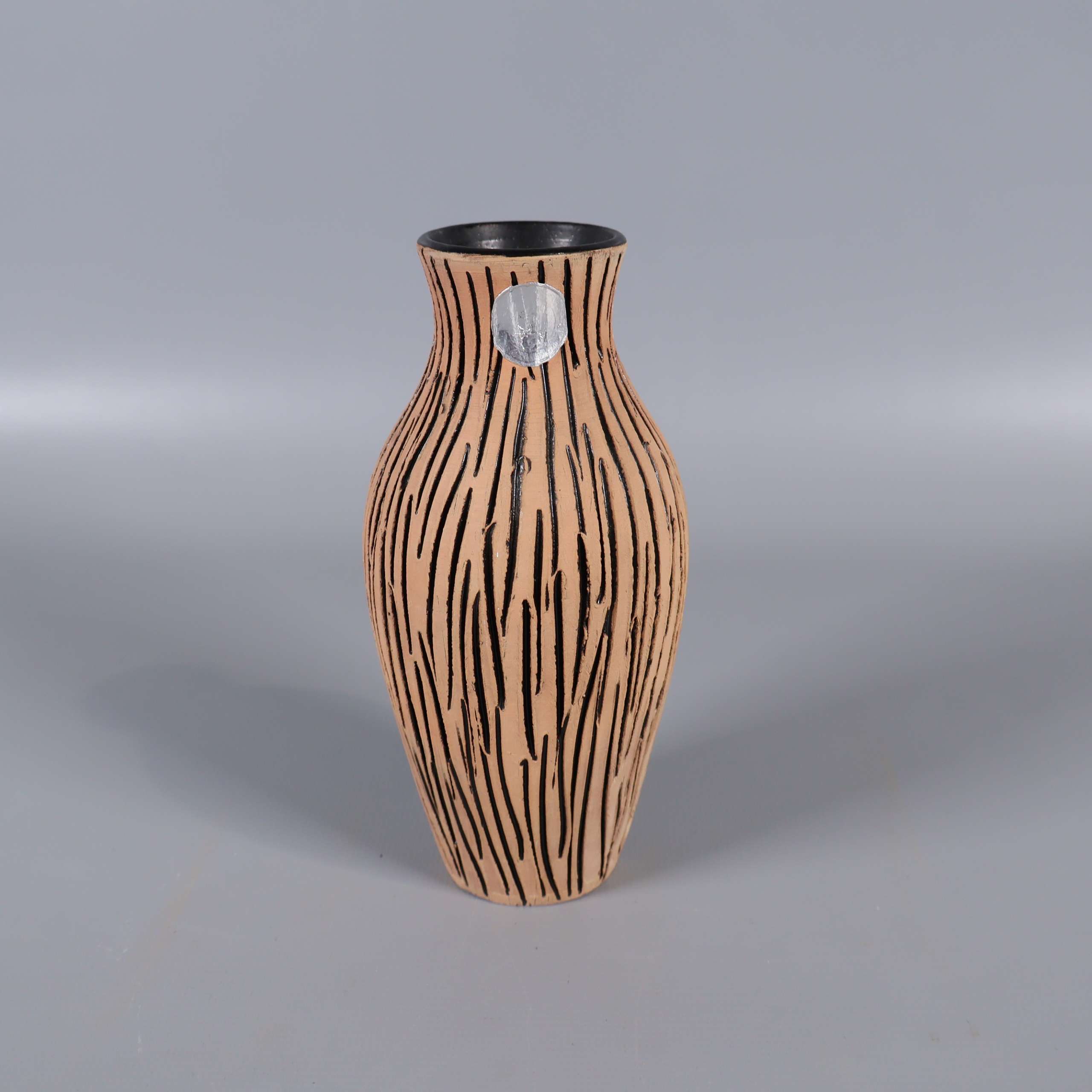Vas med unik organisk form och handmålat, grafiskt mönster i svart på beige botten. Matt utsida och glaserad svart insida ger en modern känsla med retroinspirerade detaljer. Smal hals passar snyggt till mindre buketter eller solitärer, och vasen blir verkligen ett blickfång.