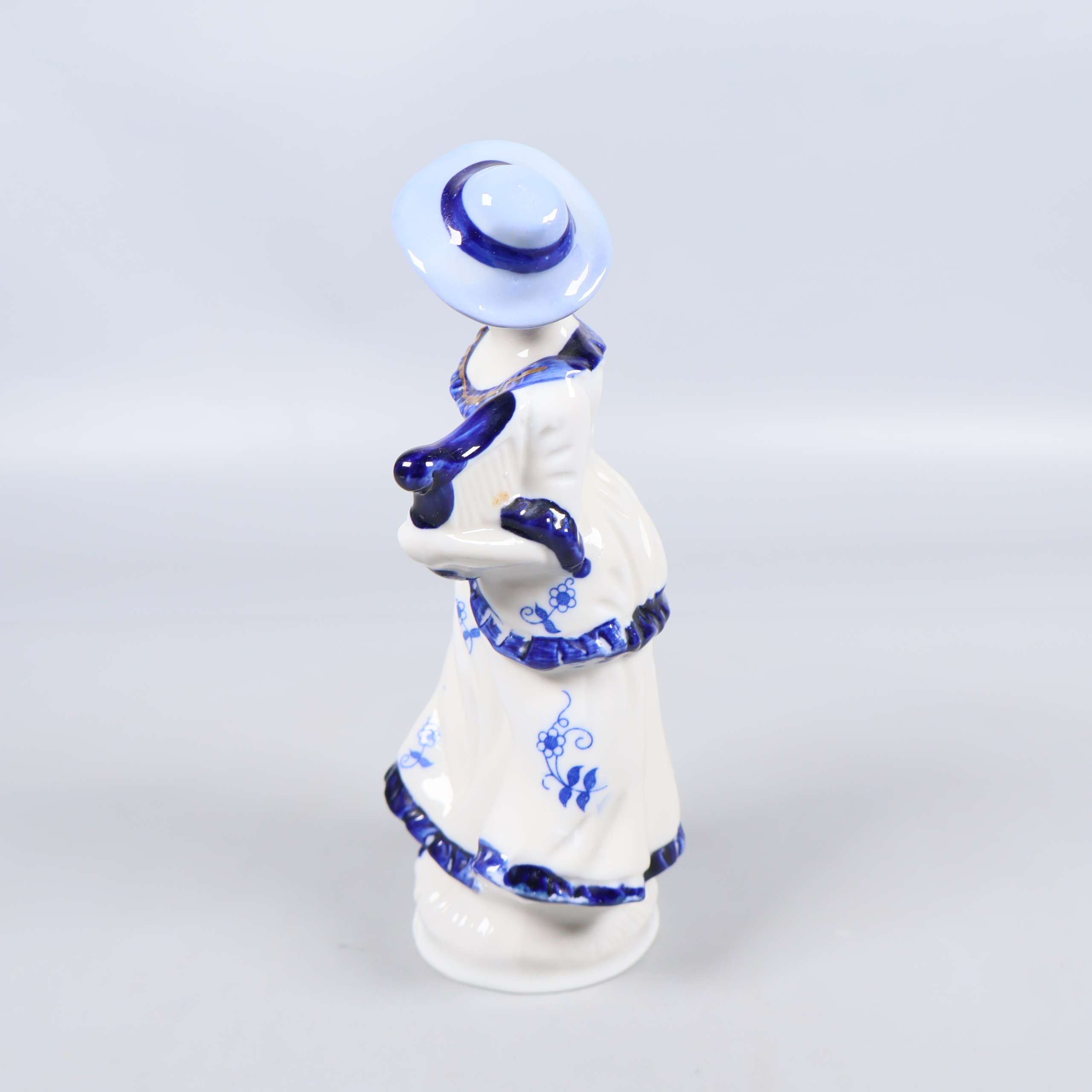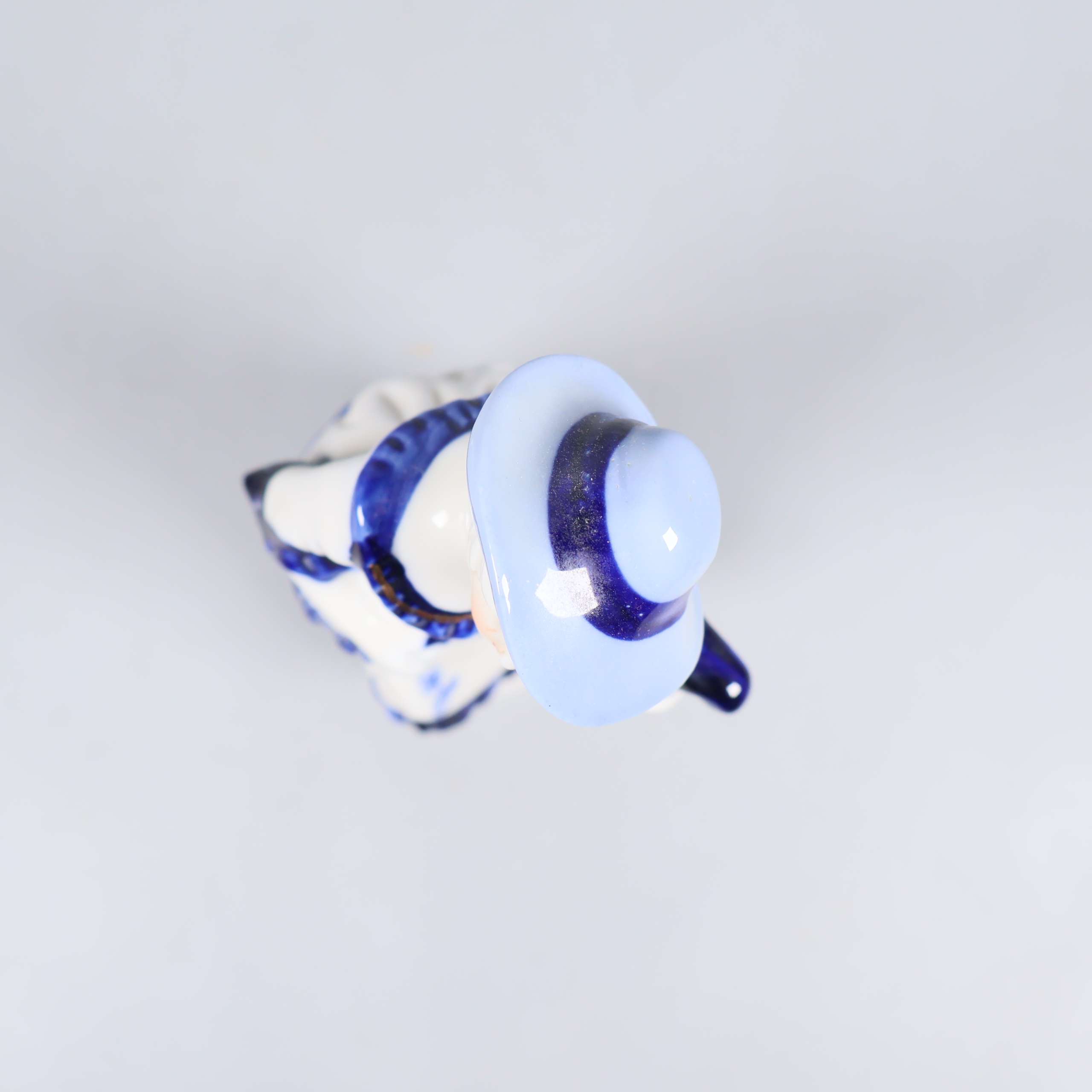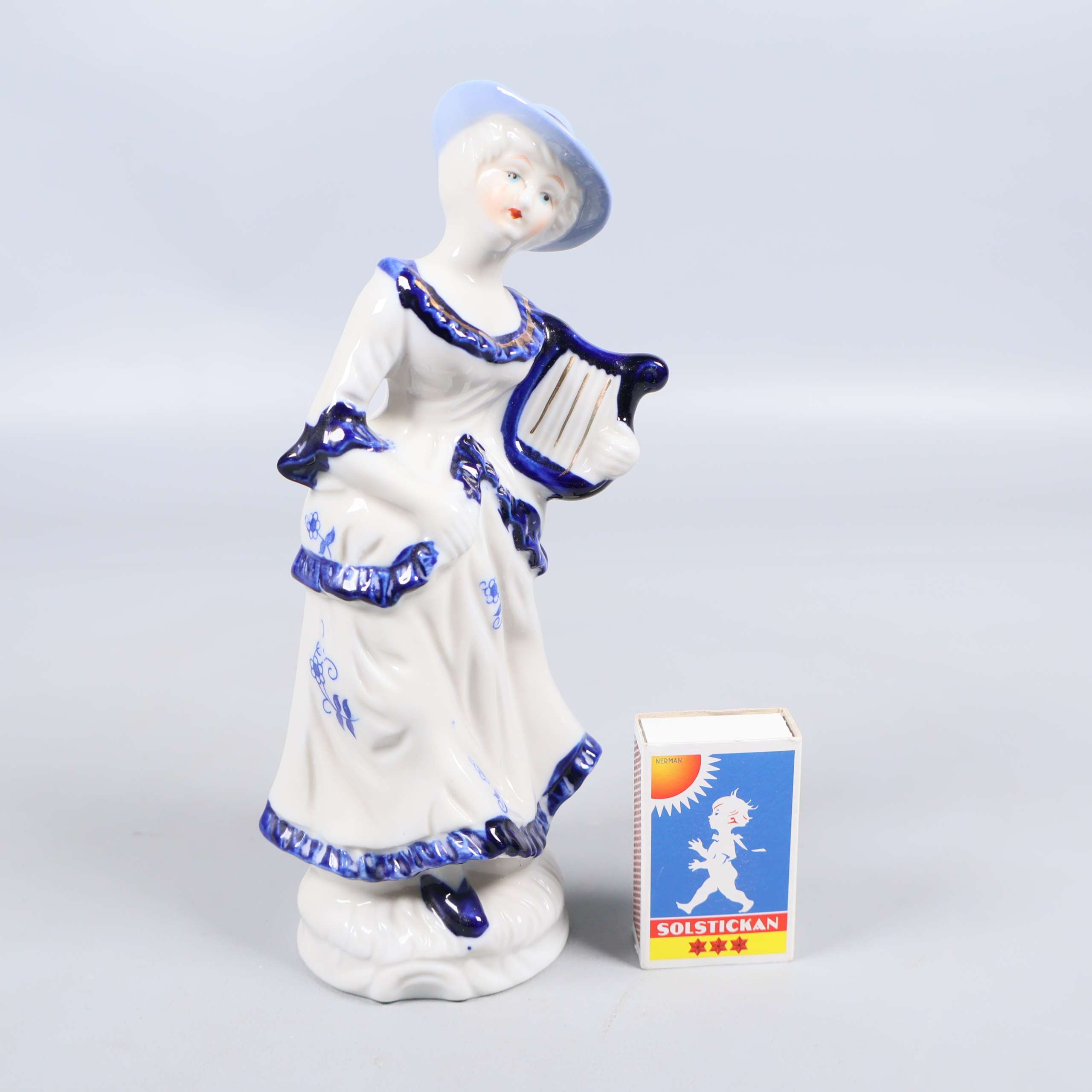 Elegant porslinsfigur föreställande person i historisk dräkt med mjuka blå och vita detaljer samt hatt. Klassisk och dekorativ design som ger en vintage vibe till hemmet, perfekt som samlarföremål eller personlig inredningsdetalj.
