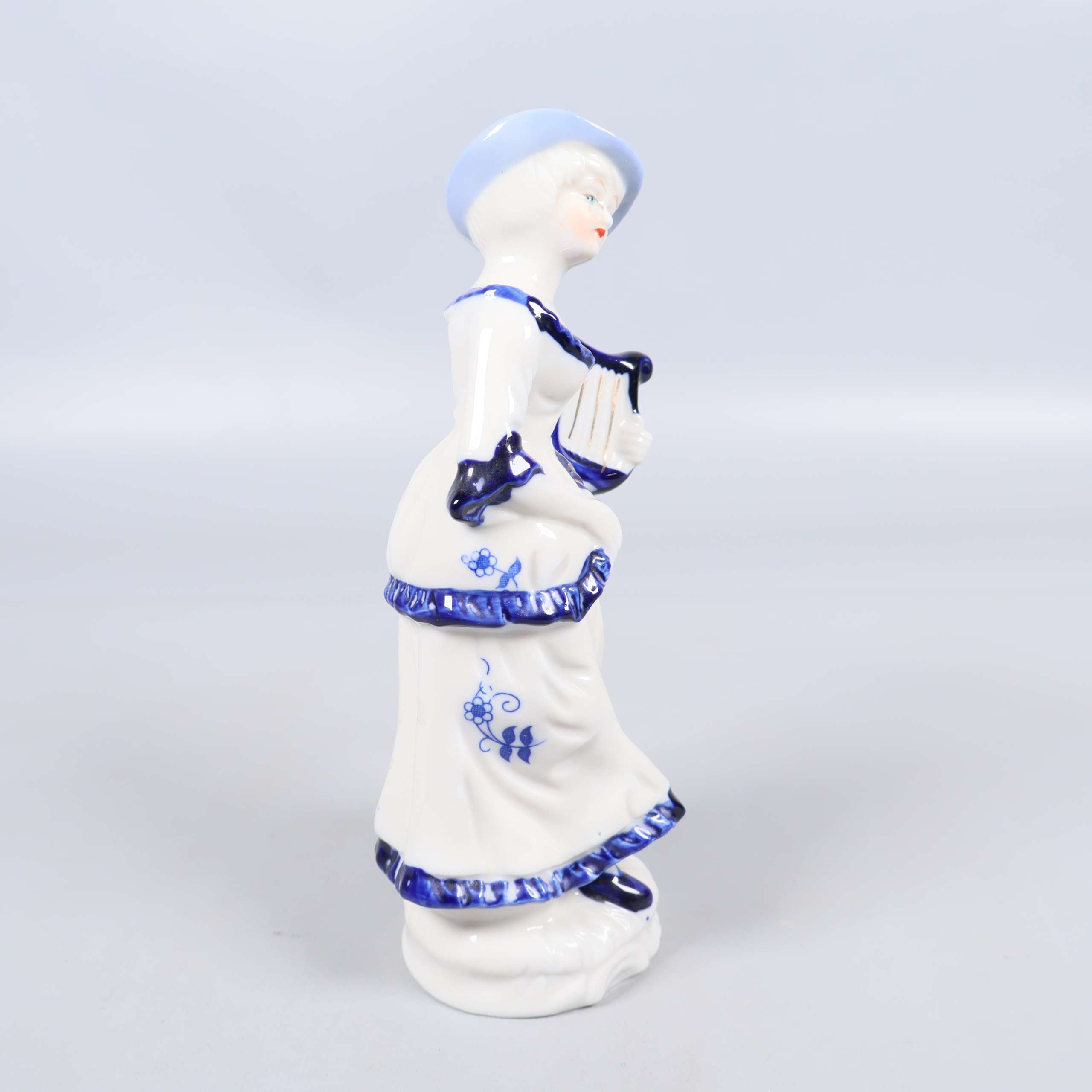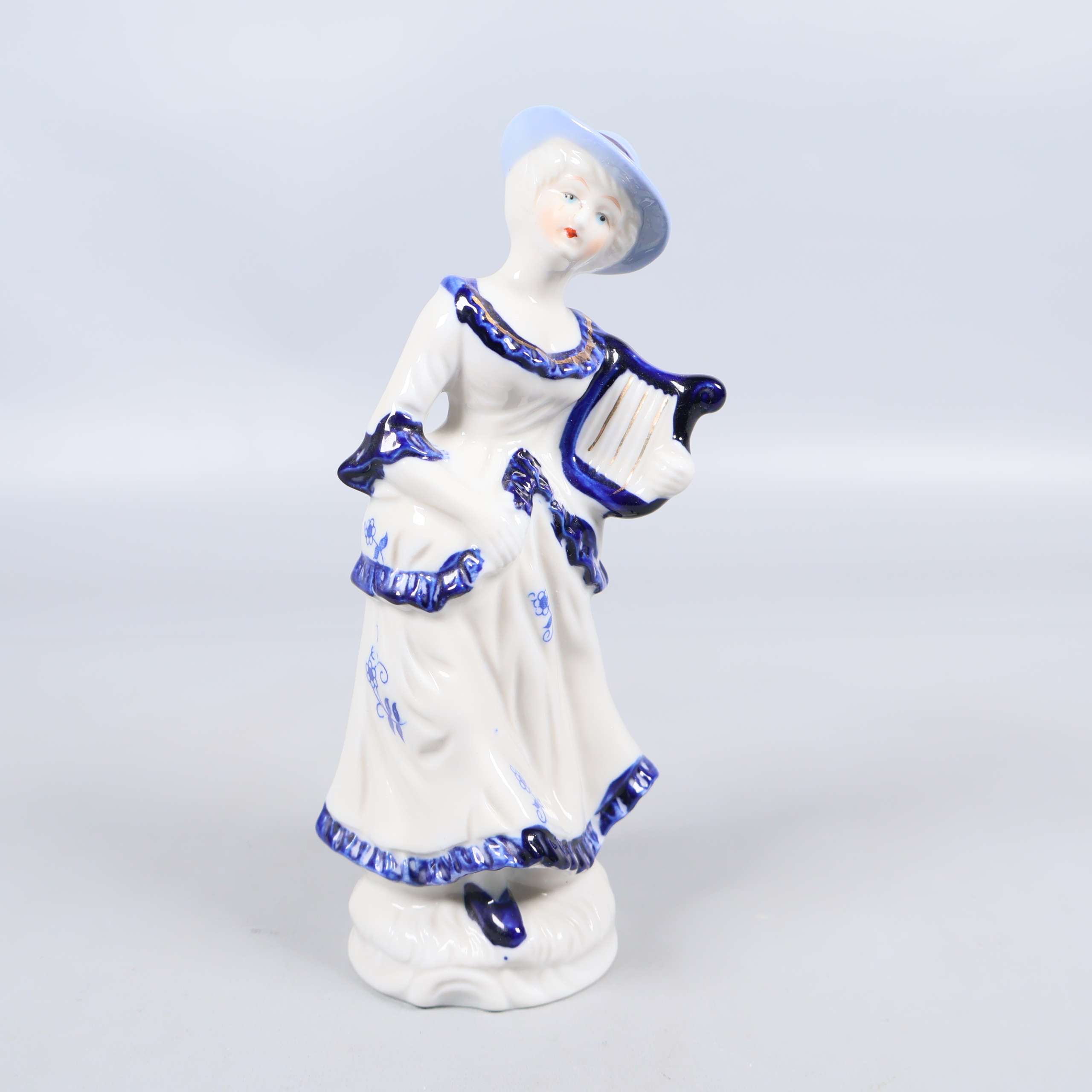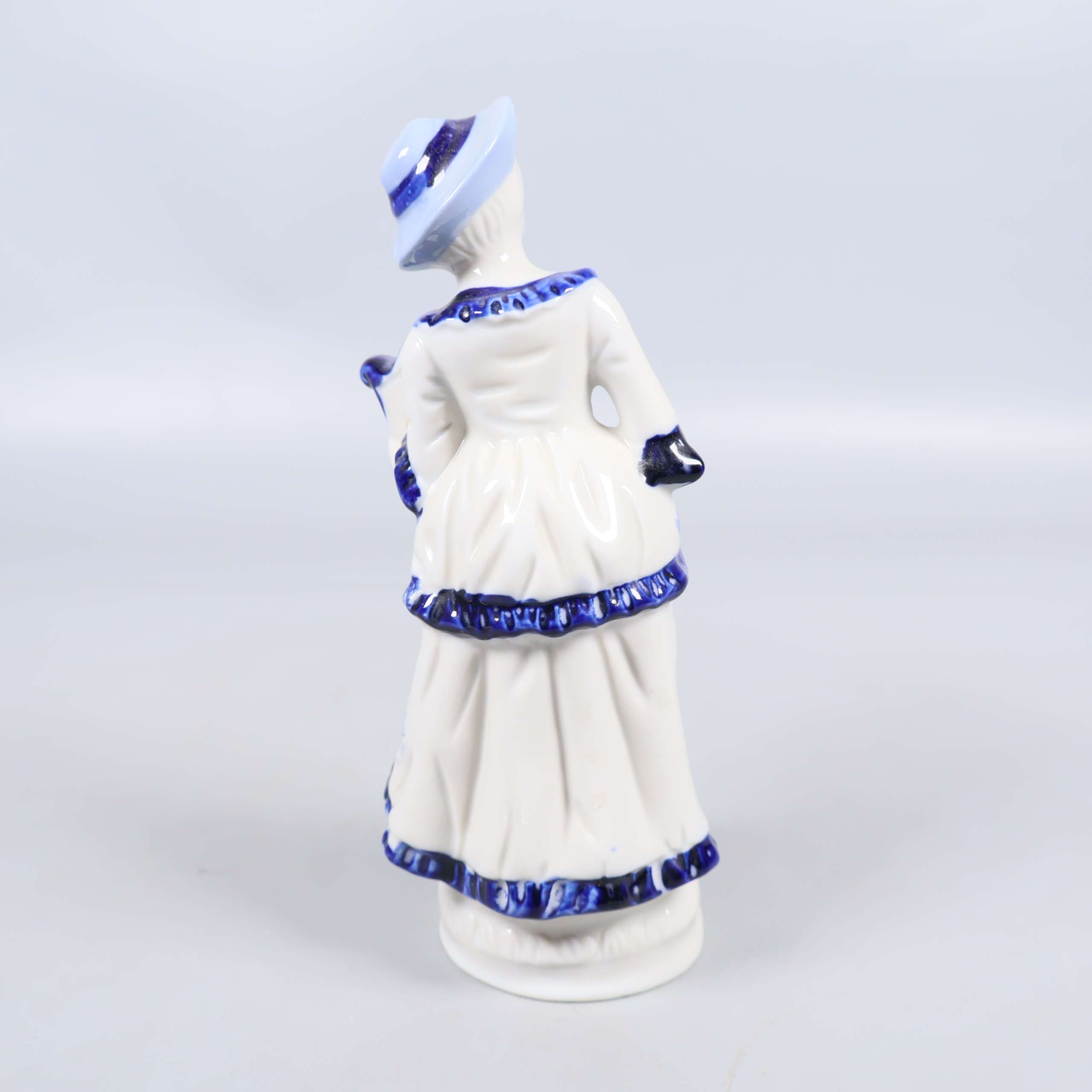 Elegant porslinsfigur föreställande person i historisk dräkt med mjuka blå och vita detaljer samt hatt. Klassisk och dekorativ design som ger en vintage vibe till hemmet, perfekt som samlarföremål eller personlig inredningsdetalj.
