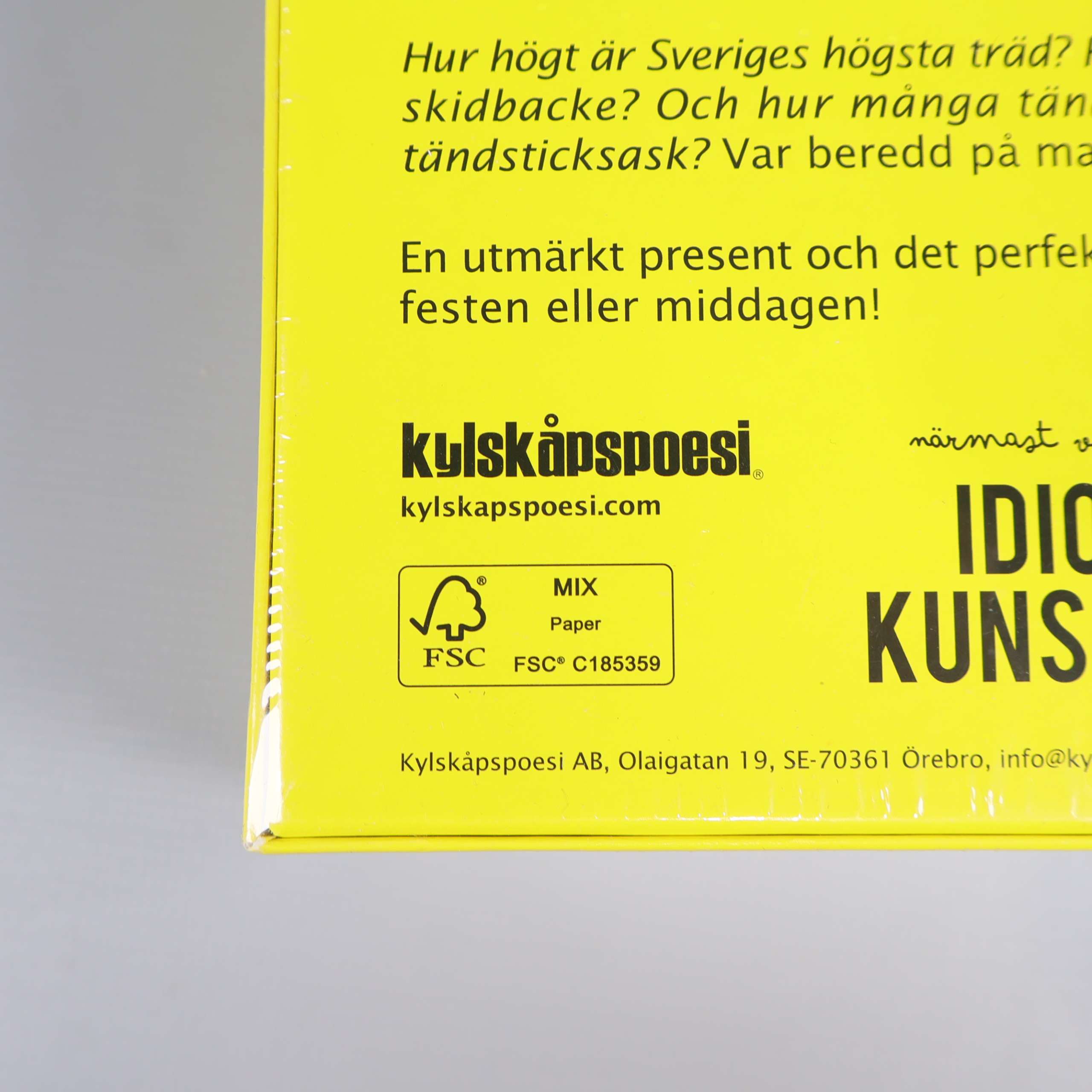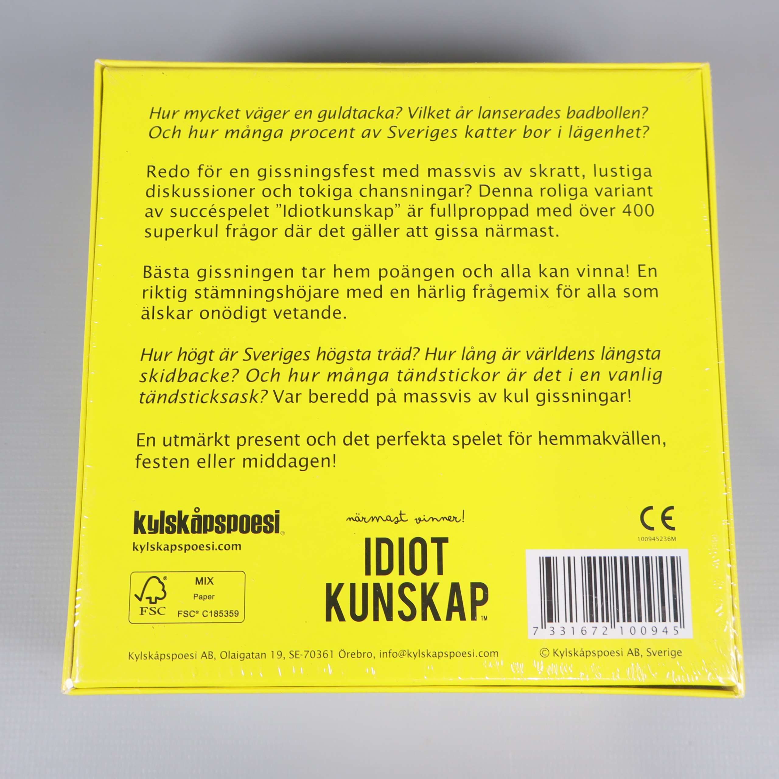 Ett sällskapsspel fyllt med galna, oväntade och underhållande frågor. Lådan har ett stilrent, klargult utseende och snygg svart text på både fram- och baksida. Spelet ”Idiotkunskap” bjuder på skratt och märkliga gissningar – perfekt för spelkvällar och middagsbjudningar. Kompakt boxdesign med enkel access och modern look.