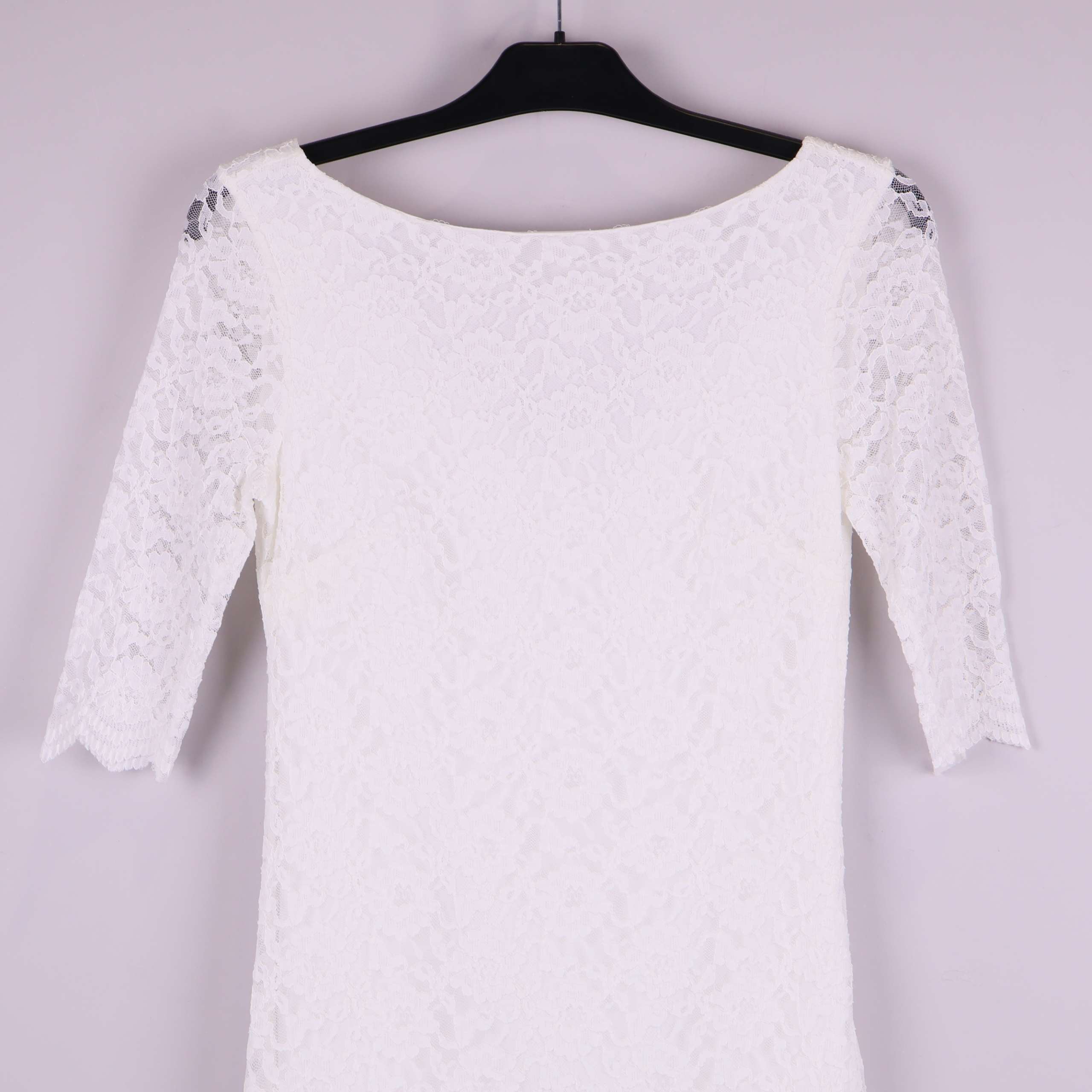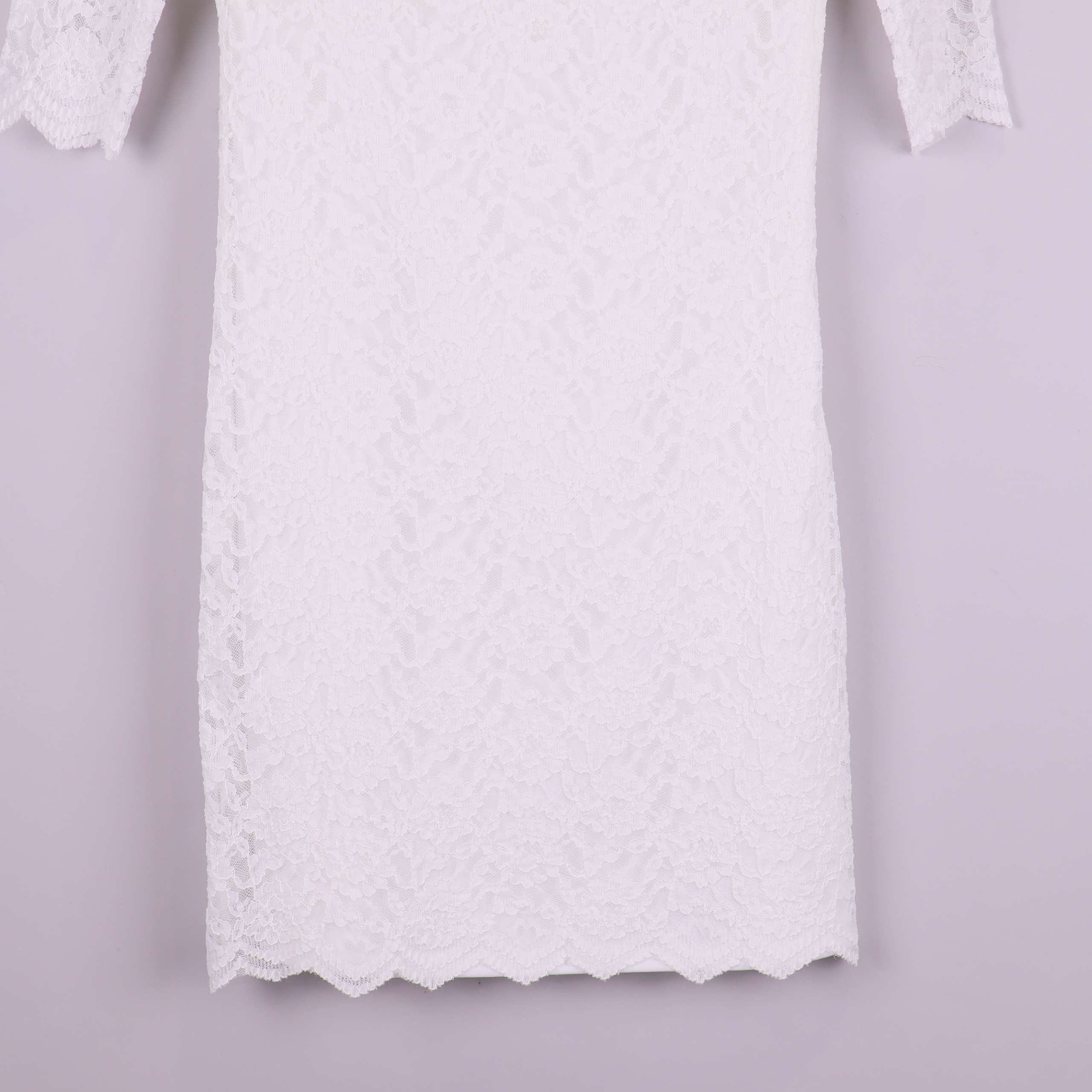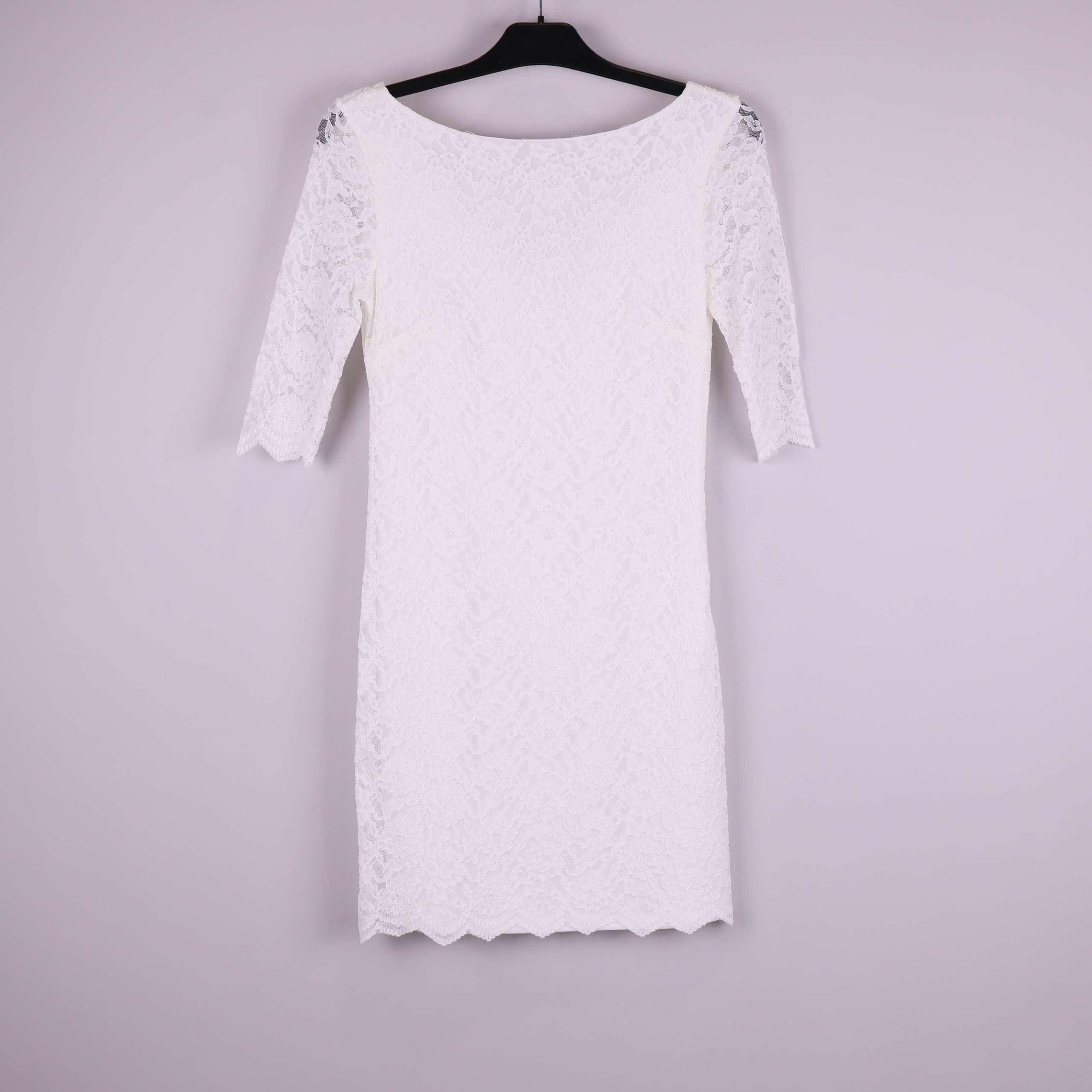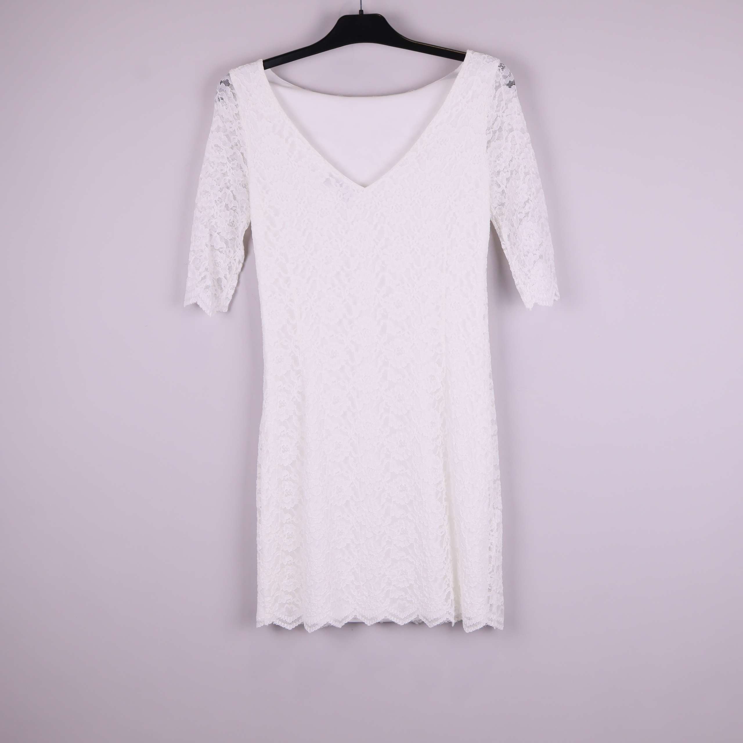 Stilren spetsklänning i vitt med halvärmade ärmar och V-ringning baktill. Klänningen har ett elegant spetsmönster och mjuk, enfärgad insida för extra komfort. Avsluten med vågad kant nertill som ger plagget en modern touch. Perfekt för dig som gillar tidlös design med lite extra twist.