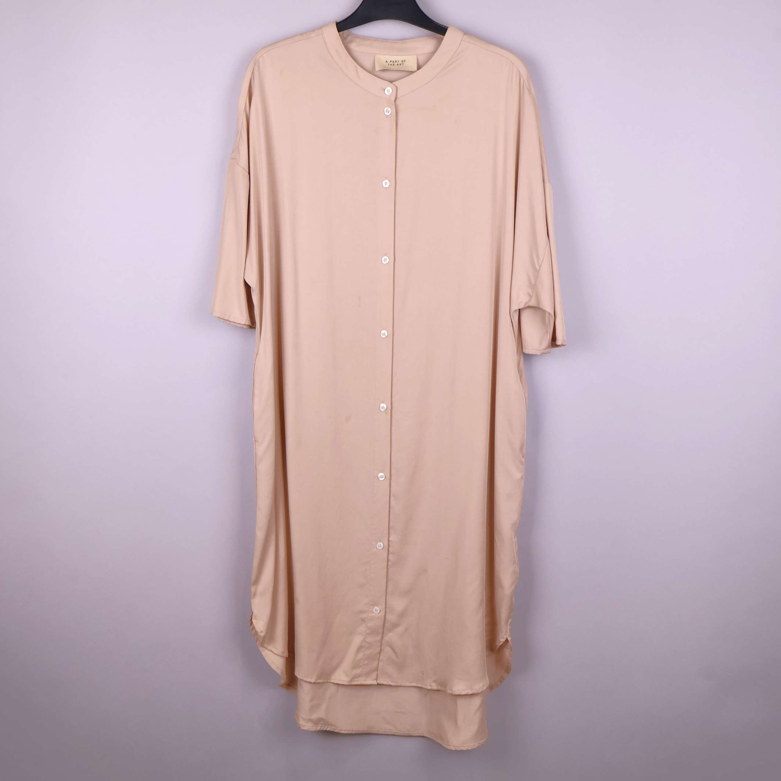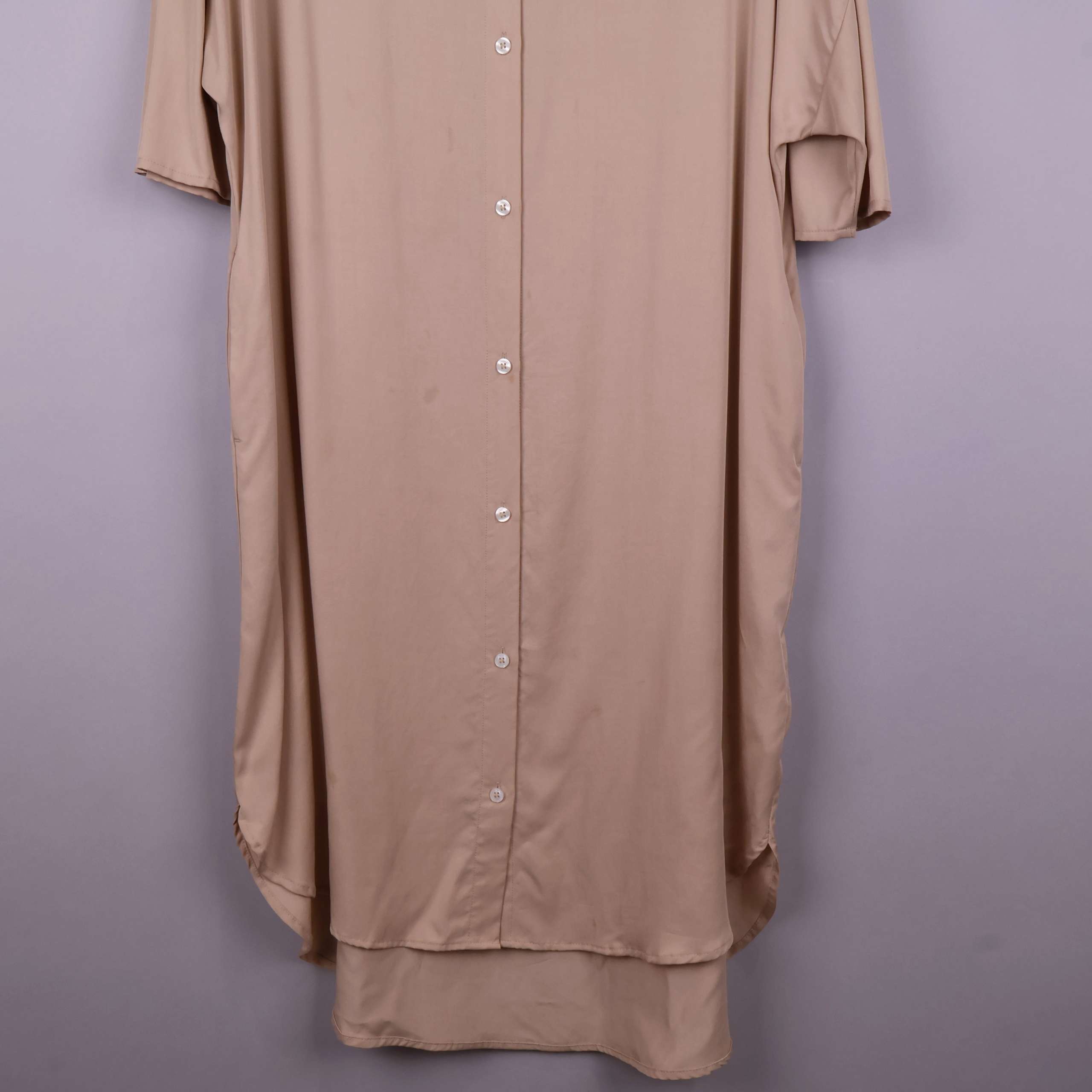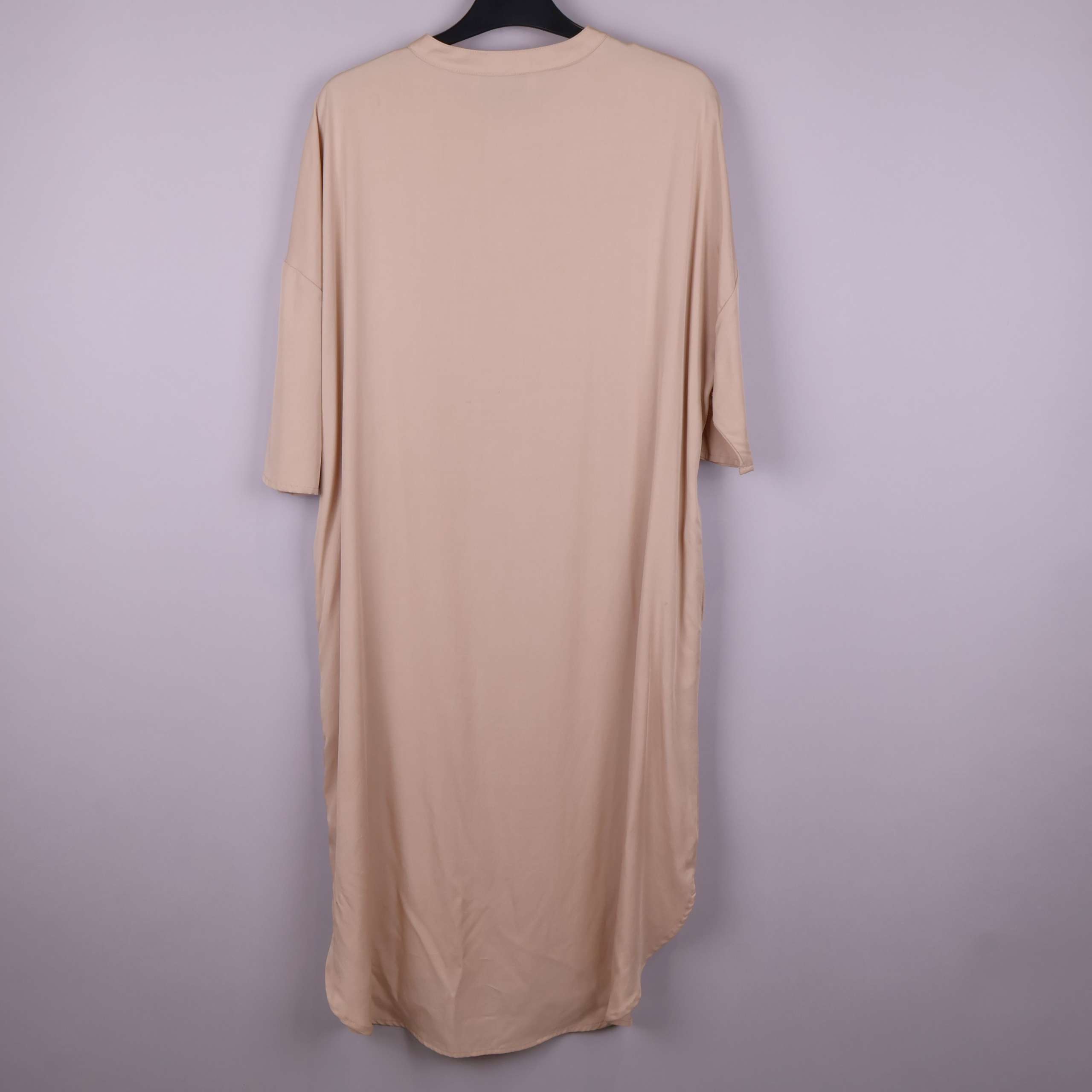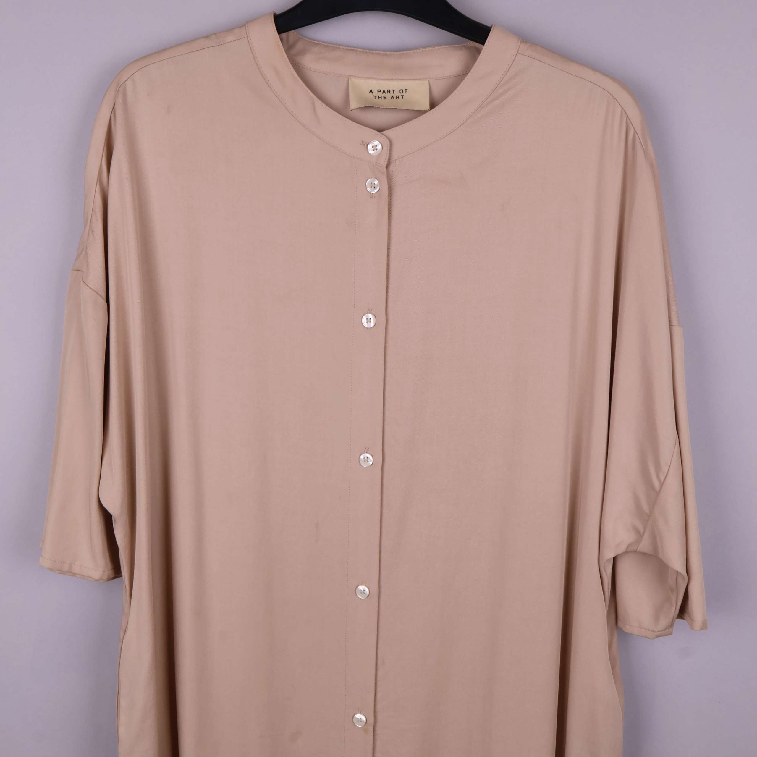 En stilren lång skjorta i en varm beige ton med knappstängning framtill. Lös passform med korta ärmar och rund halsringning.
