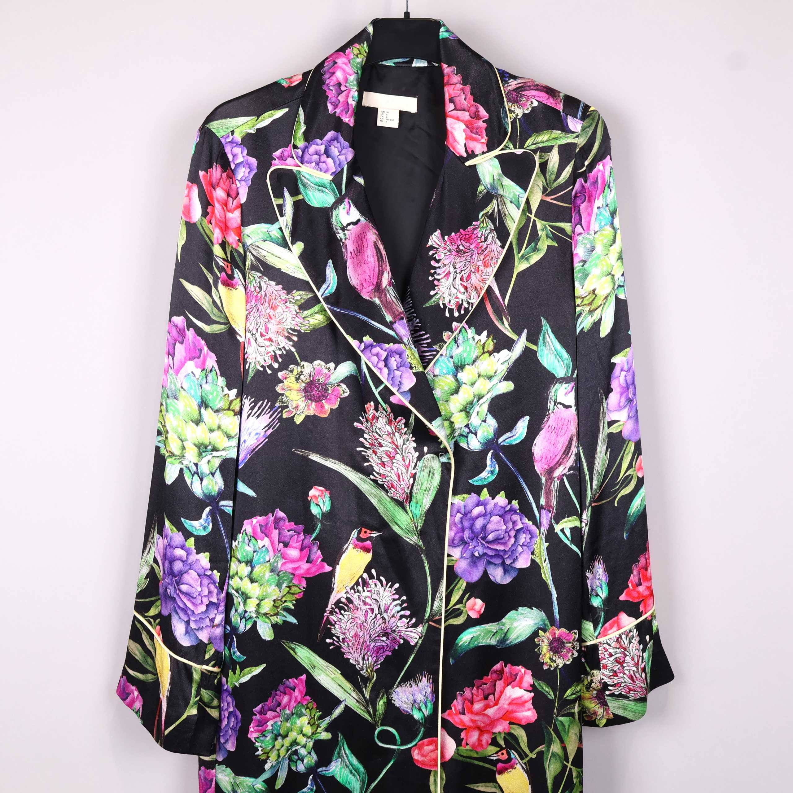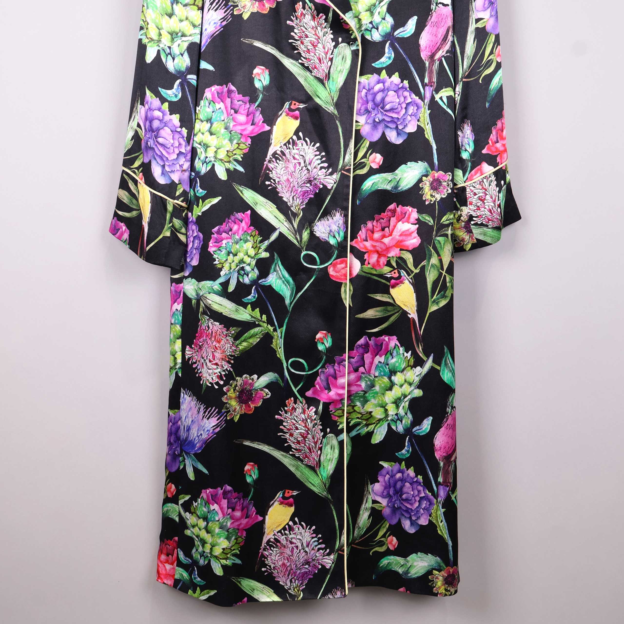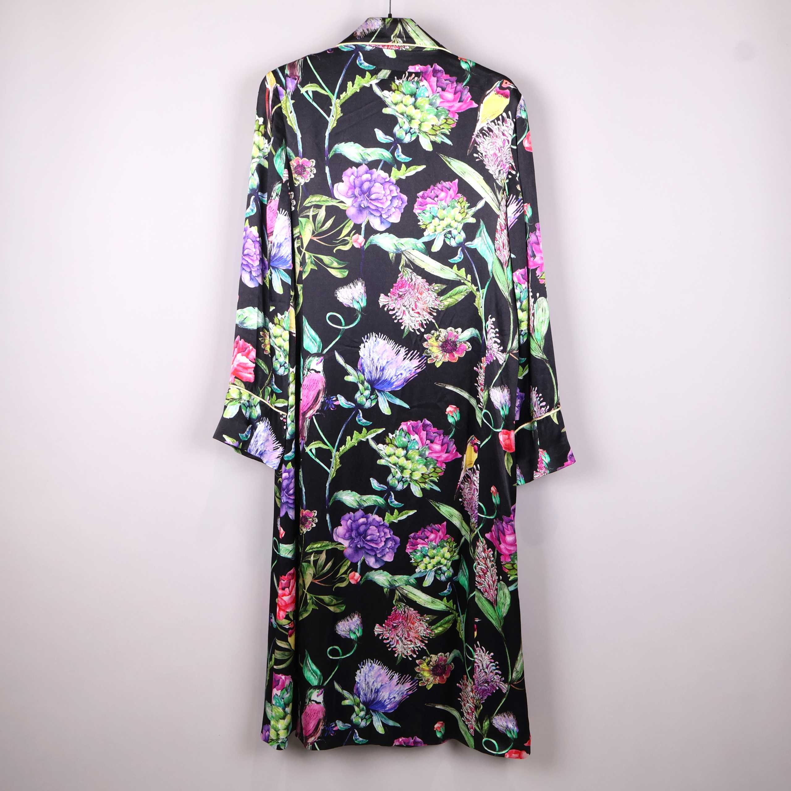 Denna fantastiska kappa har ett blommigt mönster som fångar ögat. Dess långa design med knappstängning ger en elegant silhuett.