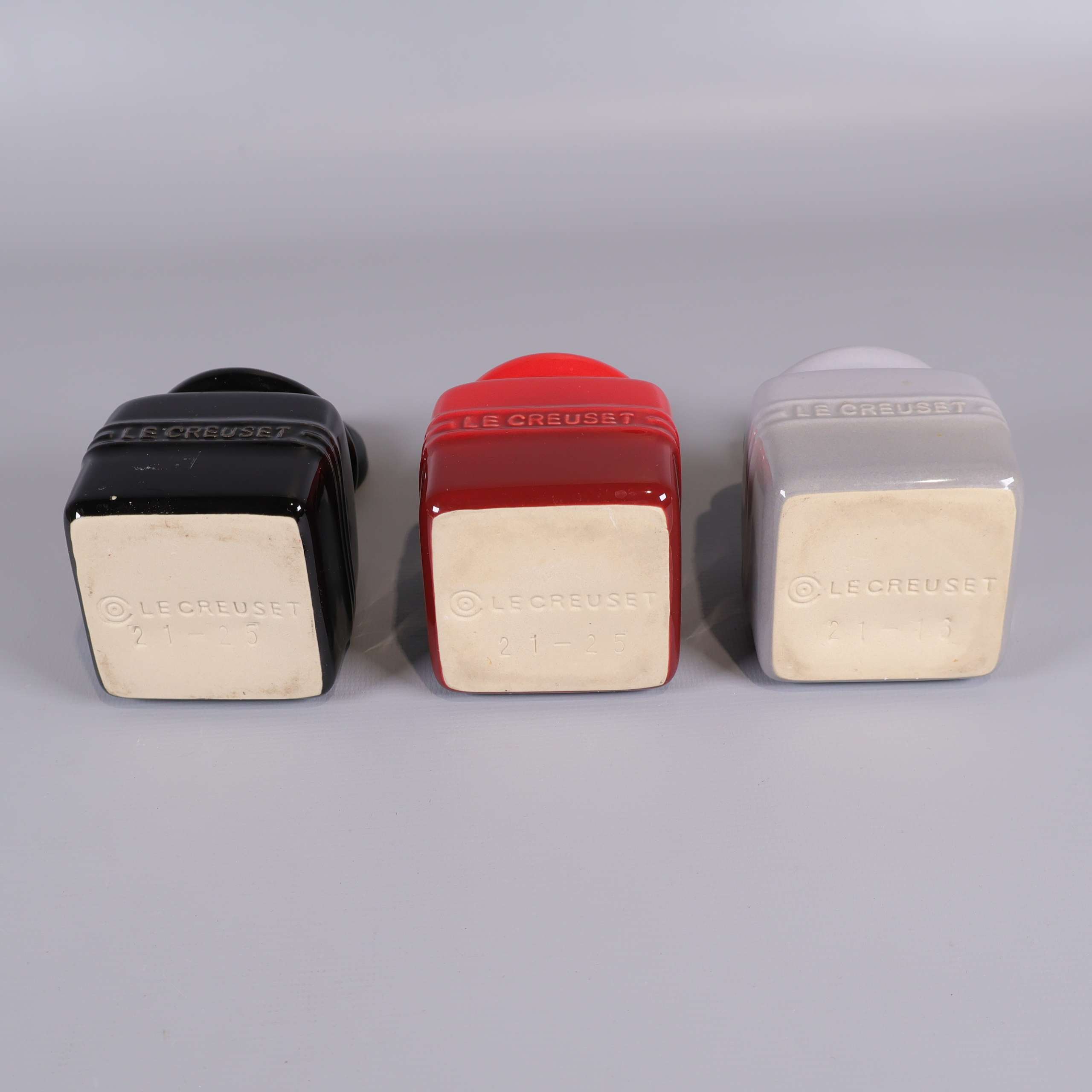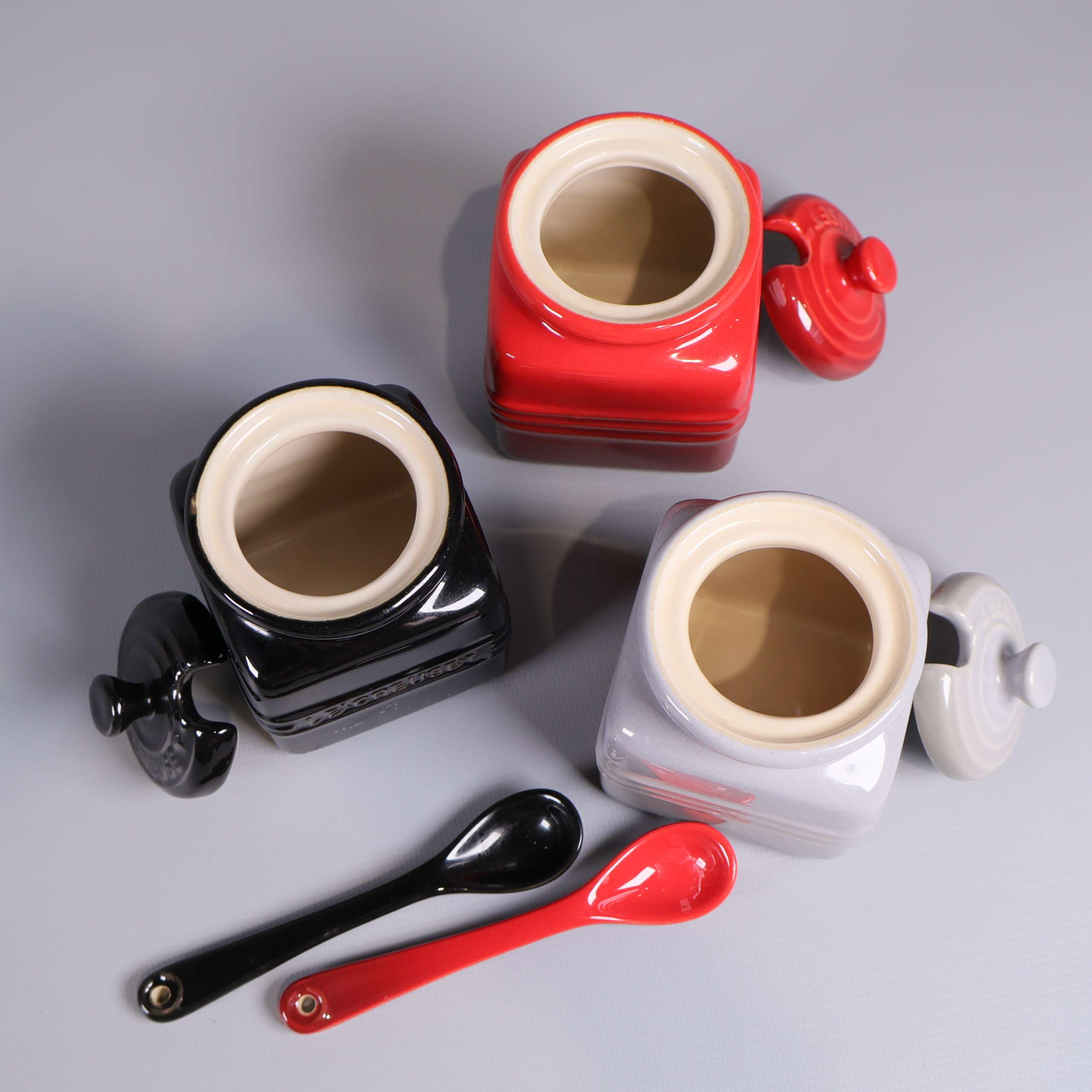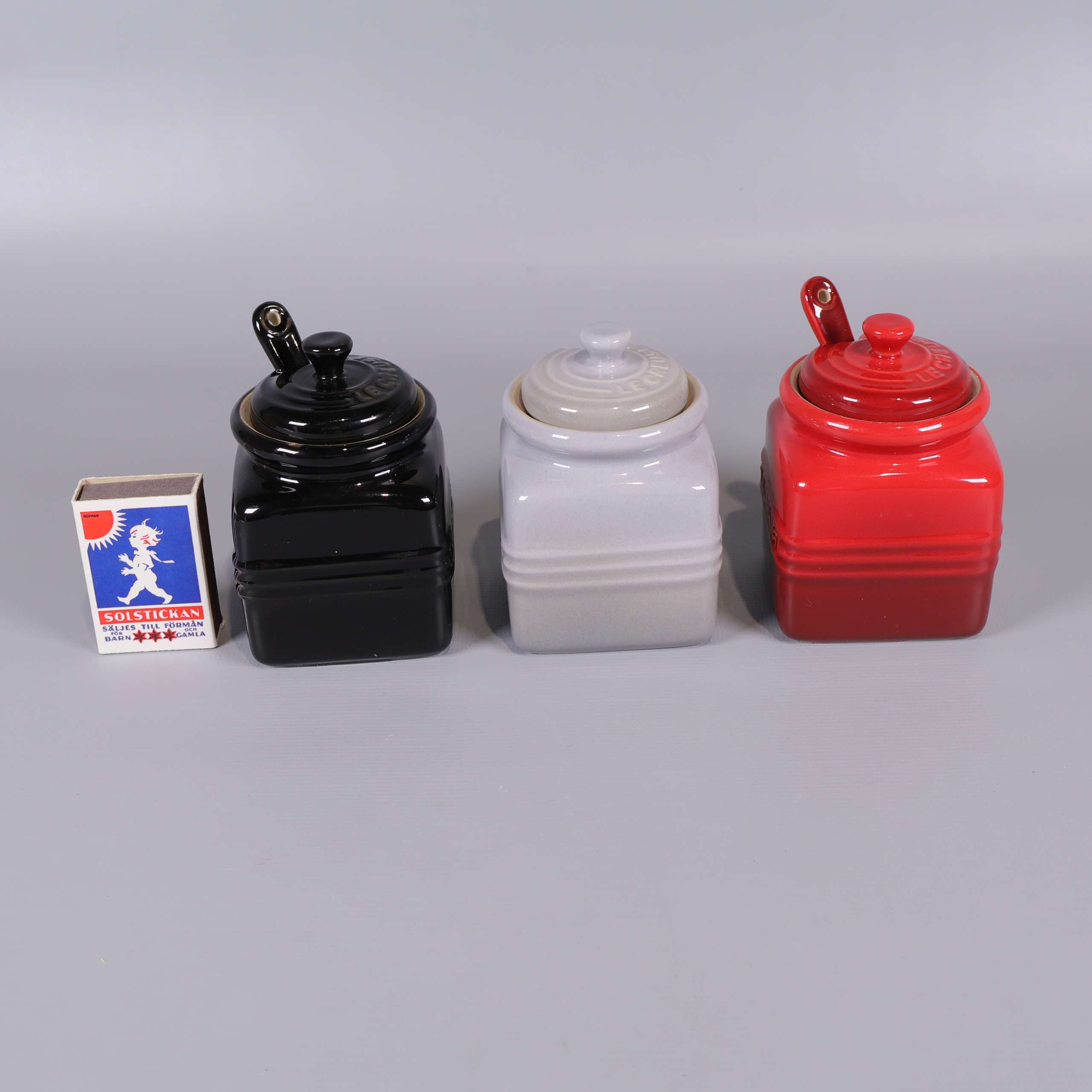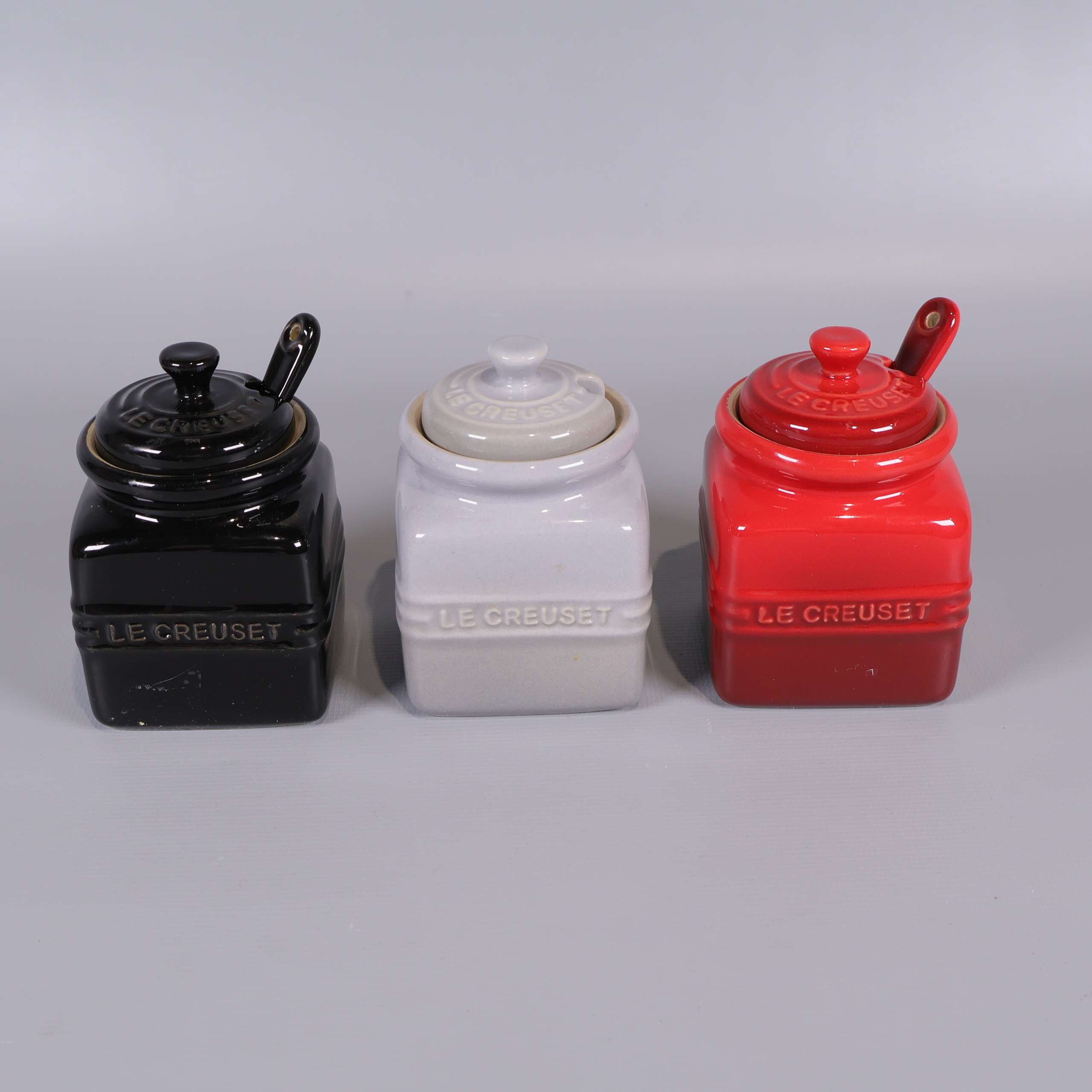 Tre små kvadratiska burkar med lock och sked i glansig finish, stilrena i svart, vitt och rött. Passar perfekt för kök eller servering. Elegant, rundat formspråk och detaljer med Le Creuset-logotyp. Robust känsla och klassisk design med smooth touch.