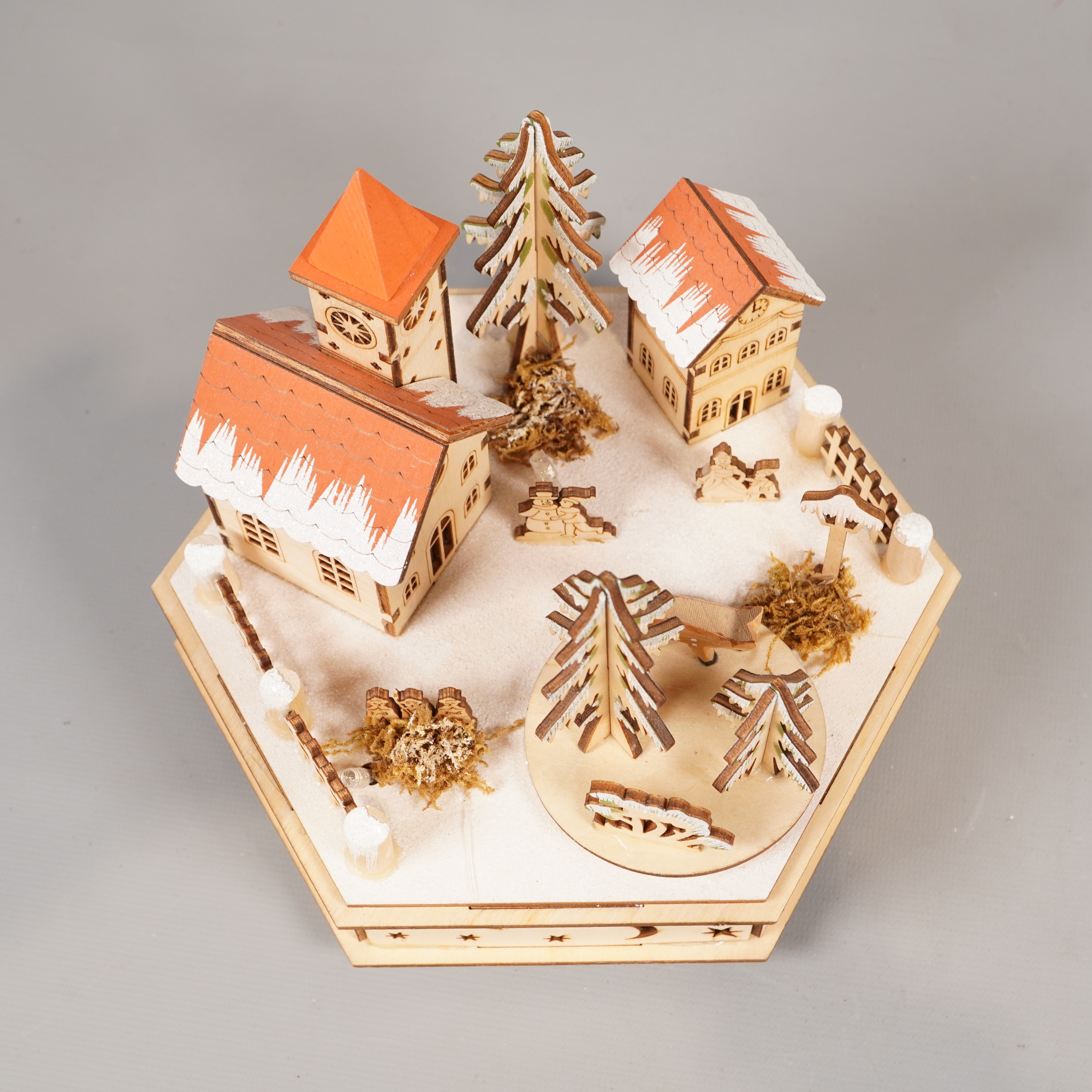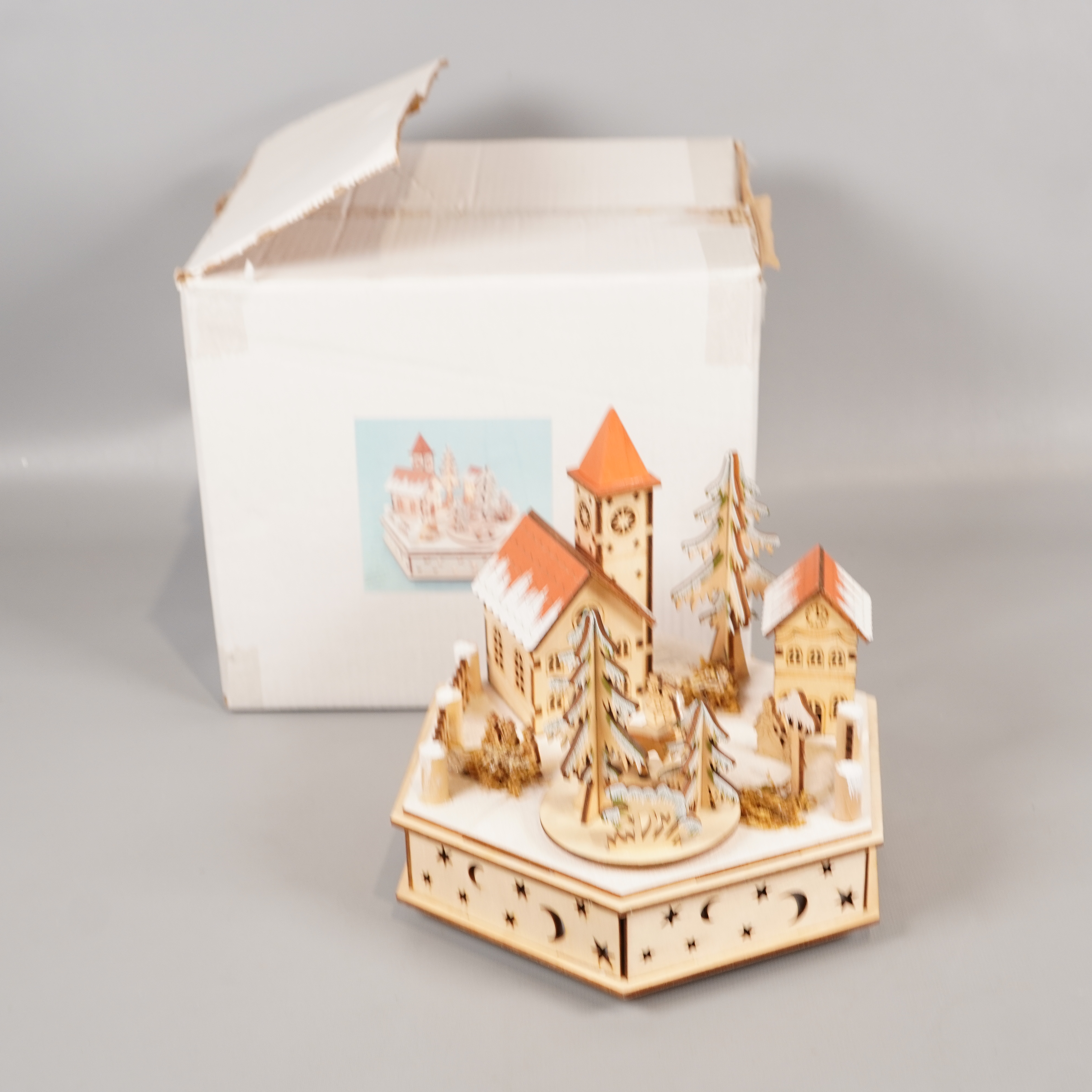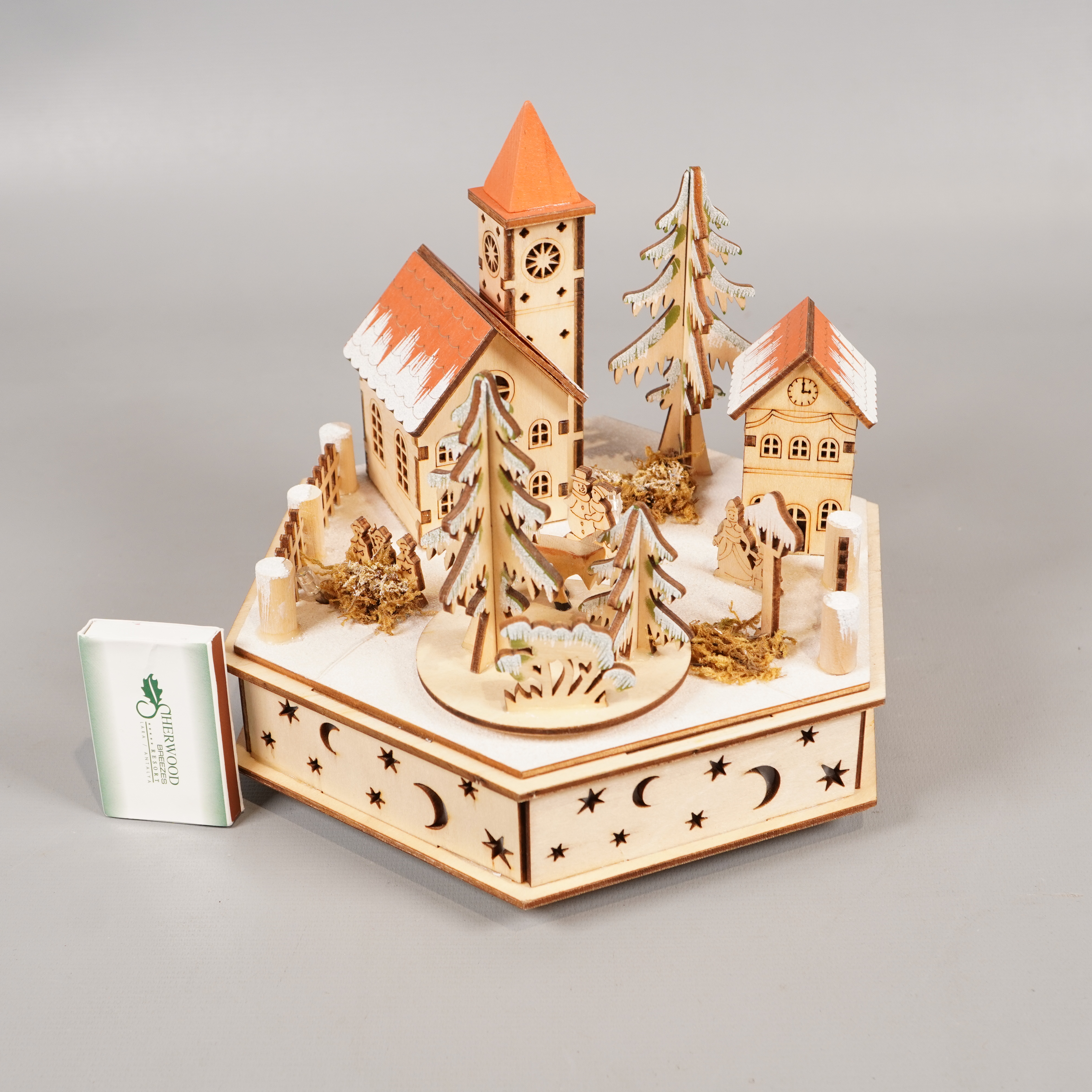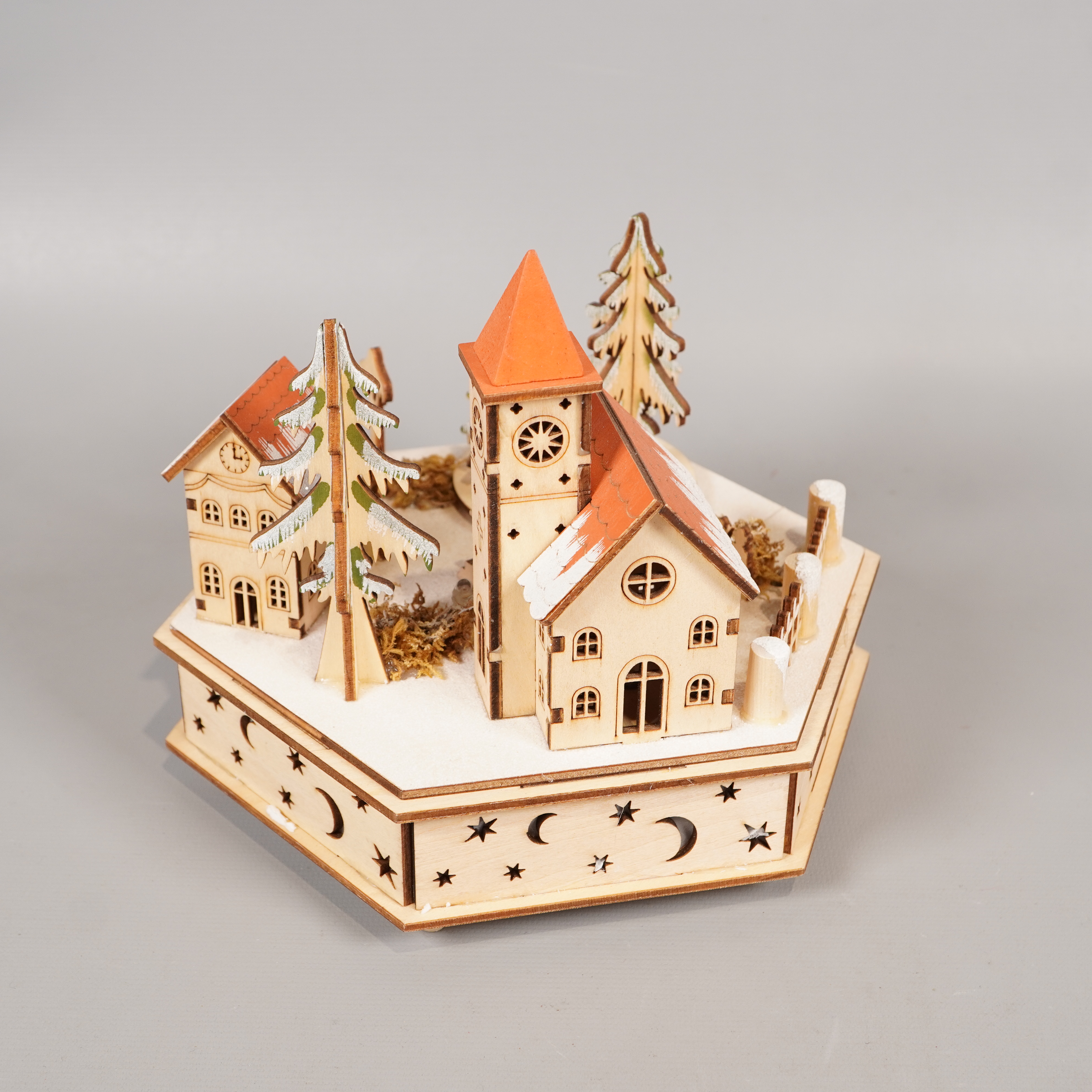 Okänt märke Led juldekoration i trä med musik 299 kr Product variation Antal st Beskrivning Stämningsfull juldekoration i ljust trä med utskurna stjärnor och månar, detaljerade hus och granar samt röda tak. Basen är sexkantig och inbyggd med musikfunktion som spelar en klassisk jullåt. Visa all beskrivning Skick Gott skick Produkten har använts men är av fin kvalitet och ska inte ha några skador eller förslitningar. Läs mer om hur vi bedömer Dimensions Höjd: ca 18.5 cm, Längd: ca 20 cm Material Trä Varumärke Okänt märke Produkten är unik och finns enbart som 1 st i lager. Fri frakt på alla köp över 990 kr. 14 dagars ångerrät.