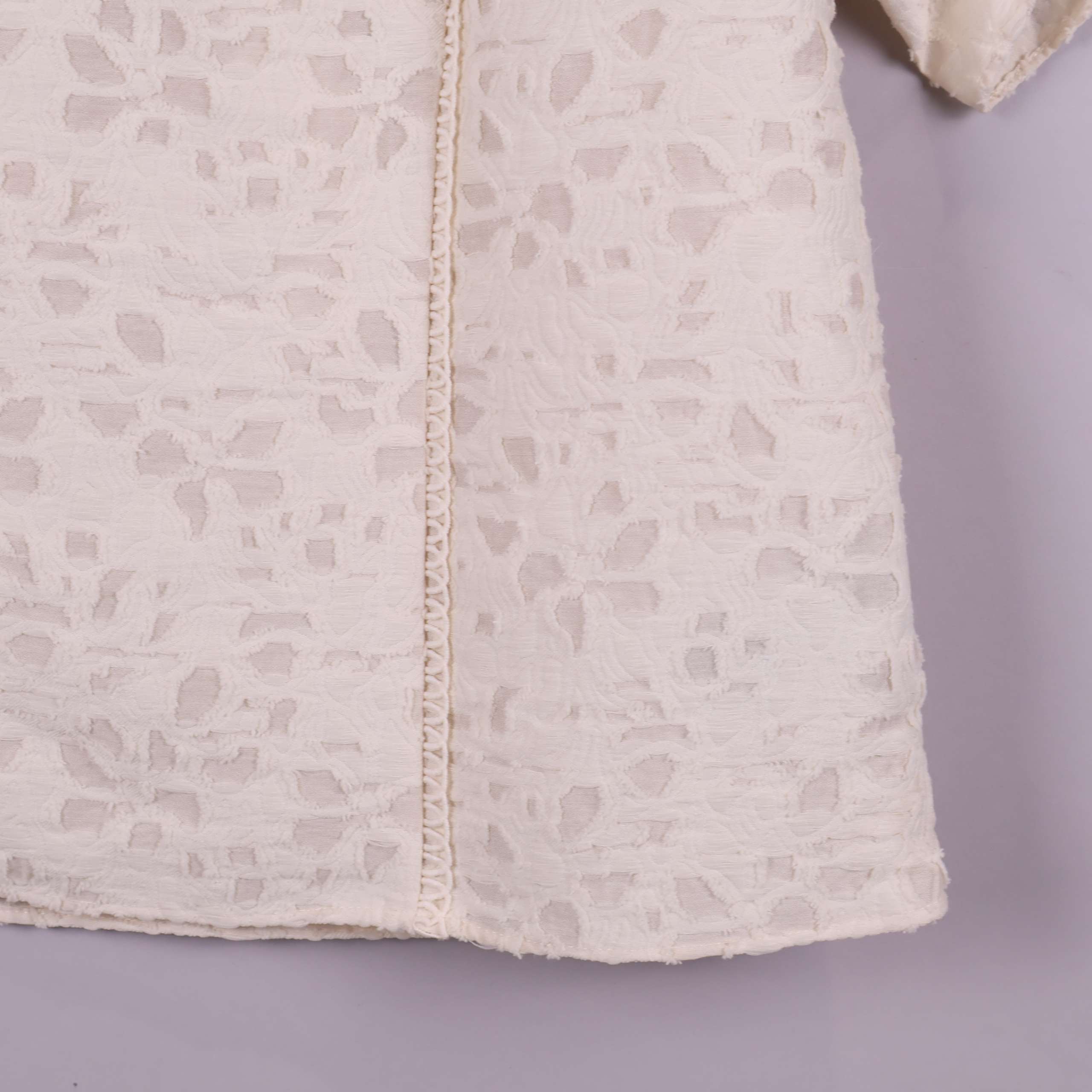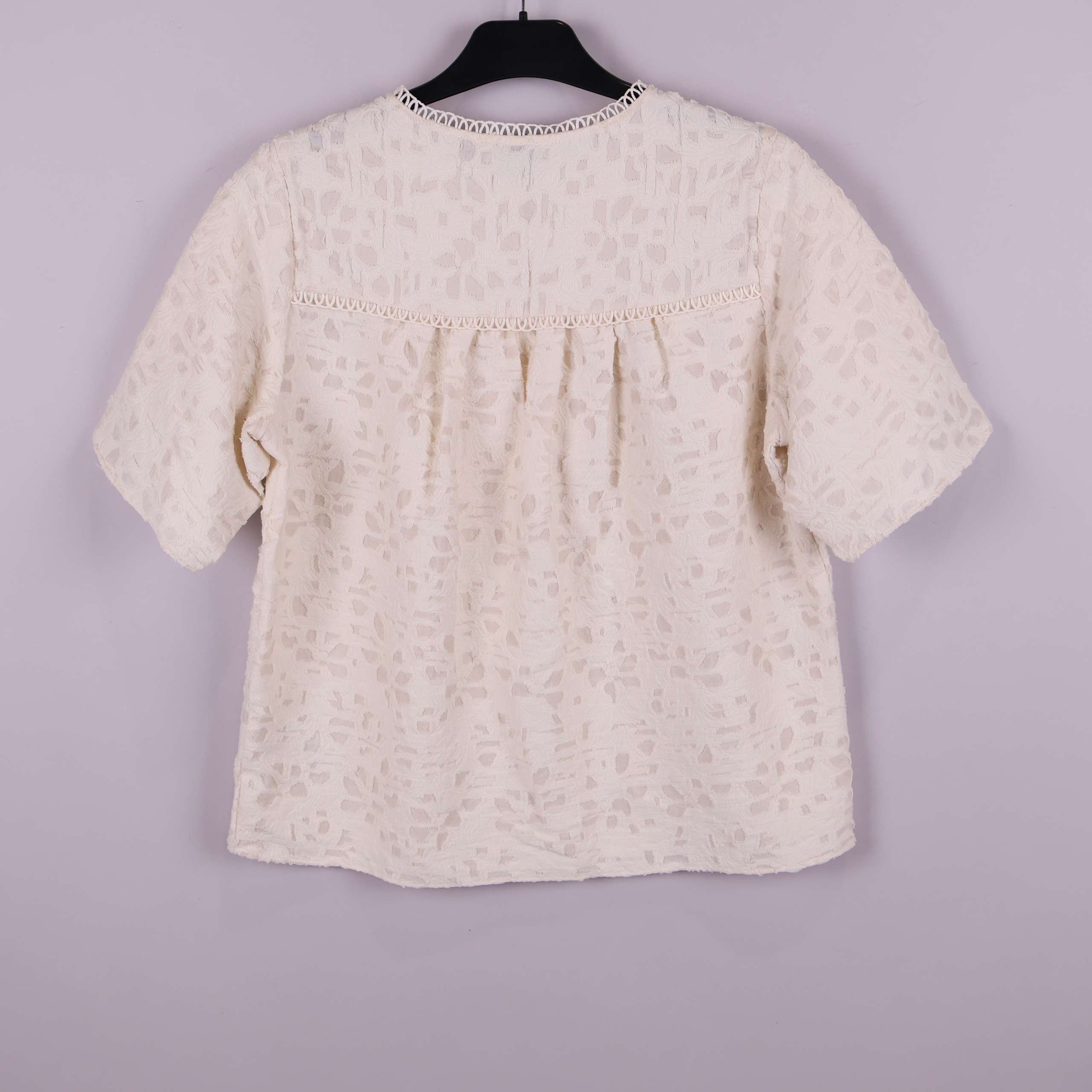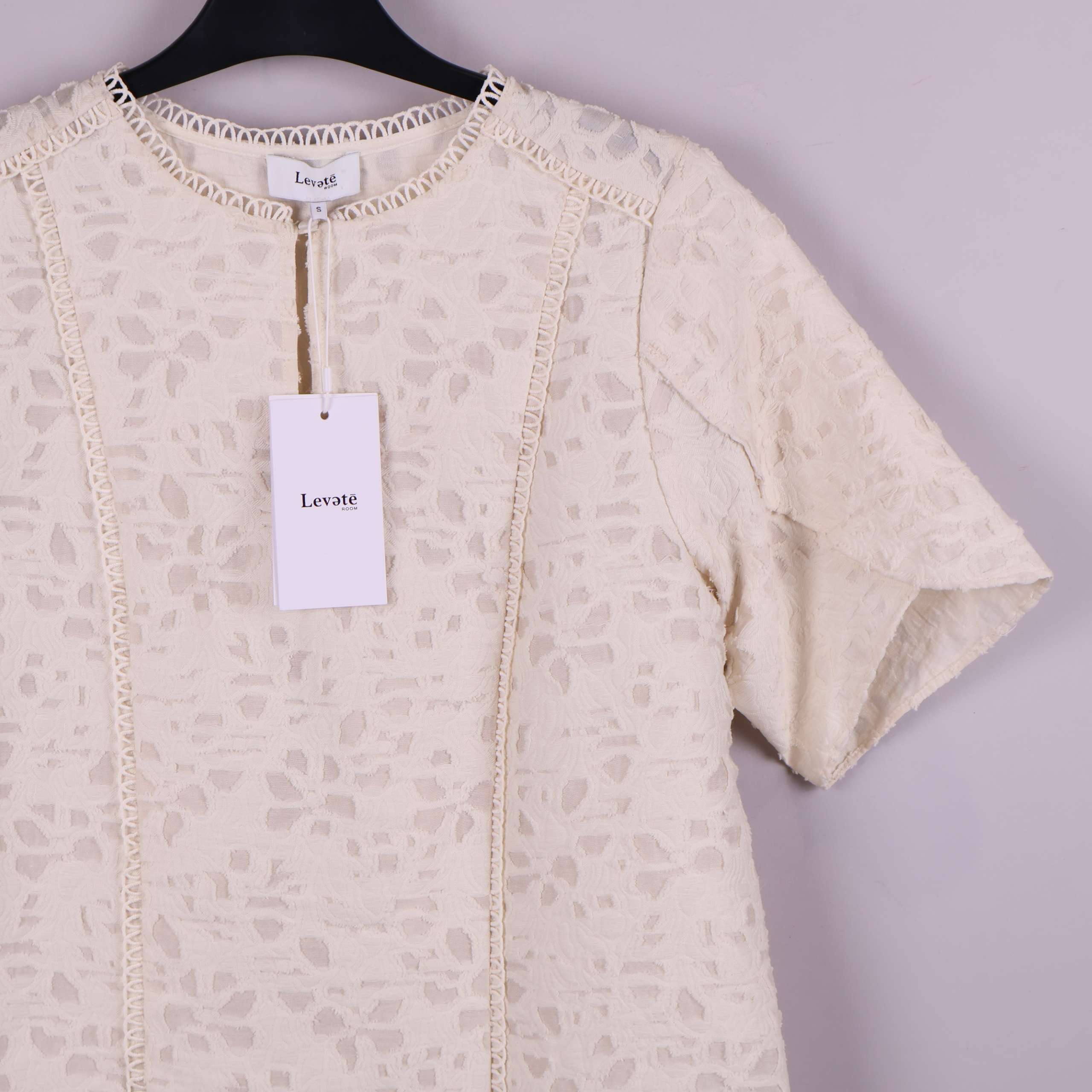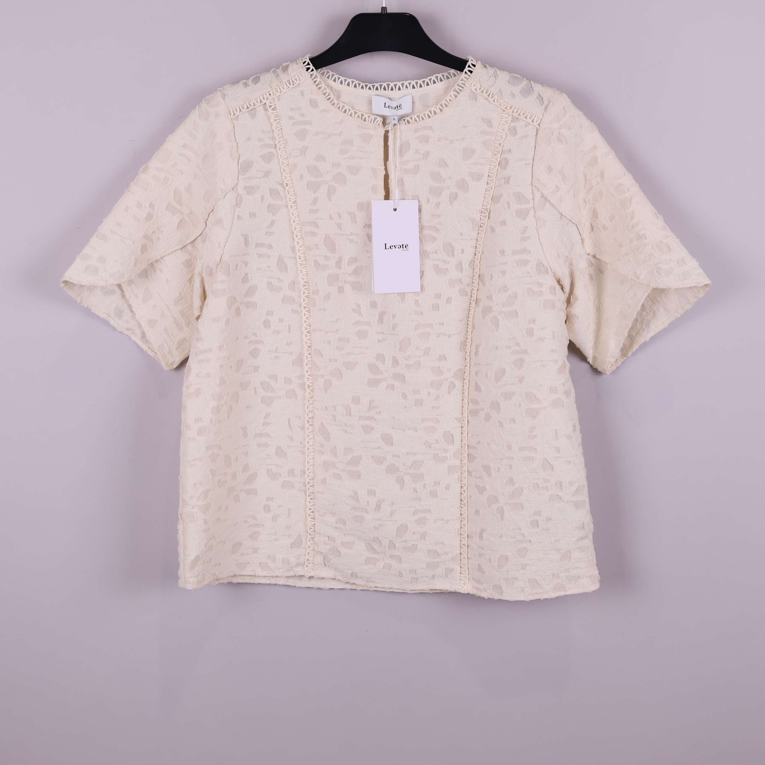 Denna kortärmade topp från Levete Room har ett ljust, elegant strukturmönster och dekorativ spetskant vid halsringningen. Det mjuka tyget har en unik reliefyta som ger en lyxig känsla, och detaljer som de breda ärmarna och fina sömmarna skapar en modern och avslappnad siluett. Passar perfekt till både vardag och fest när du vill ha en stilren och chic look.