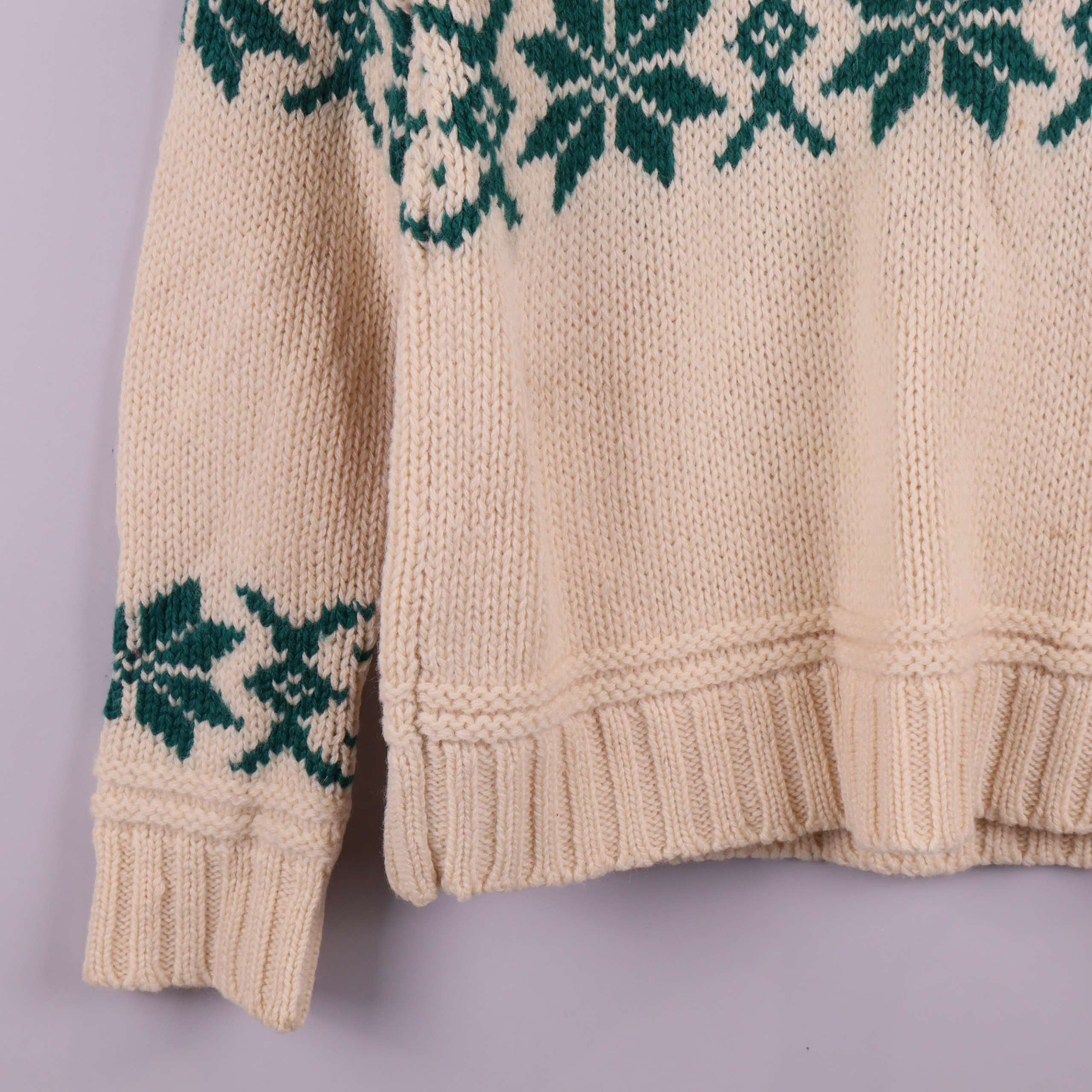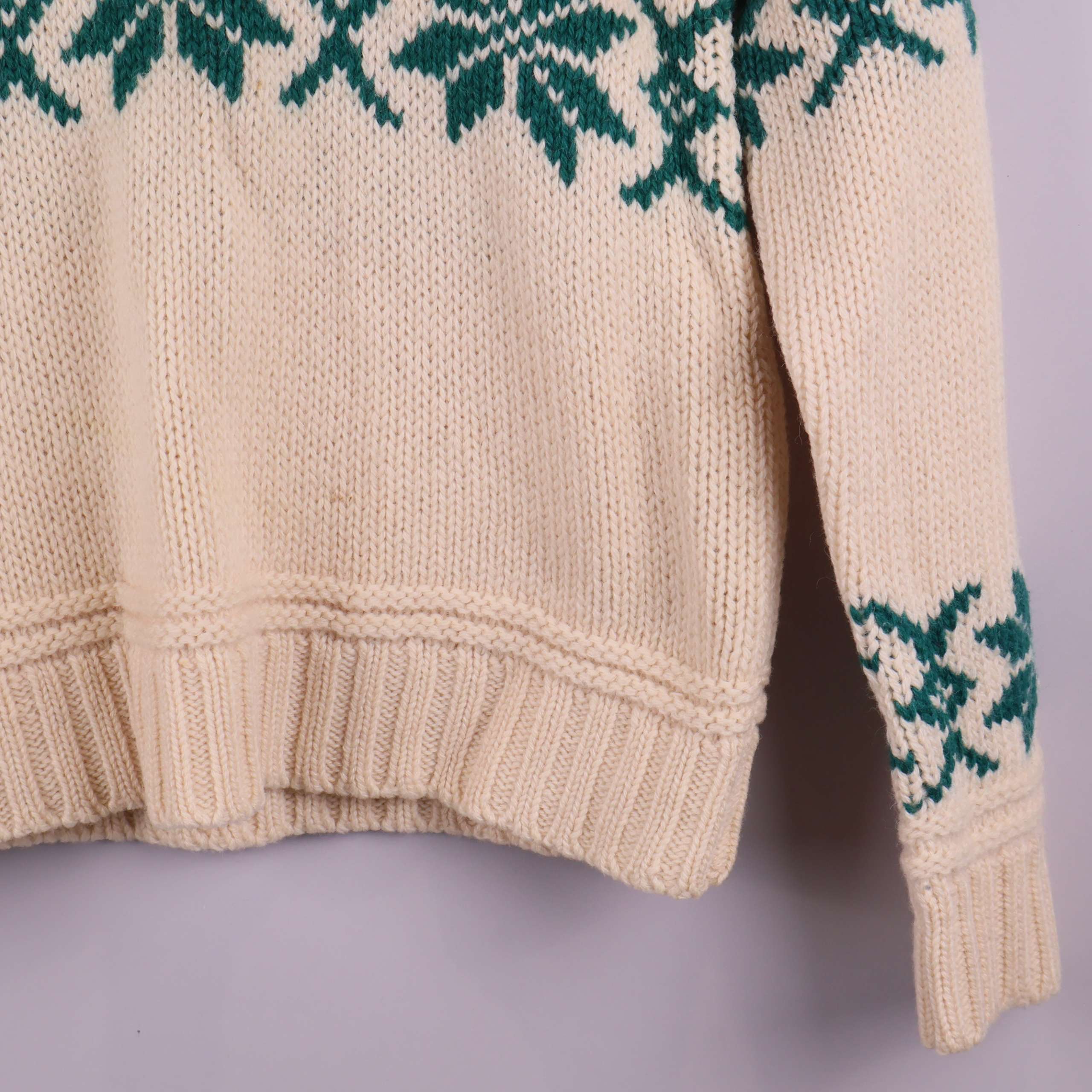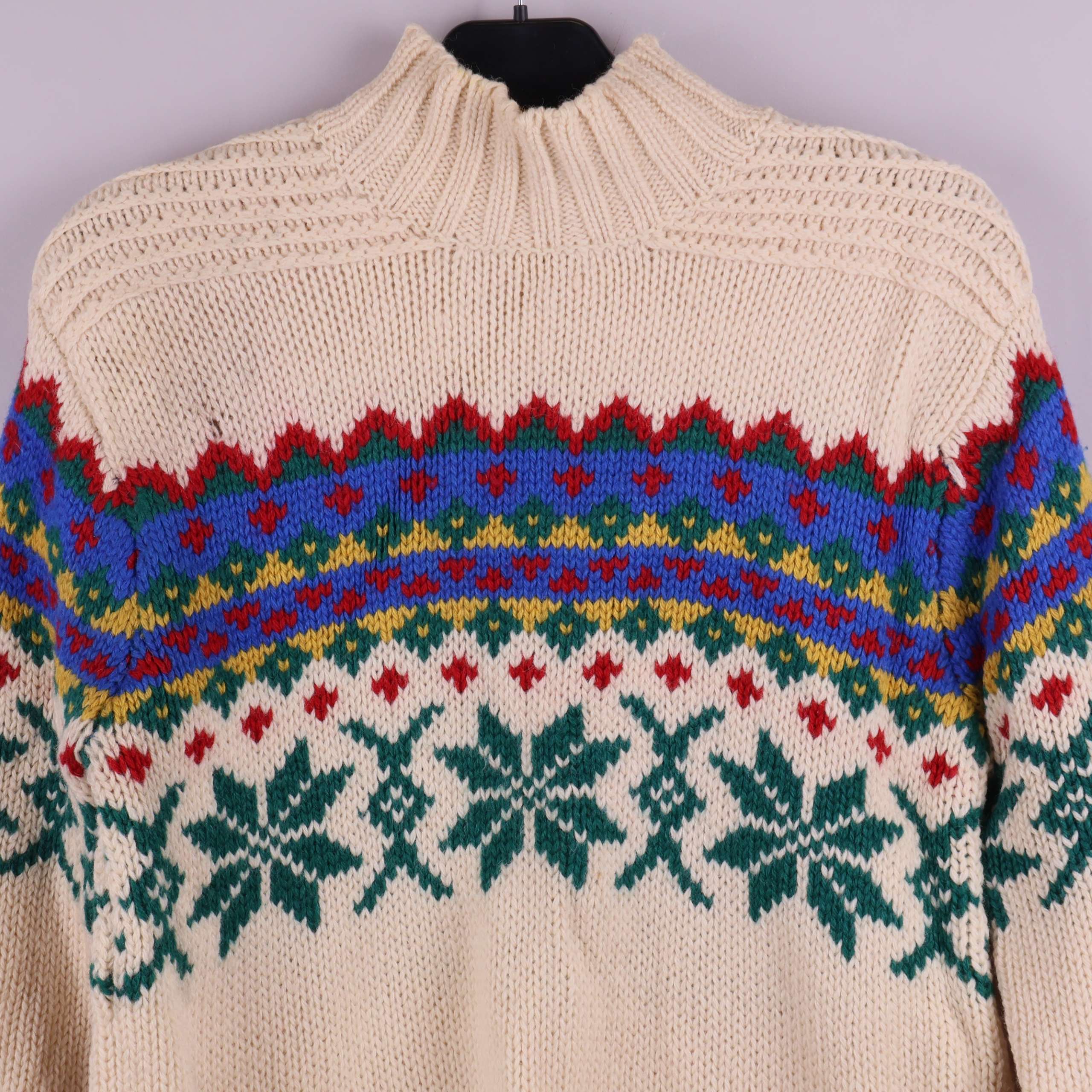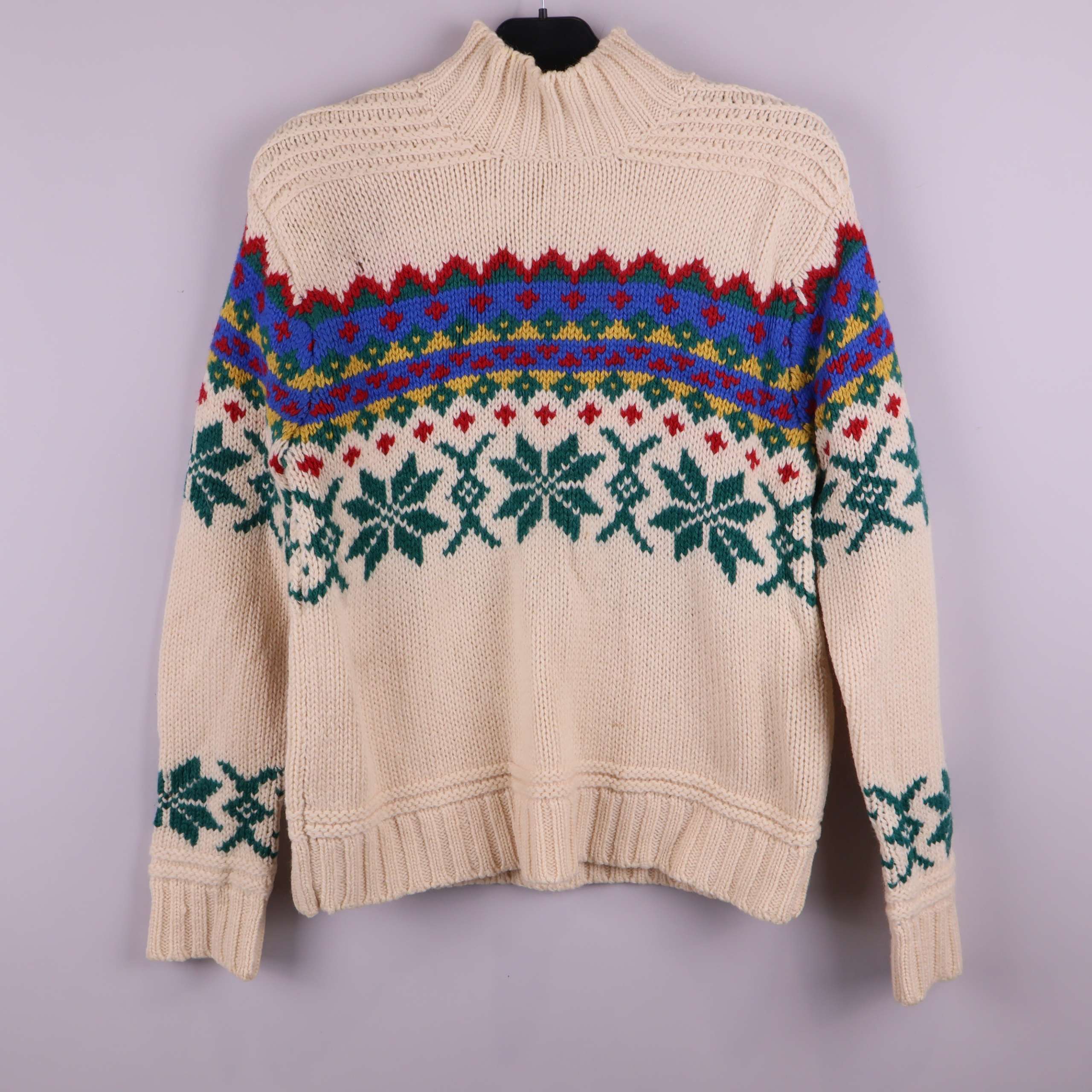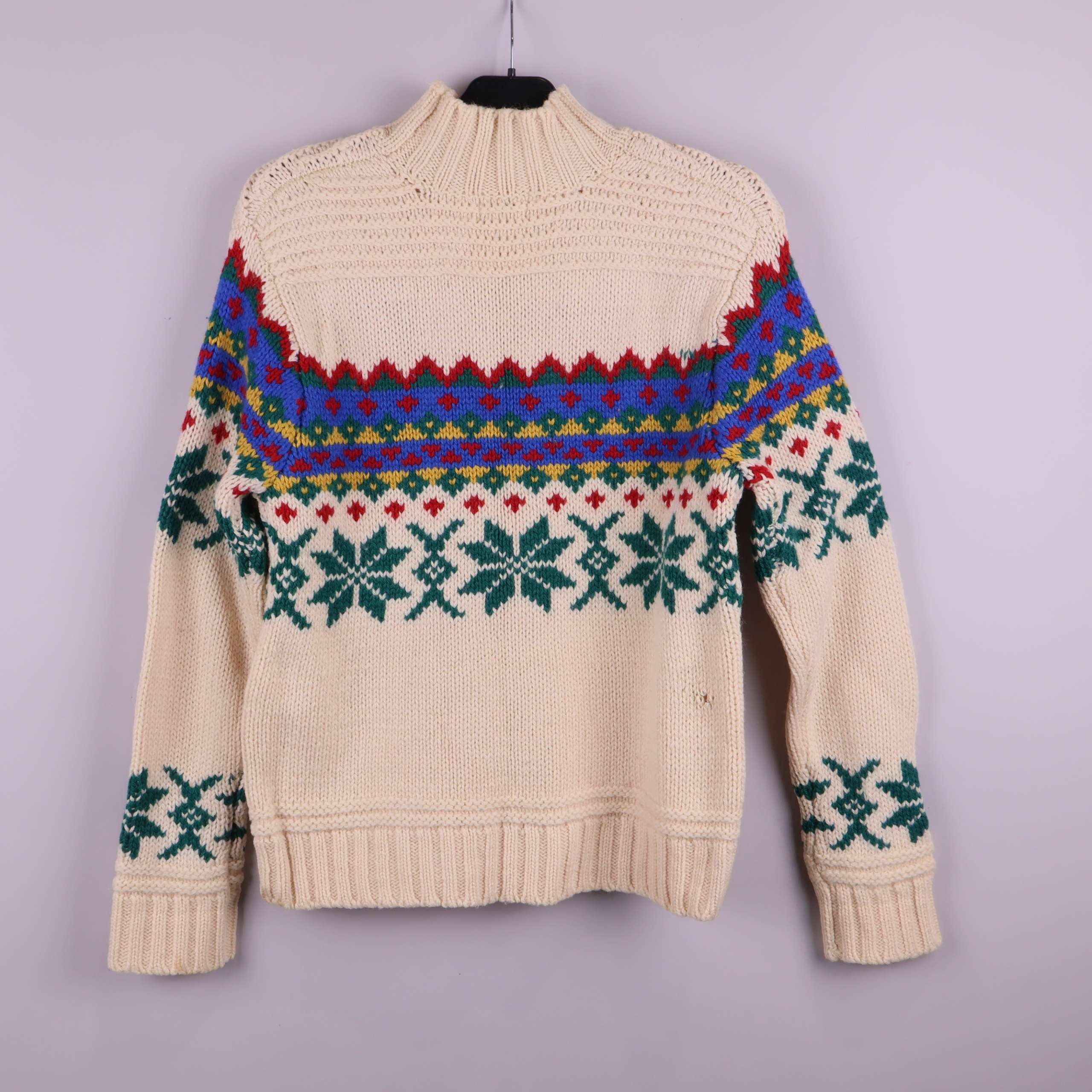 Charmig stickad tröja med tidlös flerfärgad design och dekorativa mönster i grönt, blått, rött och gult mot en krämvit bakgrund. Den har ribbade muddar, hög krage och avslappnad passform med klassiska vintervibbar. Perfekt för dig som gillar retrostilen och vill ha något både mjukt och varmt.