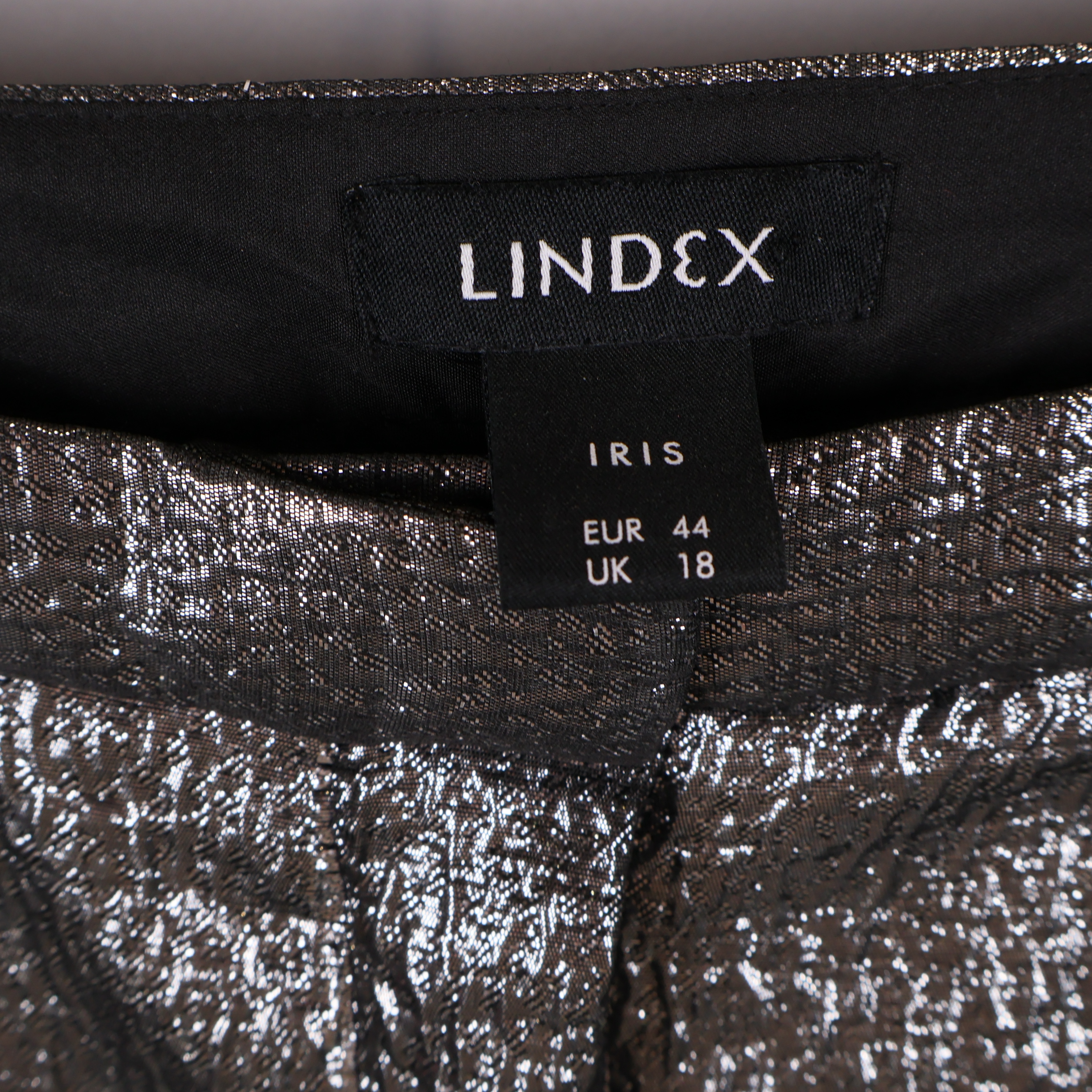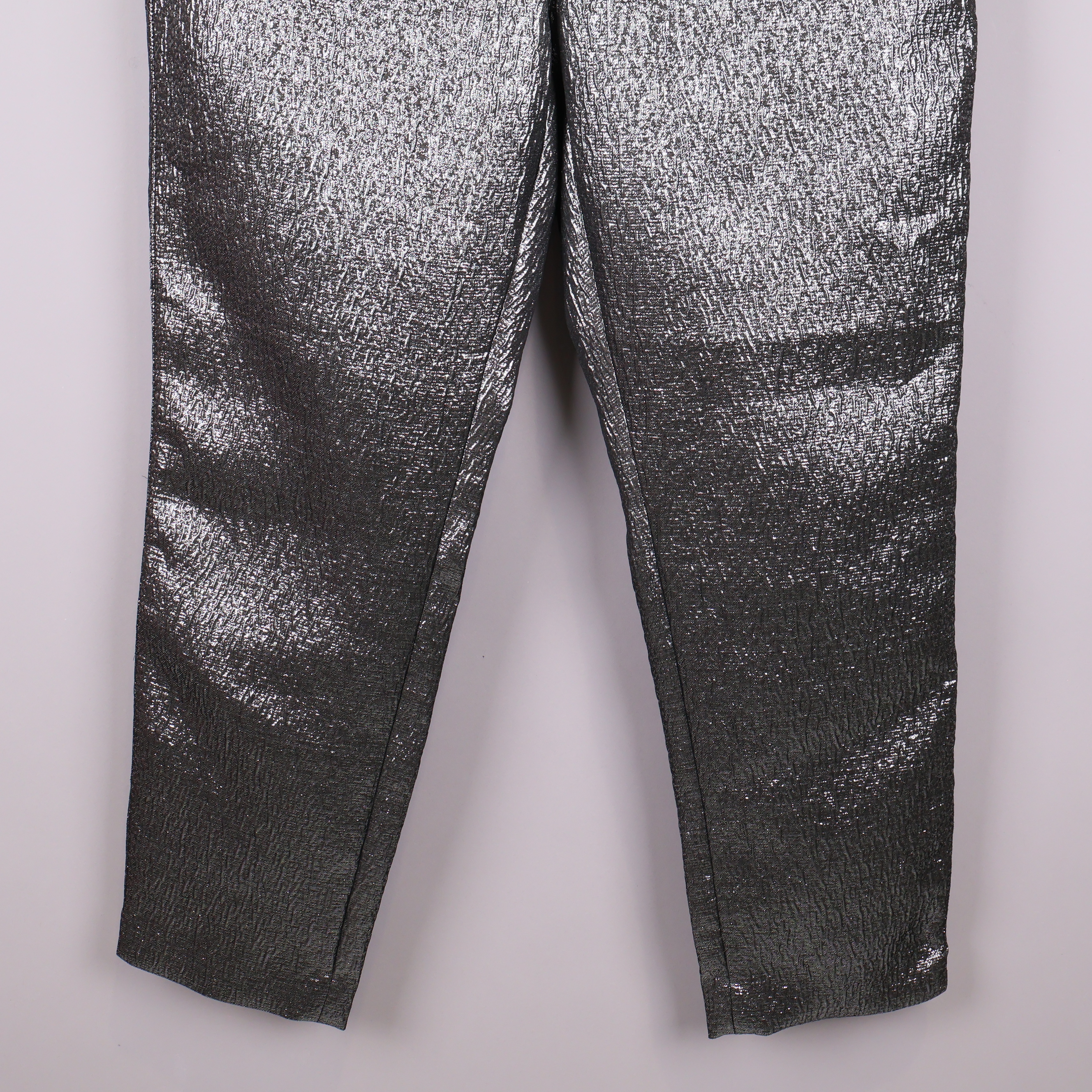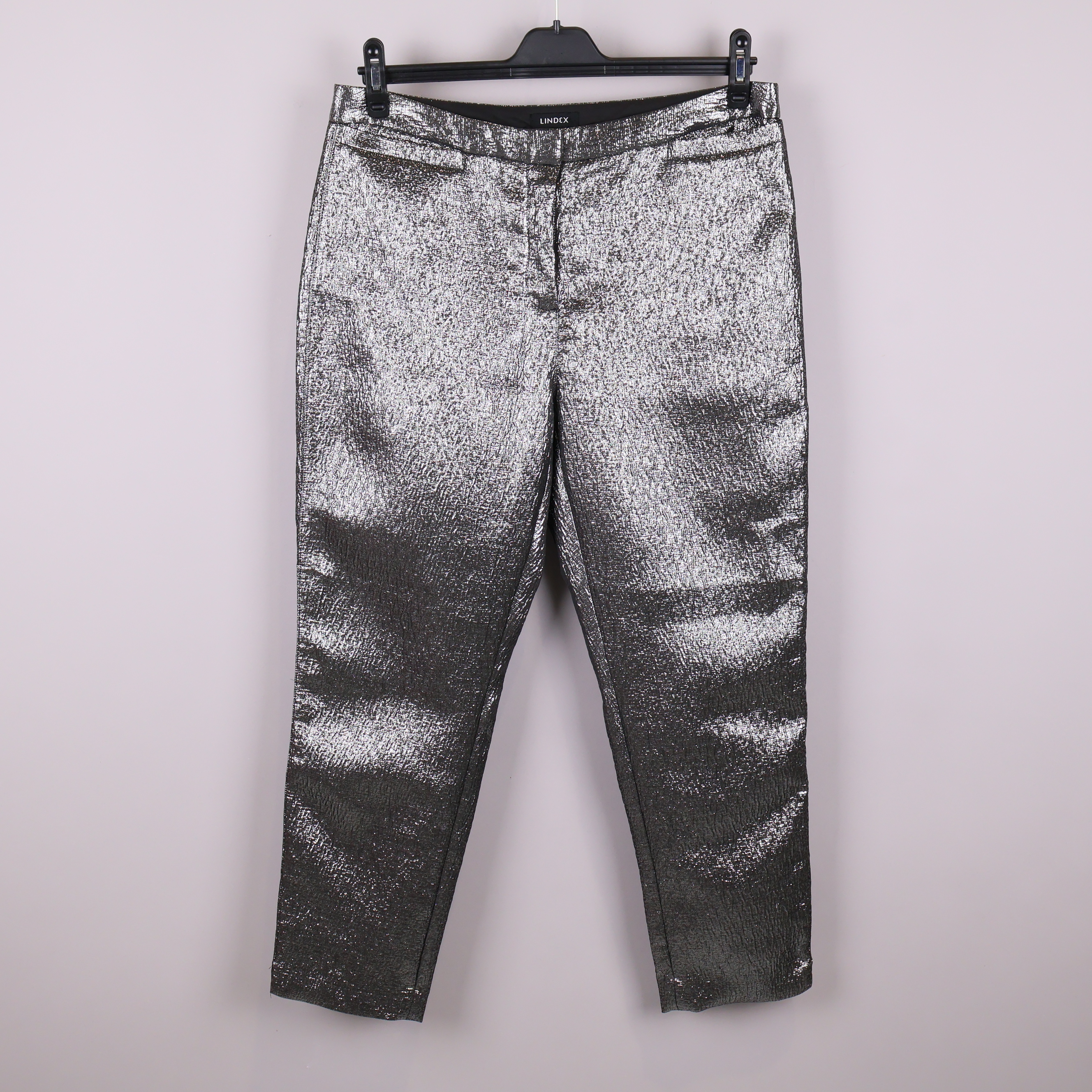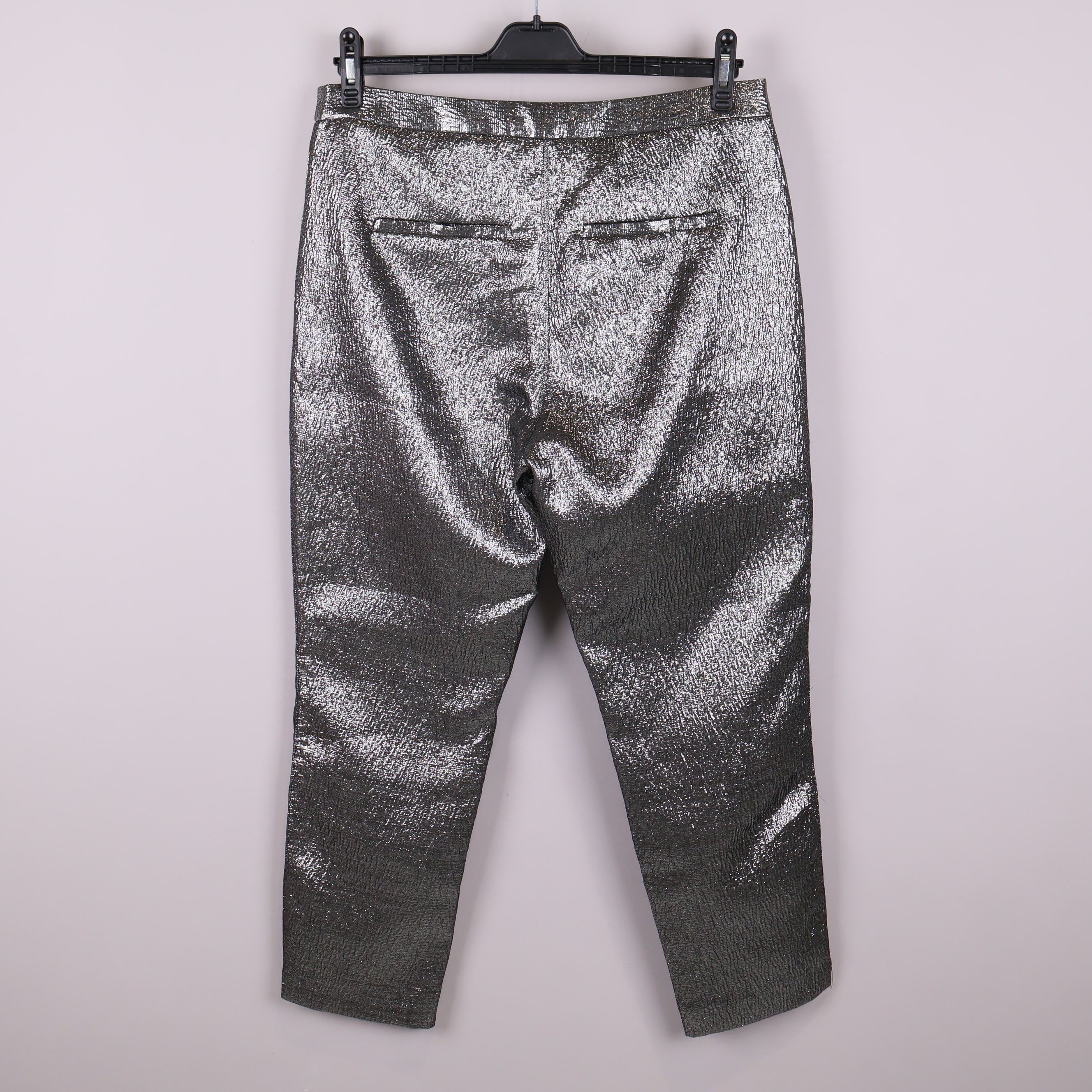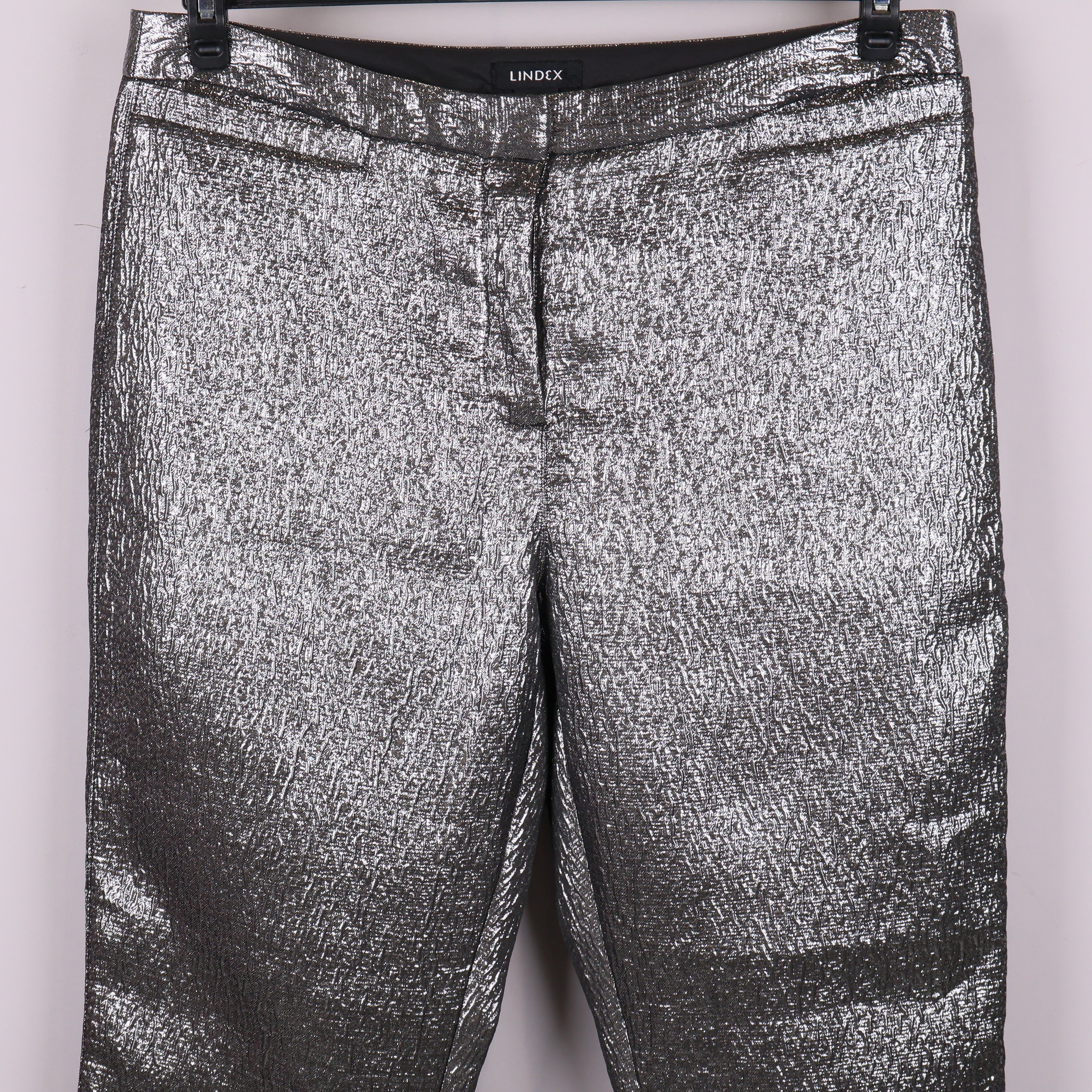 Byxor med metallic-glans i silverton, raka ben och klassiska fickor baktill. Modellen har en elegant och trendig känsla som ger din outfit en extra edge. Midjehällor och diskreta detaljer för en modern look.