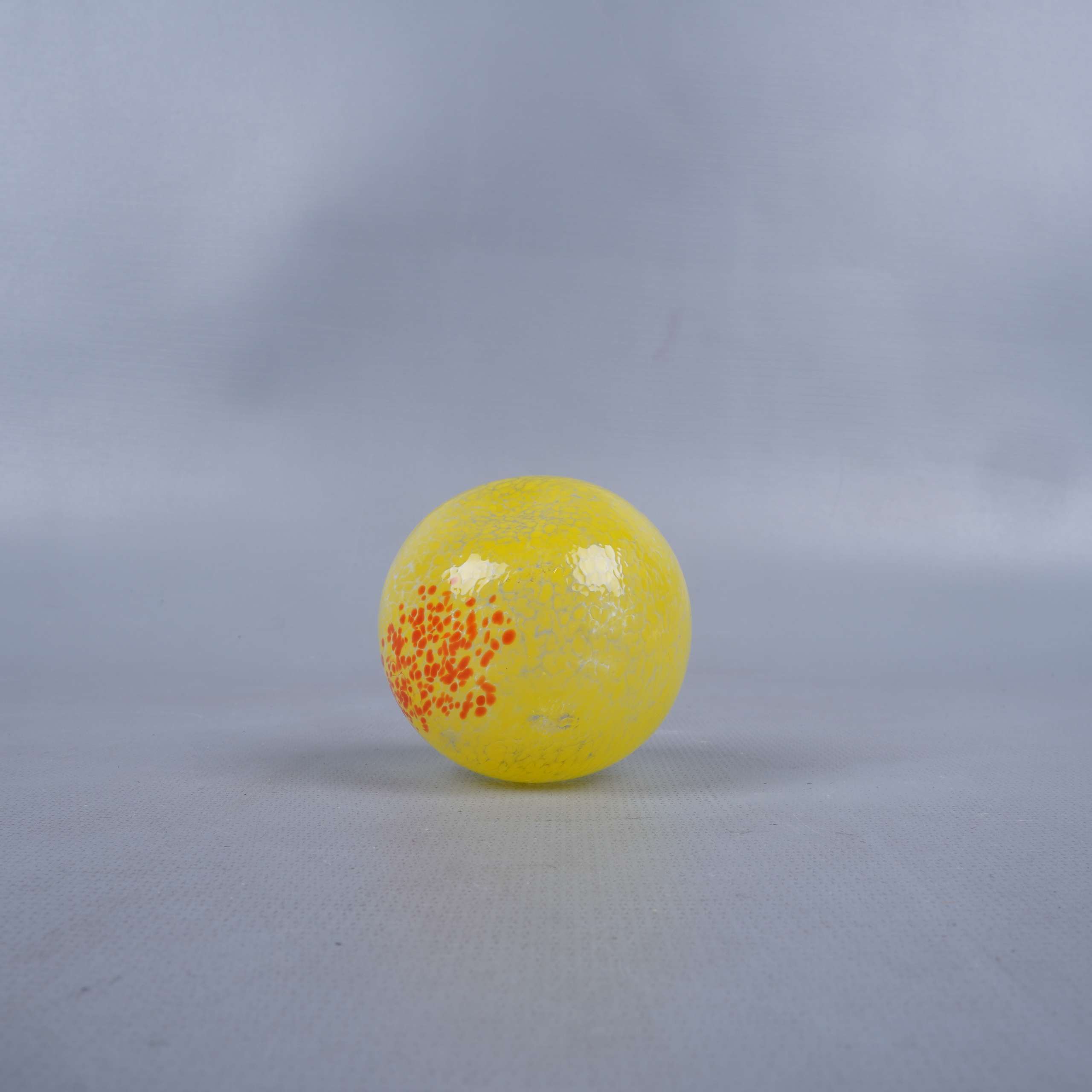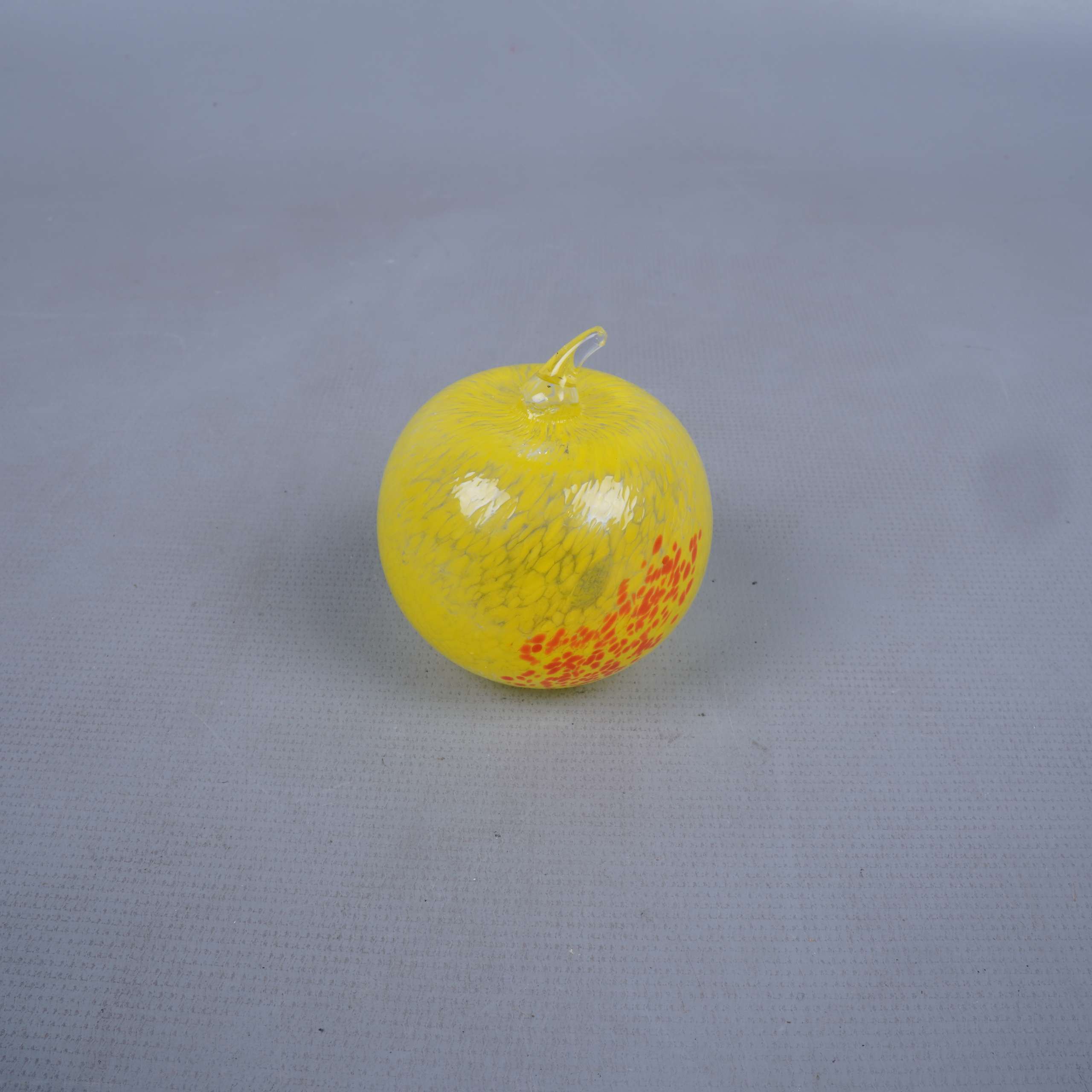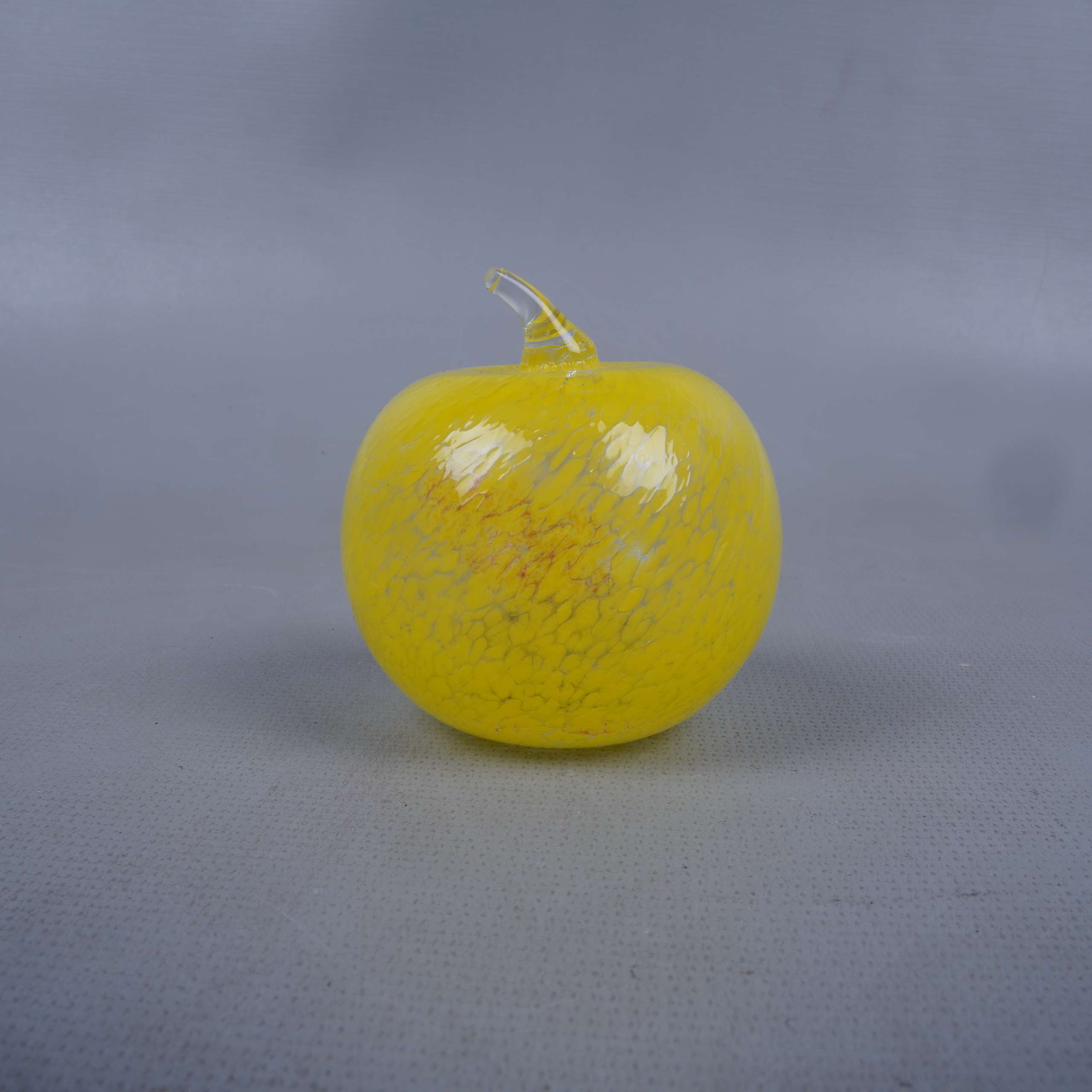 Detta dekorativa äpple i glas har en härligt blank och gul yta med detaljer i orange och en liten stjälk upptill. Mönstret ger ett lekfullt, färgstarkt uttryck som blir ett charmigt inslag i hemmet eller på skrivbordet.